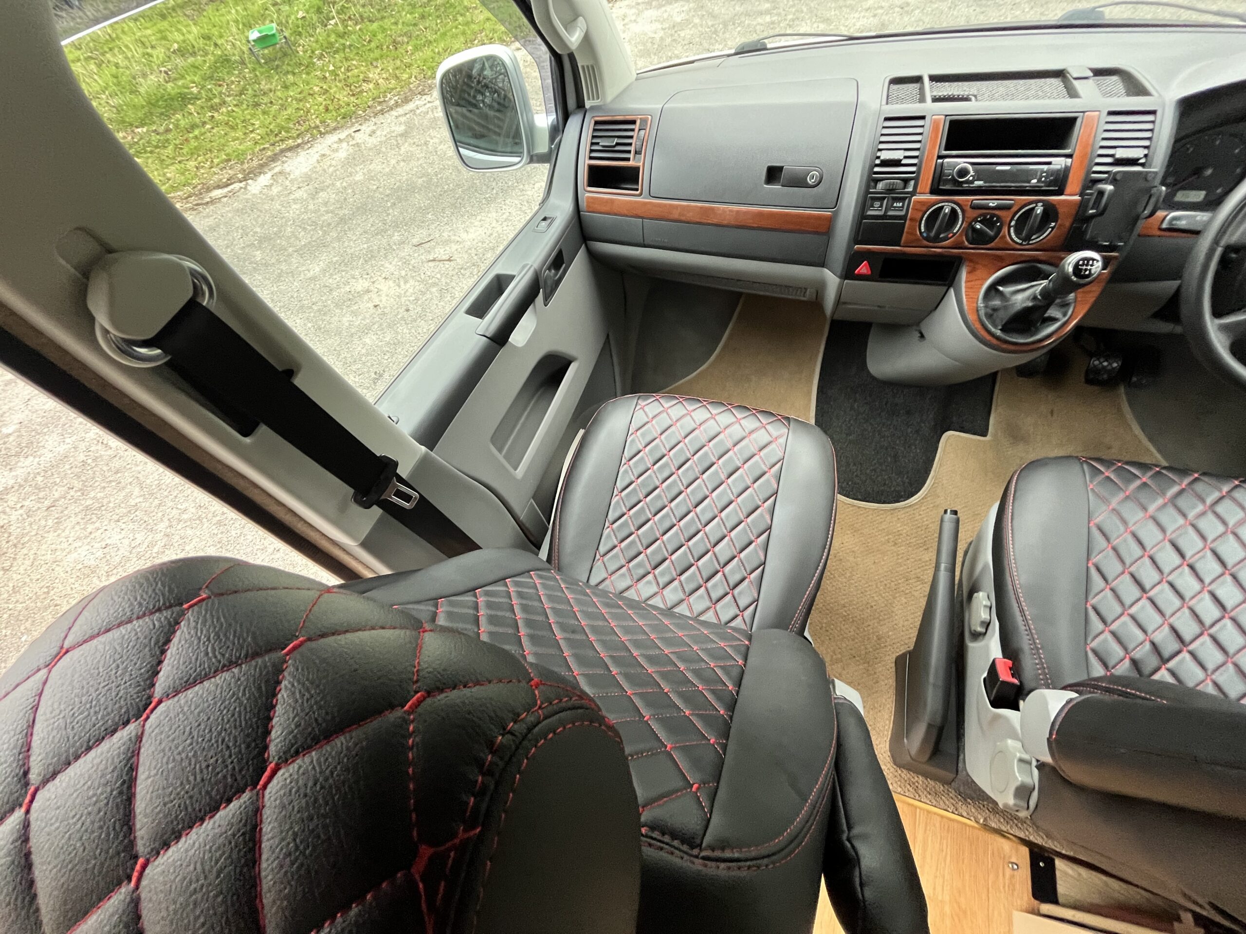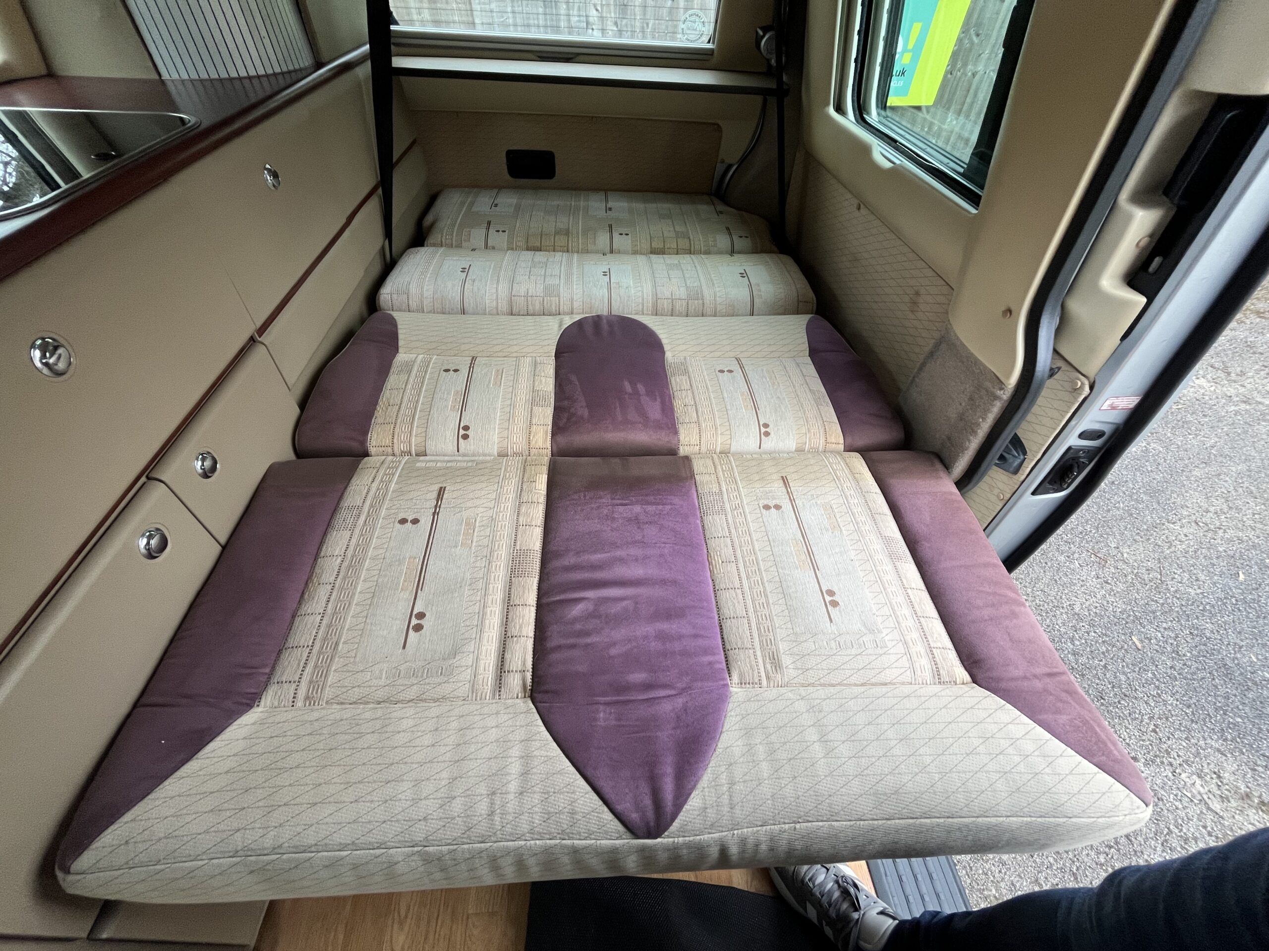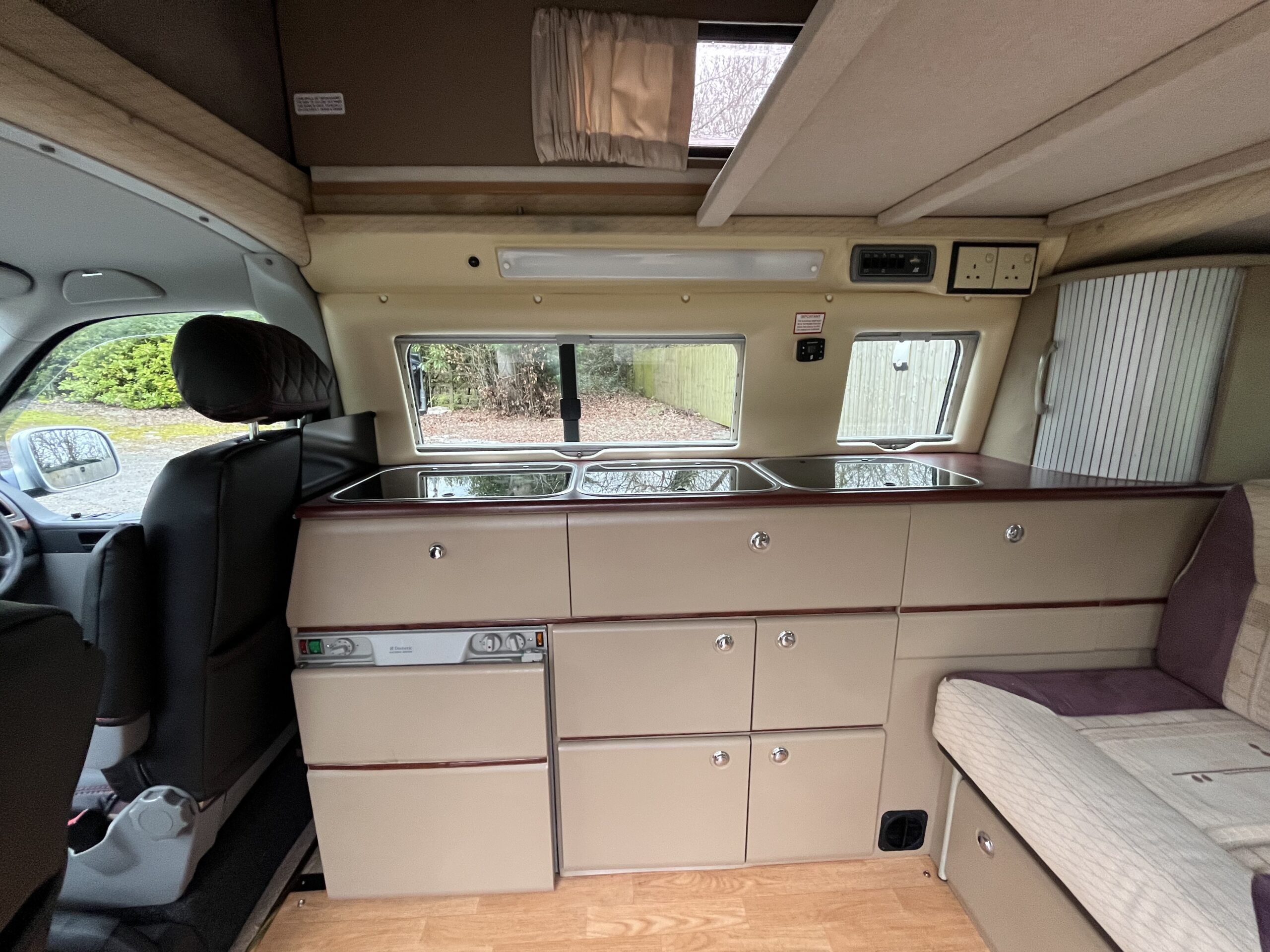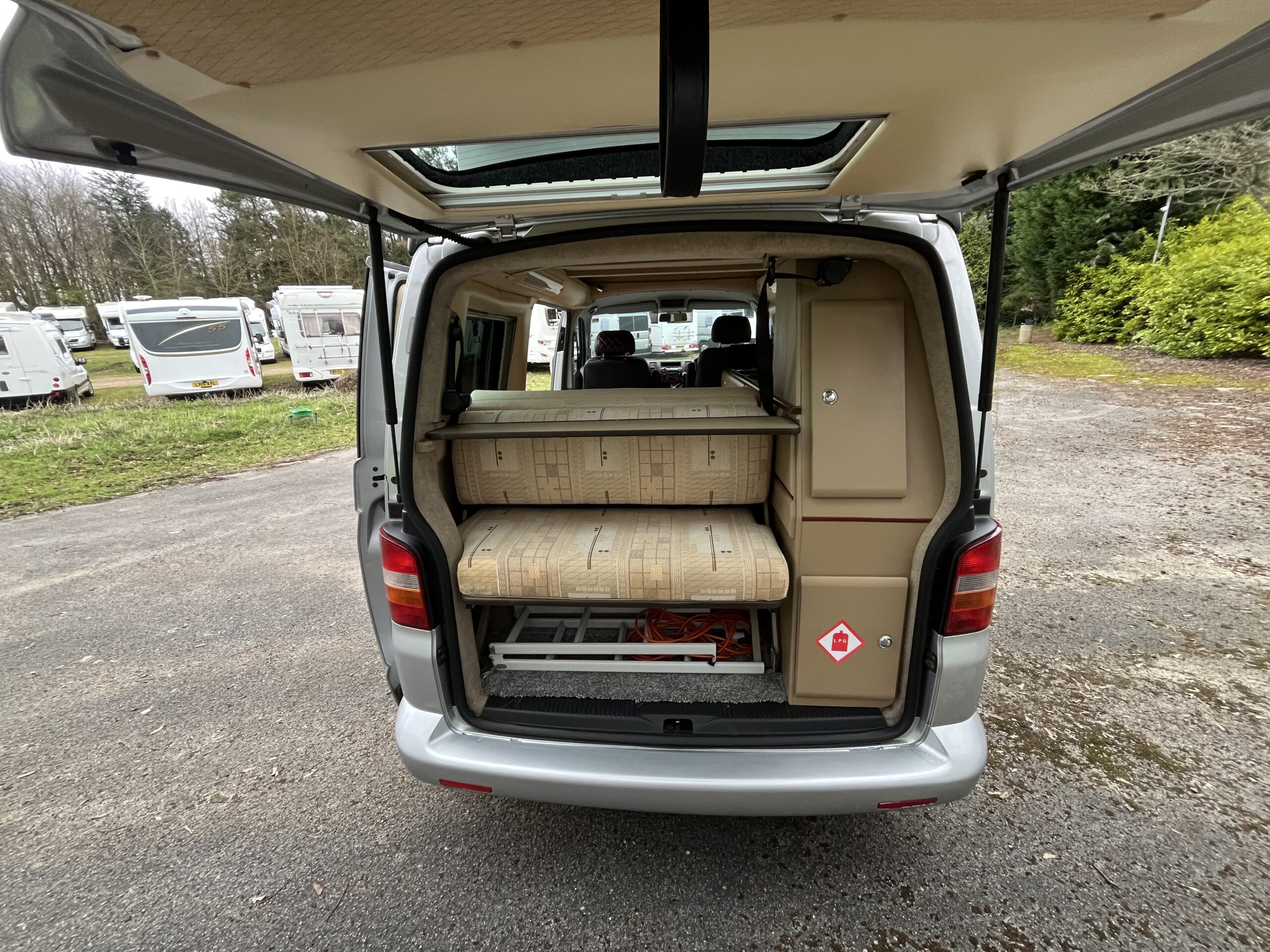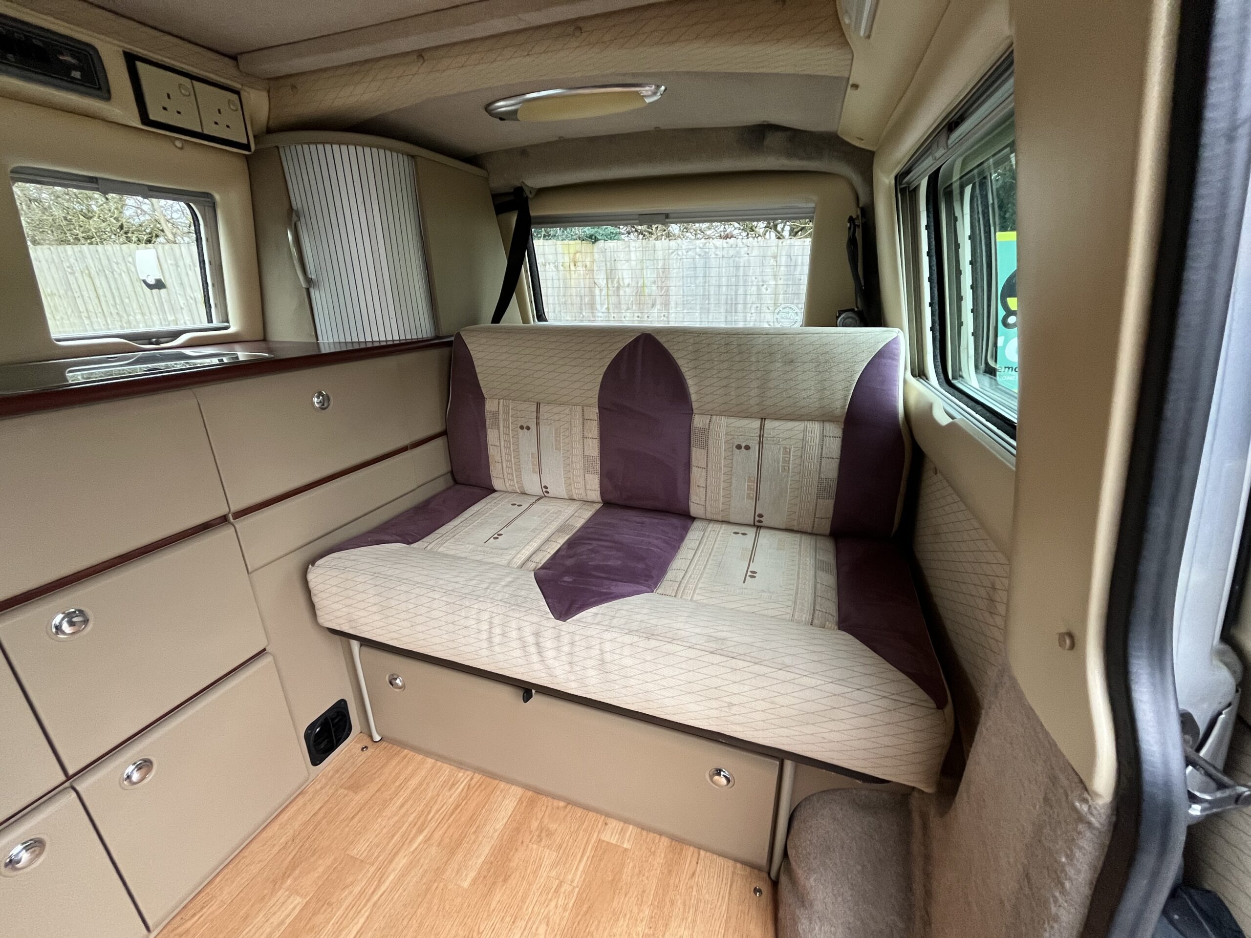 The lounge area is the classic VW design with bench seat, two lap and Diagonal rear seat belts, comfortable bed, fridge/freezer.2 burner hob and grill, leisure battery and charger, lighting as well as ample storage.