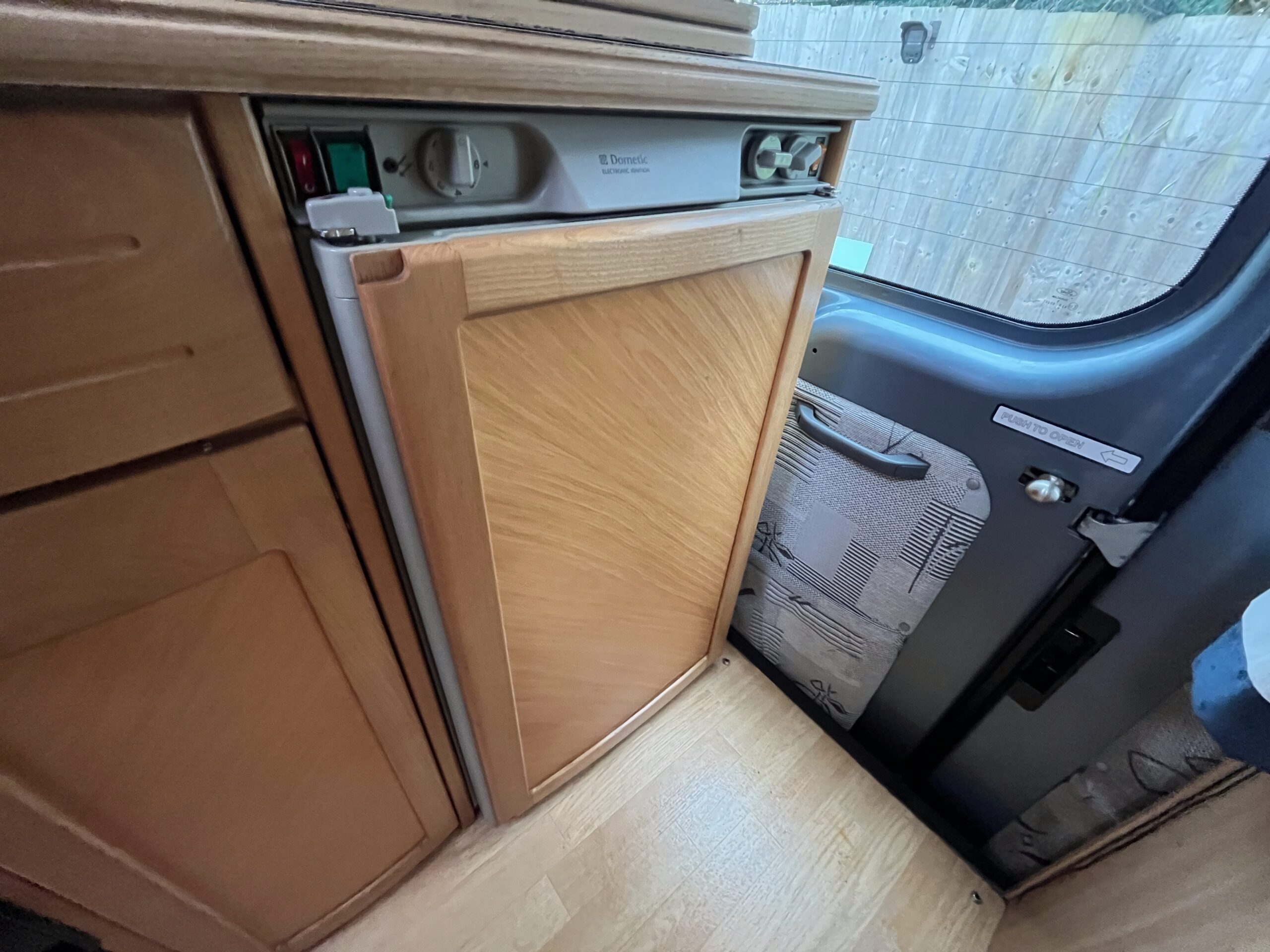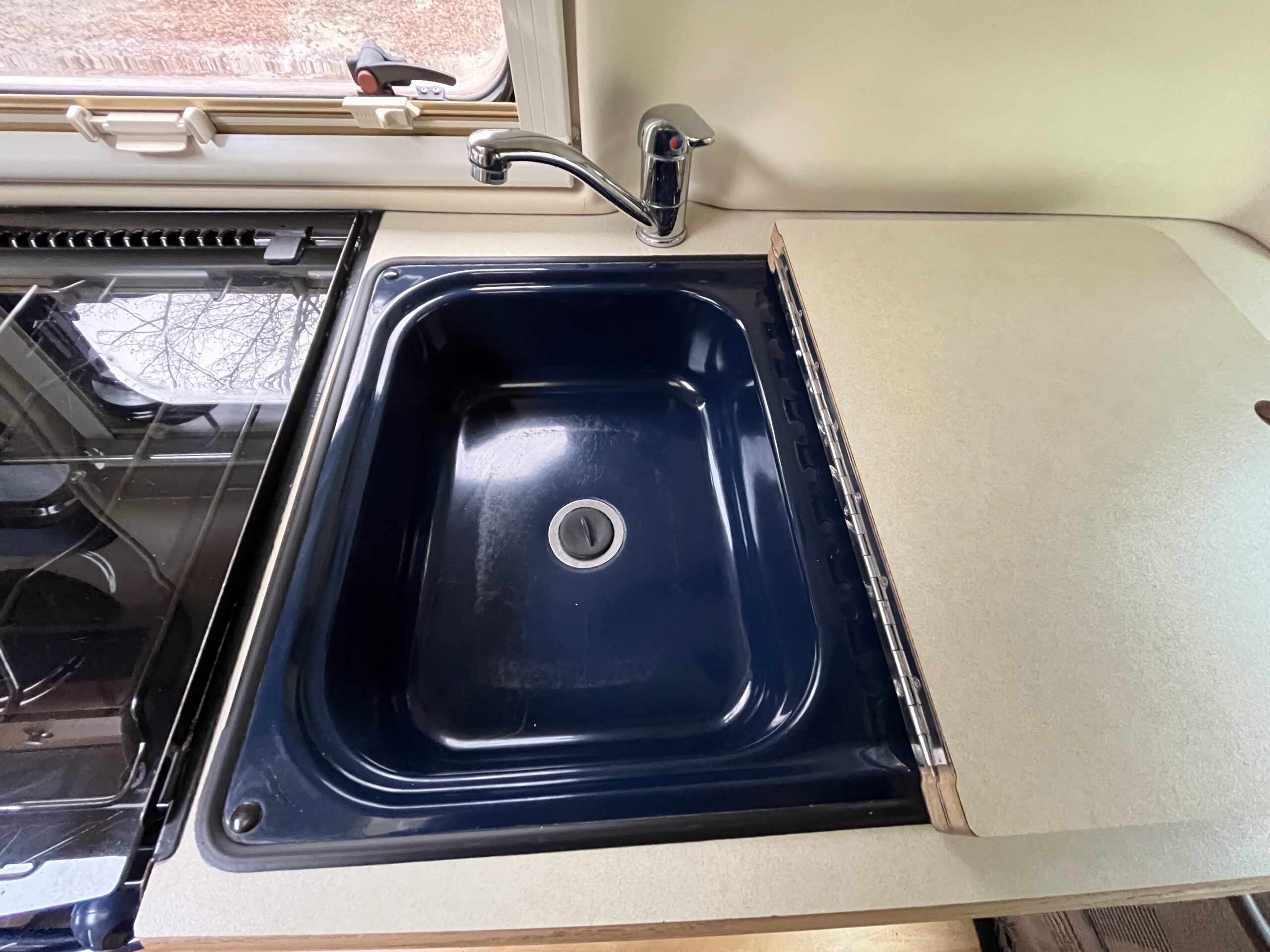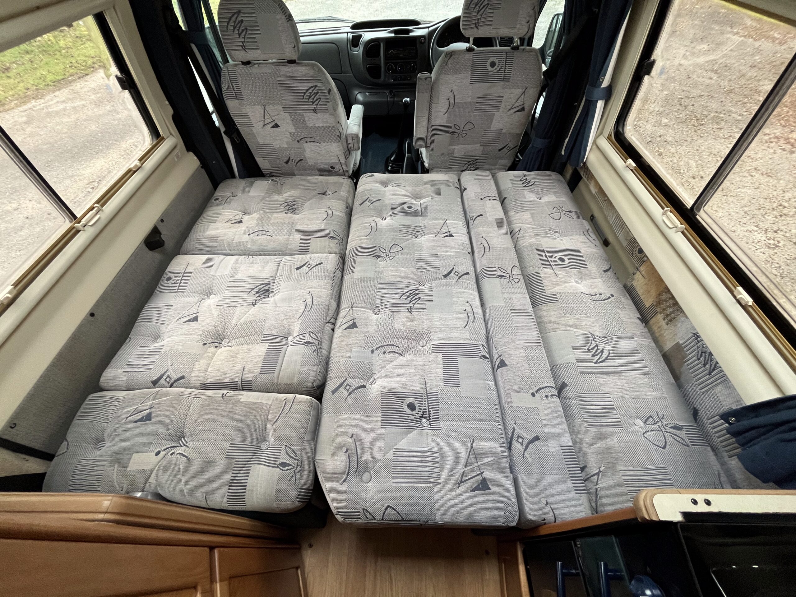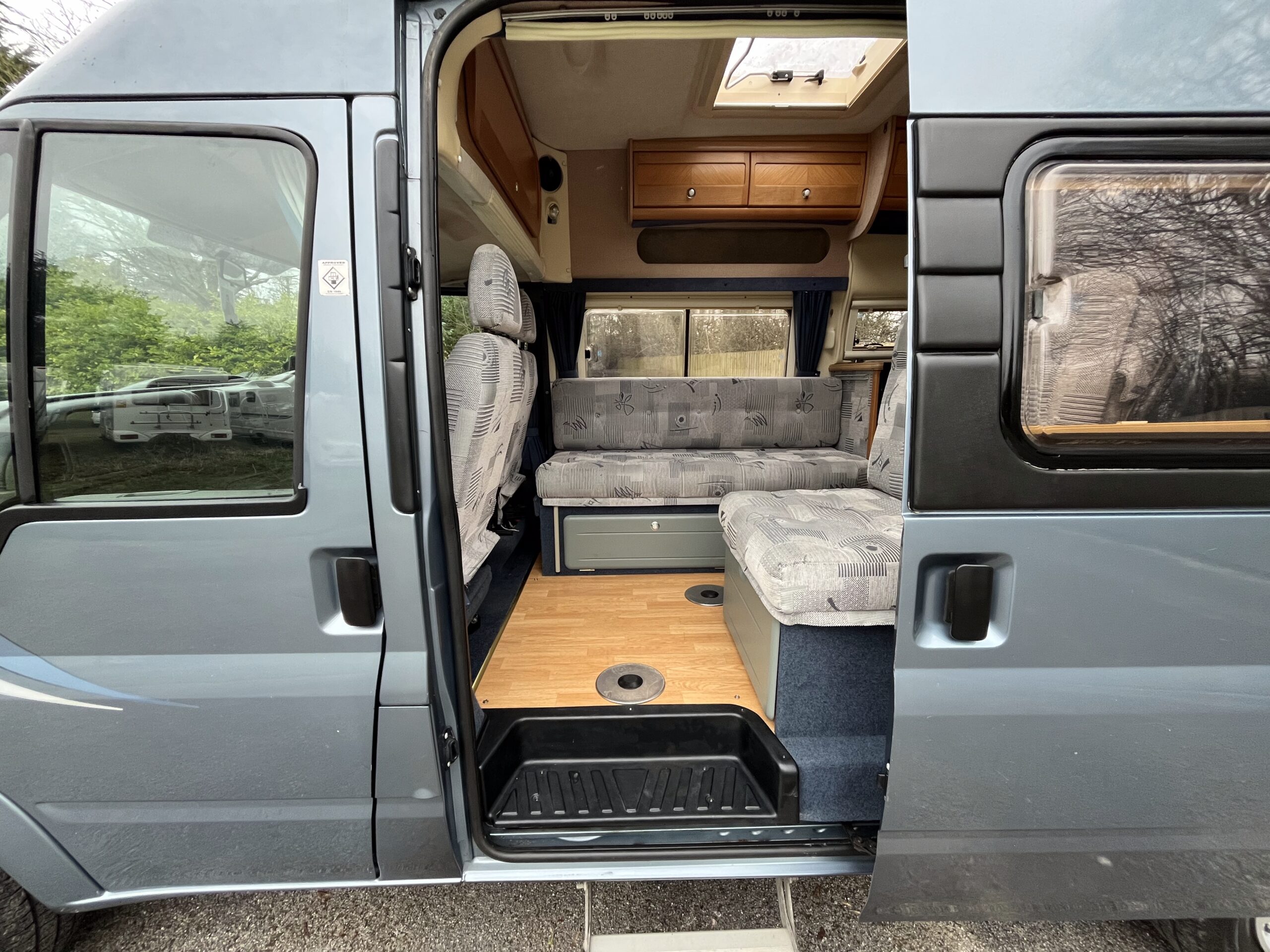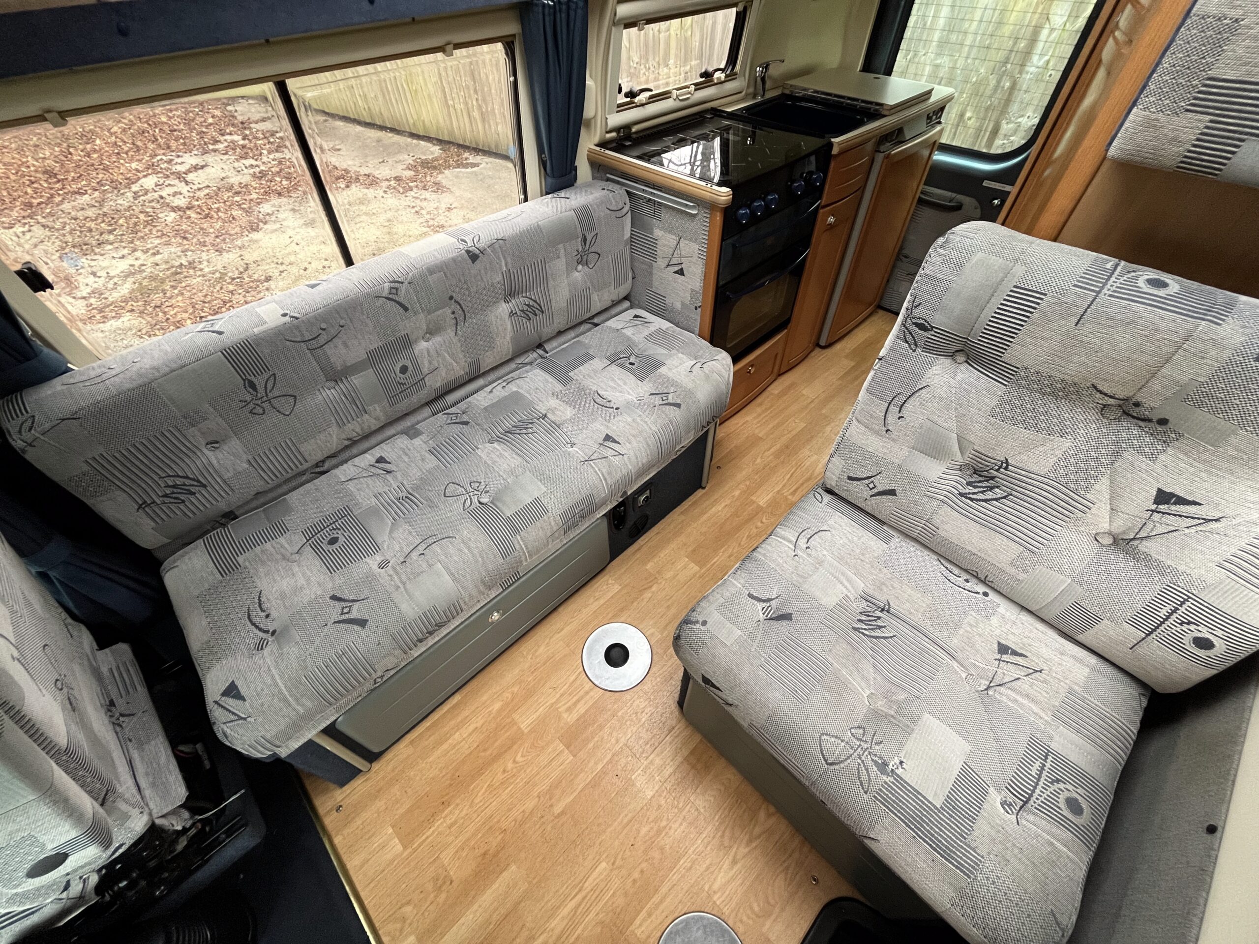 The layout is as you enter the campervan through the habitation step you are greeted with a single convertible seat with seatbelt and a long side bench, these two can either make a large sumptuous double bed or two small single beds with the passenger seat able to swivel and in this area you have the option of two different sized dining tables for meals or relaxing.