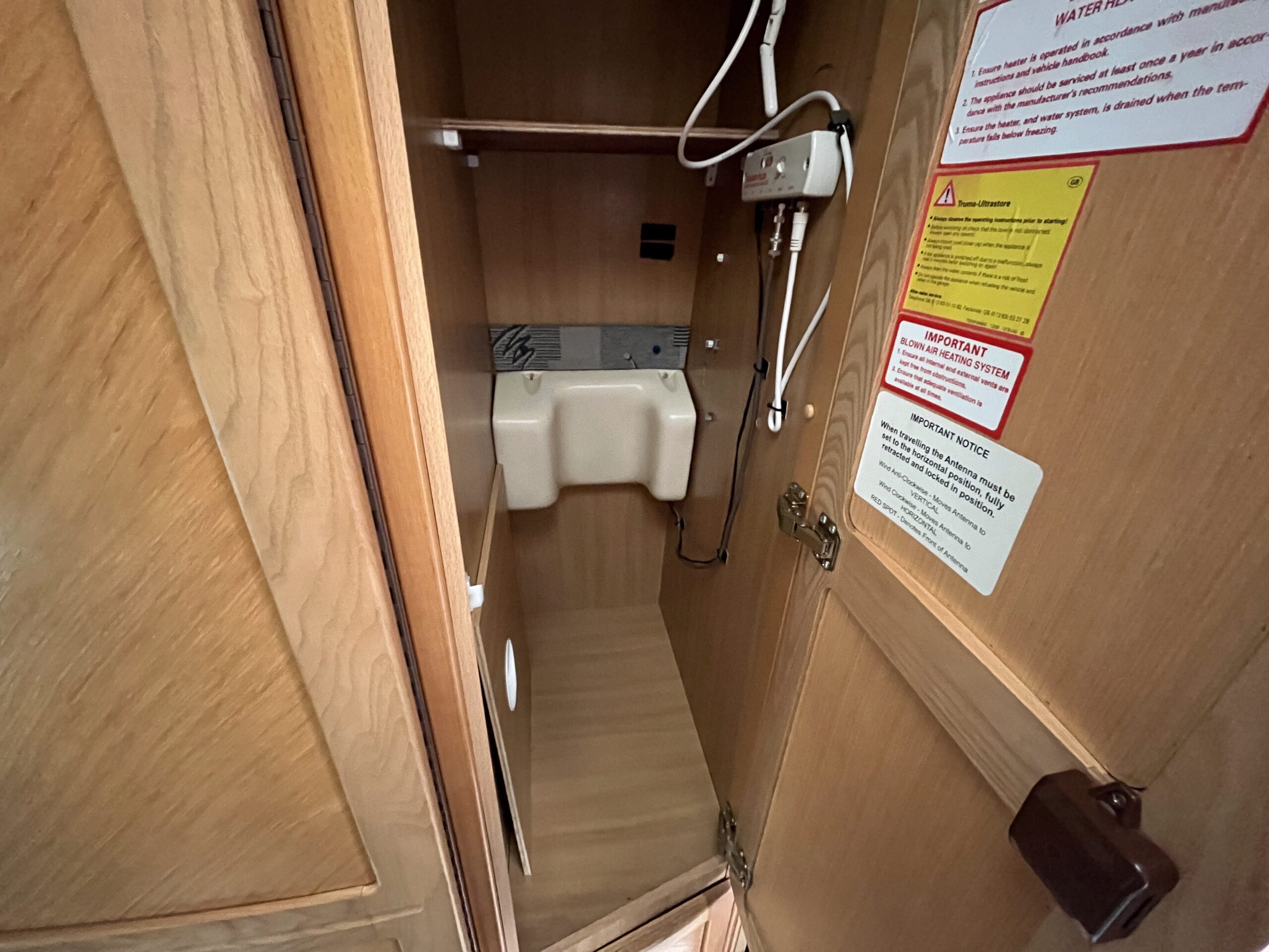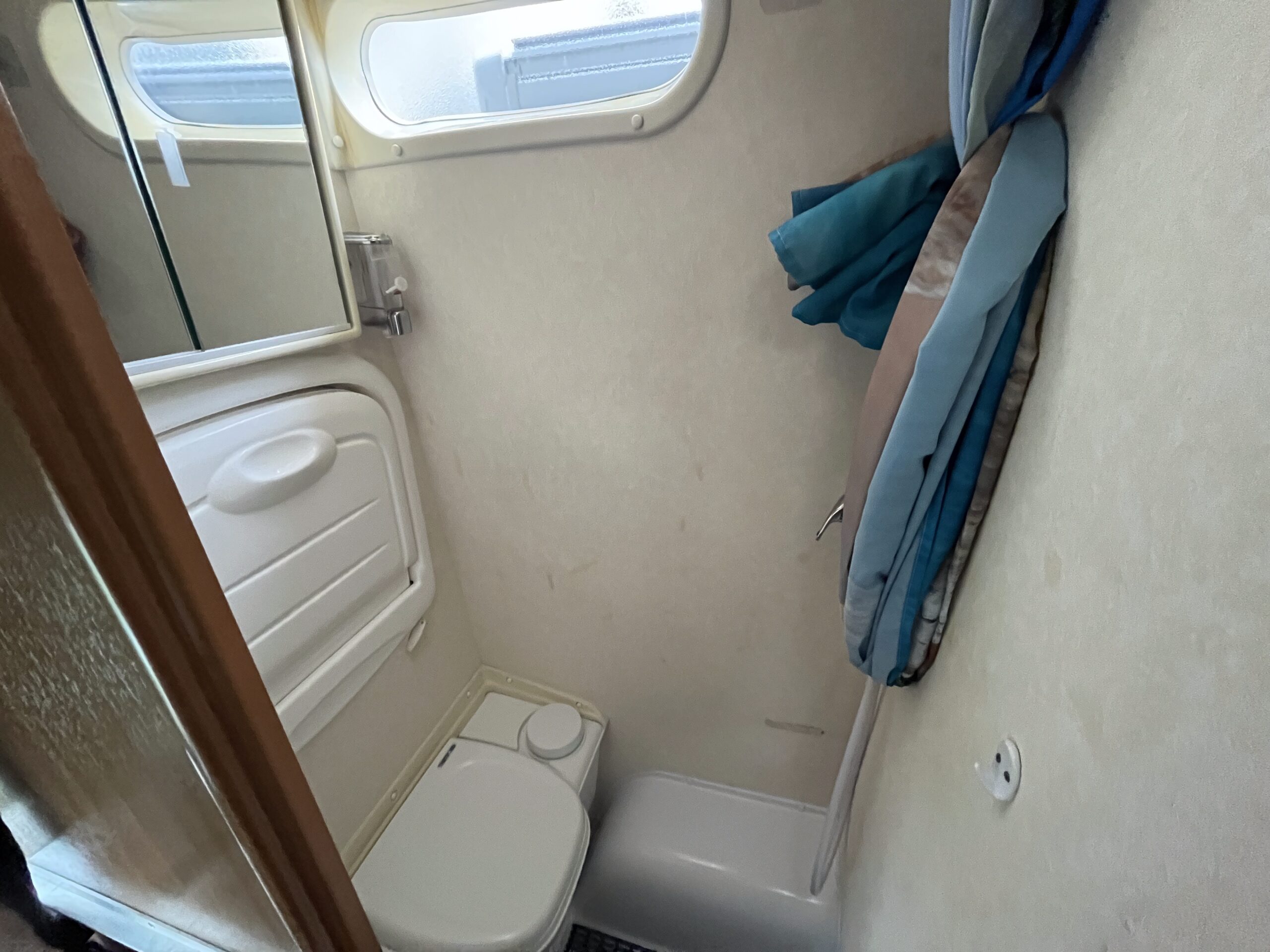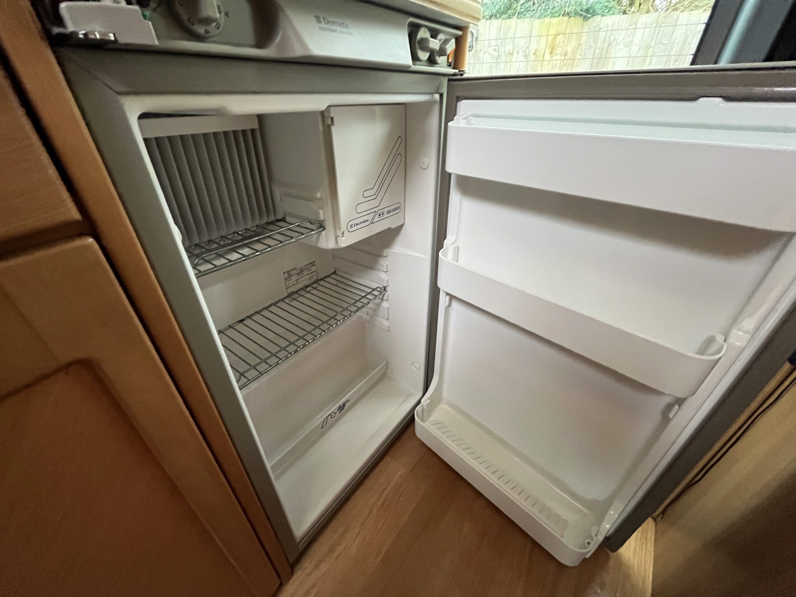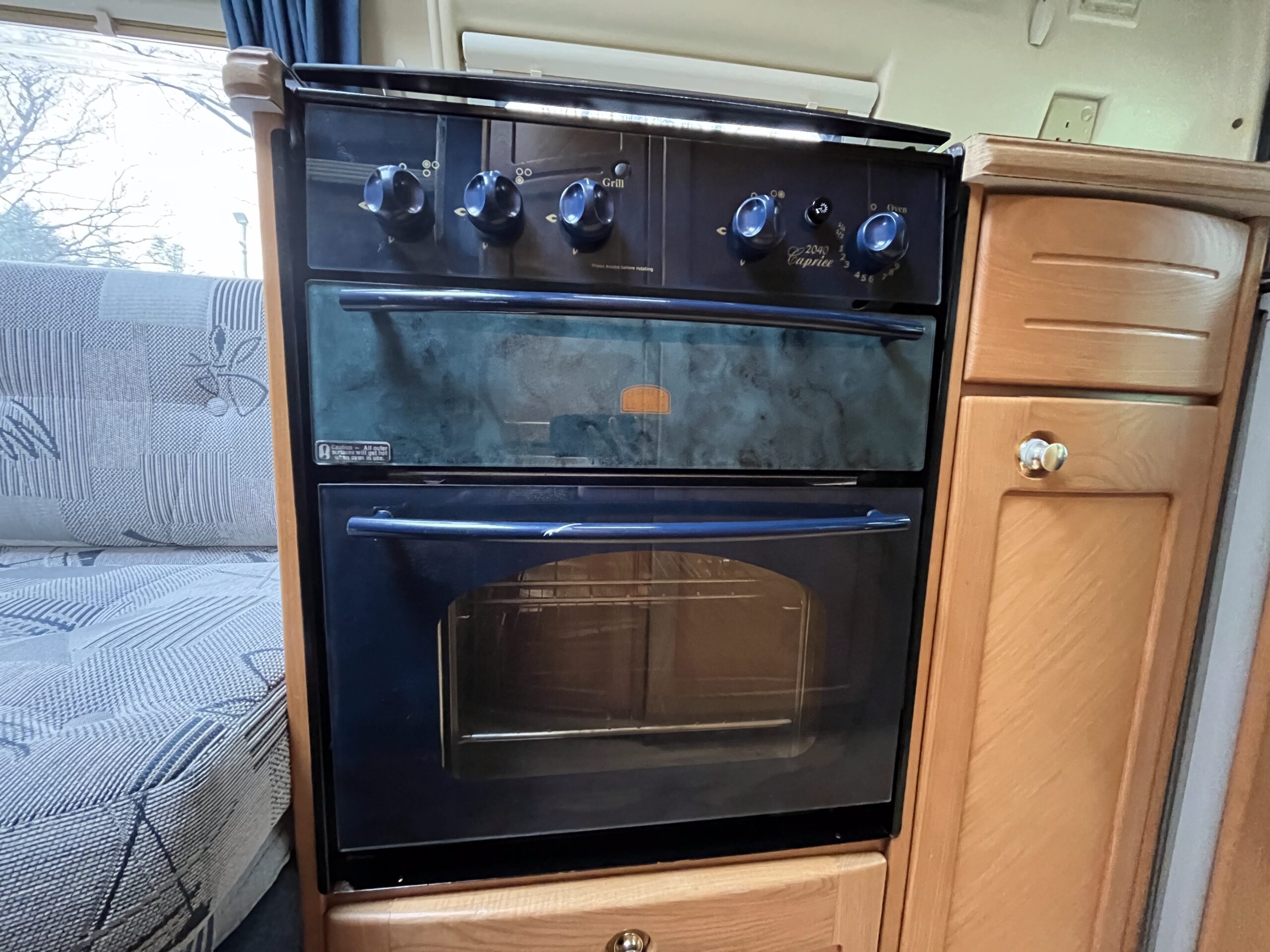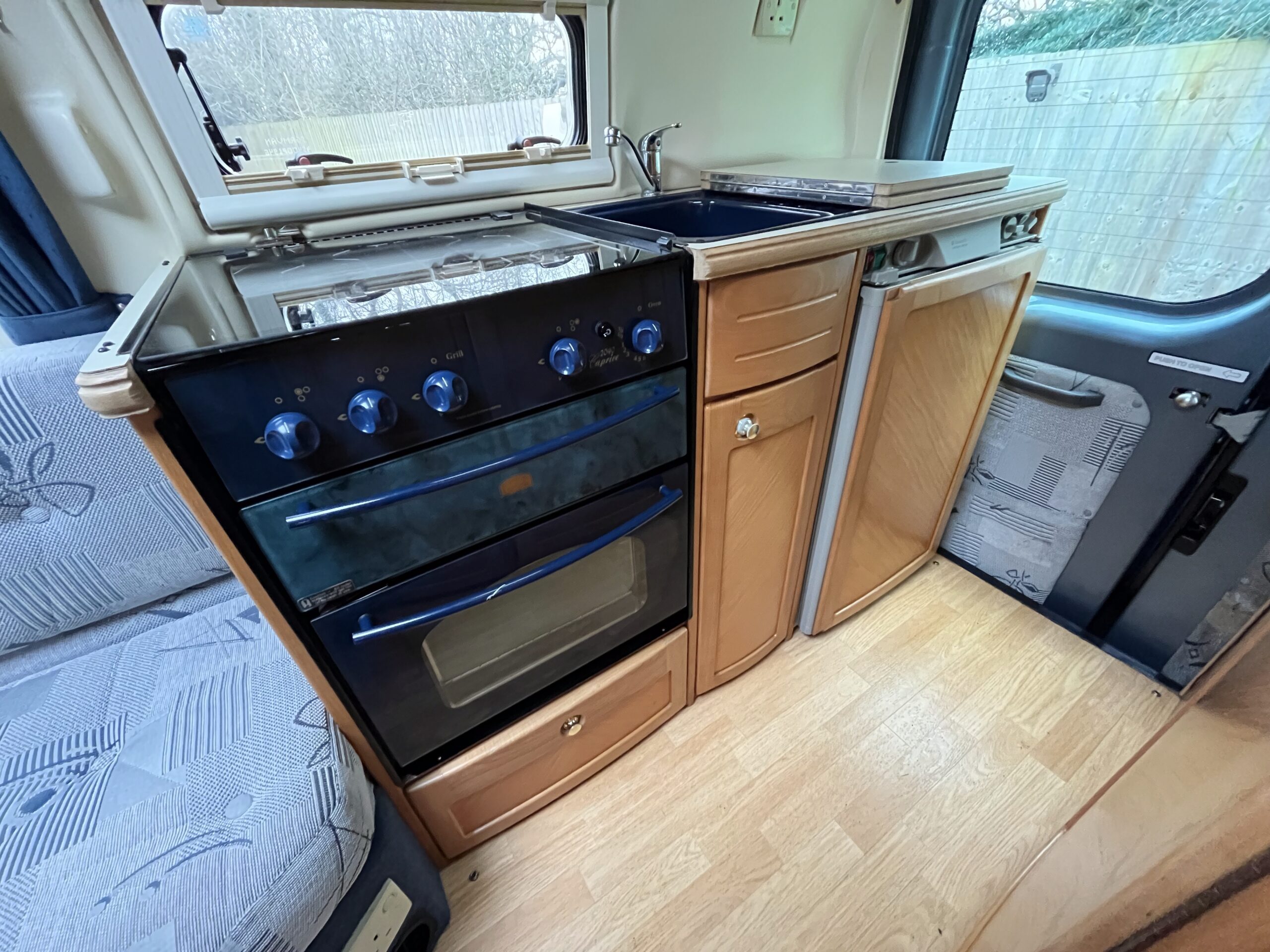 As you move further to the rear you have a well laid out kitchen with 3 gas hob, oven/grill and a sink with mixer tap, 3-way fridge and various 240v sockets. Adjacent to the kitchen you have a good-sized washroom with a toilet cassette, foldable basin with hot and cold taps, shower and storage cupboards.