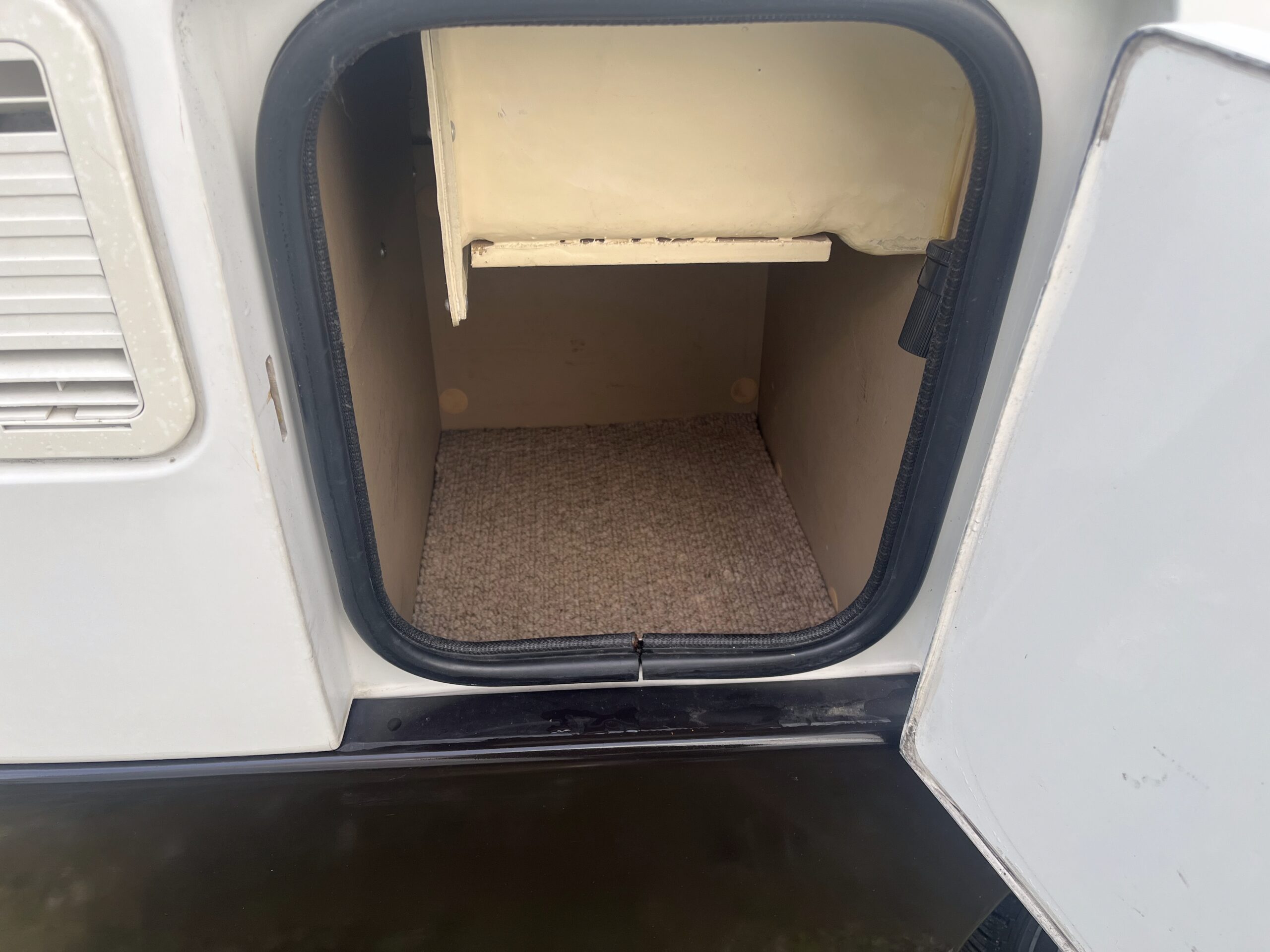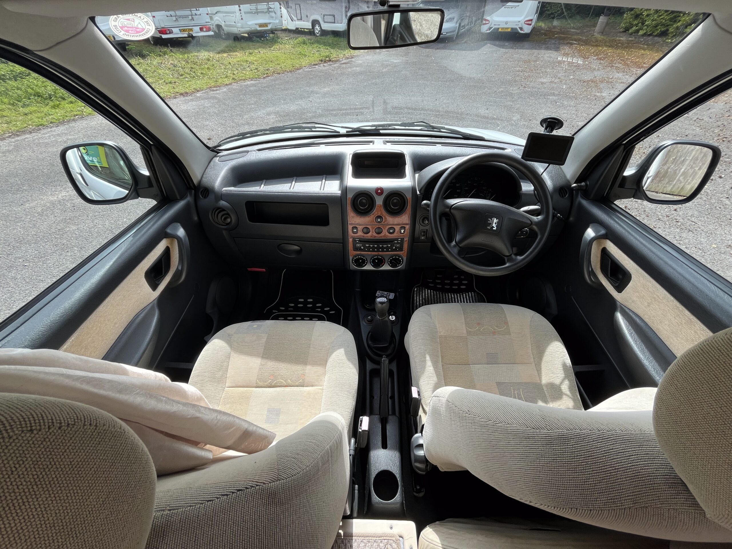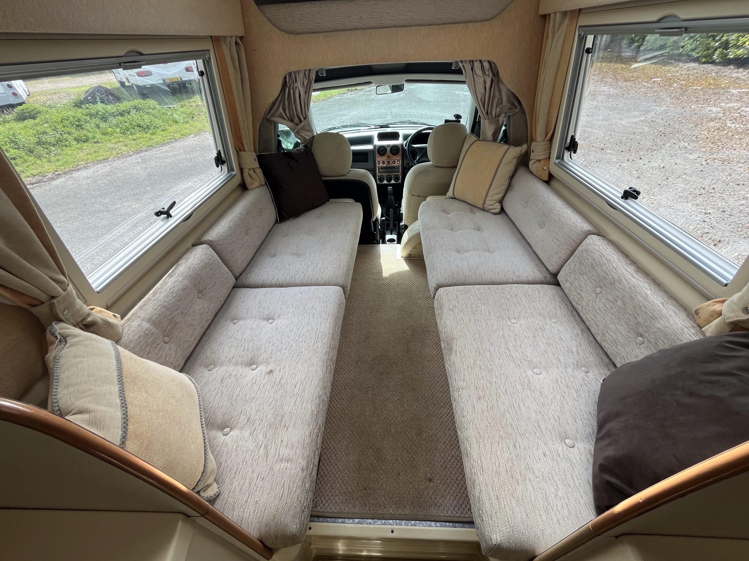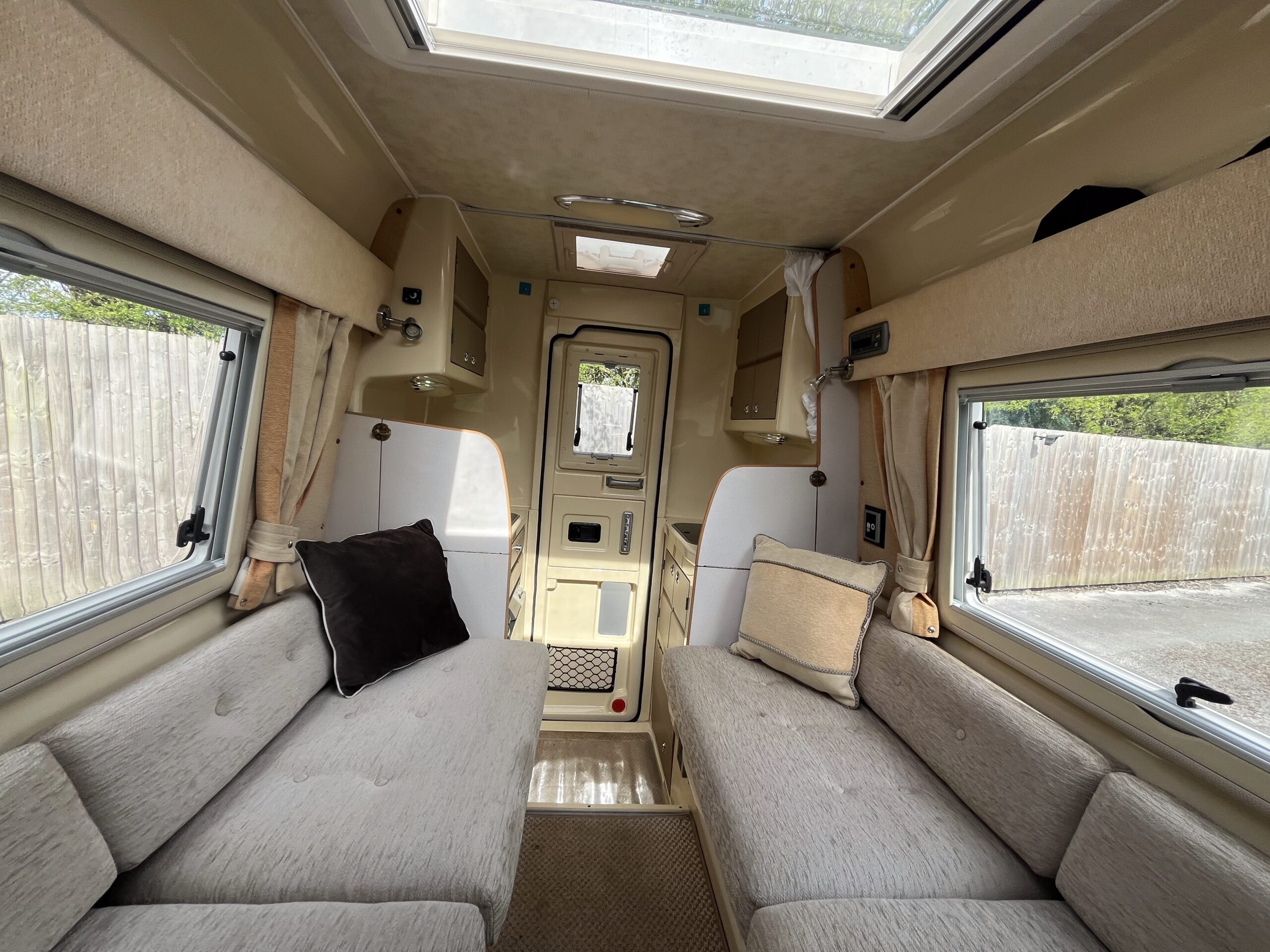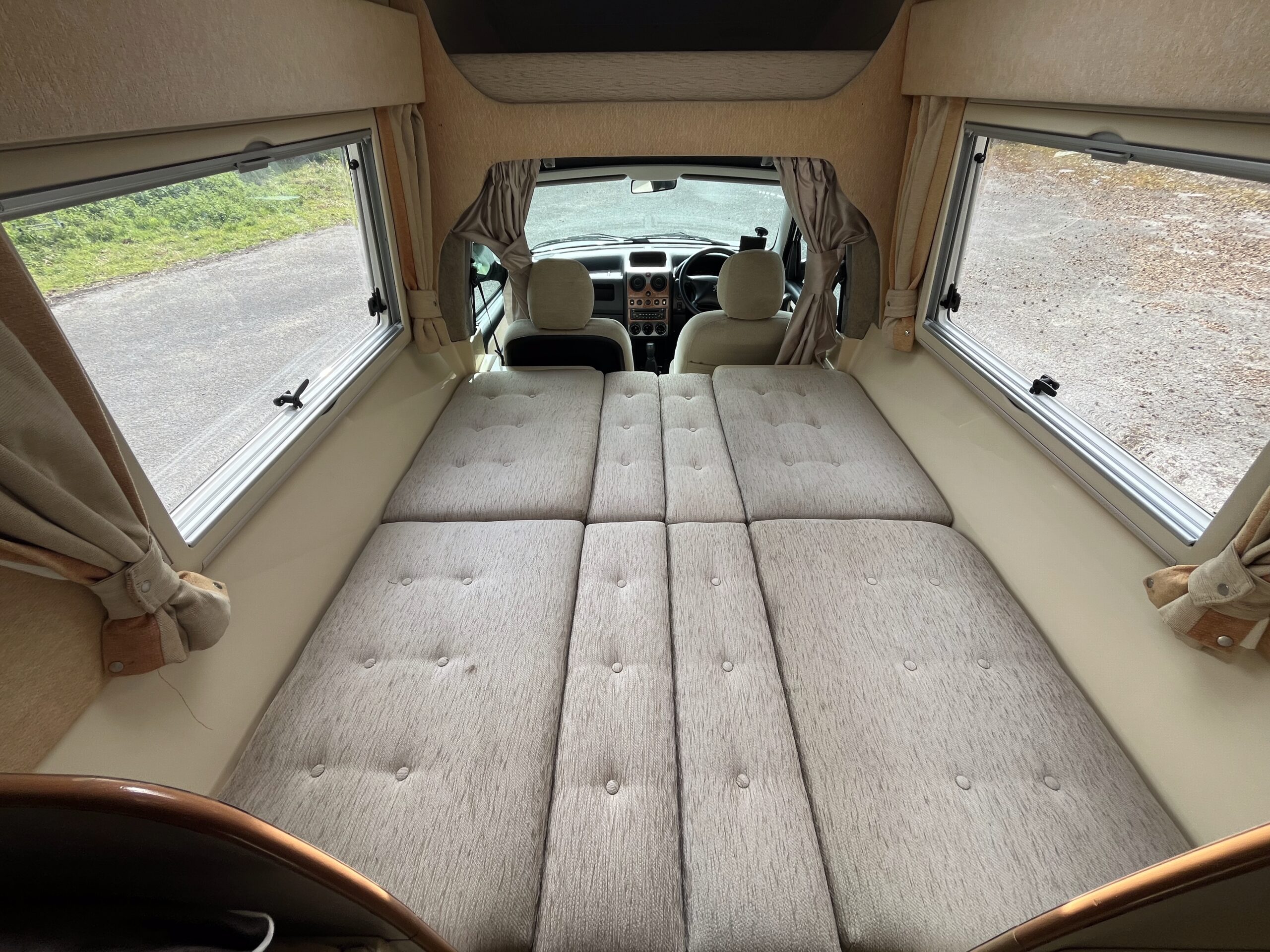 This 2 berth campervan has 2 travelling seats with seatbelts. You could purchase a drive-away awning that fits to the rear of the campervan to provide additional living and sleeping space.