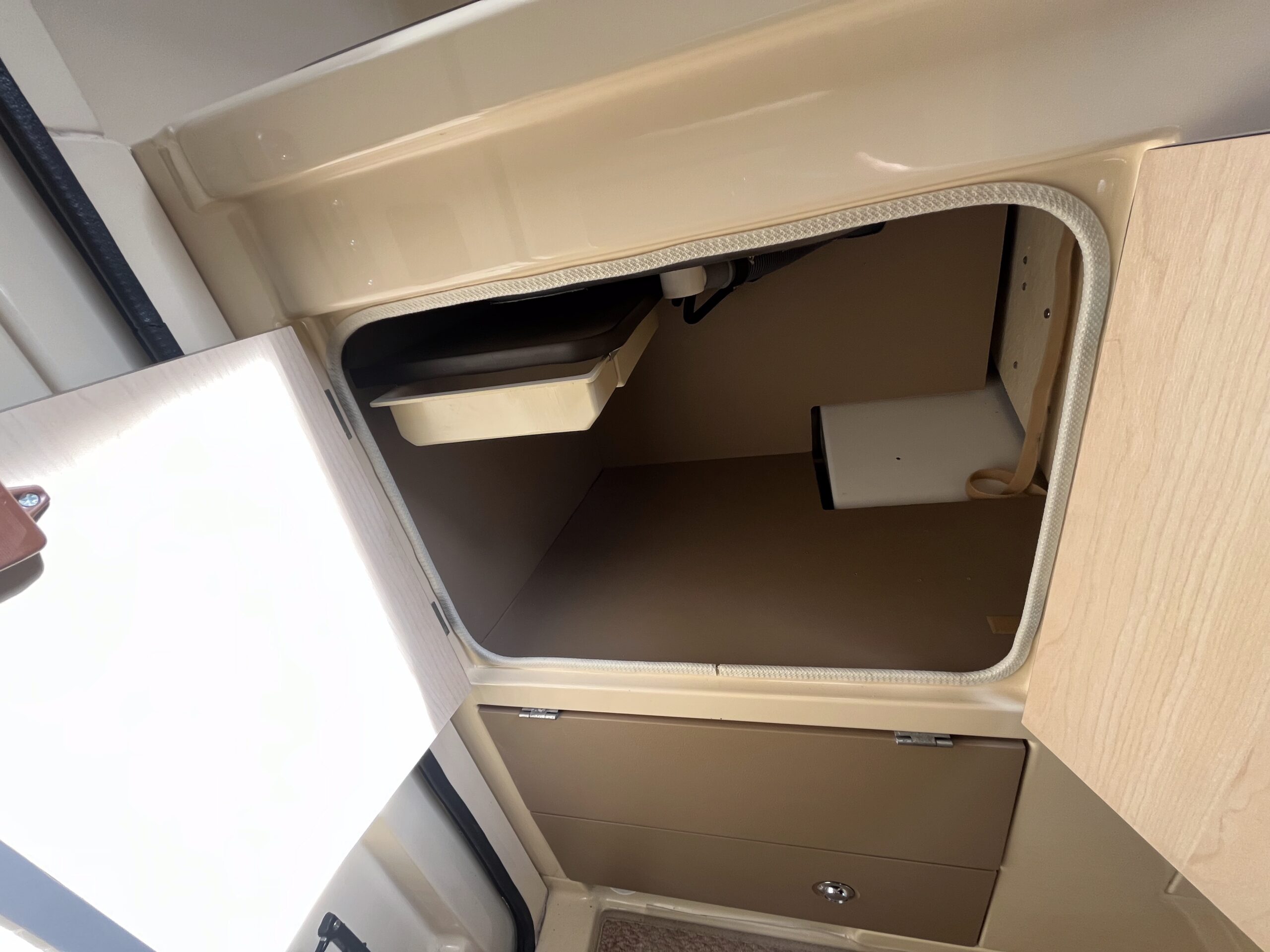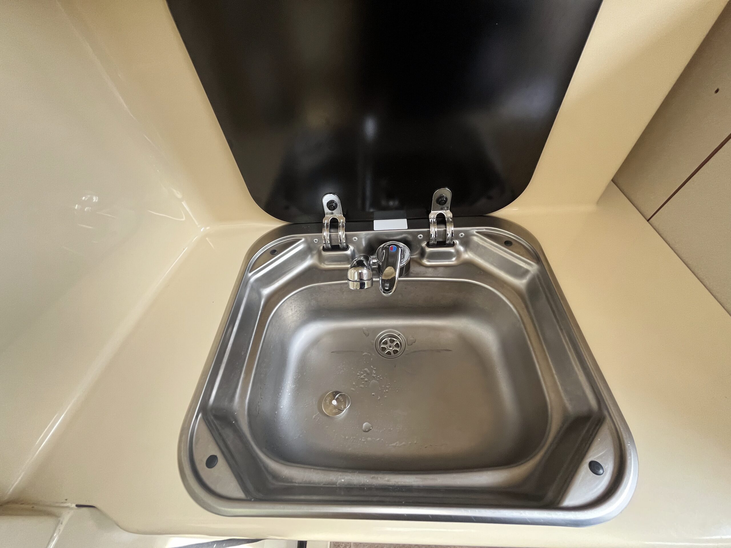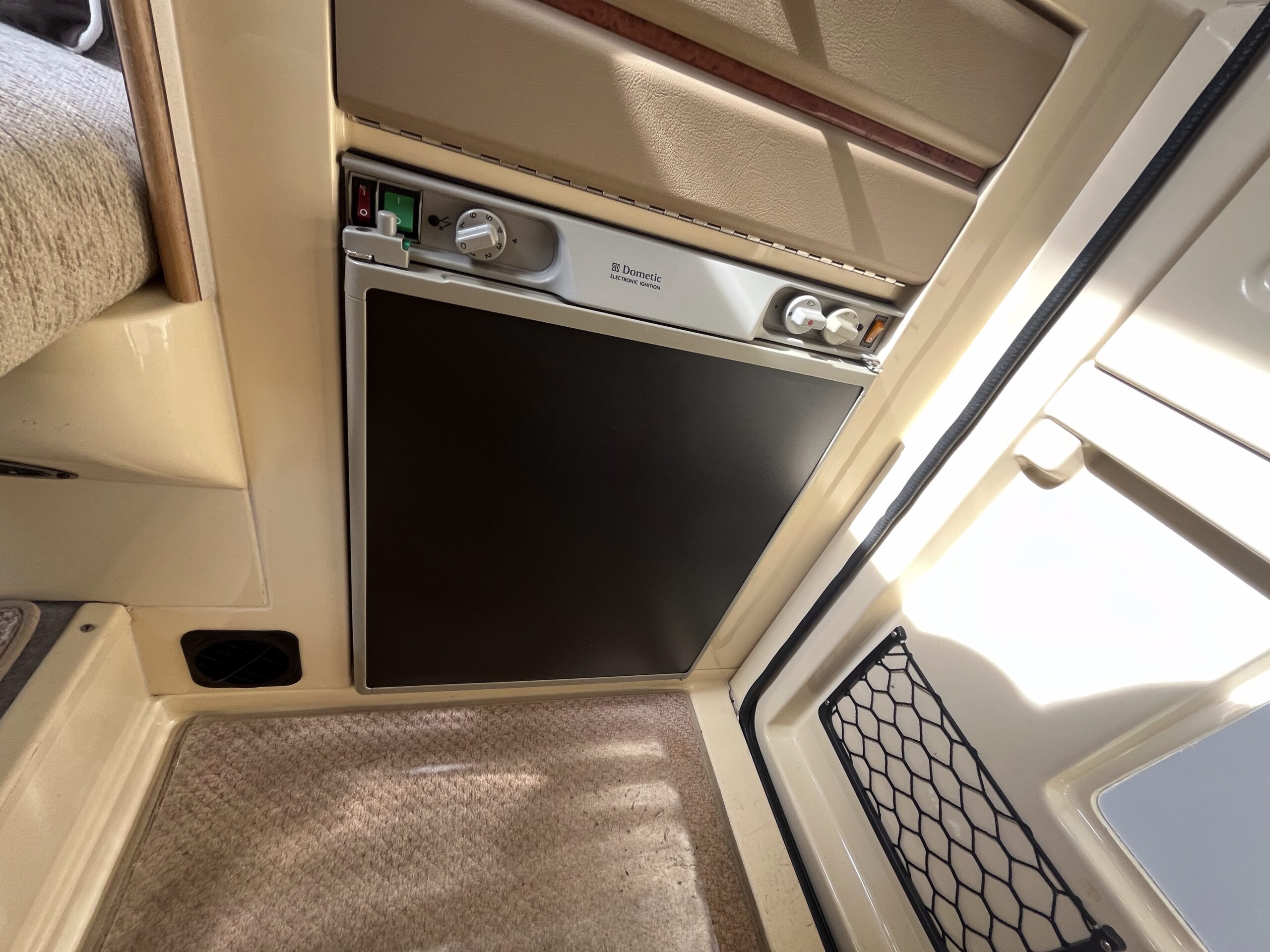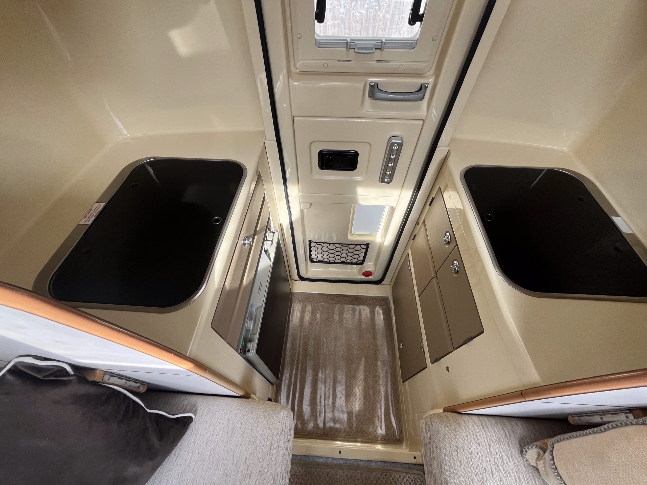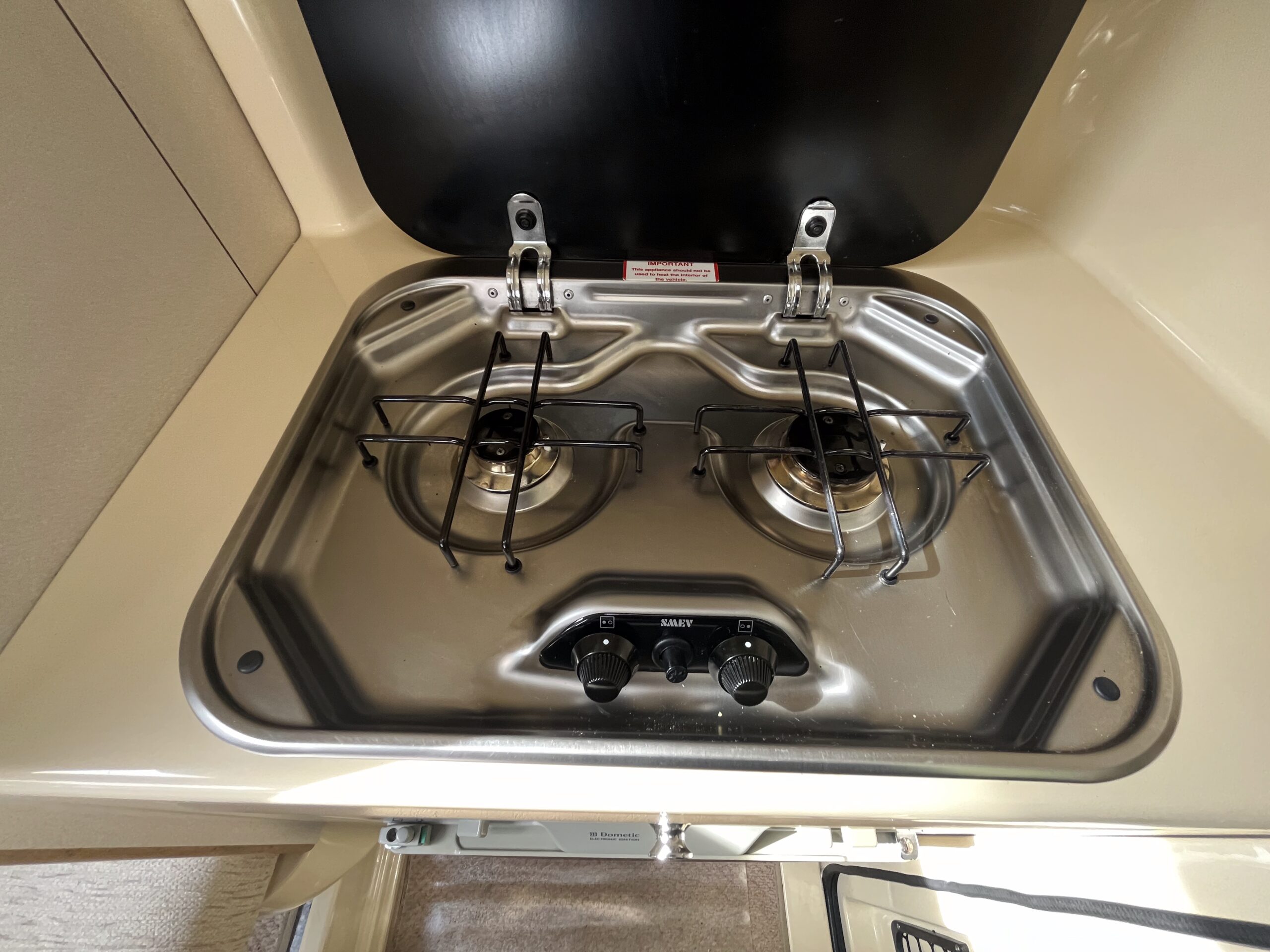 Open the rear access door and step inside, immediately you are in the kitchen area with the sink on your left with mono water tap and a 2 gas burner hob on your right with a gas grill beneath and a Dometic three-way powered fridge working on 12v, 230v or gas. Above the sink is a storage cupboard for your holiday provisions, and on both sides you have fold down additional counterspace.