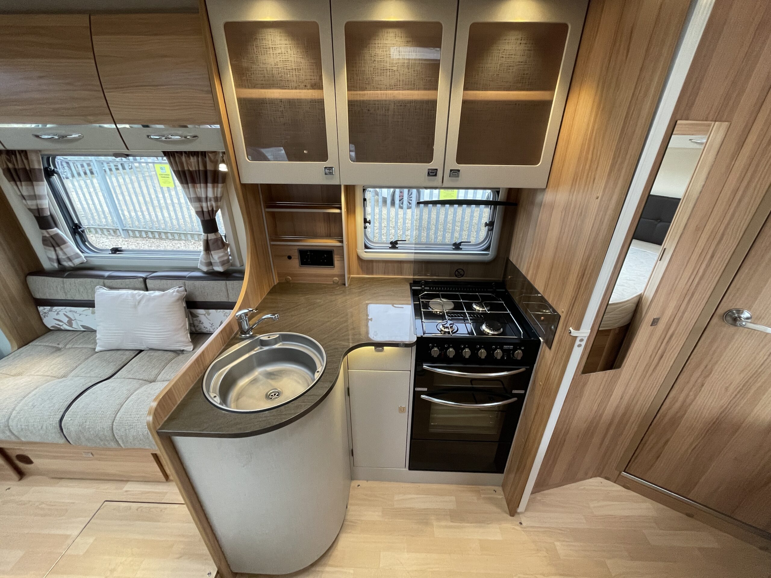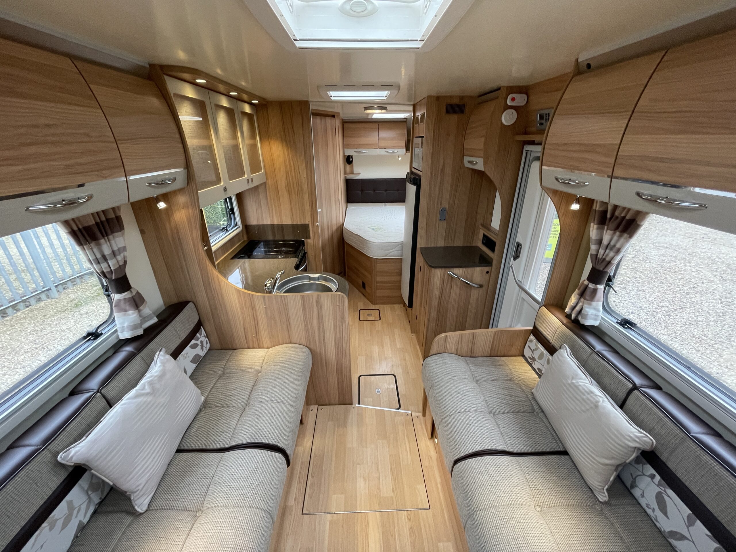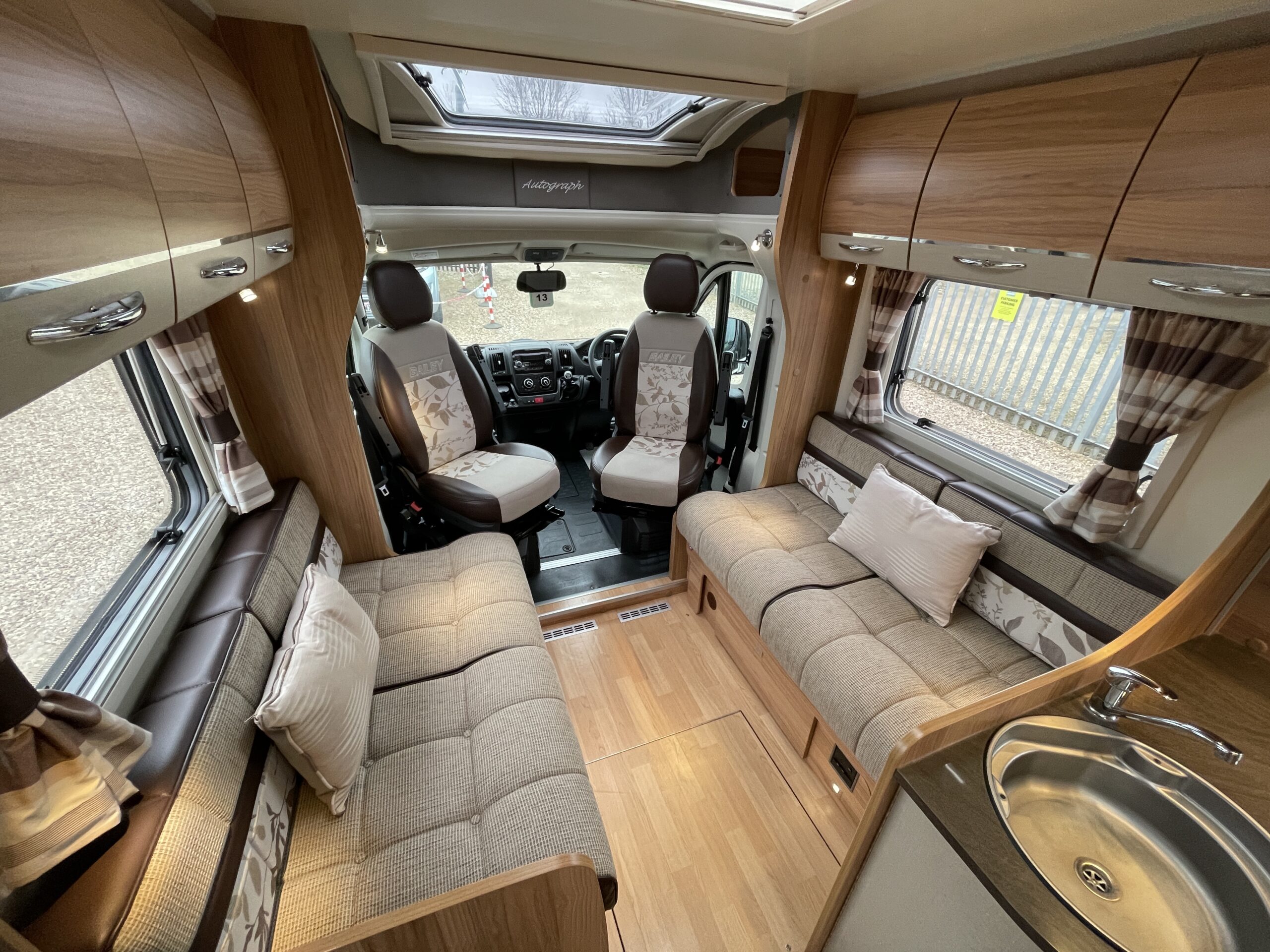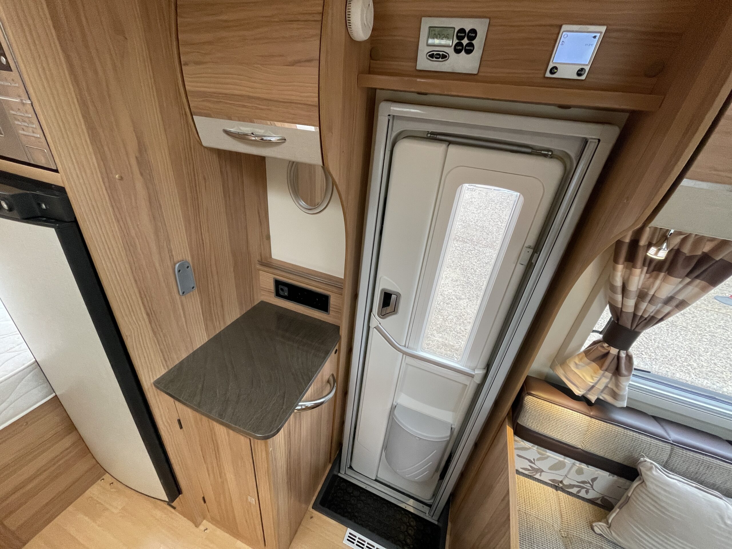 When entering the motorhome you will be greeted with a classically designed motorhome. To your left you have a lounge area which offers plenty of light and comfort. The lounge will give you more than enough space for 5-6 adults utilising the front swivel seats. The motorhome does provide a foldable table that can be put up inside or outside. The table has its own cupboard in the kitchen area that means it can be neatly folded away. The bench seats in the dinette can also be configured to create you a large double bed, this can be set up quickly and easily for friends or family stopping over. As you move back to the middle of the motorhome you have a kitchen area that is equipped with all the necessary kitchen essentials such as an oven, grill, gas hobs, microwave, XL fridge with freezer compartment and large sink basin.