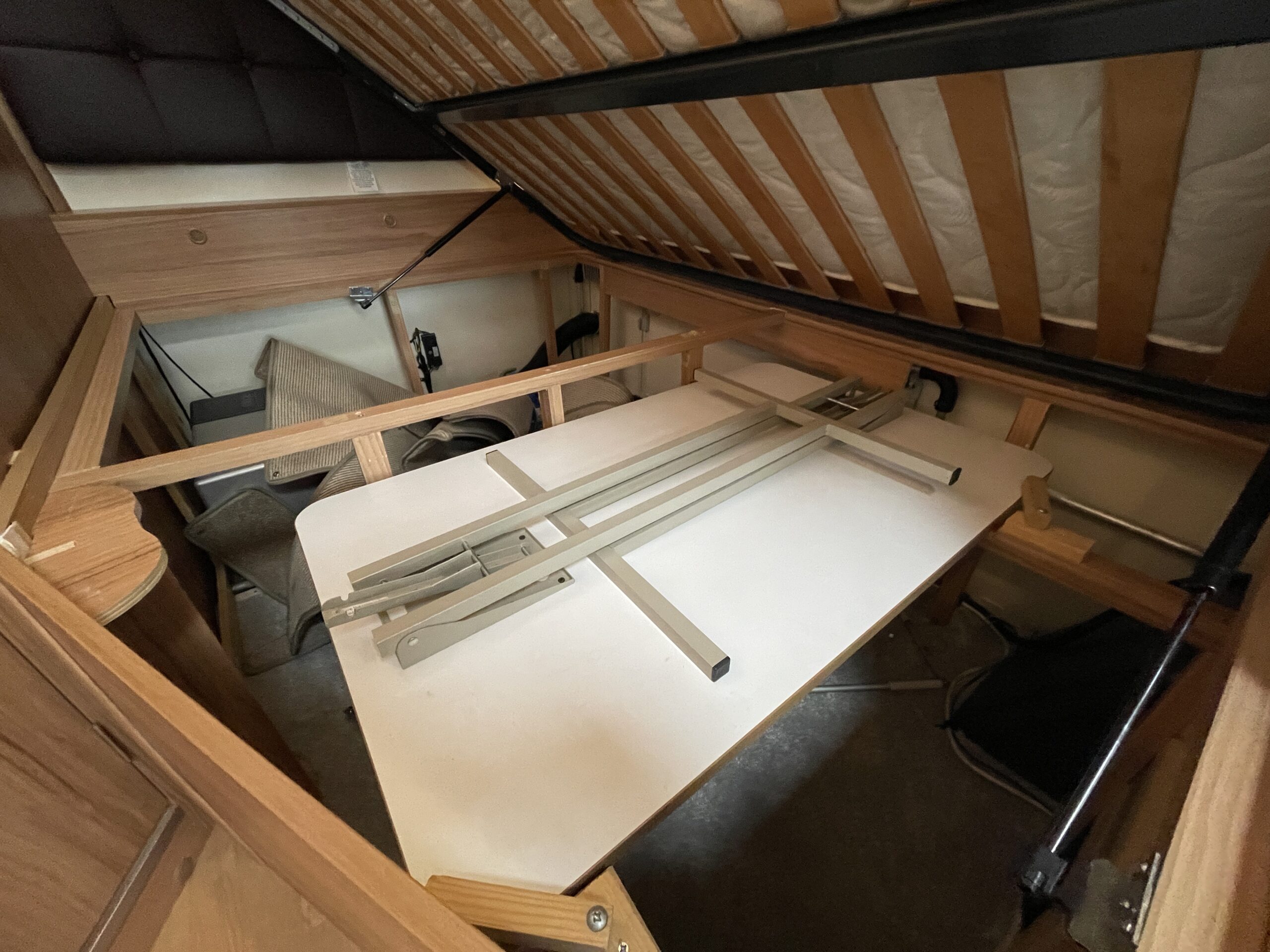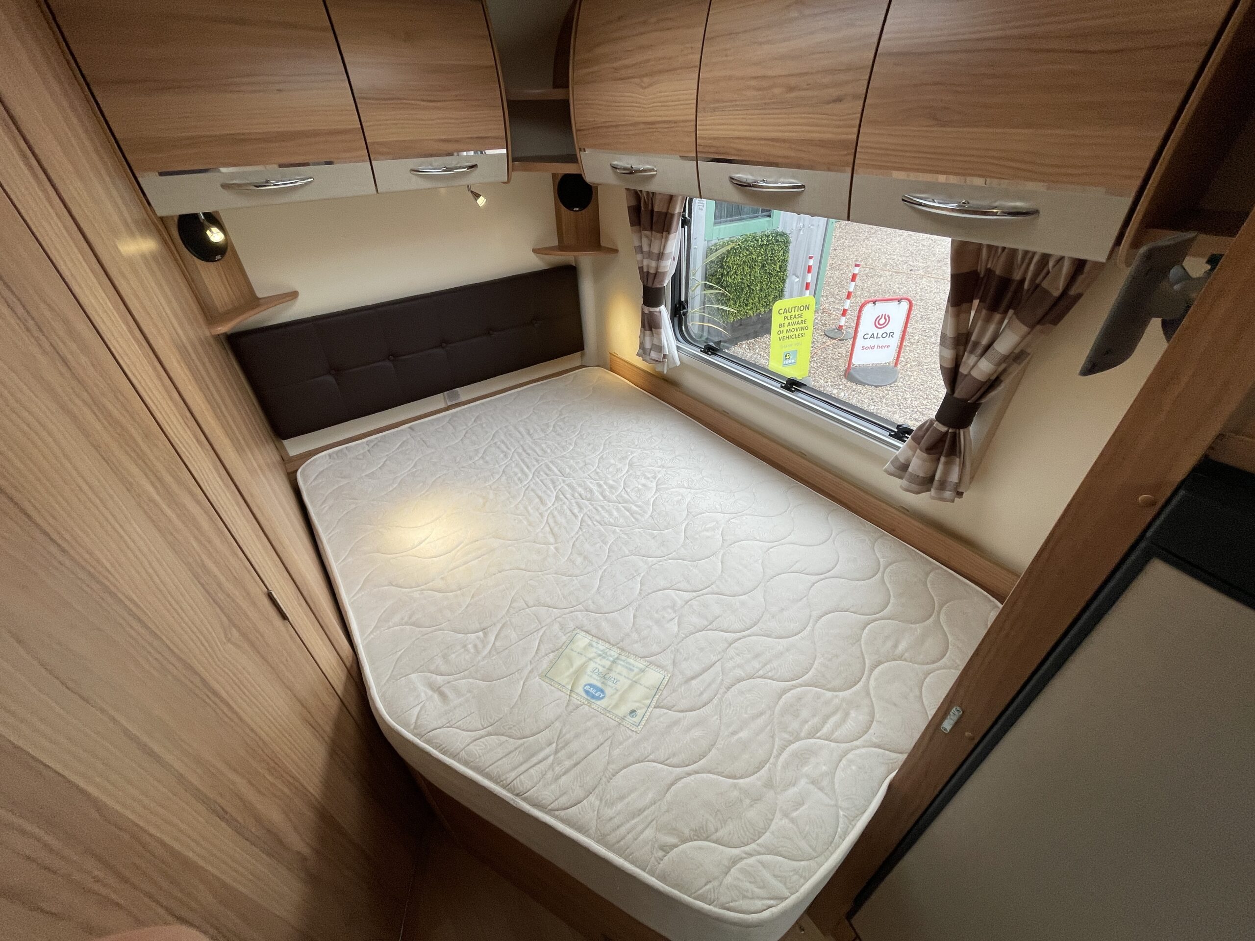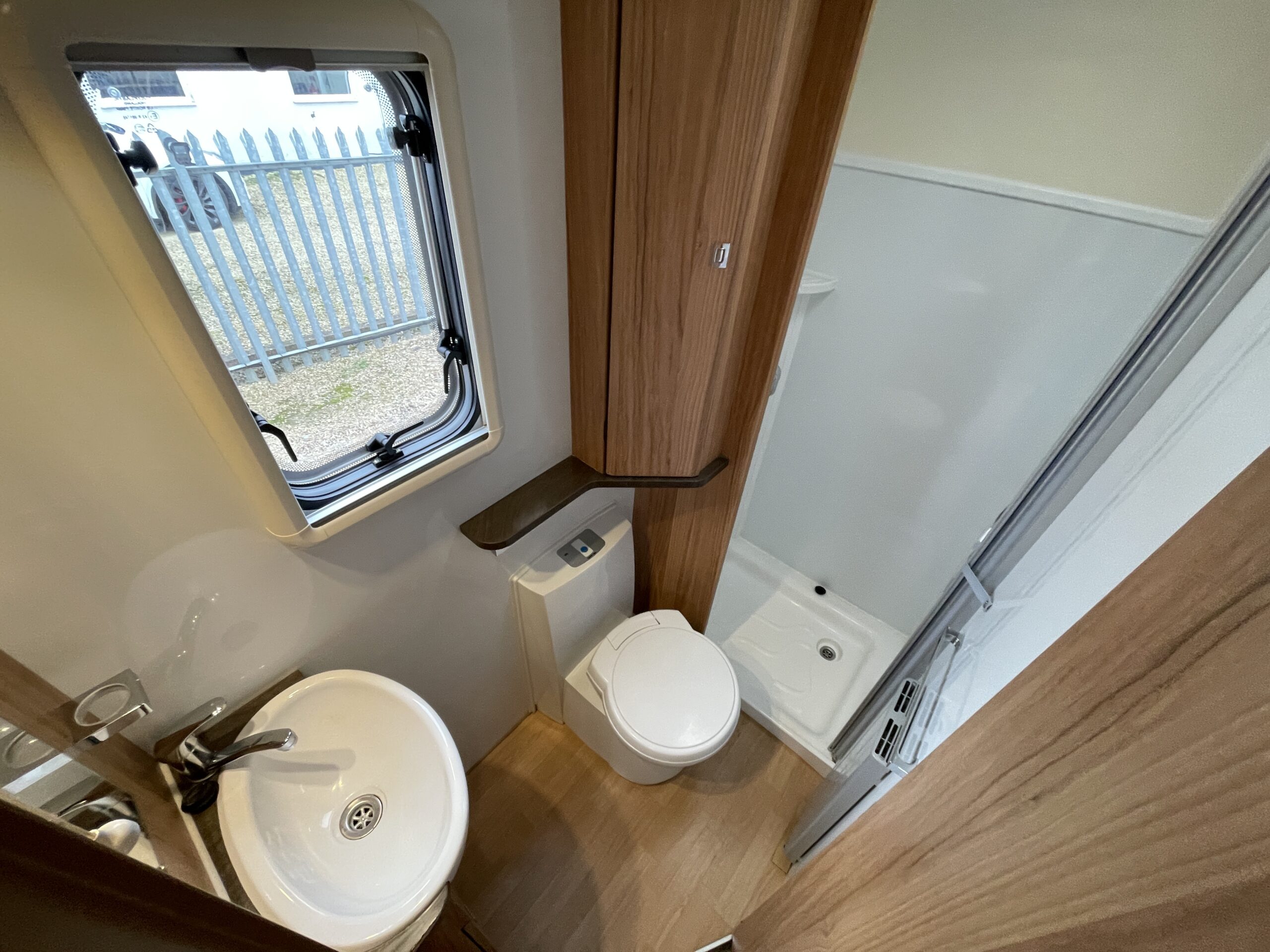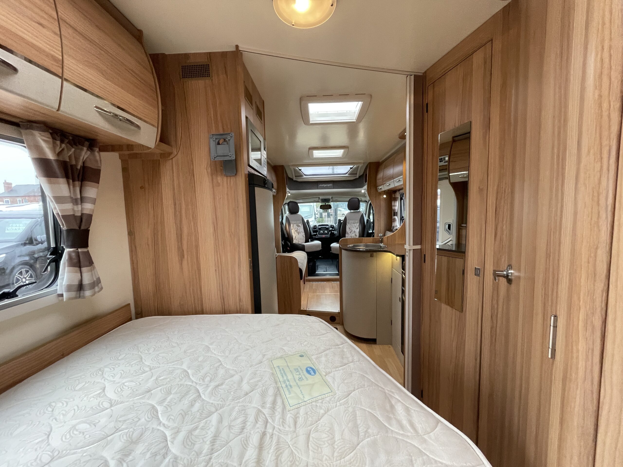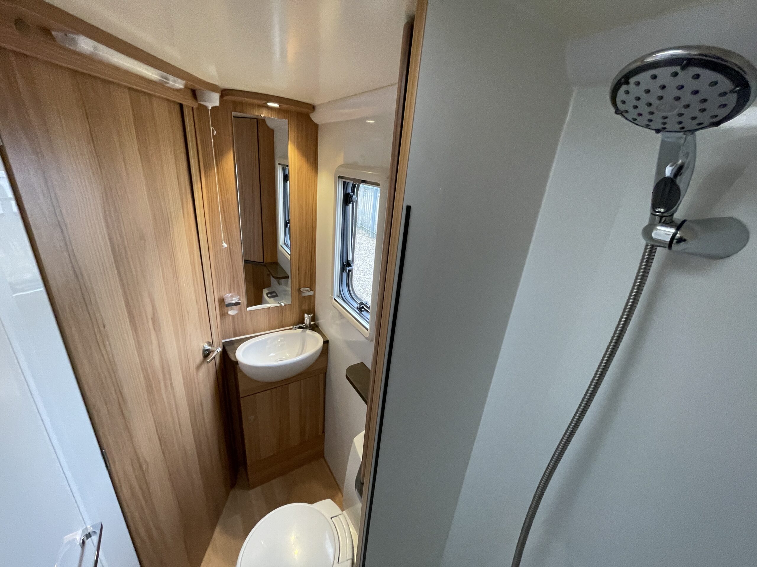 Towards the rear of the motorhome you have a bedroom area which provides you with a French bed layout with adjacent bathroom and shower. The bedroom can be sectioned of to give maximum privacy from the rest of the motorhome. The bed can be lifted to give you access to the boiler and a general storage area which is also accessible from the outside. Plenty of overhead storage is also available along with a TV port for viewing in the rear. The bathroom is large and gives you a very desirable separate shower and toilet cubical, you have more storage as well as a large vanity mirror.