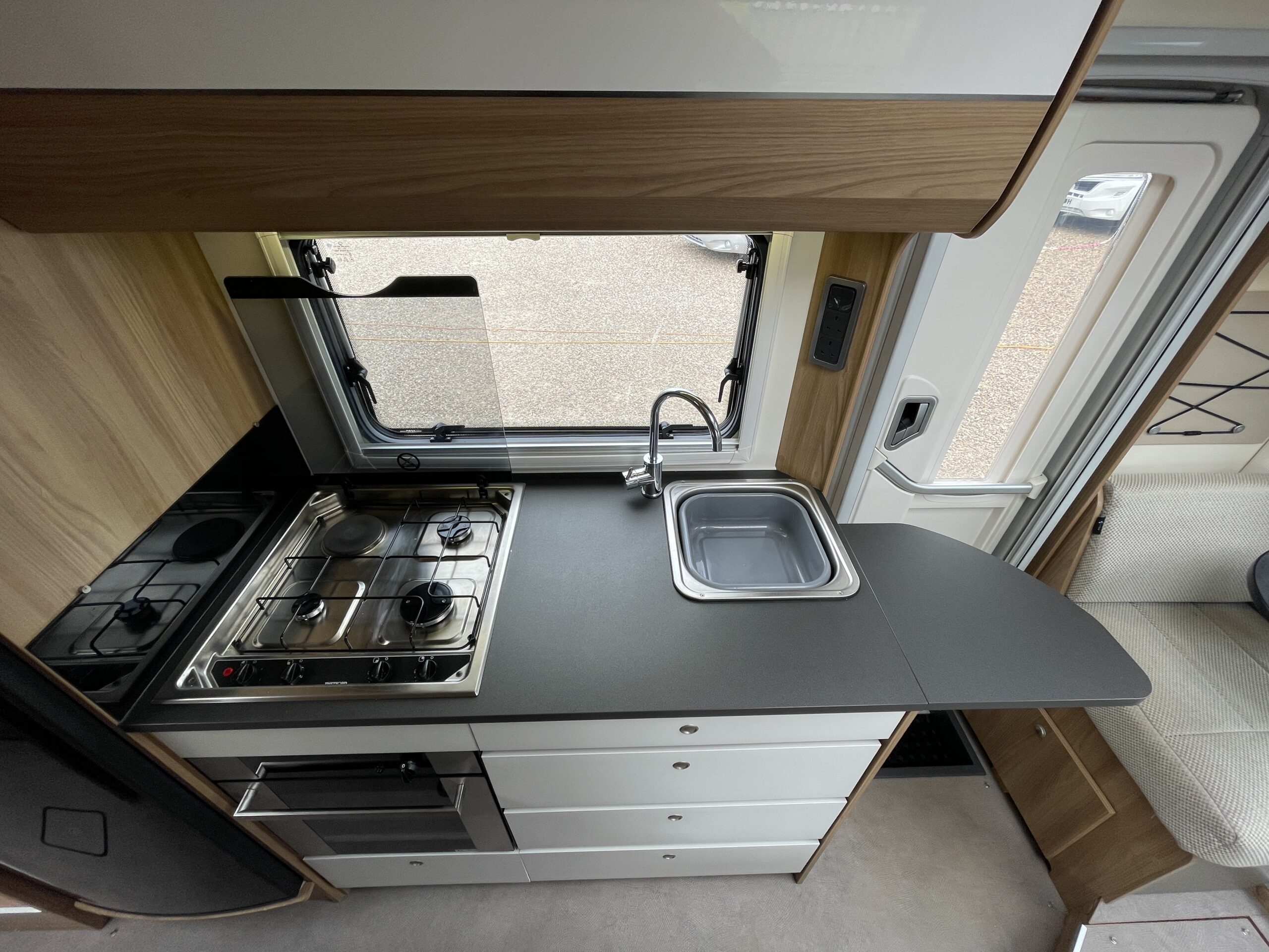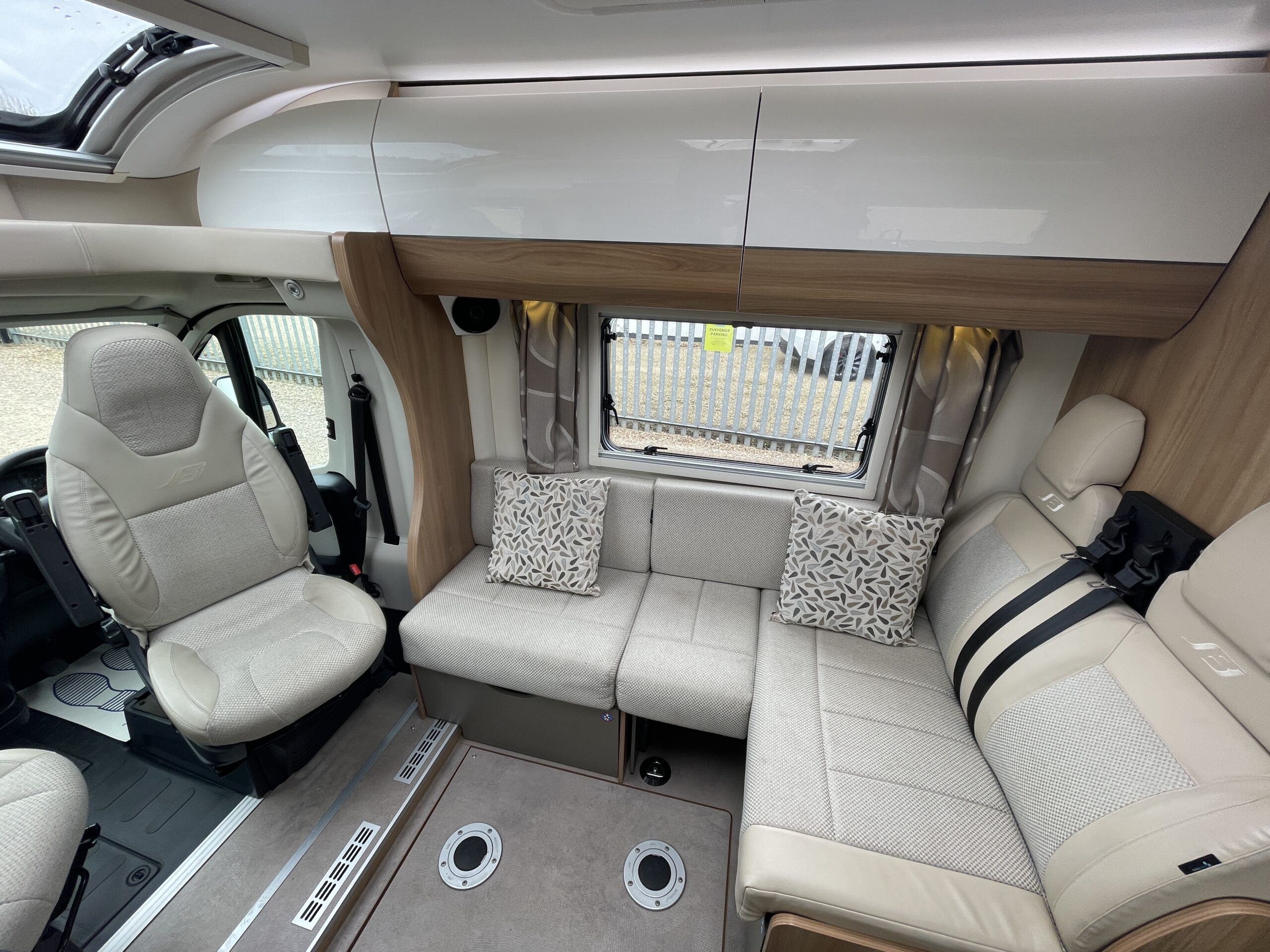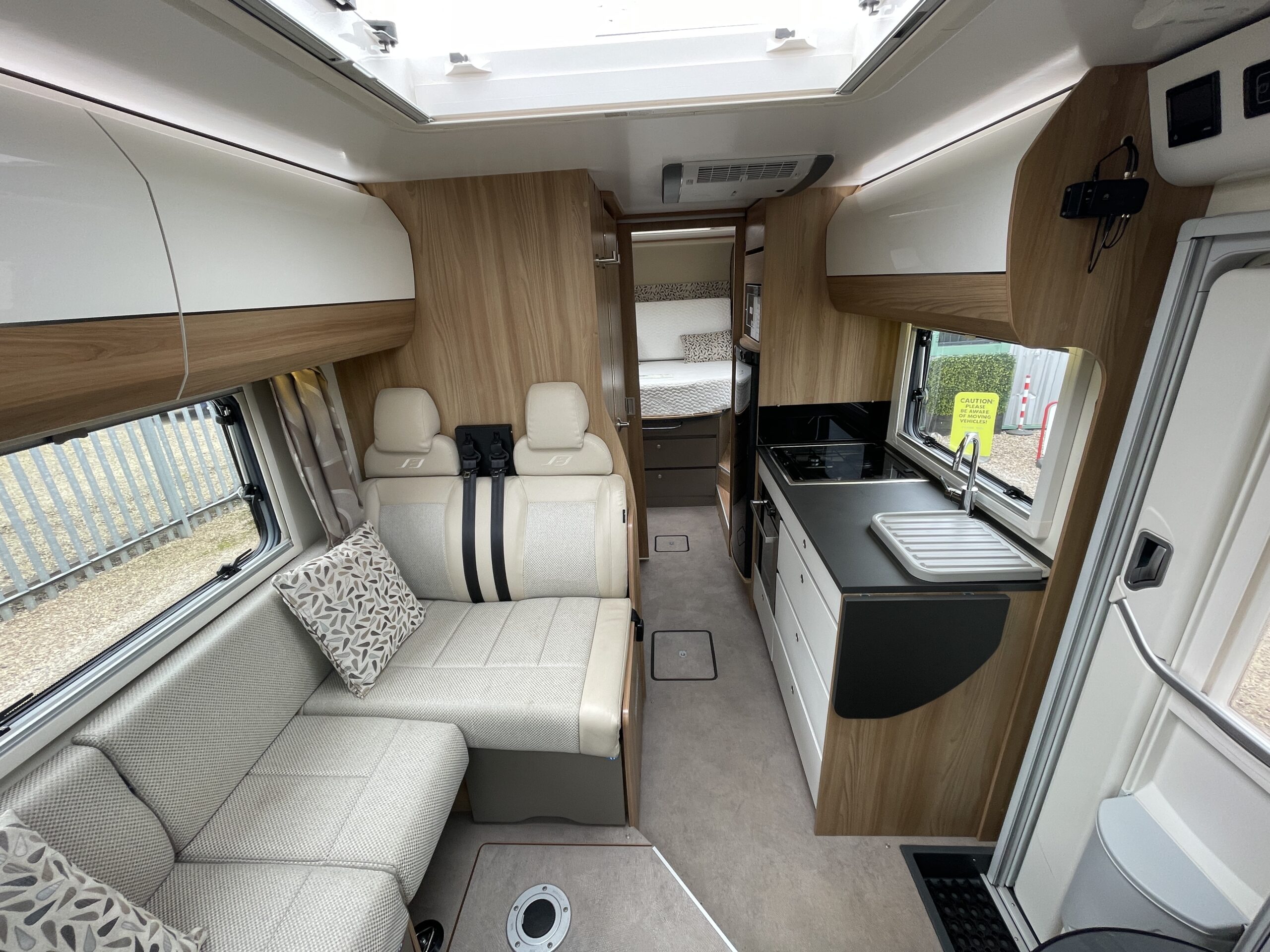 At the very font of the 79-4 you have a large open living area which can seat up to 6 people at any given time. Your extra 2 travelling seats are also situated in this area nice and close to the driver. The L-Shape seating arrangement can easily be turned into a double bed for 2 adults making this motorhome a 4 berth 4 belt proving travel and sleeping arrangements for everybody. The lounge itself is an extremely spacious place where everyone can kick back and relax in between excursions. Surrounded by large opening windows and skylights the living space is never short of natural daylight which compliments the upholstery very well.