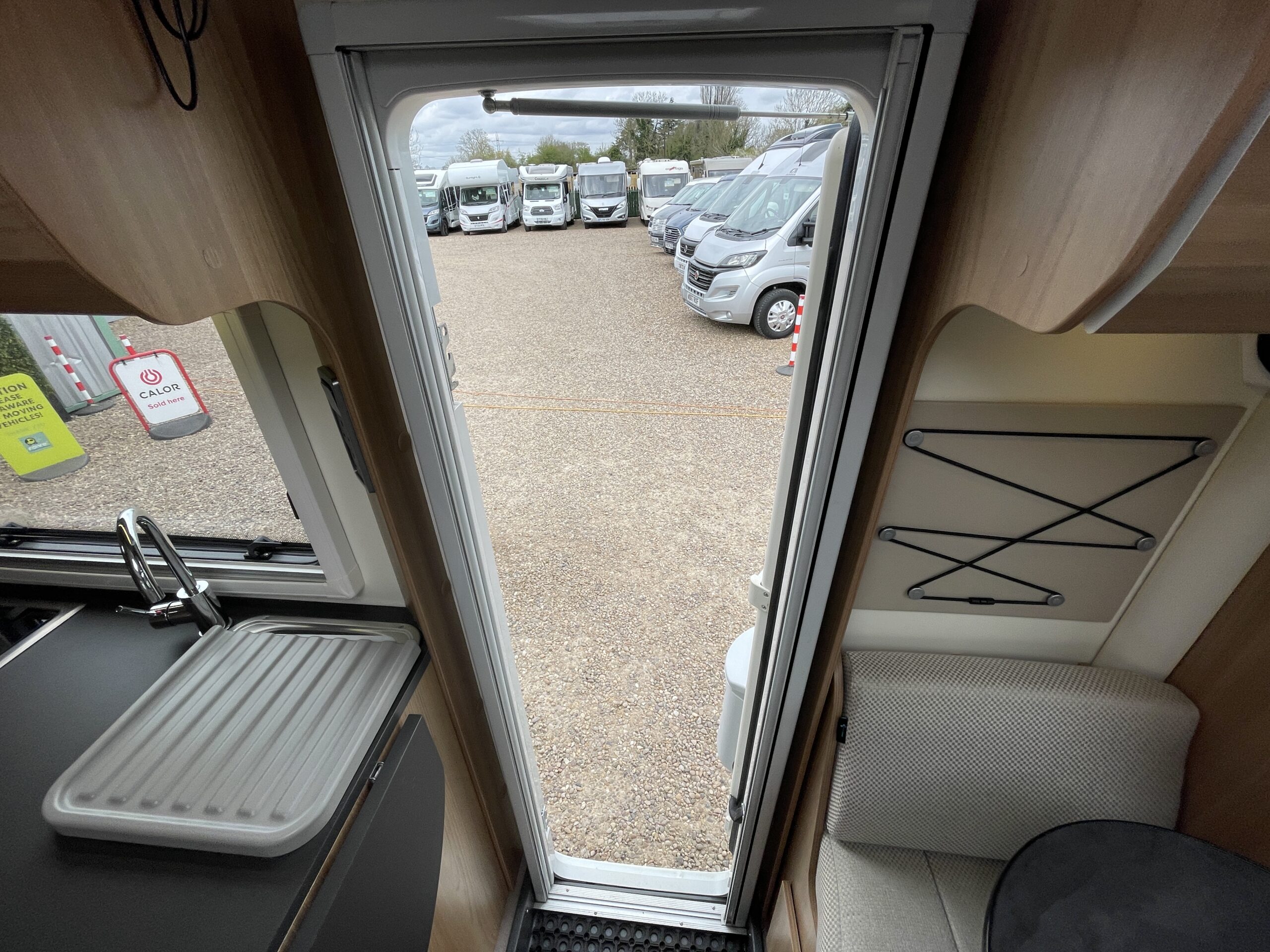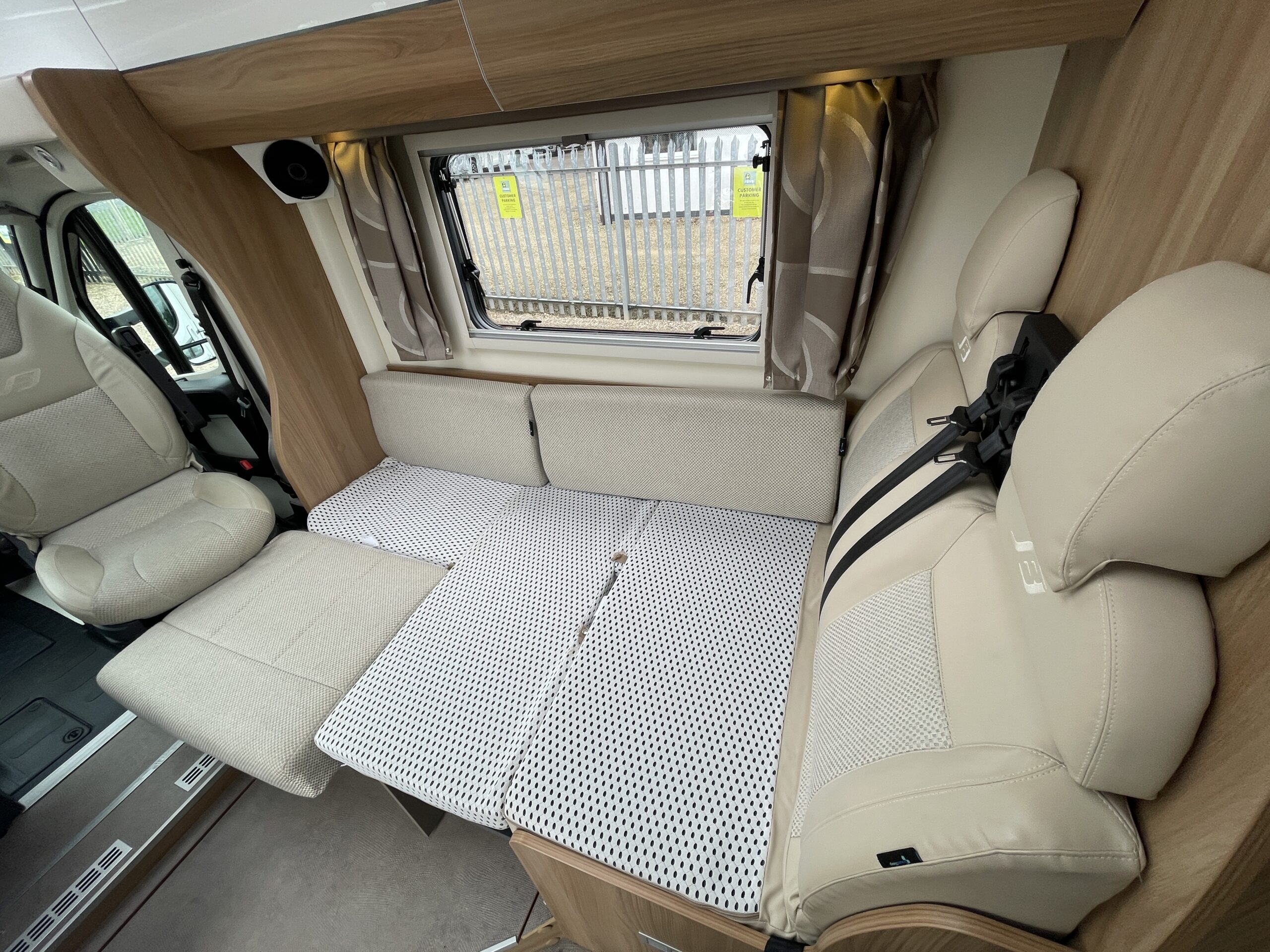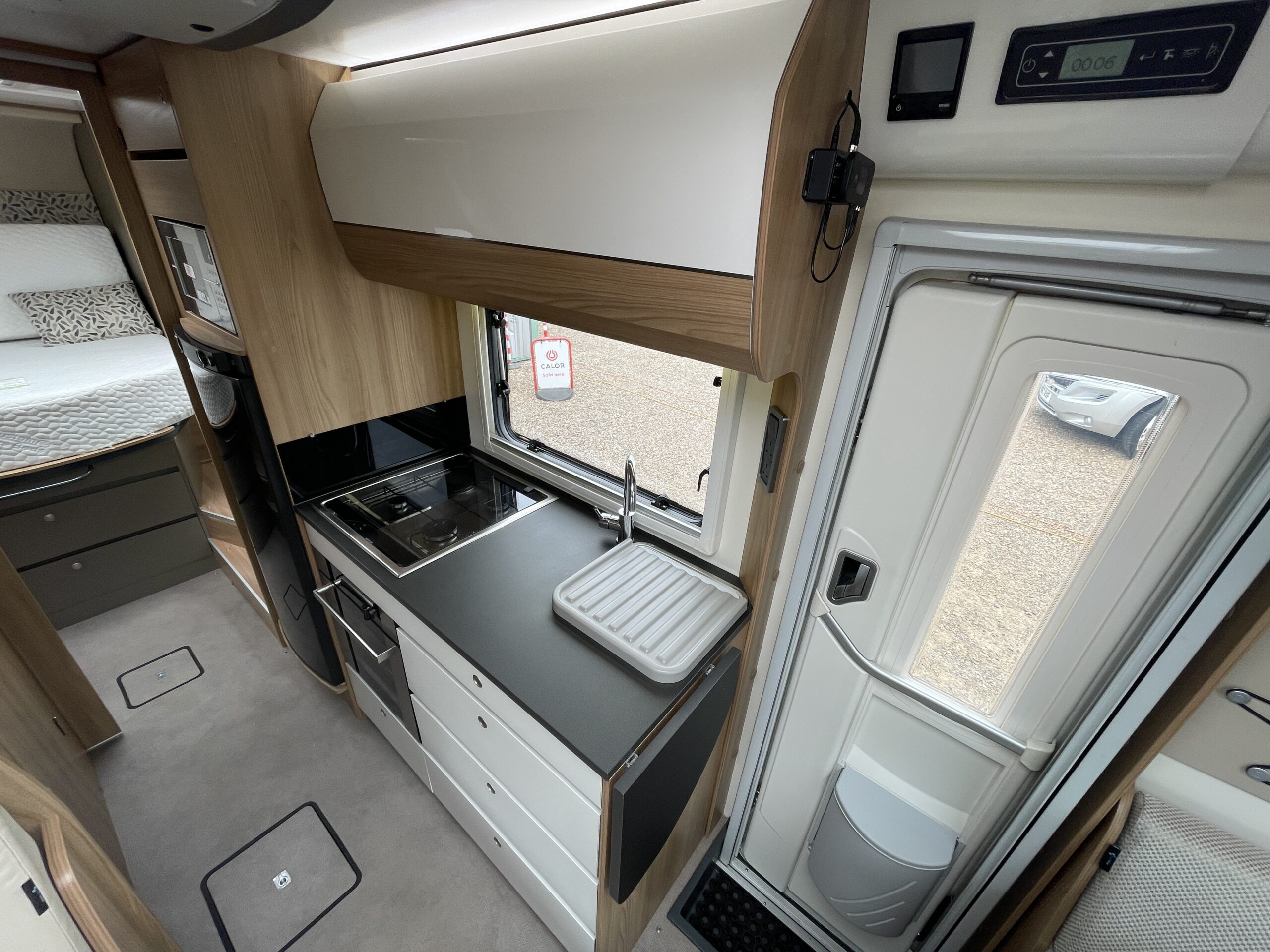 At the very font of the 79-4 you have a large open living area which can seat up to 6 people at any given time. Your extra 2 travelling seats are also situated in this area nice and close to the driver. The L-Shape seating arrangement can easily be turned into a double bed for 2 adults making this motorhome a 4 berth 4 belt proving travel and sleeping arrangements for everybody. The lounge itself is an extremely spacious place where everyone can kick back and relax in between excursions. Surrounded by large opening windows and skylights the living space is never short of natural daylight which compliments the upholstery very well.