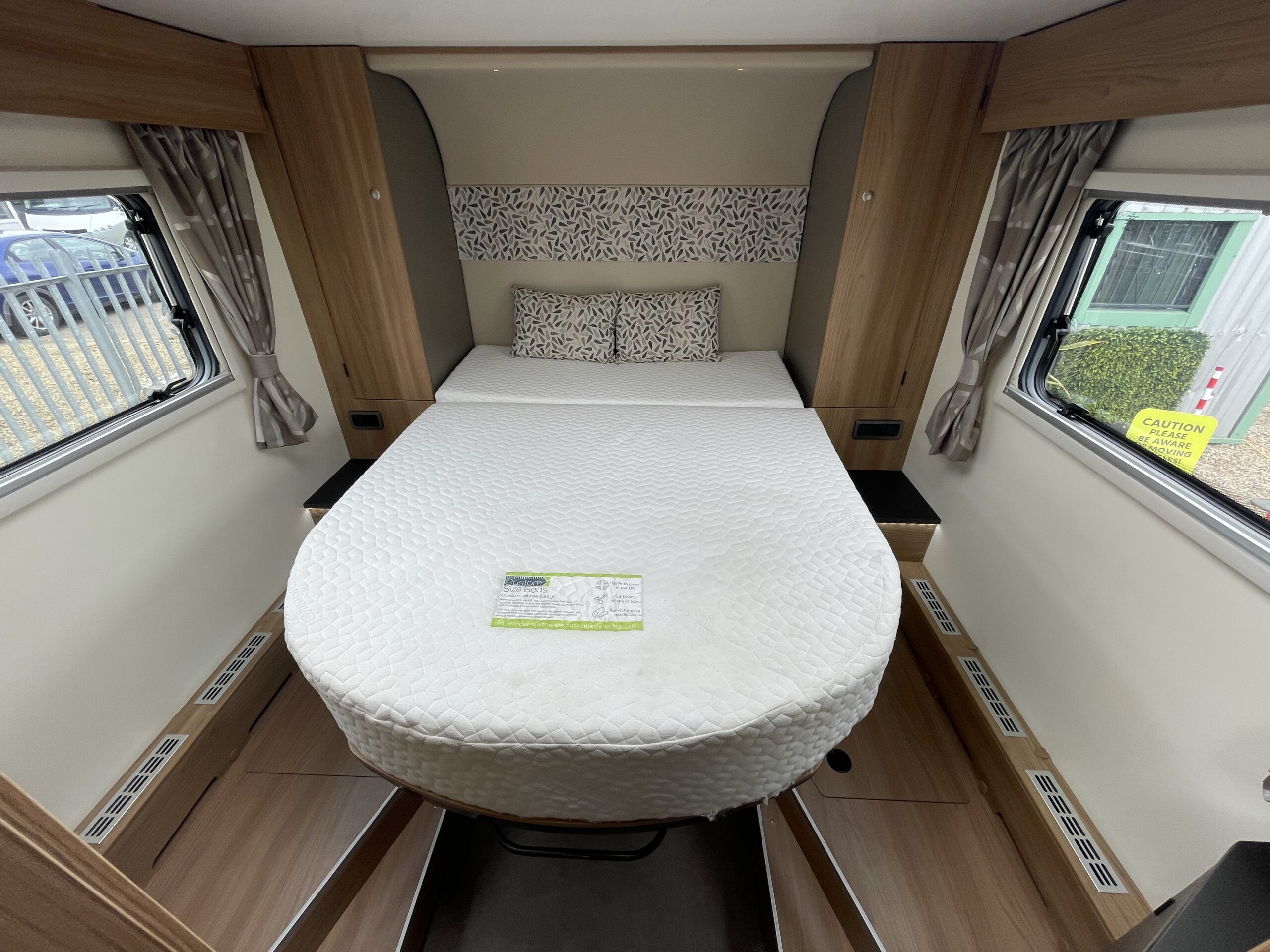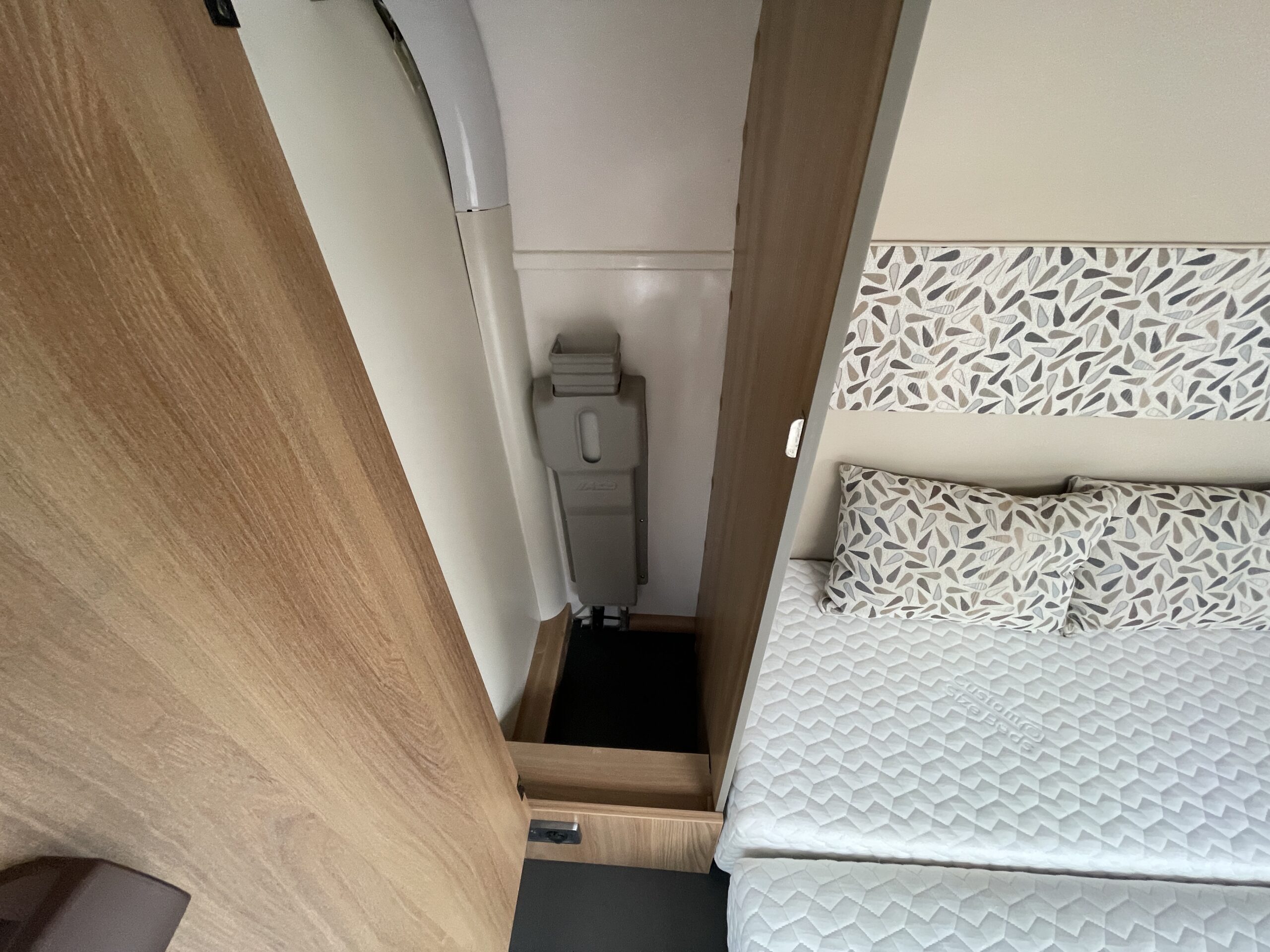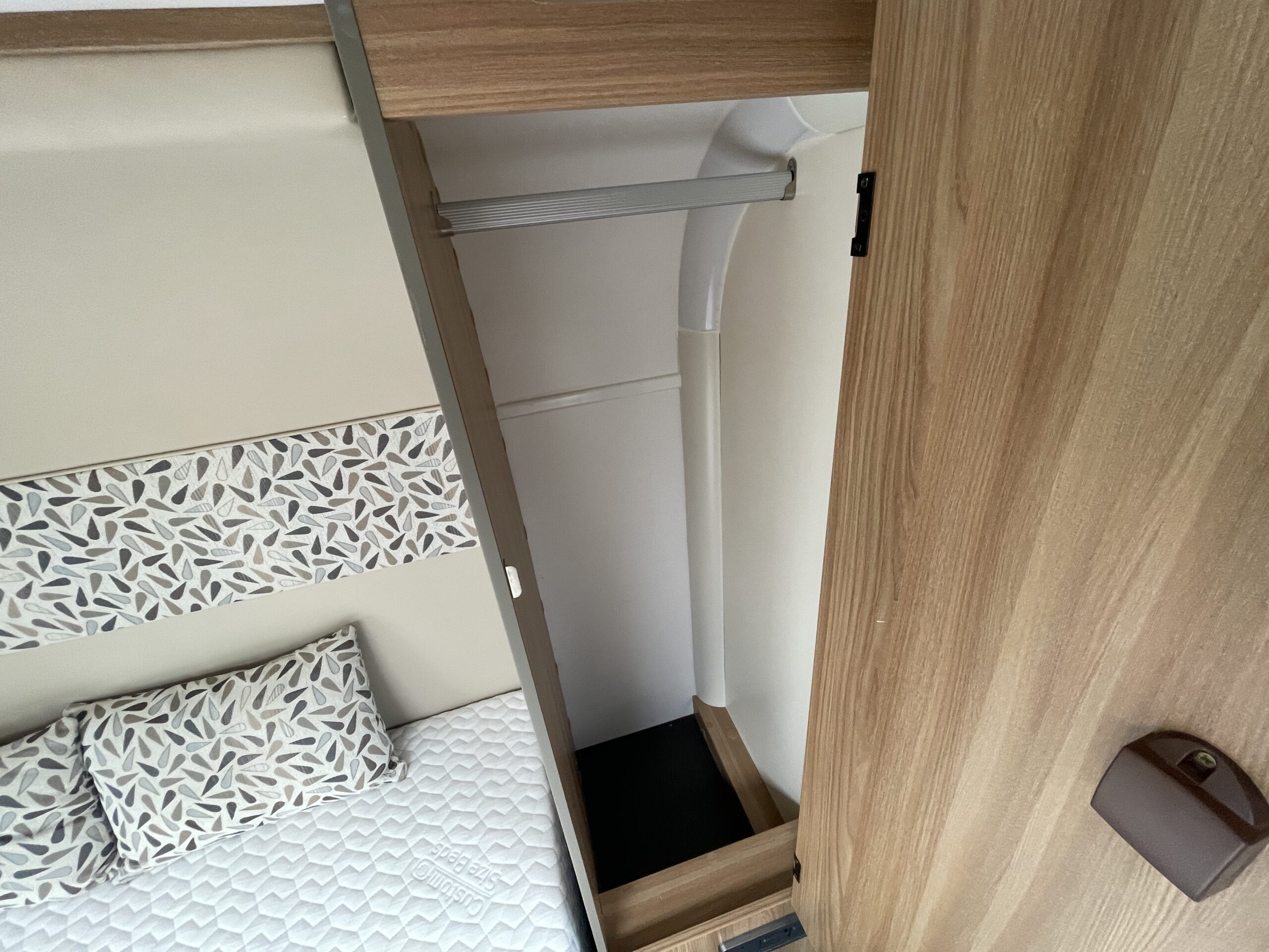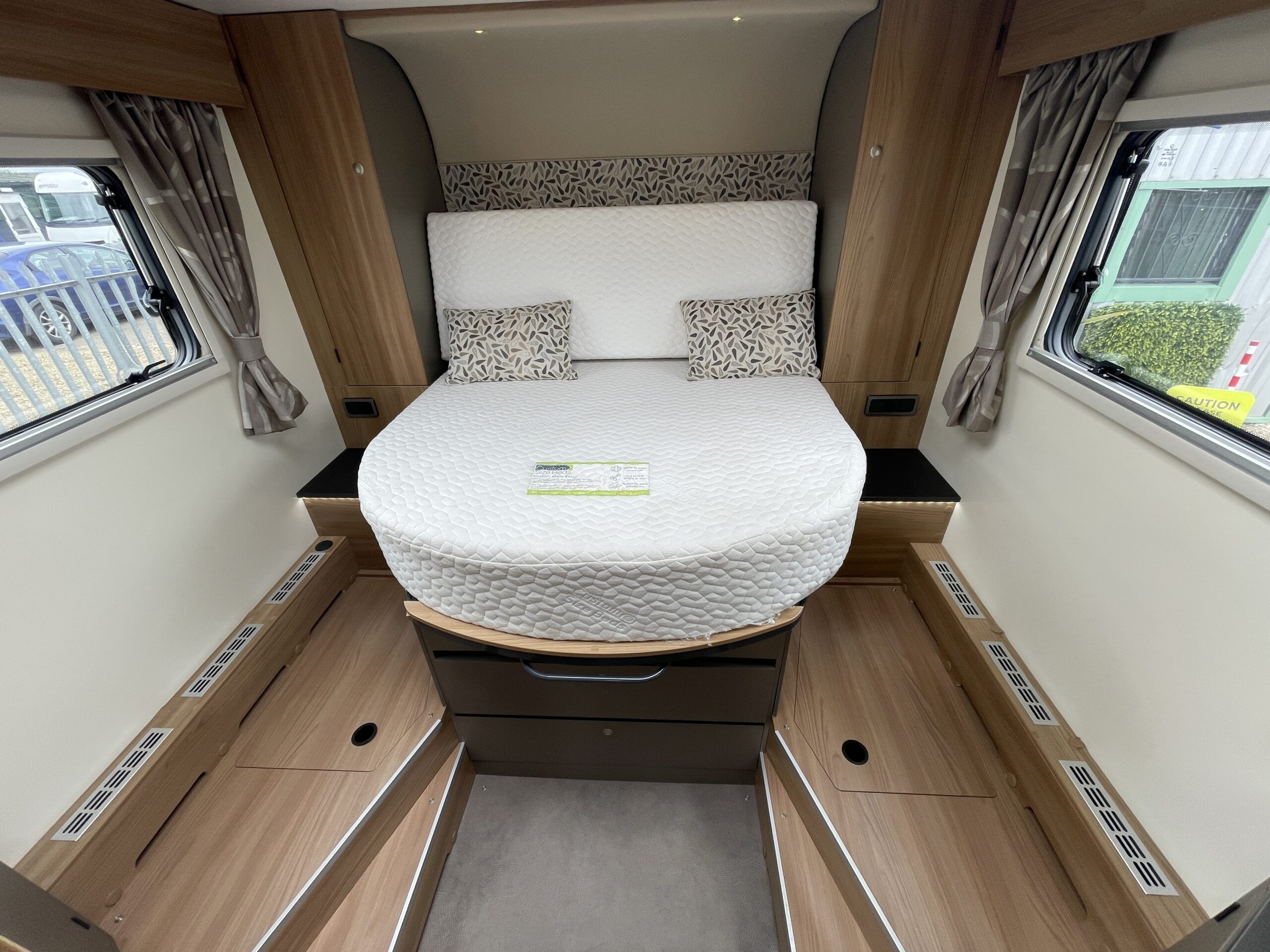 At the rear of the 79-4I you have a fantastic island bed which is a fully adjustable bed meaning you can push it back to create more floor space or into a reading bed once retracted back offering back support. The island bed has the stunning wrap round head unit which has integrated LED downlights to provide a soft gentle glow throughout the day and night. Each person using the end bedroom gets there very own wardrobe, extra large draw unit and worktop with cupboard for getting ready each day. Below this wonderful space you will find storage space, perfect for keeping a large range of equipment.