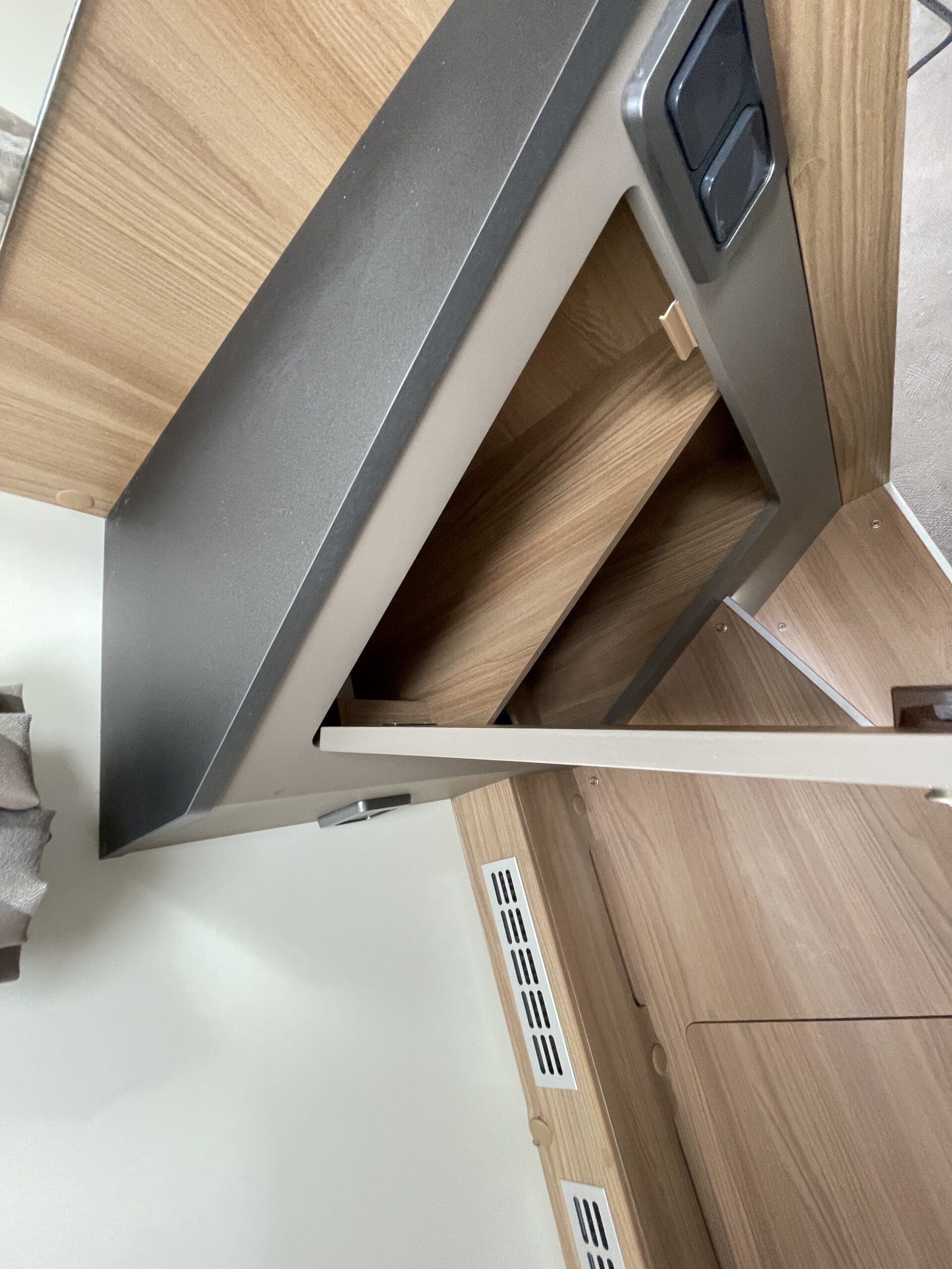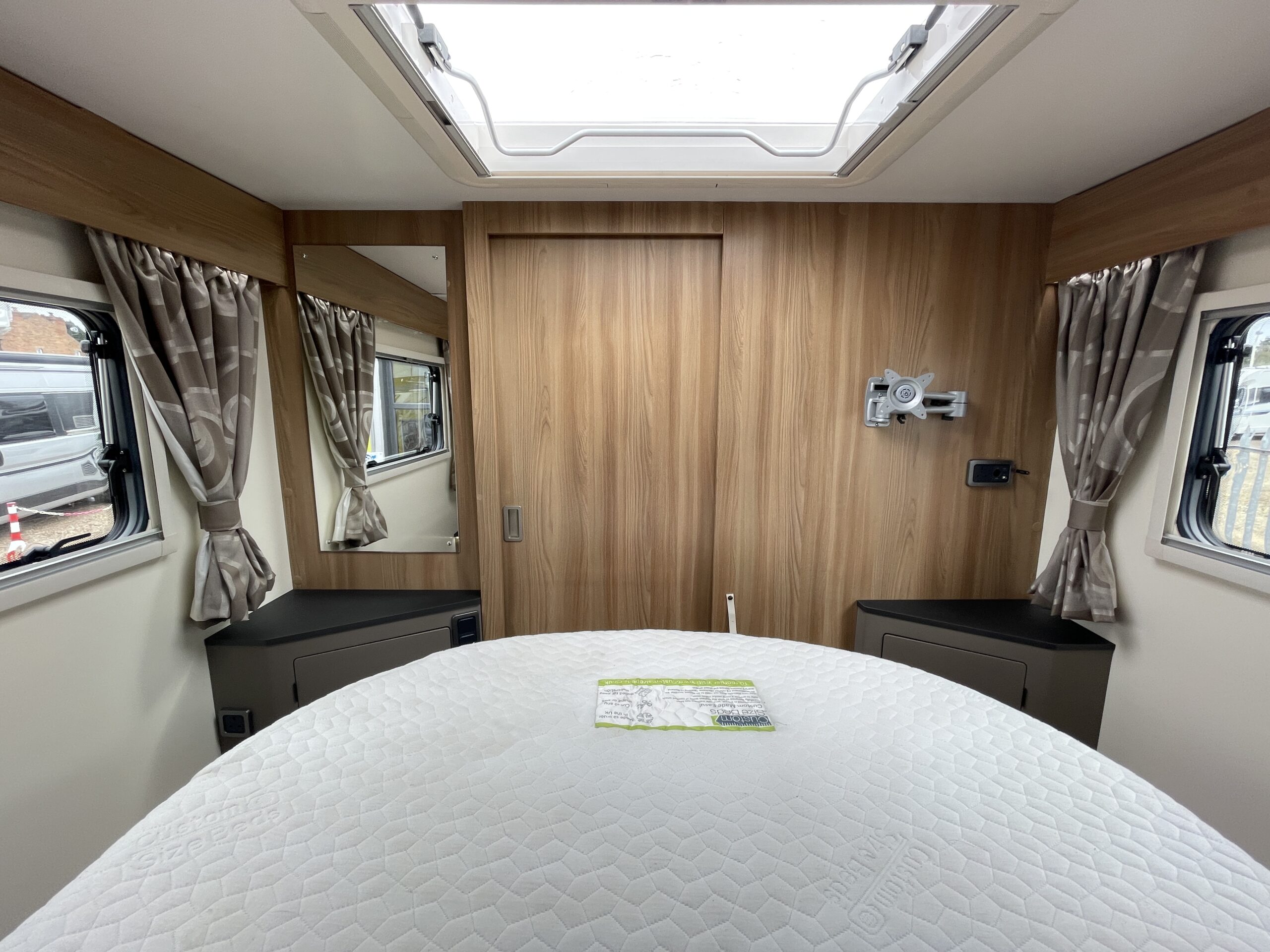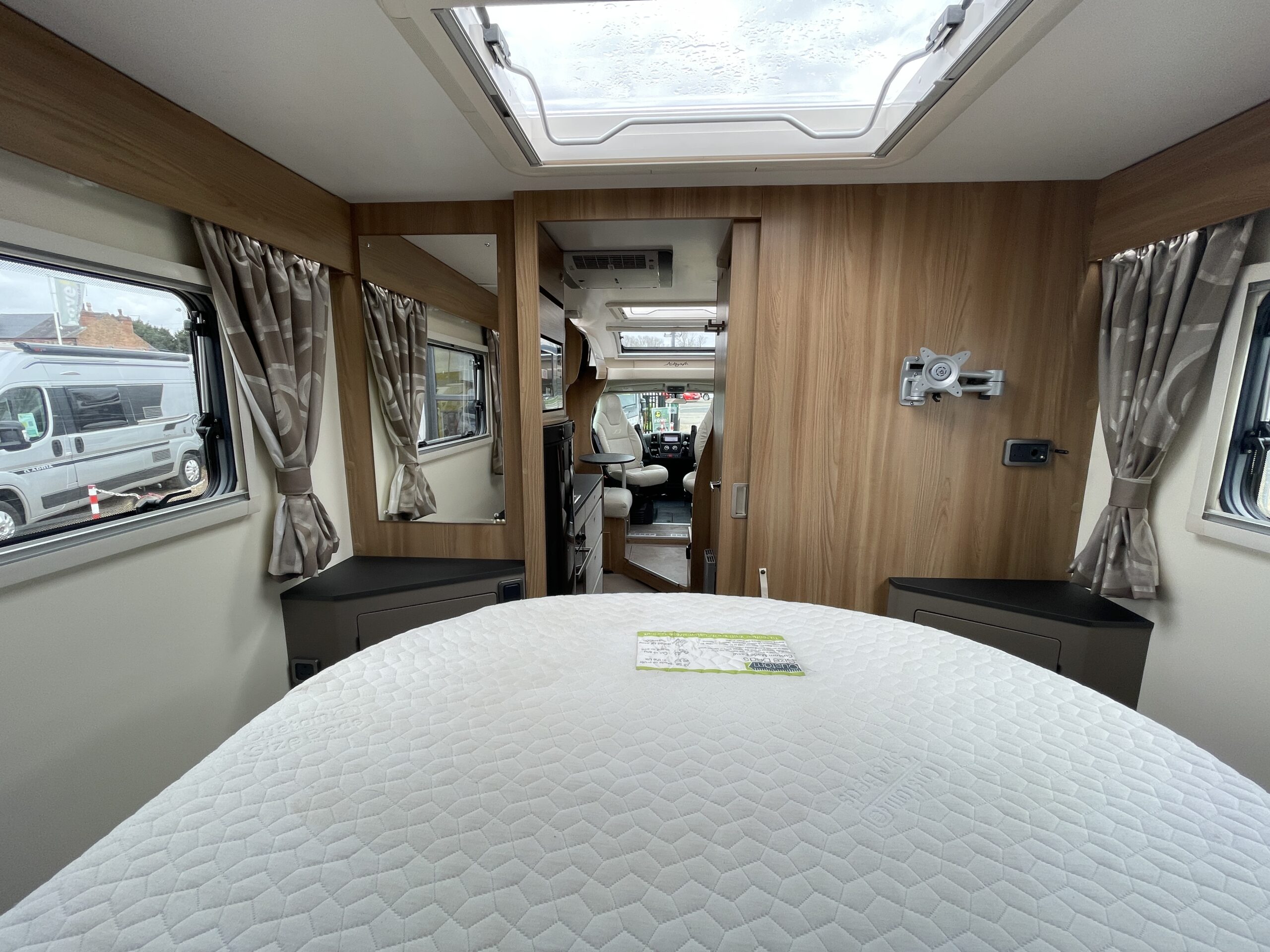 At the rear of the 79-4I you have a fantastic island bed which is a fully adjustable bed meaning you can push it back to create more floor space or into a reading bed once retracted back offering back support. The island bed has the stunning wrap round head unit which has integrated LED downlights to provide a soft gentle glow throughout the day and night. Each person using the end bedroom gets there very own wardrobe, extra large draw unit and worktop with cupboard for getting ready each day. Below this wonderful space you will find storage space, perfect for keeping a large range of equipment.