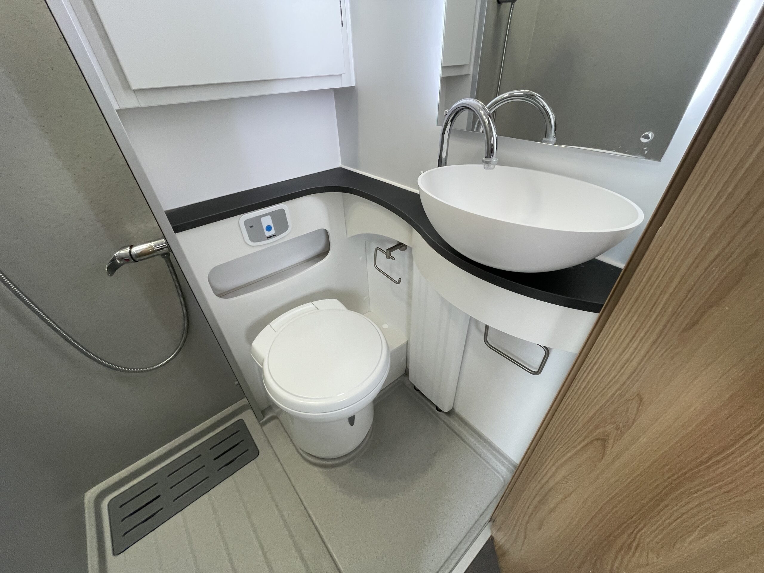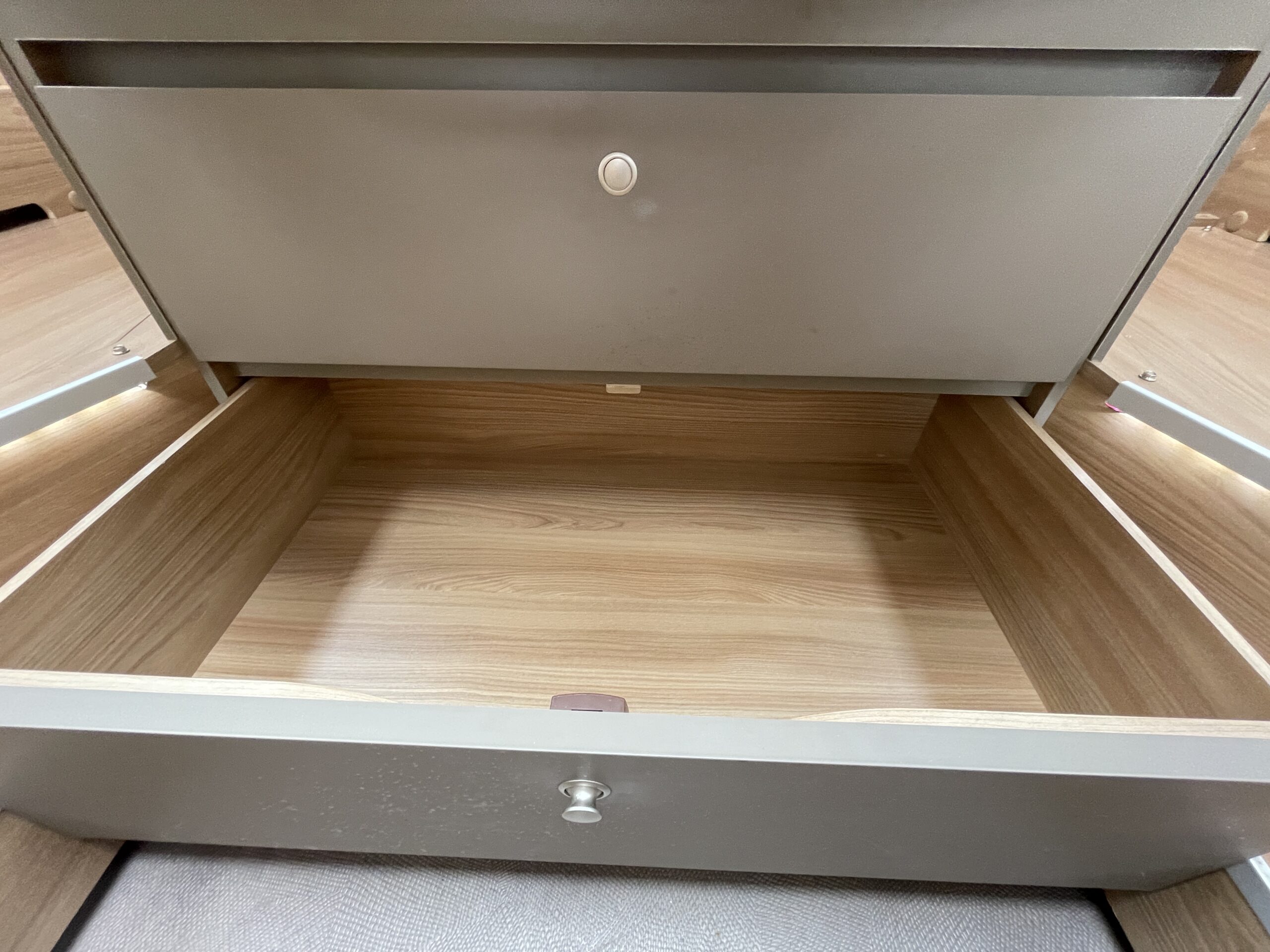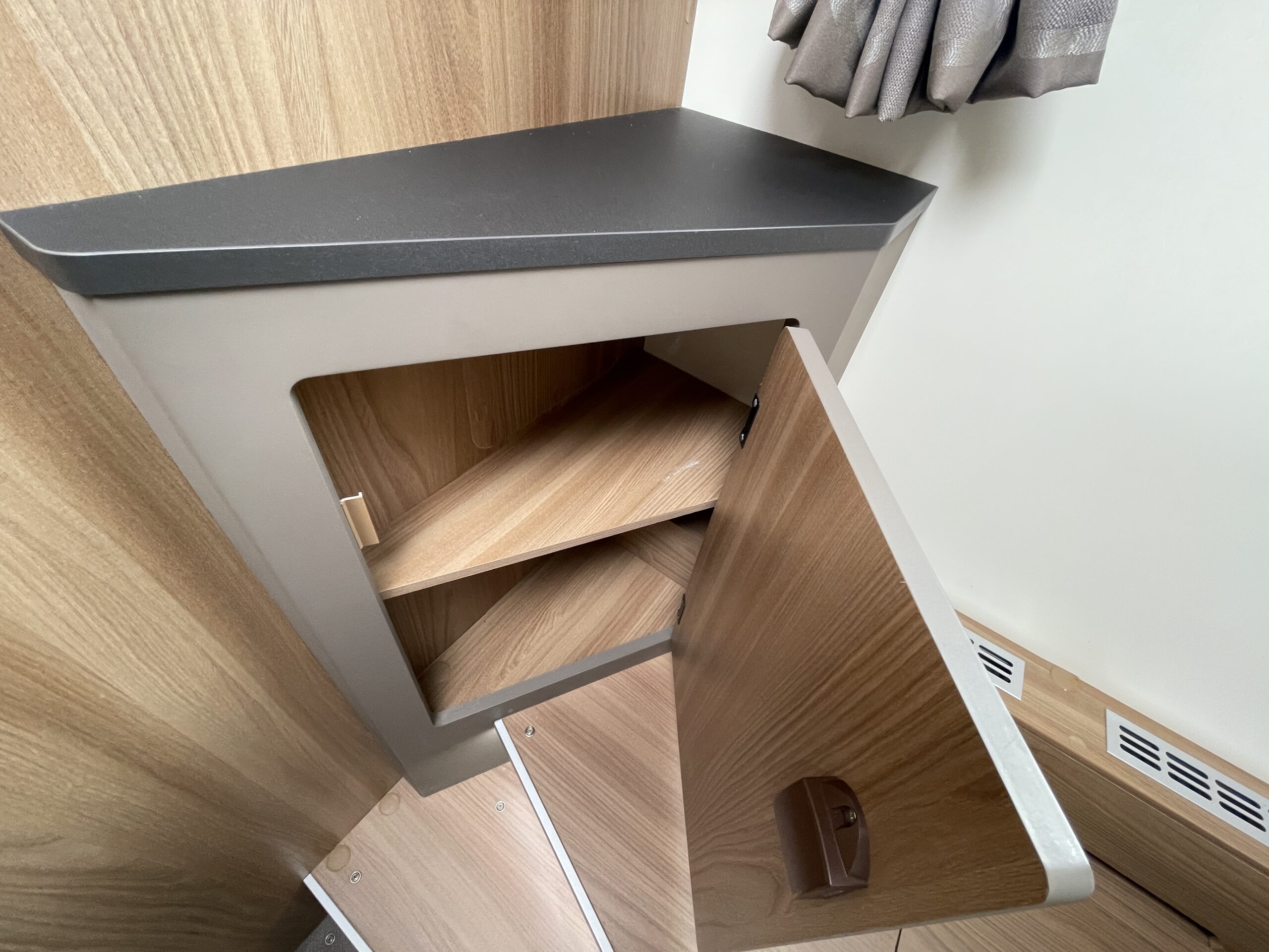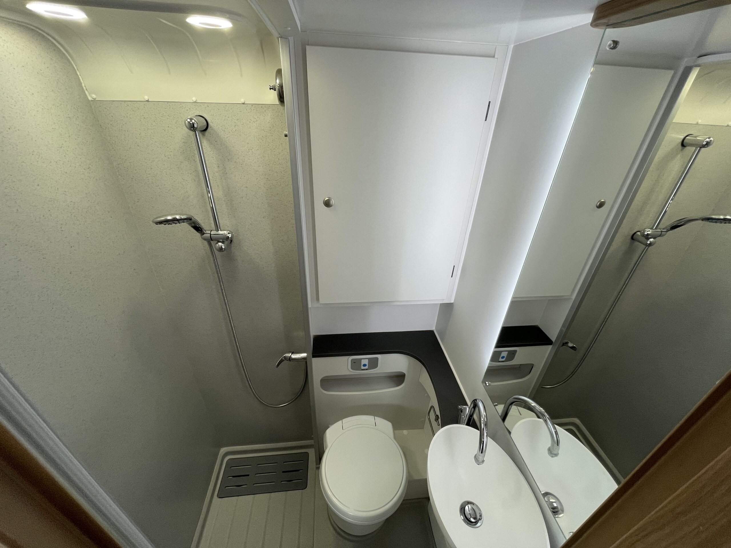 At the rear of the 79-4I you have a fantastic island bed which is a fully adjustable bed meaning you can push it back to create more floor space or into a reading bed once retracted back offering back support. The island bed has the stunning wrap round head unit which has integrated LED downlights to provide a soft gentle glow throughout the day and night. Each person using the end bedroom gets there very own wardrobe, extra large draw unit and worktop with cupboard for getting ready each day. Below this wonderful space you will find storage space, perfect for keeping a large range of equipment.