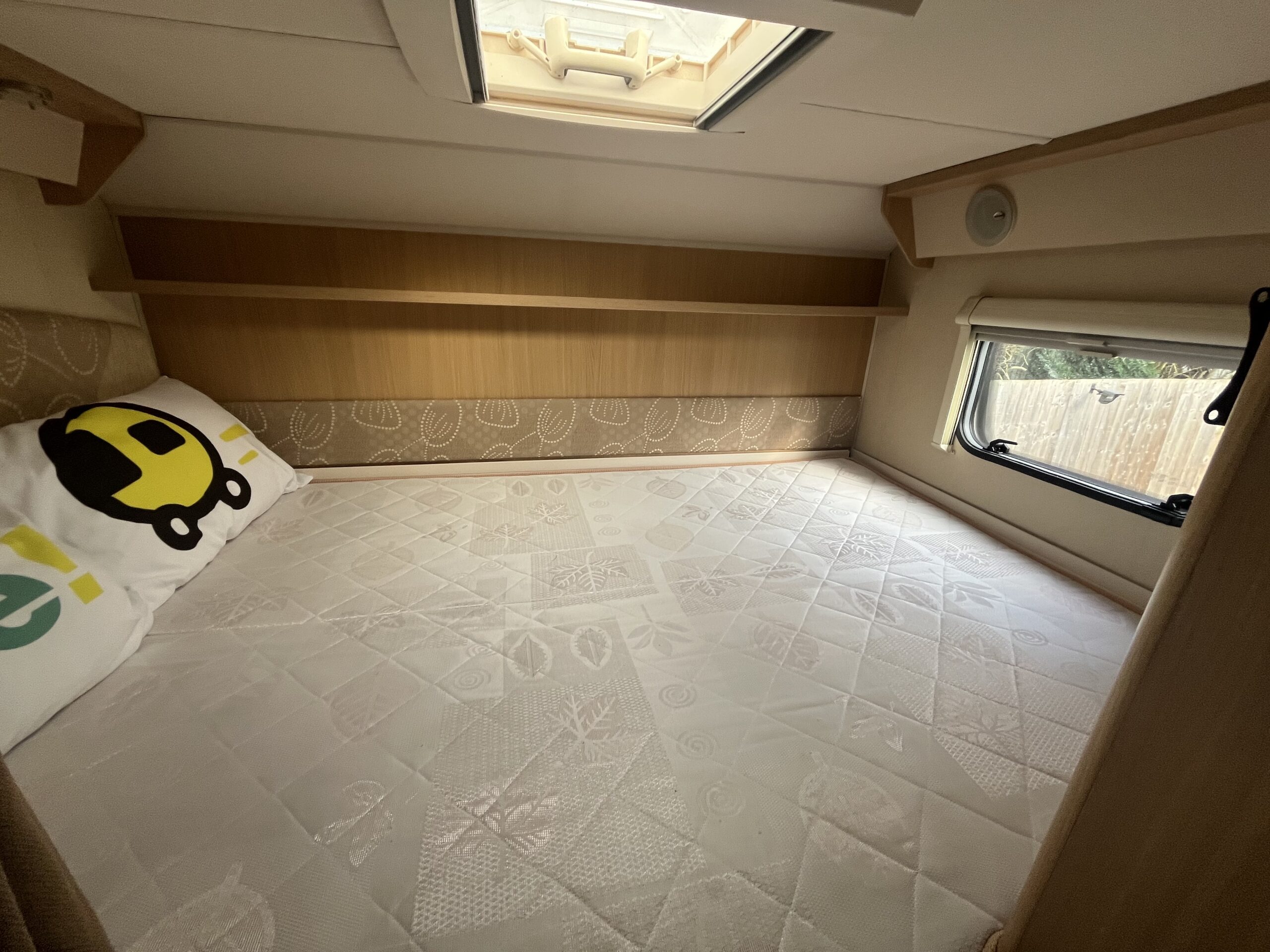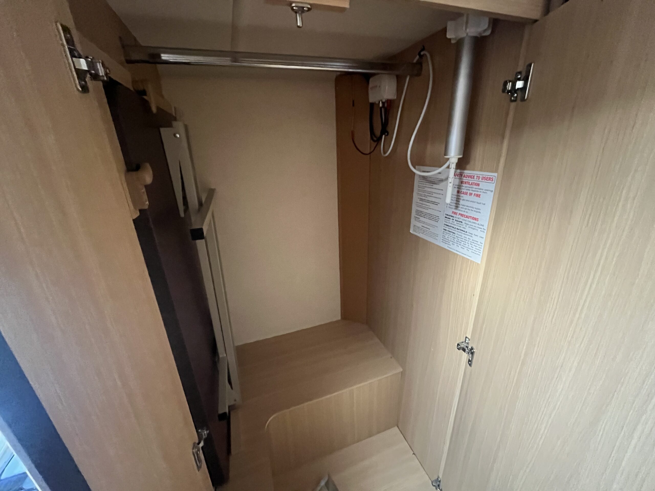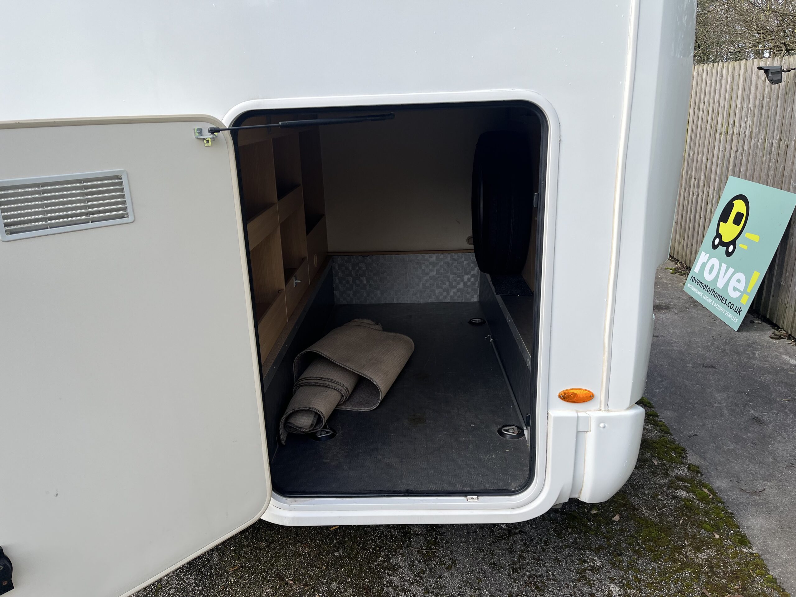 Possibly the biggest feature of this motorhome will be the large garage which has plenty of space, shelving, anchor points and 240v socket. The rear transverse bed, has 2 steps up from the habitation floor and is nearly 2 metres wide, so plenty of room. There is TV bracket here and next to the bed, a large wardrobe with hanging rail.