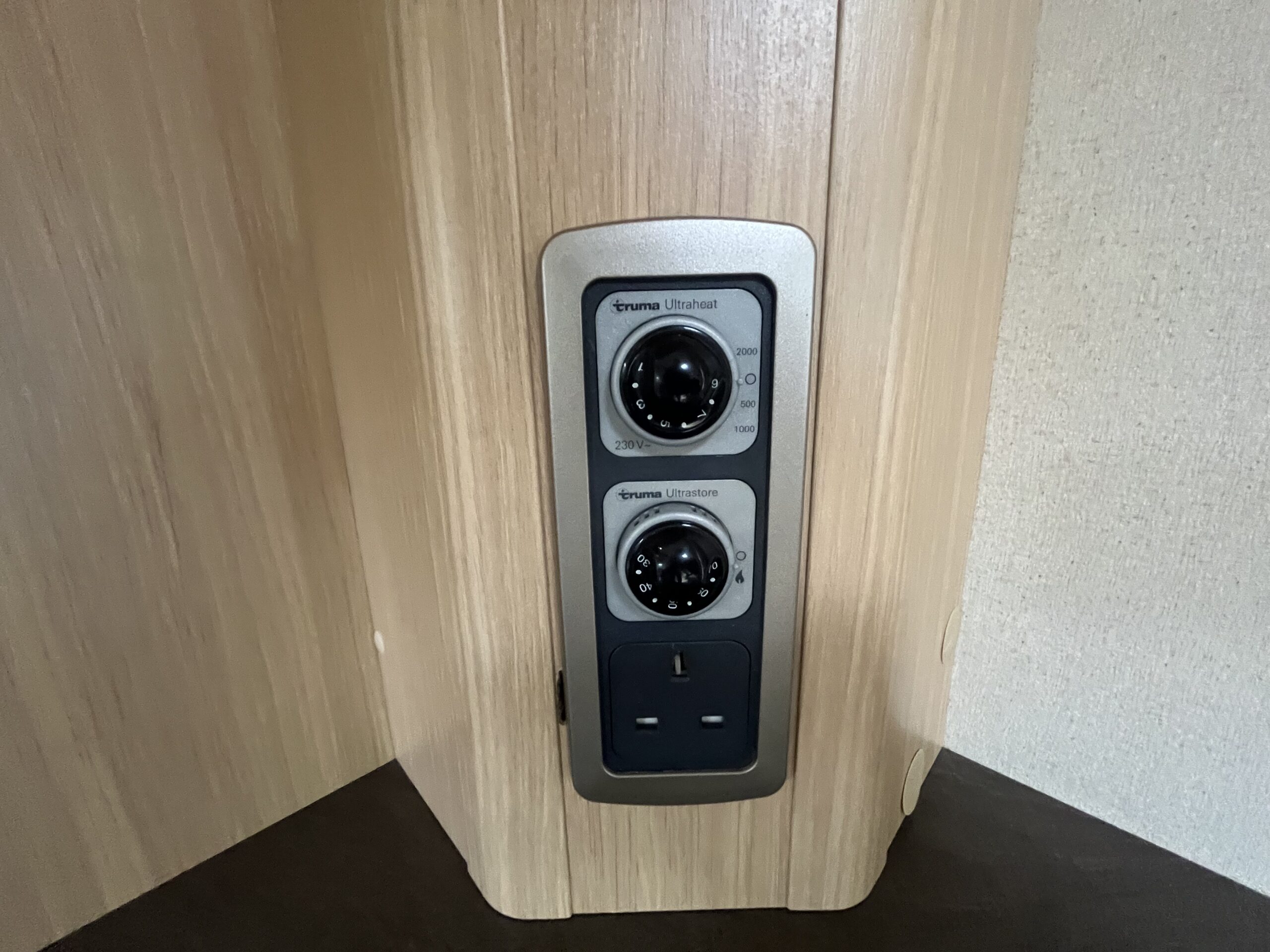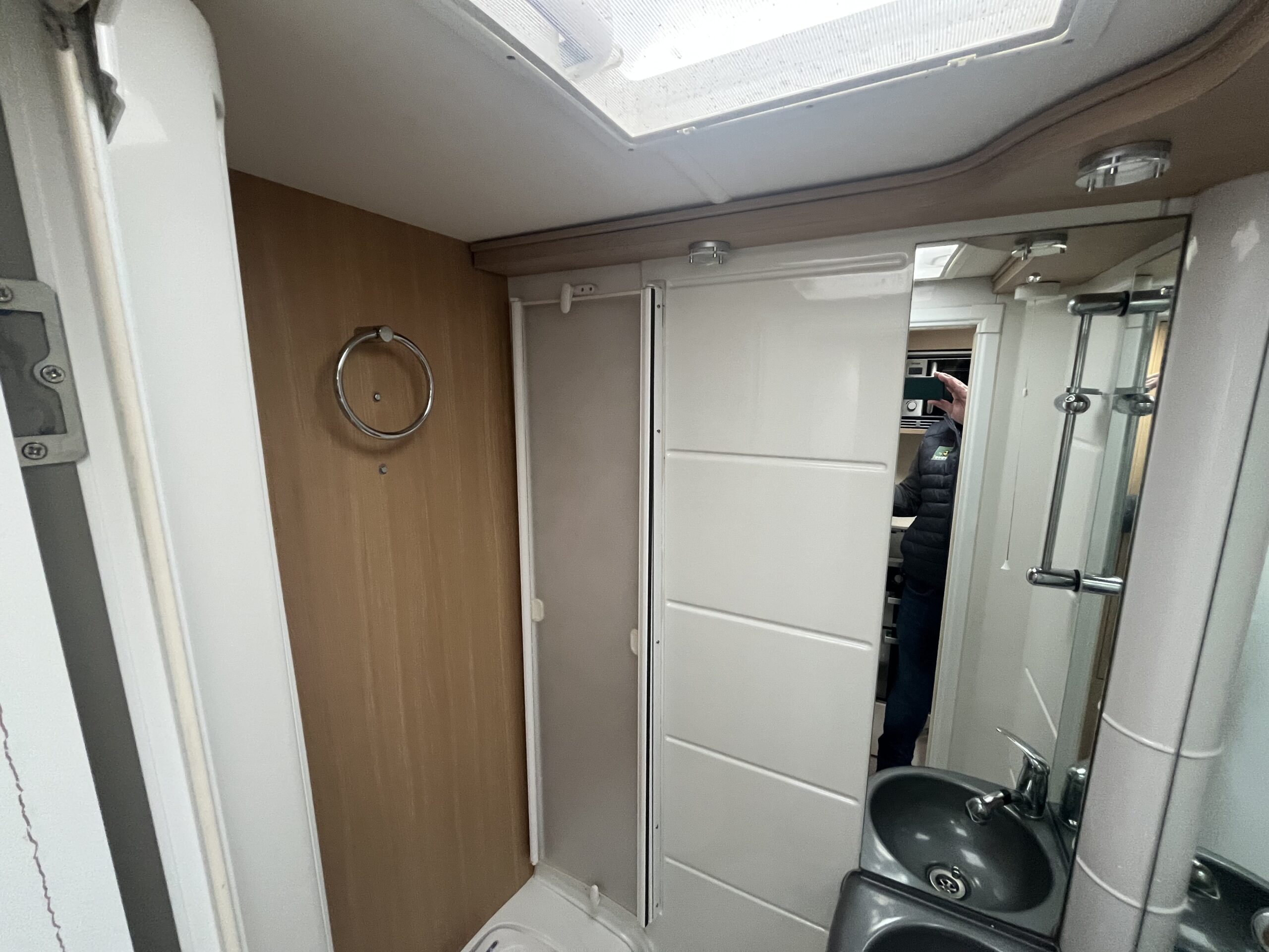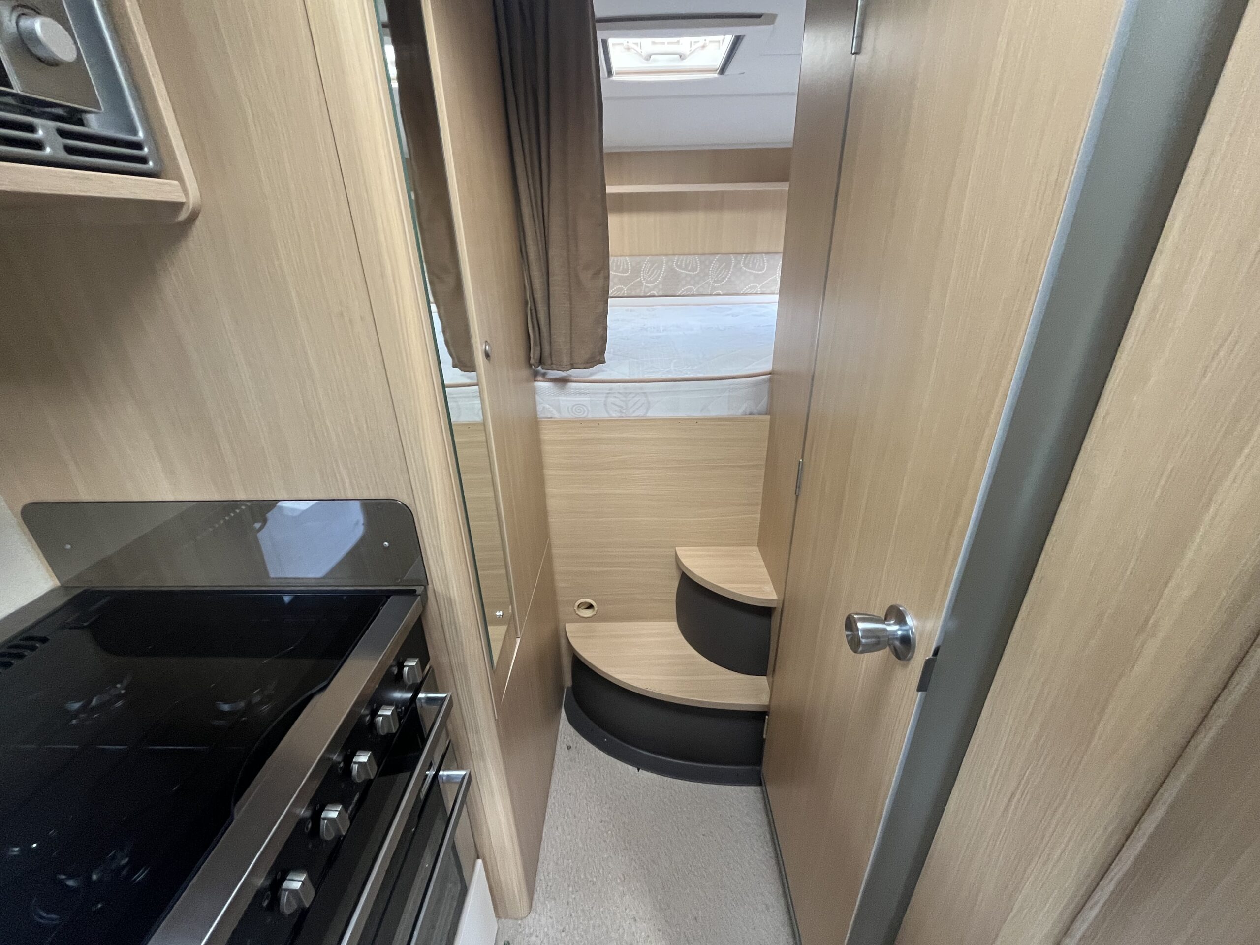 Possibly the biggest feature of this motorhome will be the large garage which has plenty of space, shelving, anchor points and 240v socket. The rear transverse bed, has 2 steps up from the habitation floor and is nearly 2 metres wide, so plenty of room. There is TV bracket here and next to the bed, a large wardrobe with hanging rail.