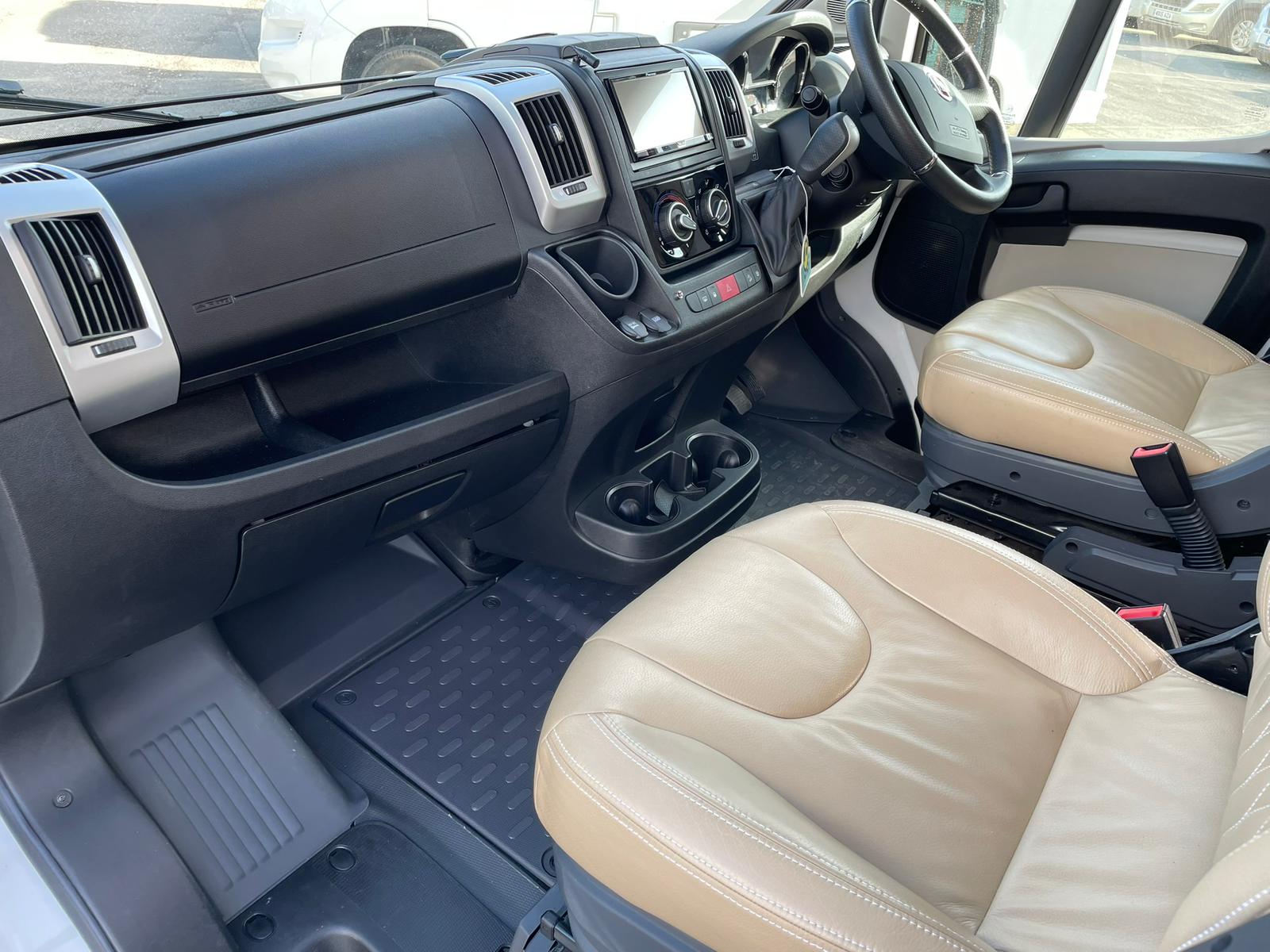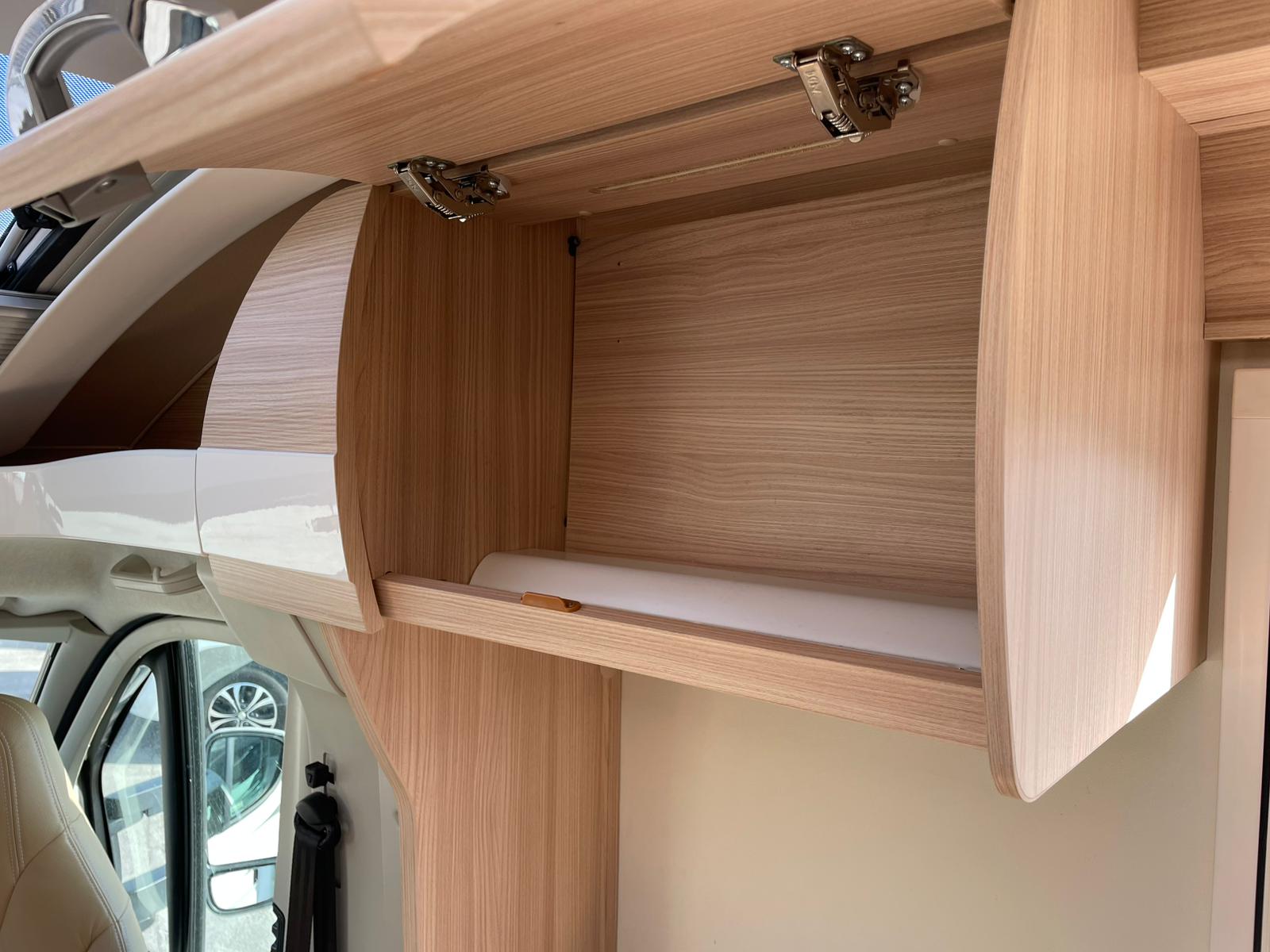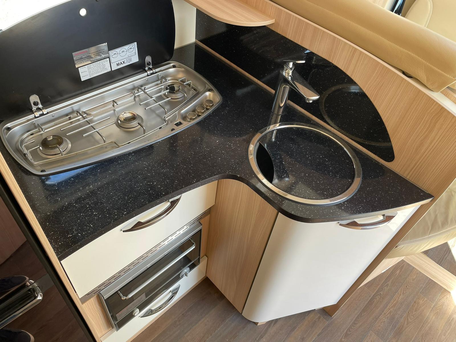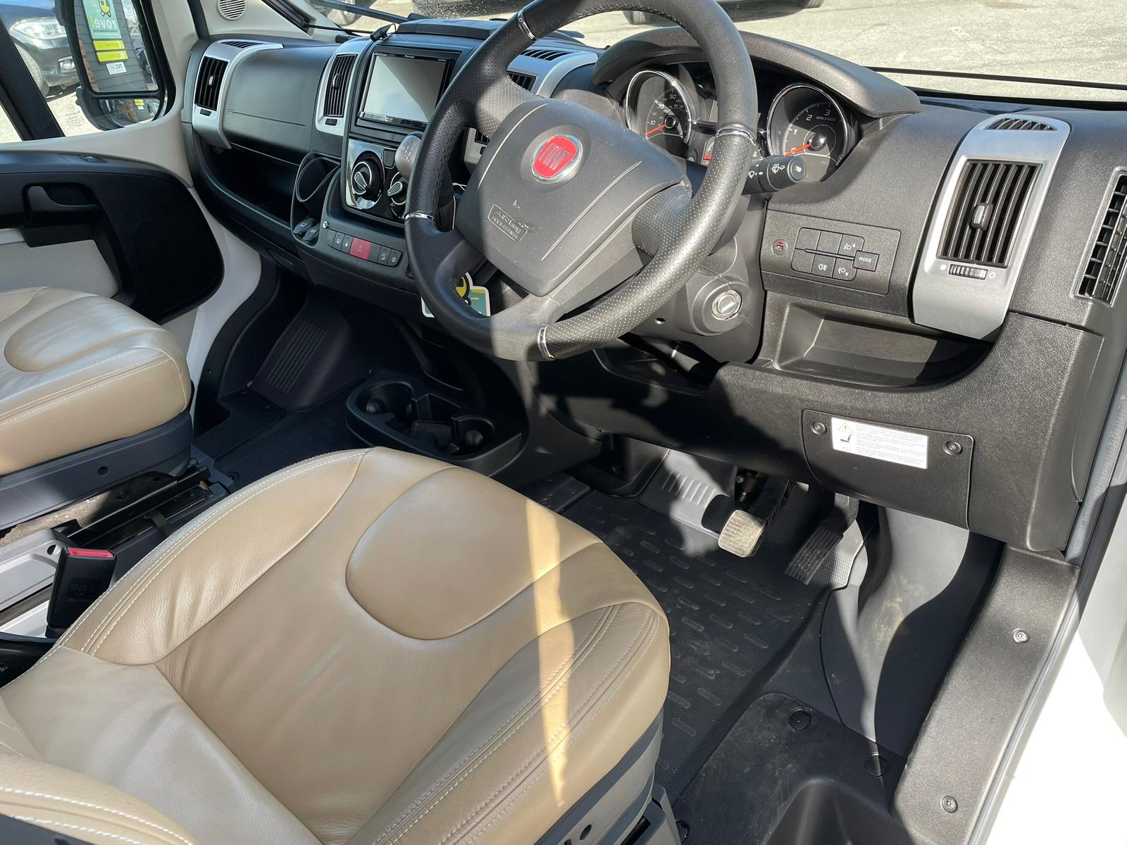 The lounge seats combine with the table to make up the other double and with the cab seats turned inwards a comfortable lounging area with overhead sky lights comes into its own to watch the pull-down bracket that holds a TV that you can purchase to fit in its place or just relax and take in the view. If you’re seeking a motorhome that compromises on comfort, style, and functionality and Its manoeuvrability.