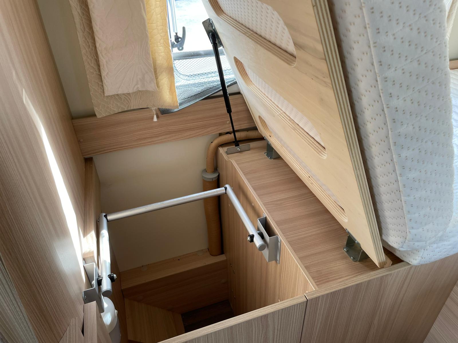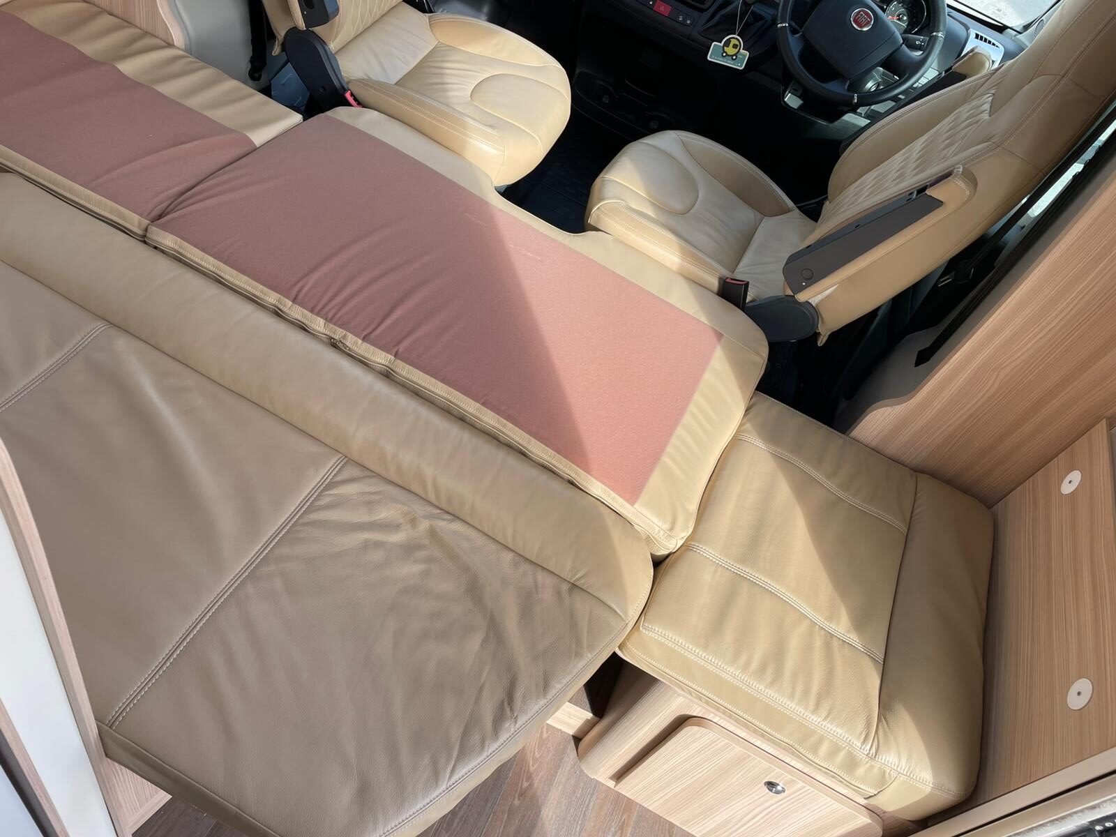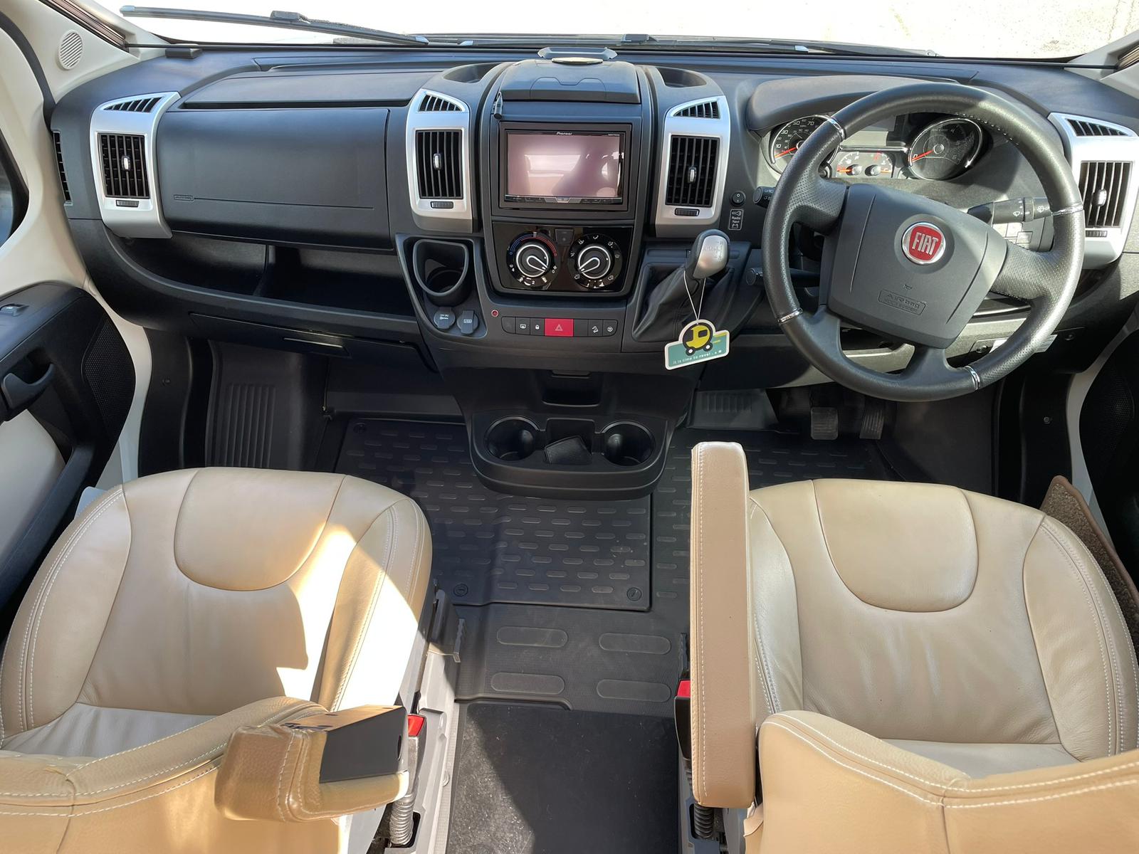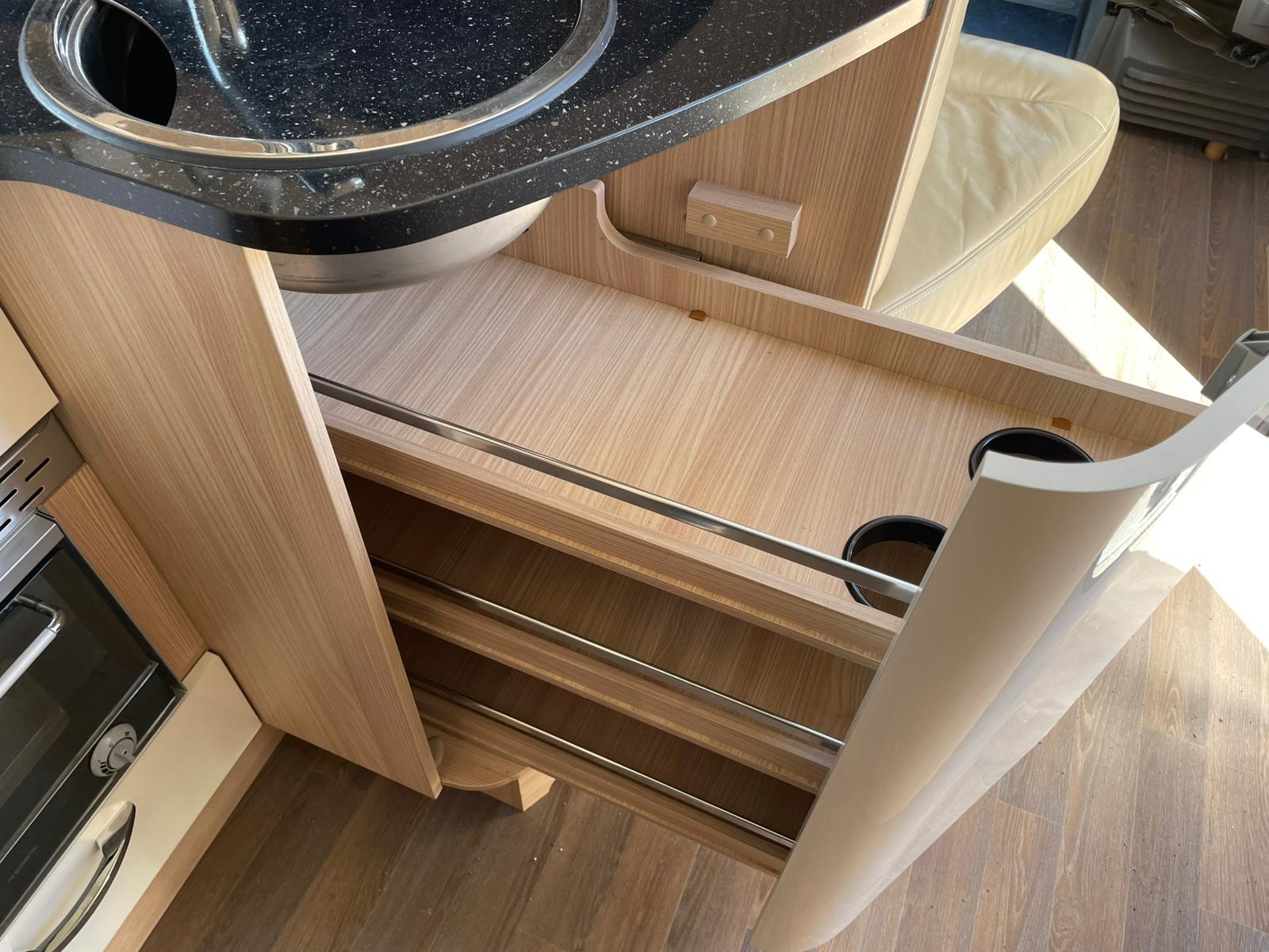 The lounge seats combine with the table to make up the other double and with the cab seats turned inwards a comfortable lounging area with overhead sky lights comes into its own to watch the pull-down bracket that holds a TV that you can purchase to fit in its place or just relax and take in the view. If you’re seeking a motorhome that compromises on comfort, style, and functionality and Its manoeuvrability.