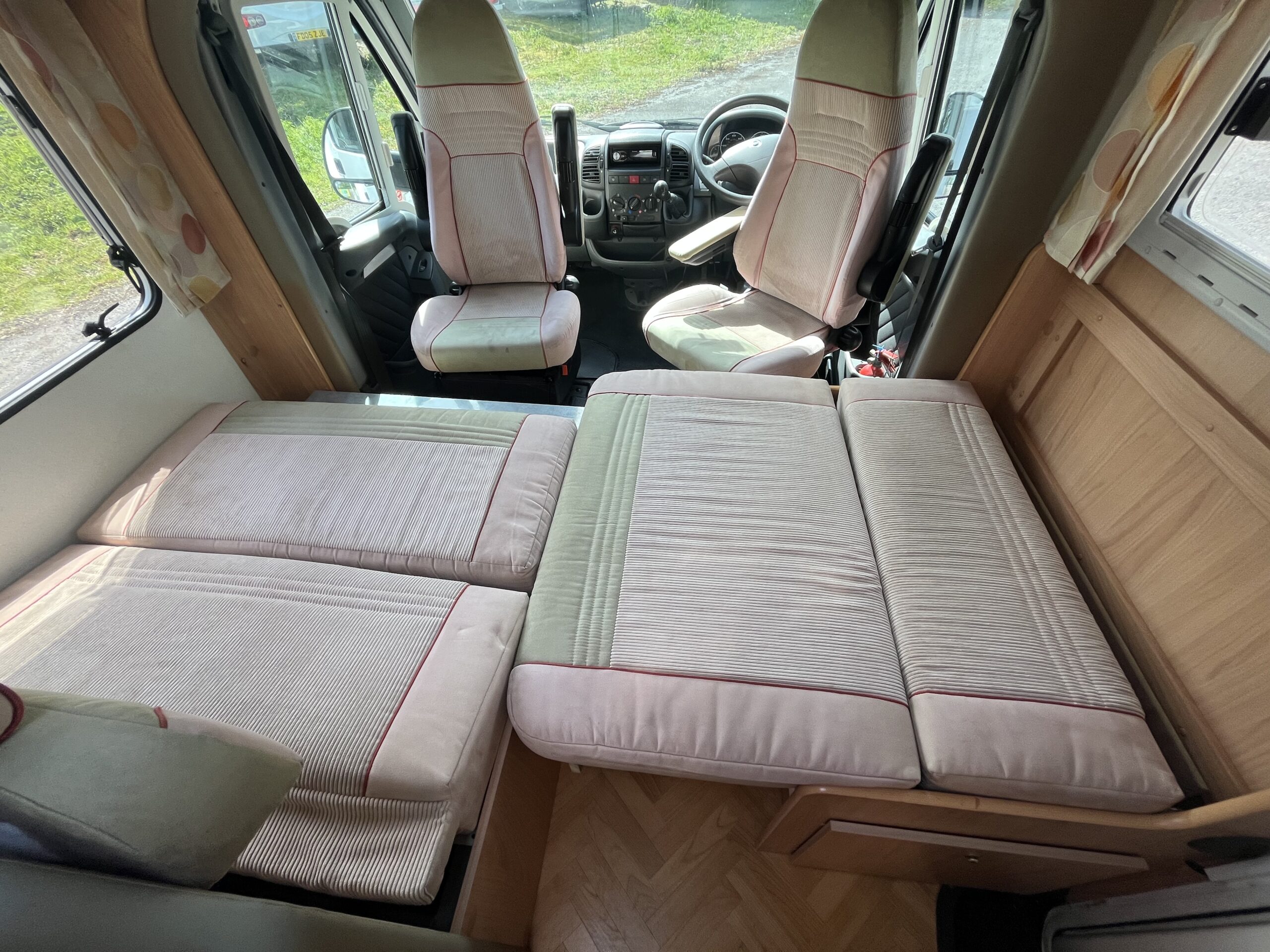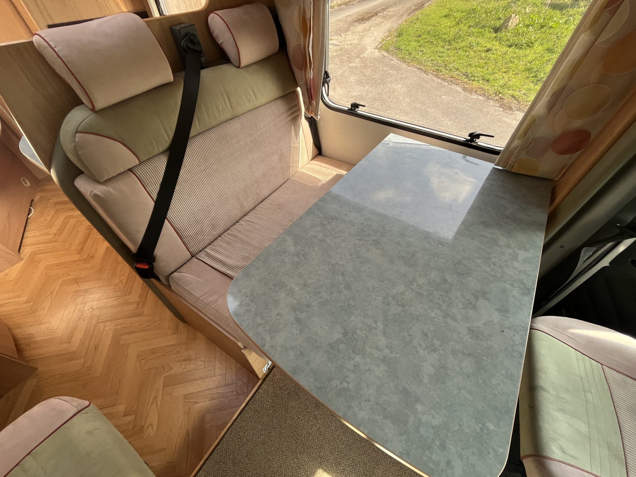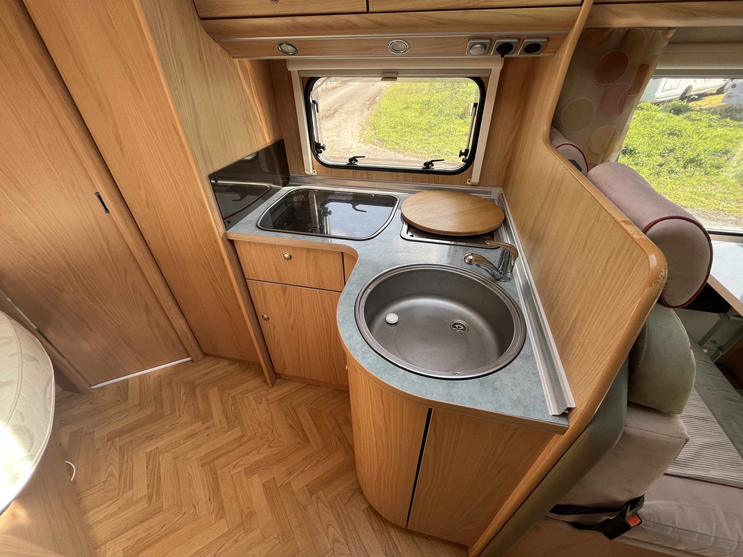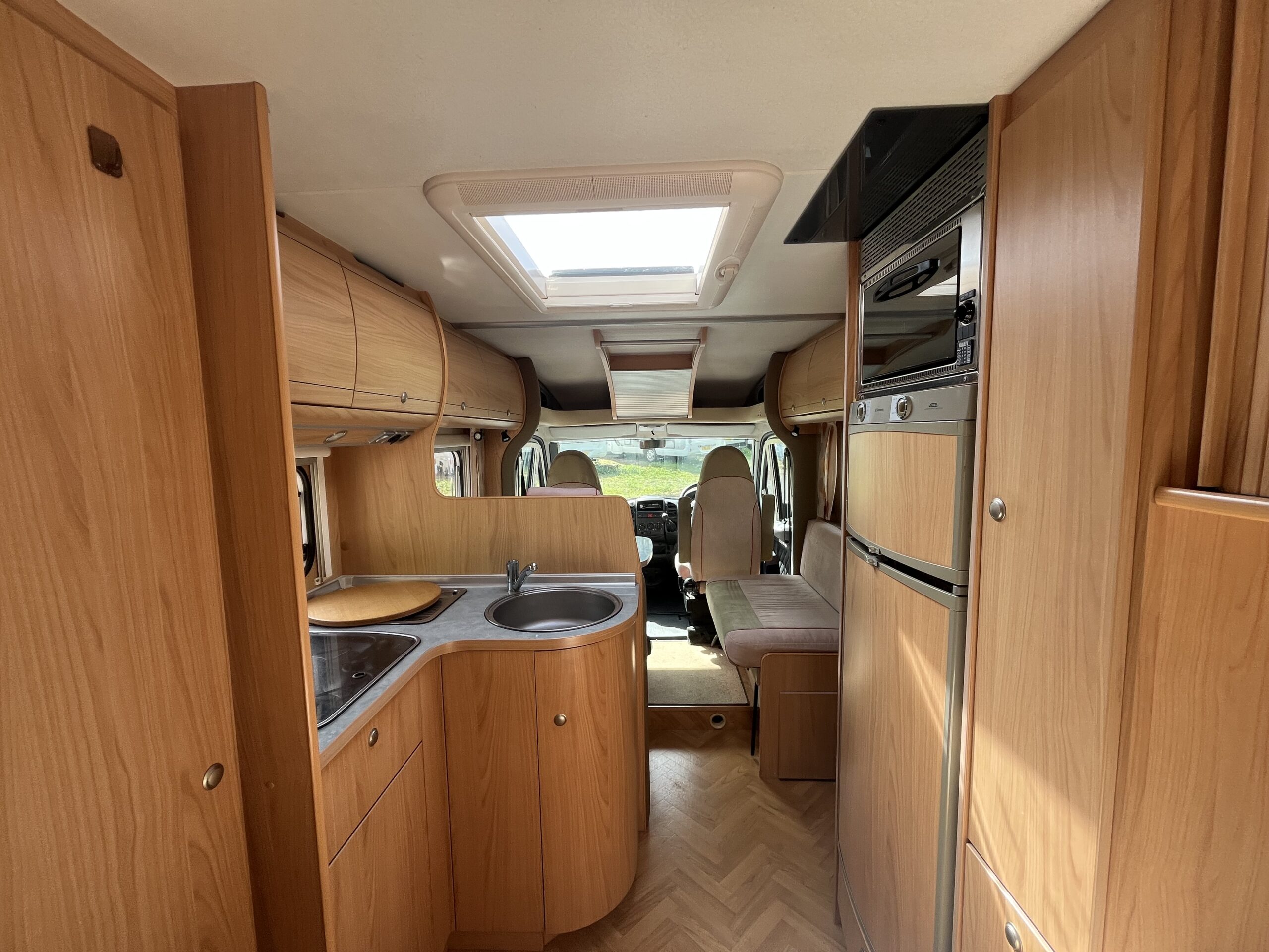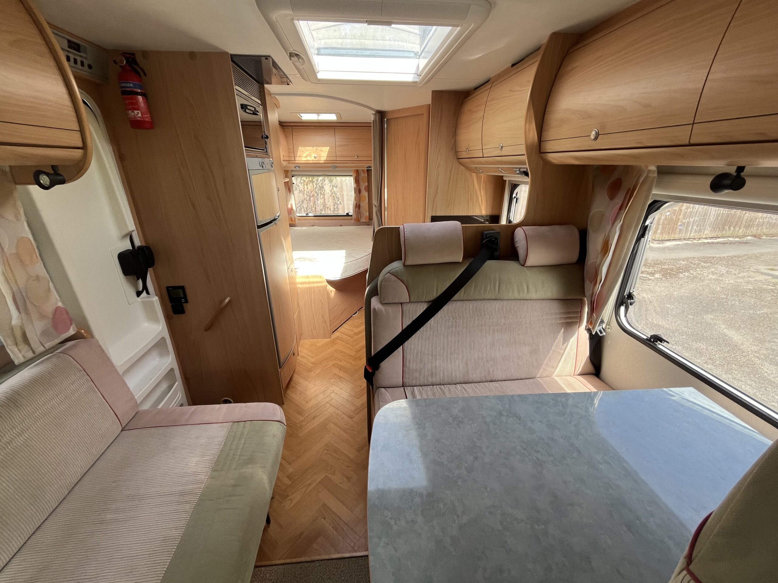 Layout – Starting at the rear this model features the very sought after large fixed french bed. Underneath the bed you have storage space by lifting the bed and this can also be accessed from outside the vehicle. To the right of the bed, we find the large washroom this is well equipped and comes with the desired seperate shower cubicle, toilet, washbasin and vanity mirrors. Mid habitation is the kitchen and this is made up of 3 gas hobs, 3-way fridge with freezer space, oven/grill combi and sink. Finally towards the front of the T615 we have the spacious dinette area made from one forward facing bench with adjustable table and side bench and the whole area can be converted into an extra double bed if needed. Both front seats swivel into the habitation area to allow you to sit 4 comfortably around the table. The Burstner has plenty of surrounding storage as well as a large wardrobe area and these units have all been well maintained and the inside of the vehicle really has been well looked after.