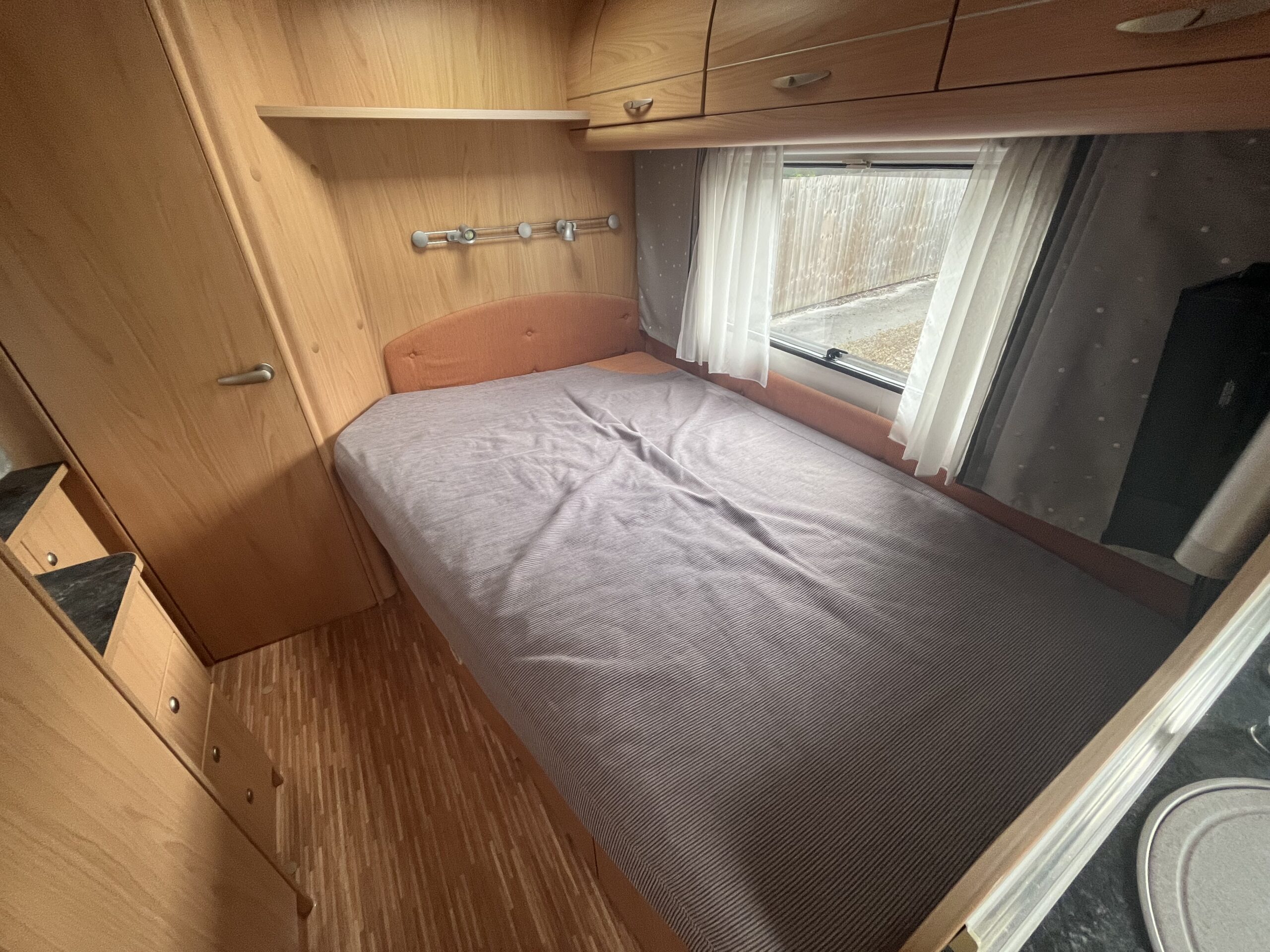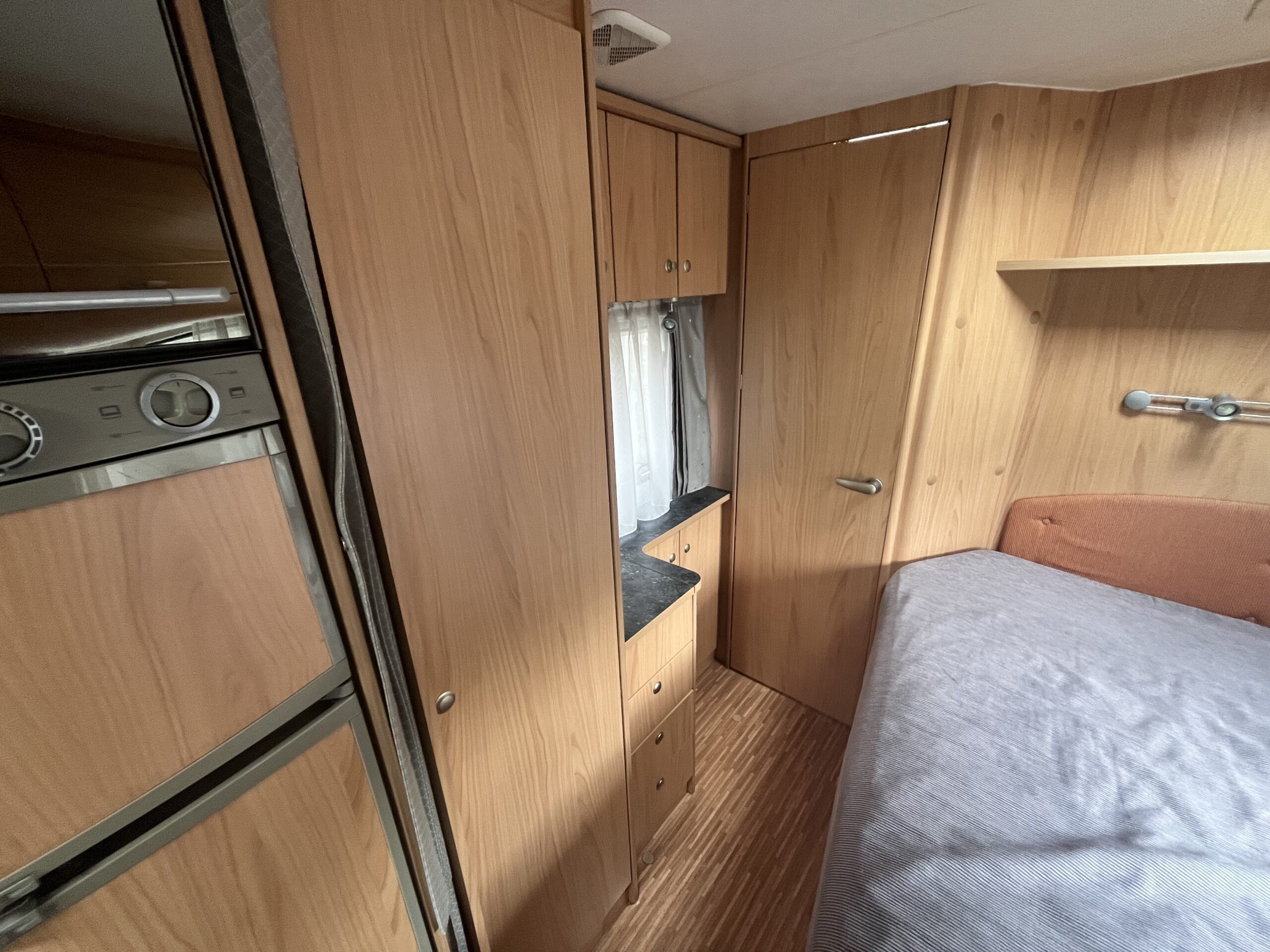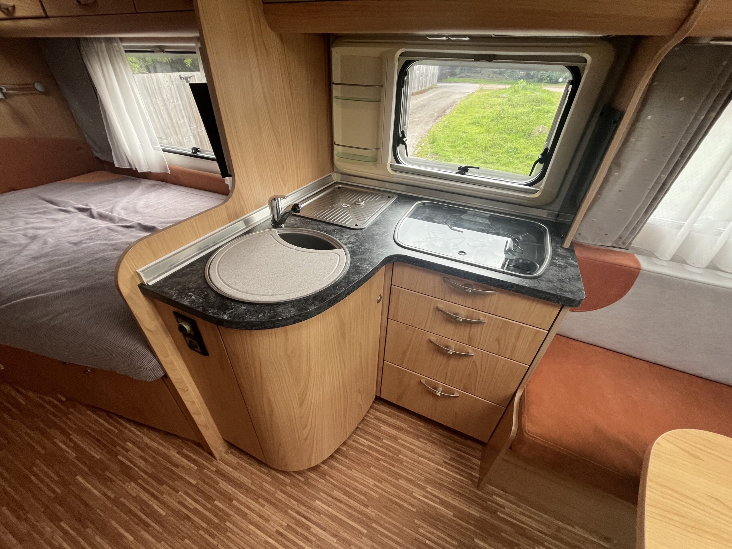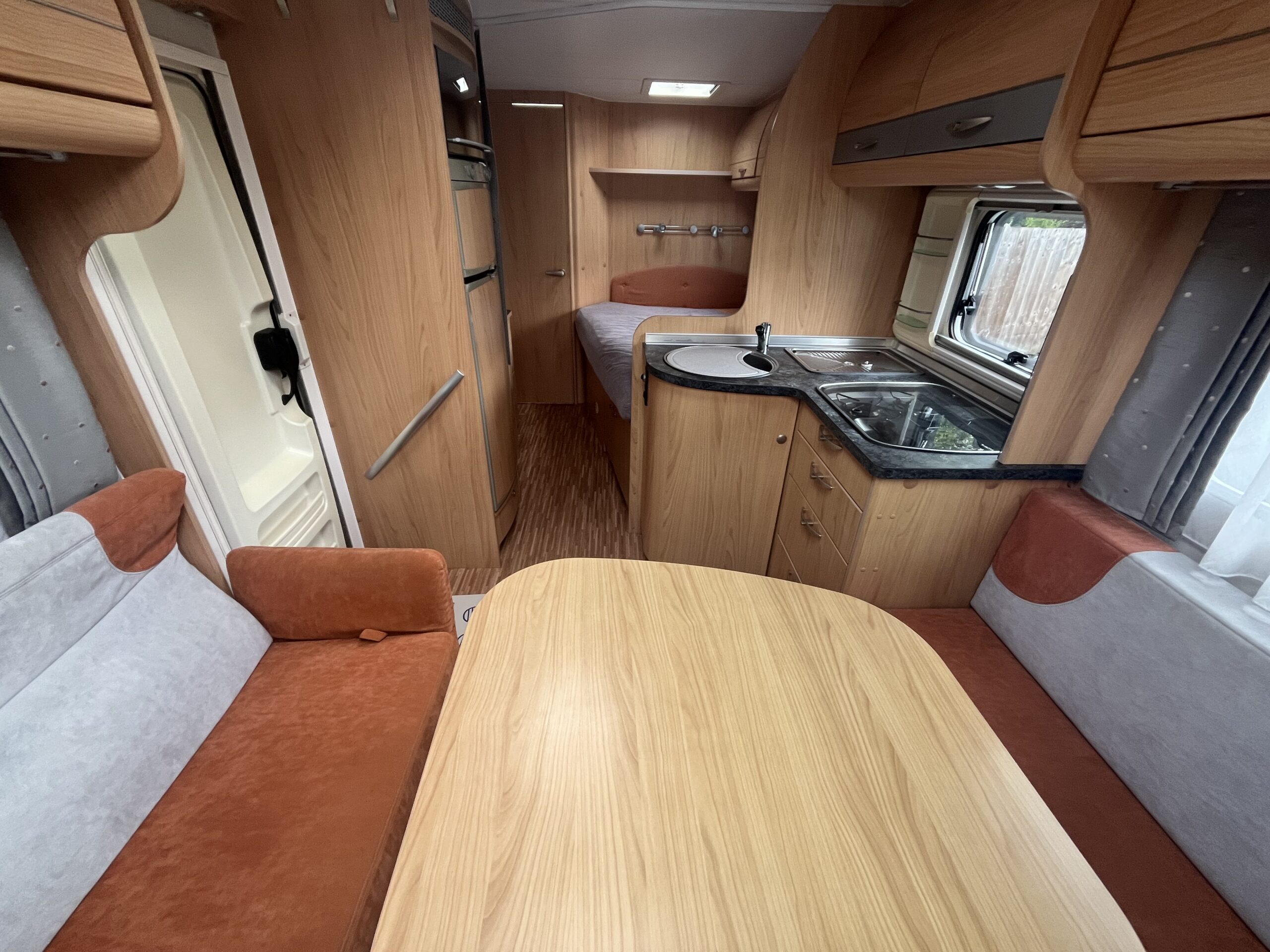 The popular layout consists of a generous sized rear washroom with a Toilet, Sink, Large mirror, plenty storage, and a separate shower cubical. As you step out of the washroom, to the left you are greeted by the French bed which is a nice cosy sized double. Moving forwards is the kitchen area with large stainless steel sink, mixer tap, drainer, 3 gas burner hob, Dometic three way large fridge freezer and an oven and grill combi.