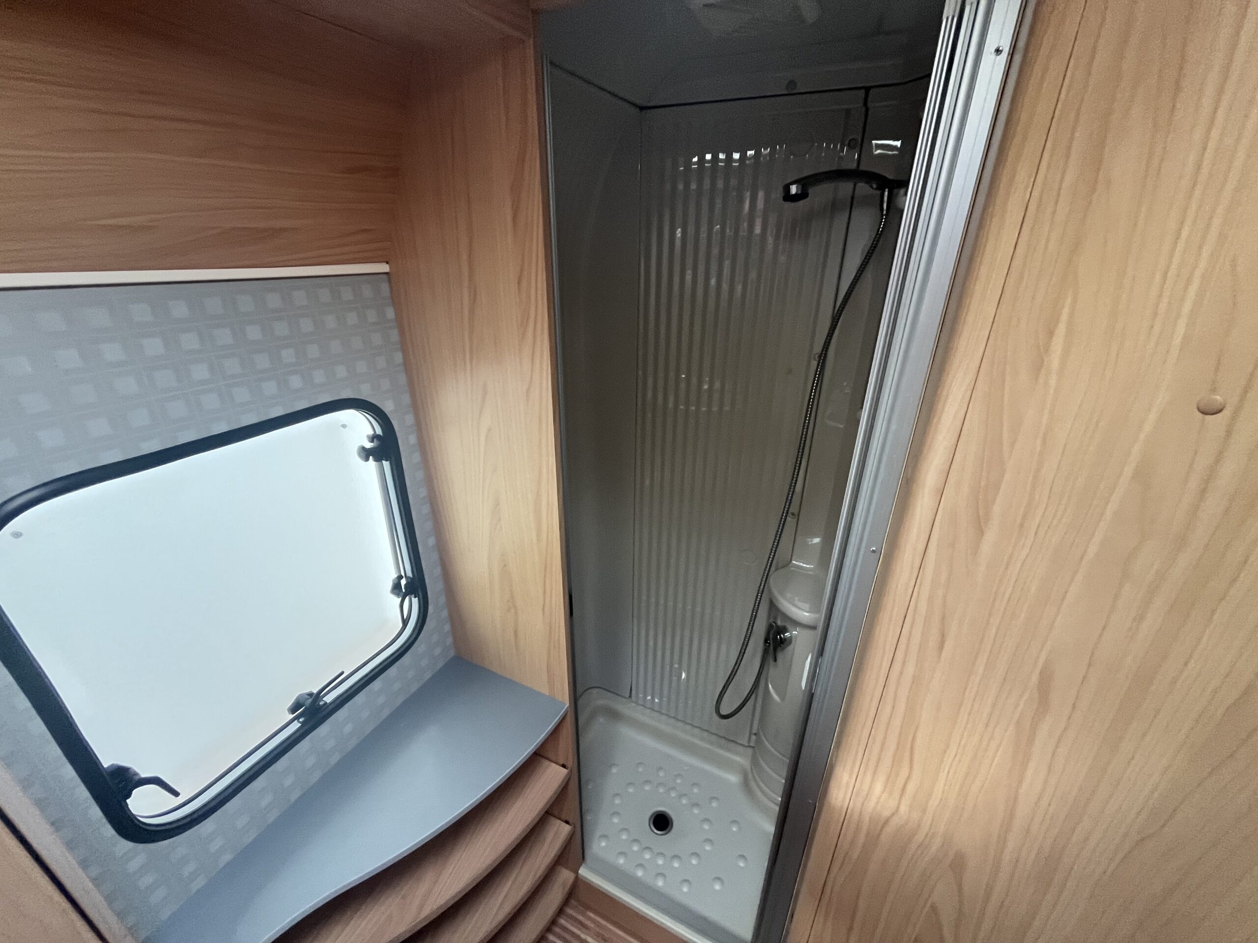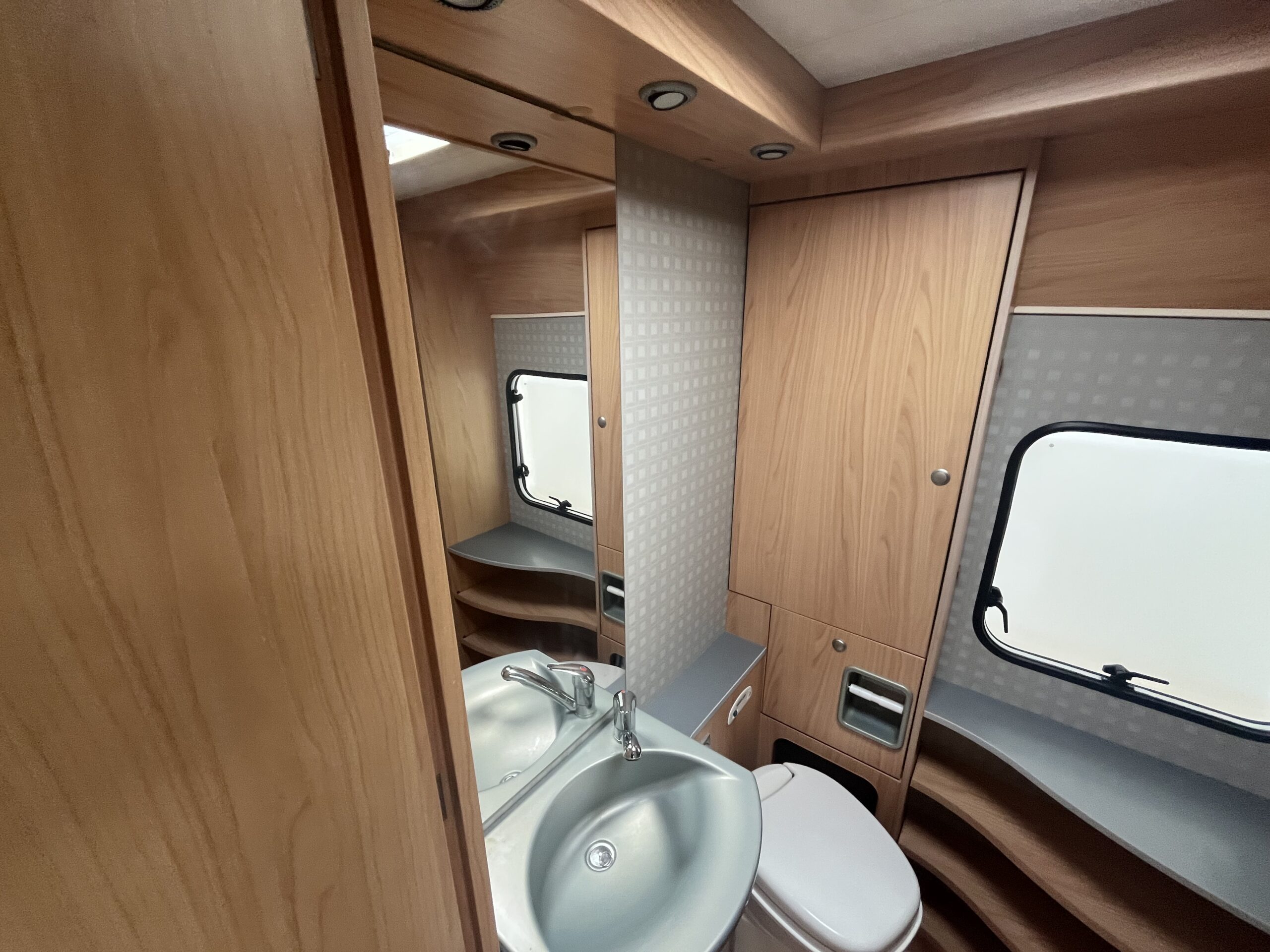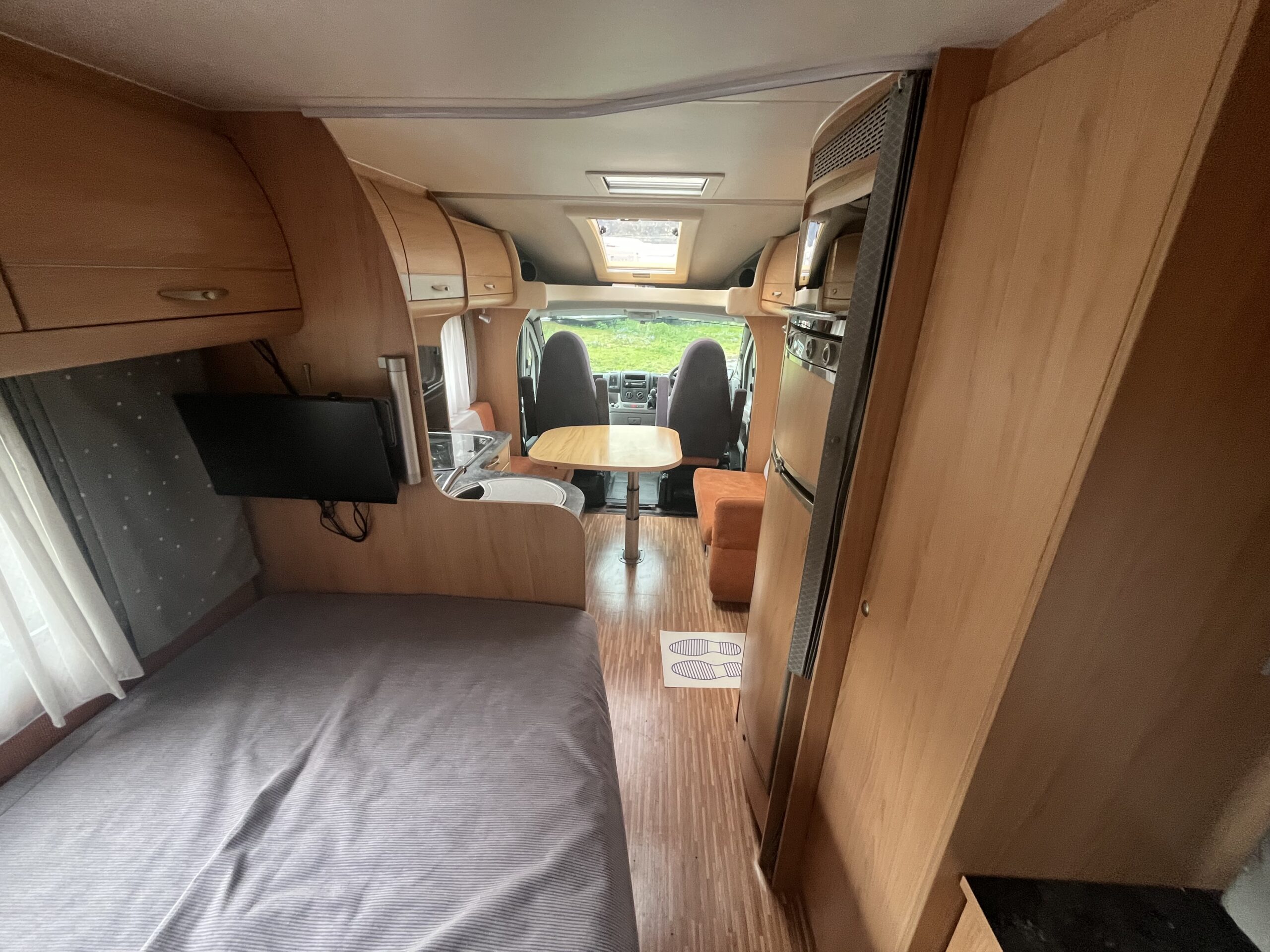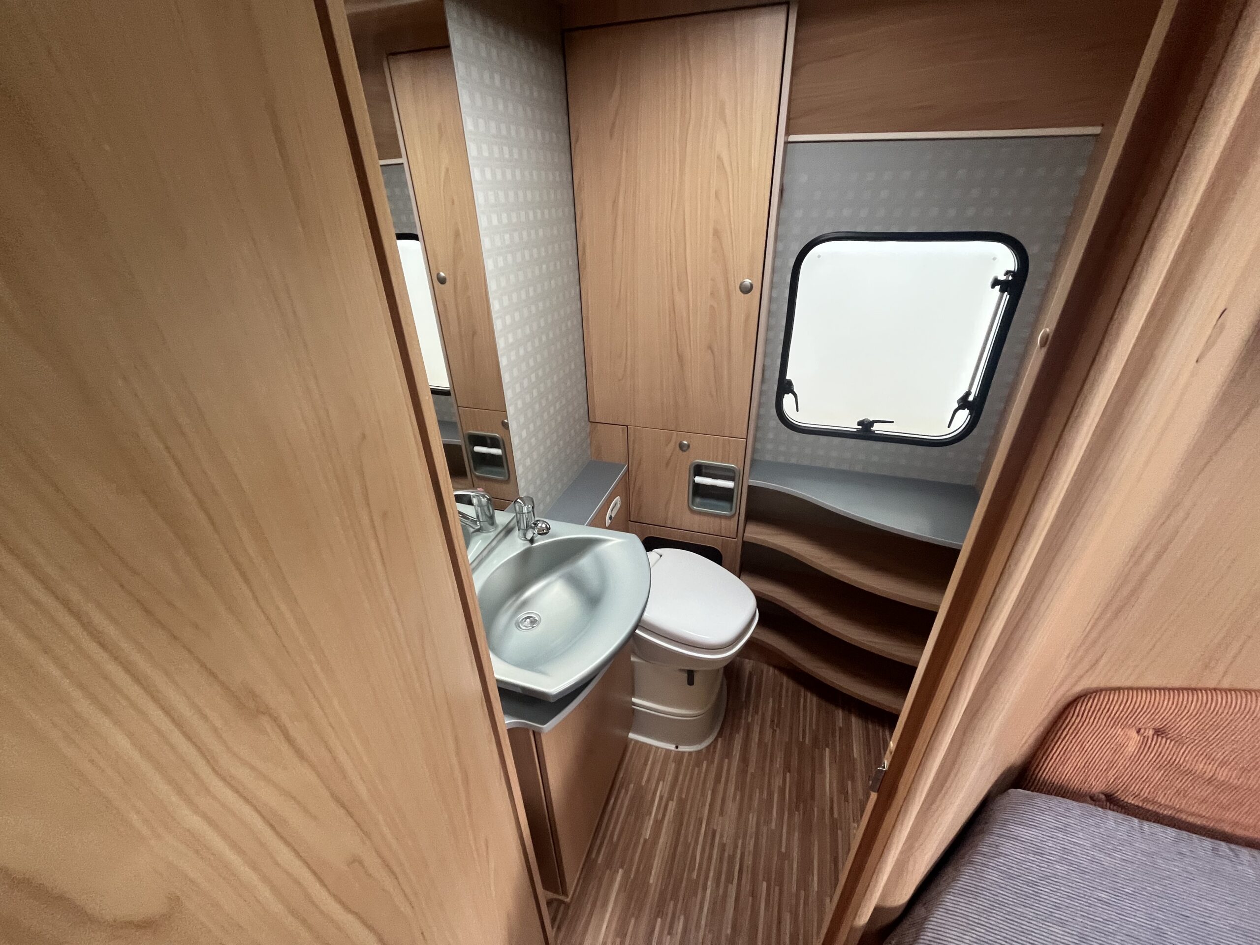 The popular layout consists of a generous sized rear washroom with a Toilet, Sink, Large mirror, plenty storage, and a separate shower cubical. As you step out of the washroom, to the left you are greeted by the French bed which is a nice cosy sized double. Moving forwards is the kitchen area with large stainless steel sink, mixer tap, drainer, 3 gas burner hob, Dometic three way large fridge freezer and an oven and grill combi.