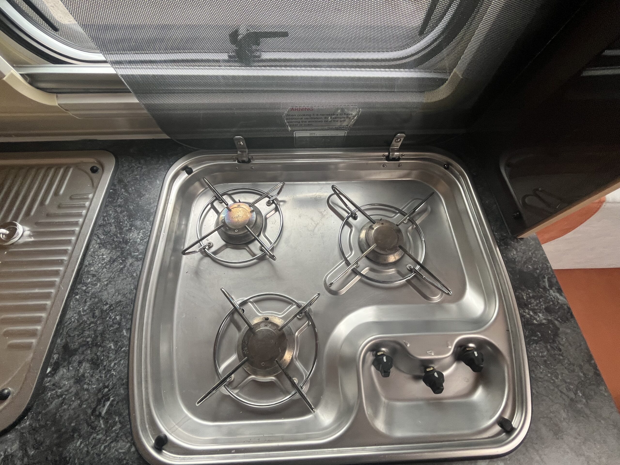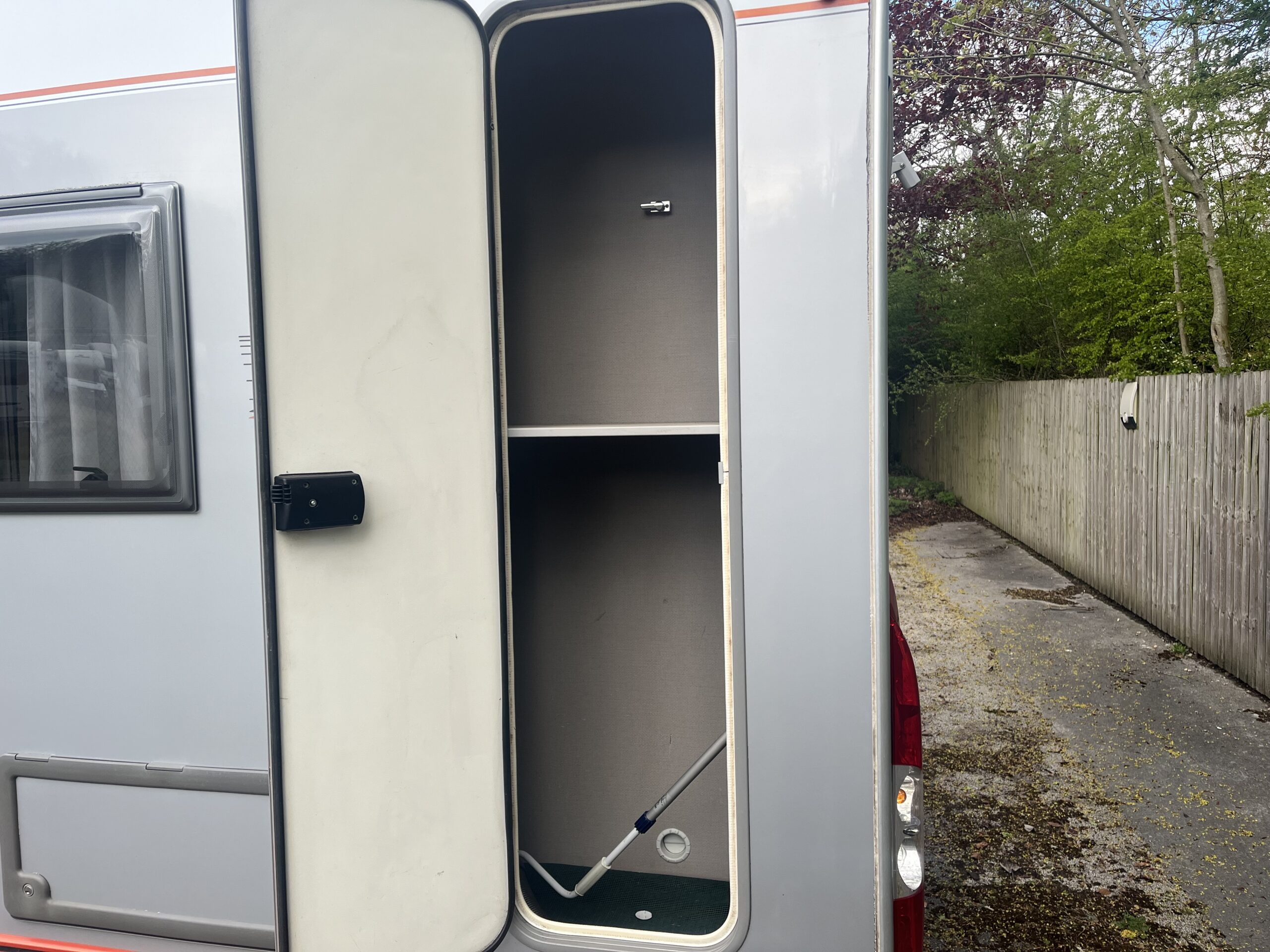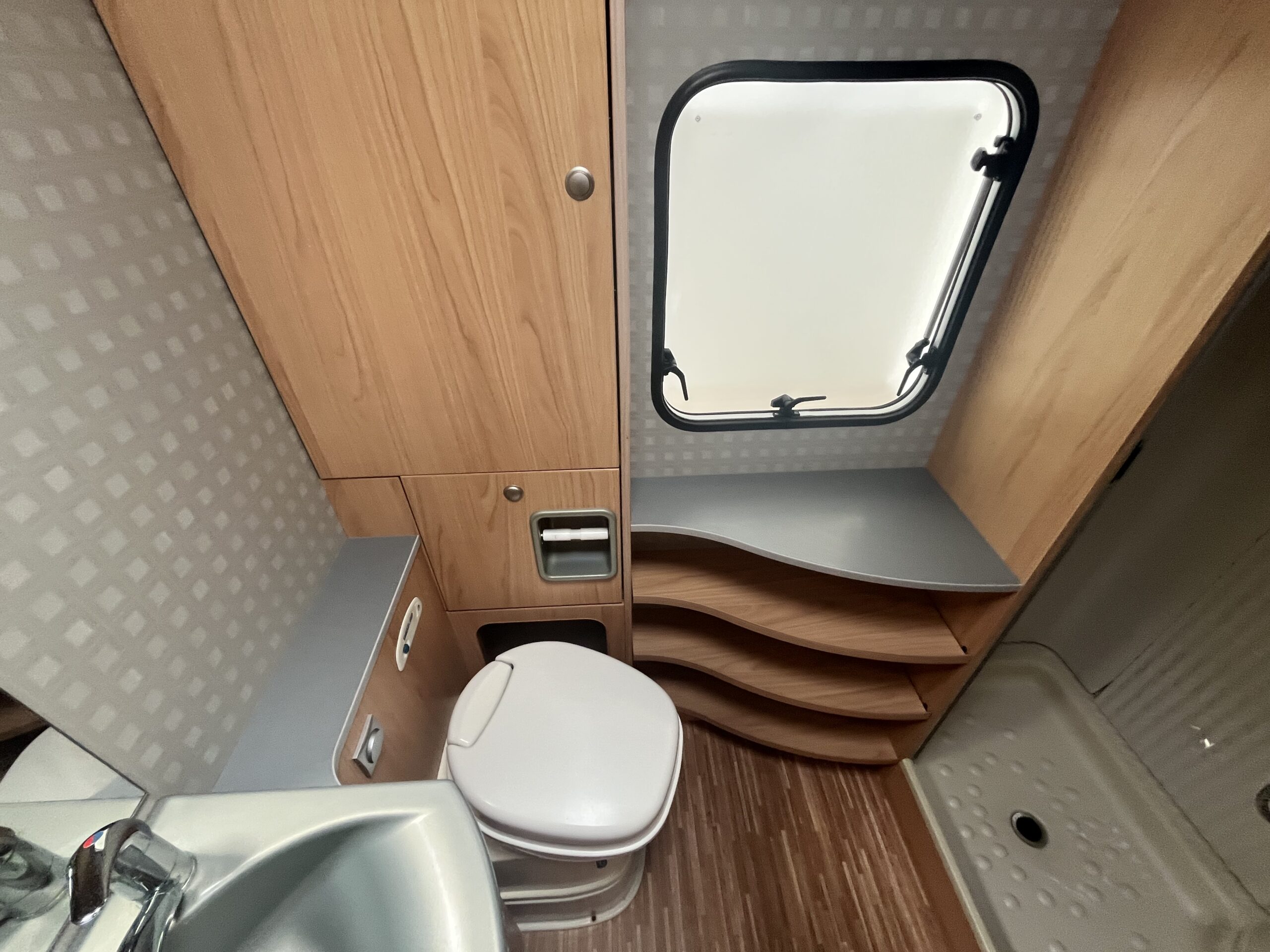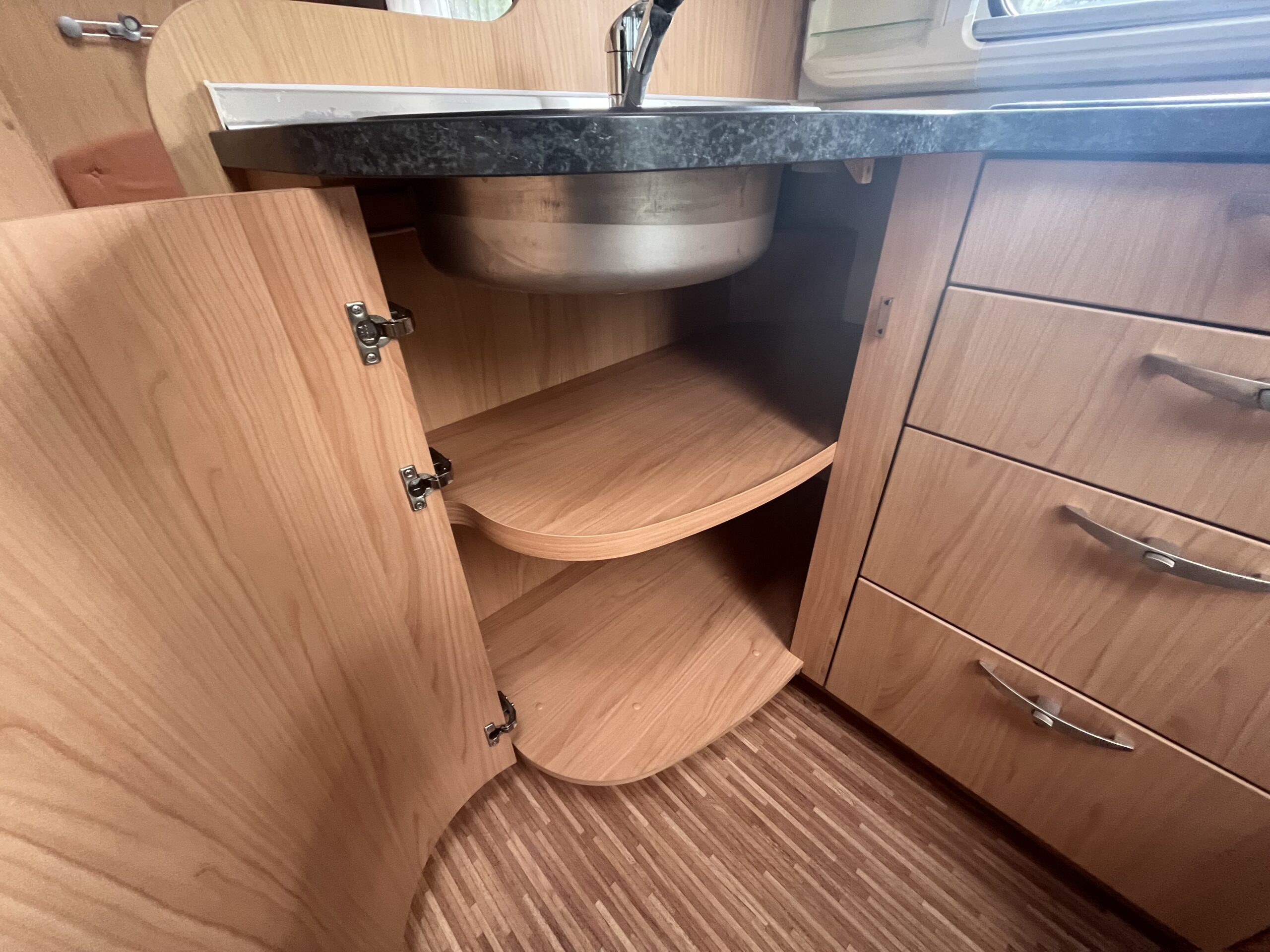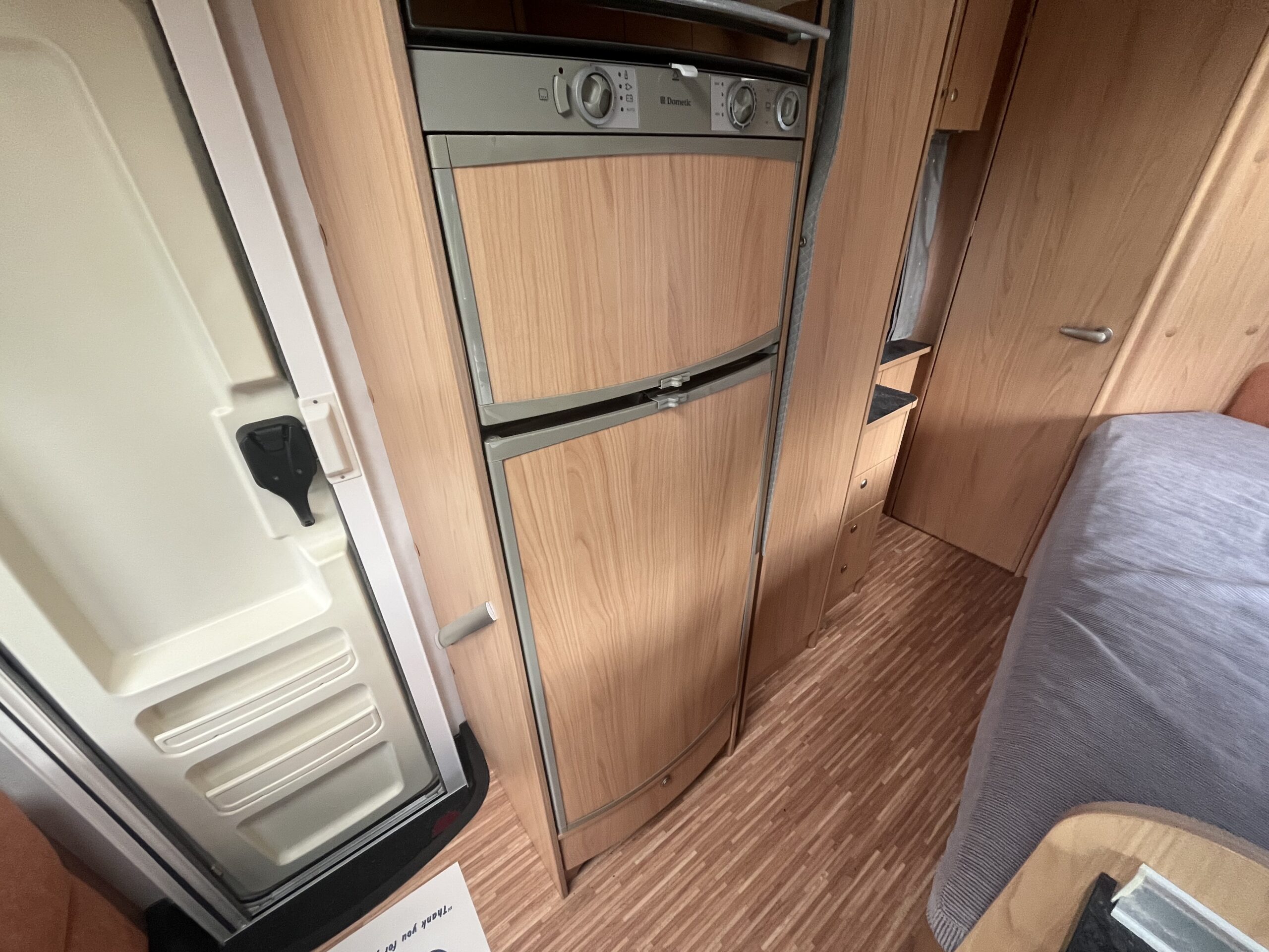 The popular layout consists of a generous sized rear washroom with a Toilet, Sink, Large mirror, plenty storage, and a separate shower cubical. As you step out of the washroom, to the left you are greeted by the French bed which is a nice cosy sized double. Moving forwards is the kitchen area with large stainless steel sink, mixer tap, drainer, 3 gas burner hob, Dometic three way large fridge freezer and an oven and grill combi.