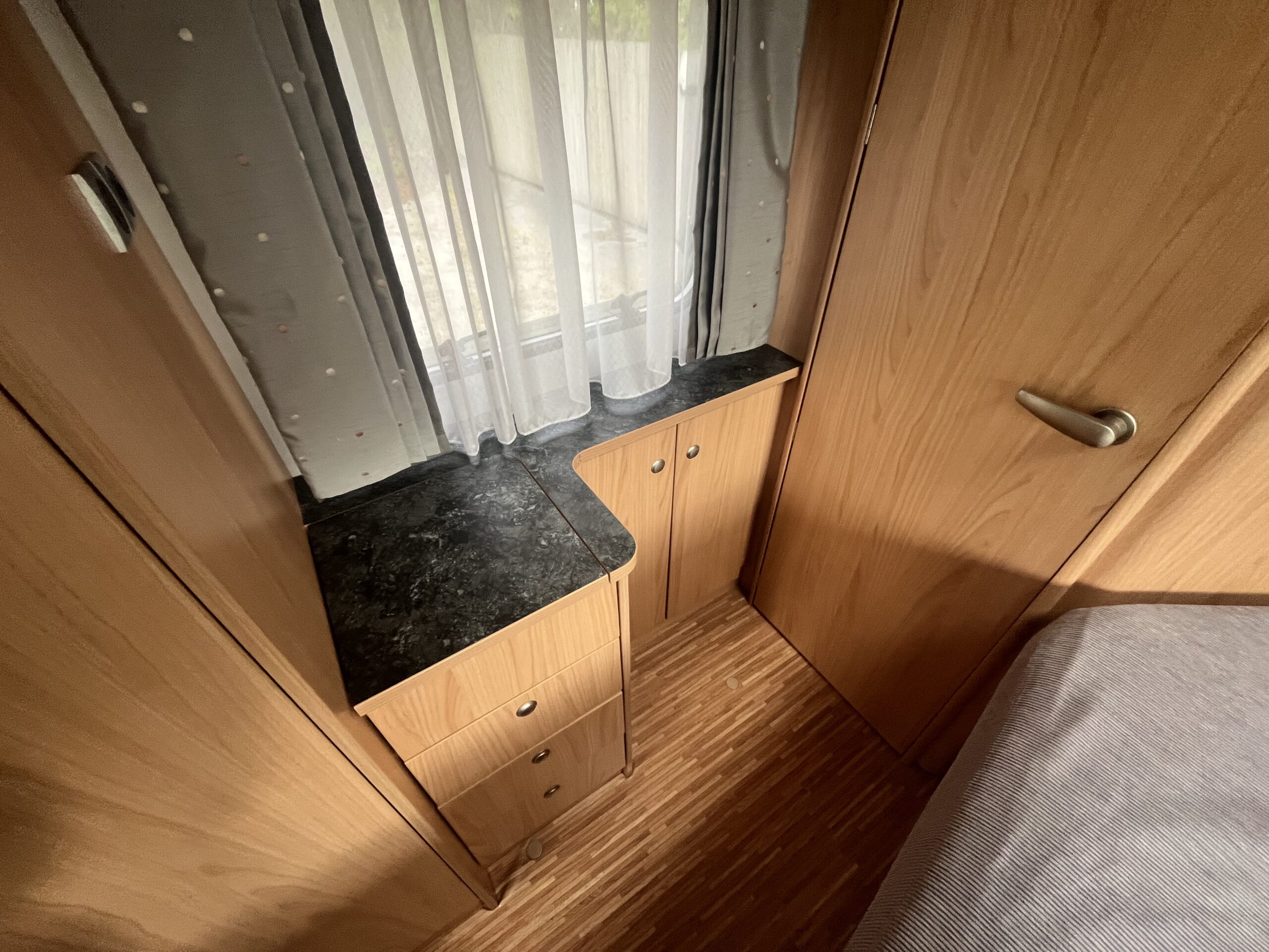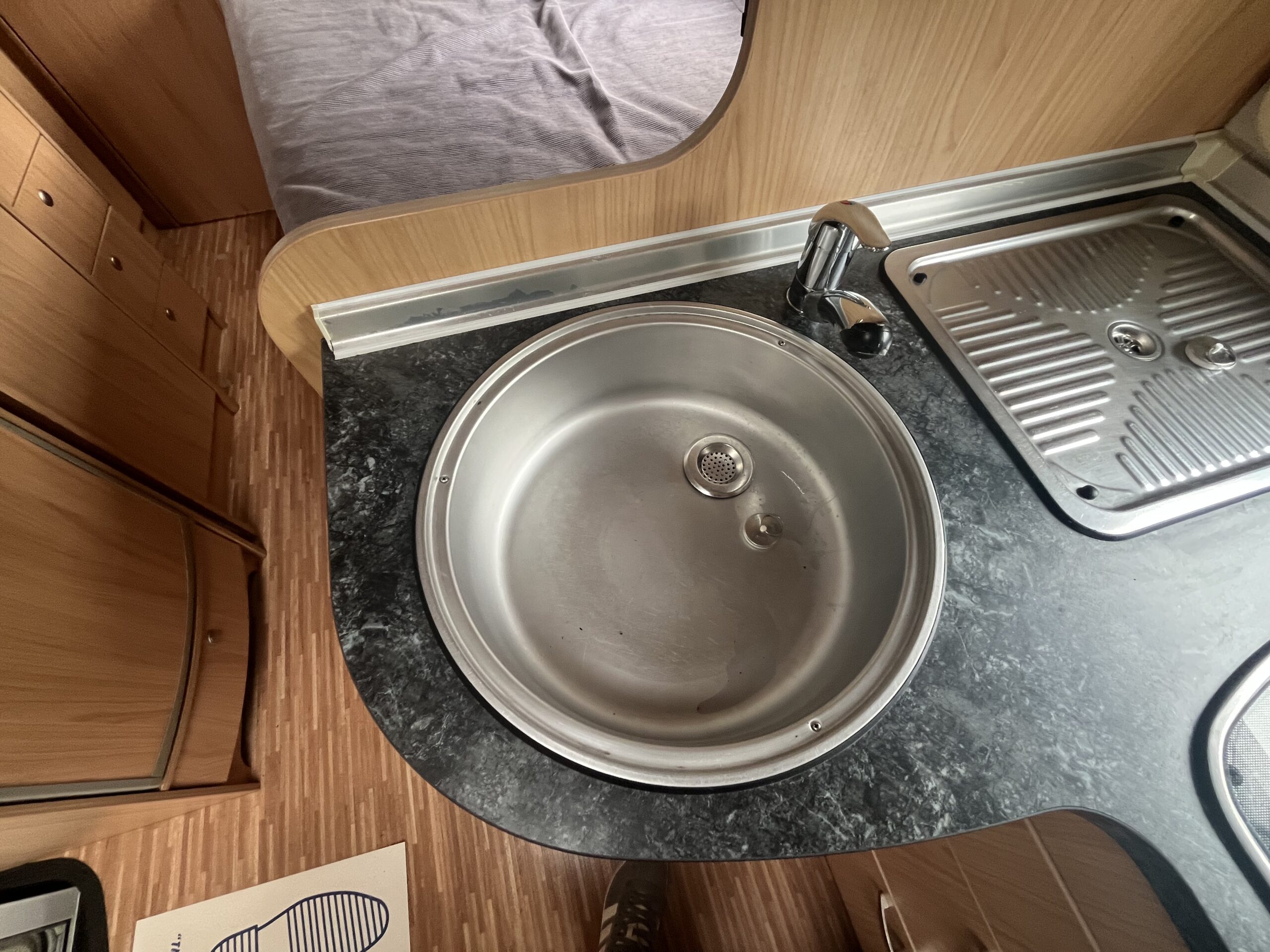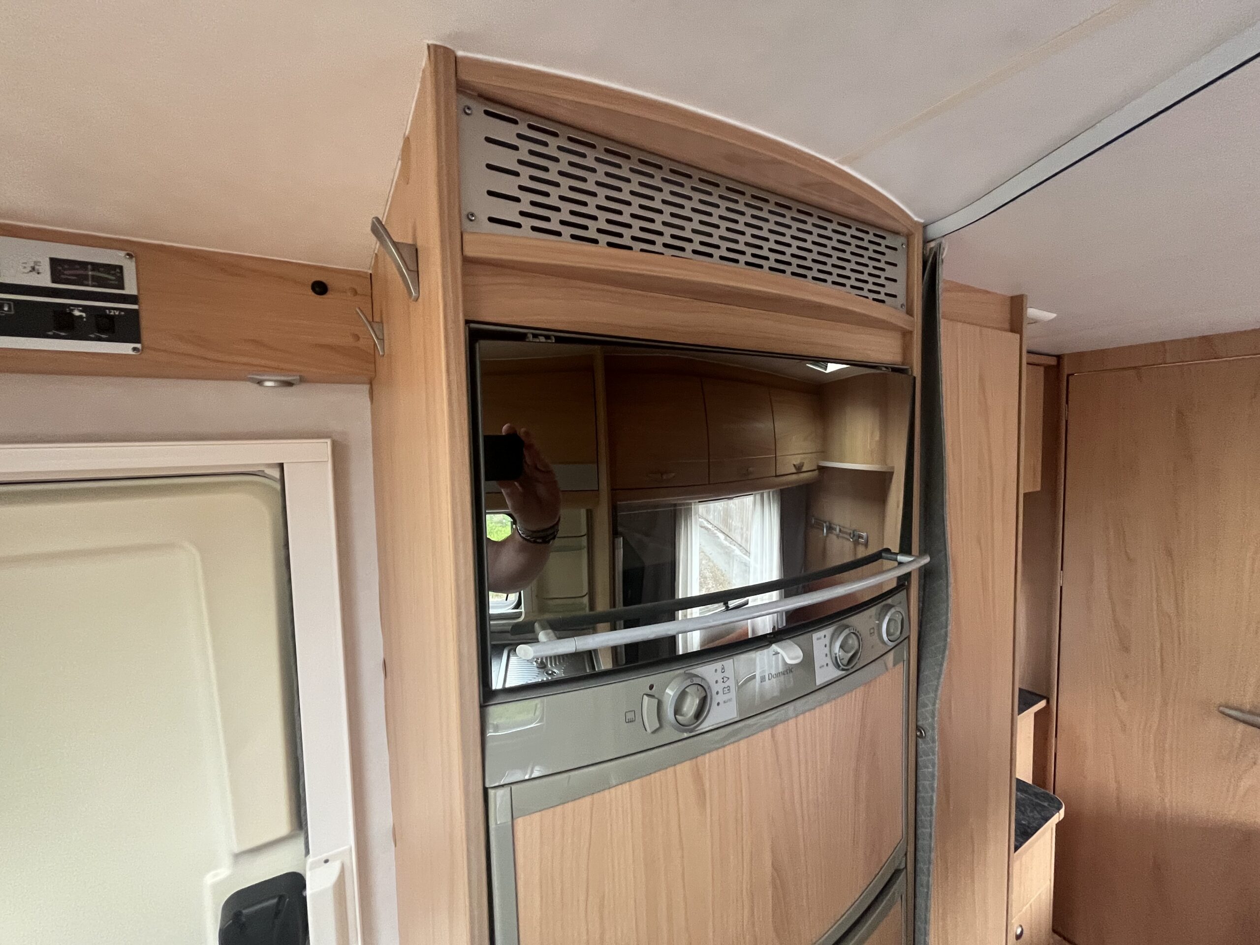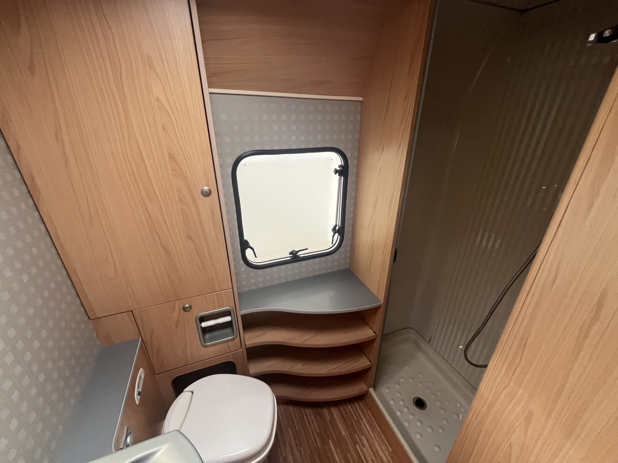 The popular layout consists of a generous sized rear washroom with a Toilet, Sink, Large mirror, plenty storage, and a separate shower cubical. As you step out of the washroom, to the left you are greeted by the French bed which is a nice cosy sized double. Moving forwards is the kitchen area with large stainless steel sink, mixer tap, drainer, 3 gas burner hob, Dometic three way large fridge freezer and an oven and grill combi.