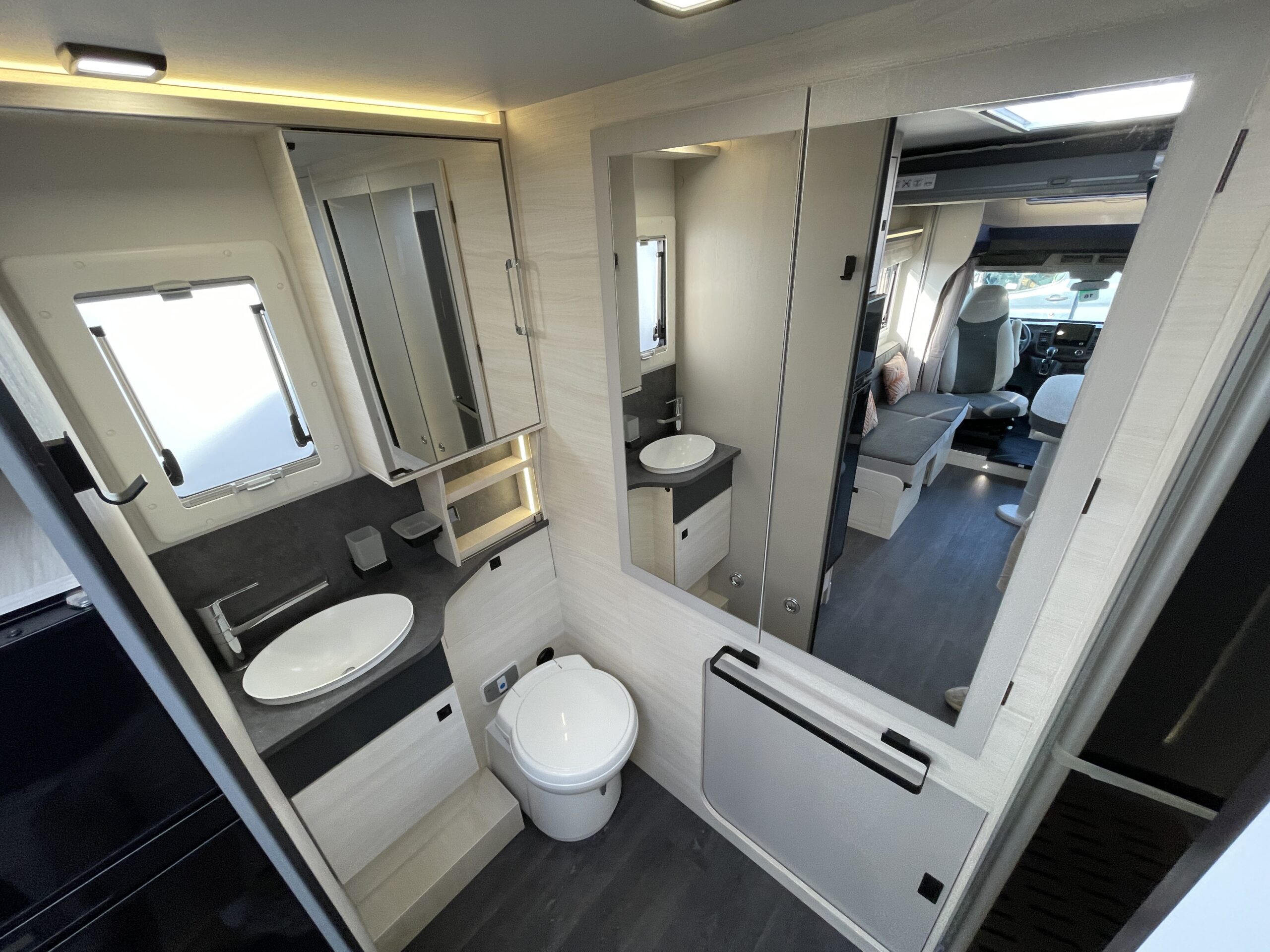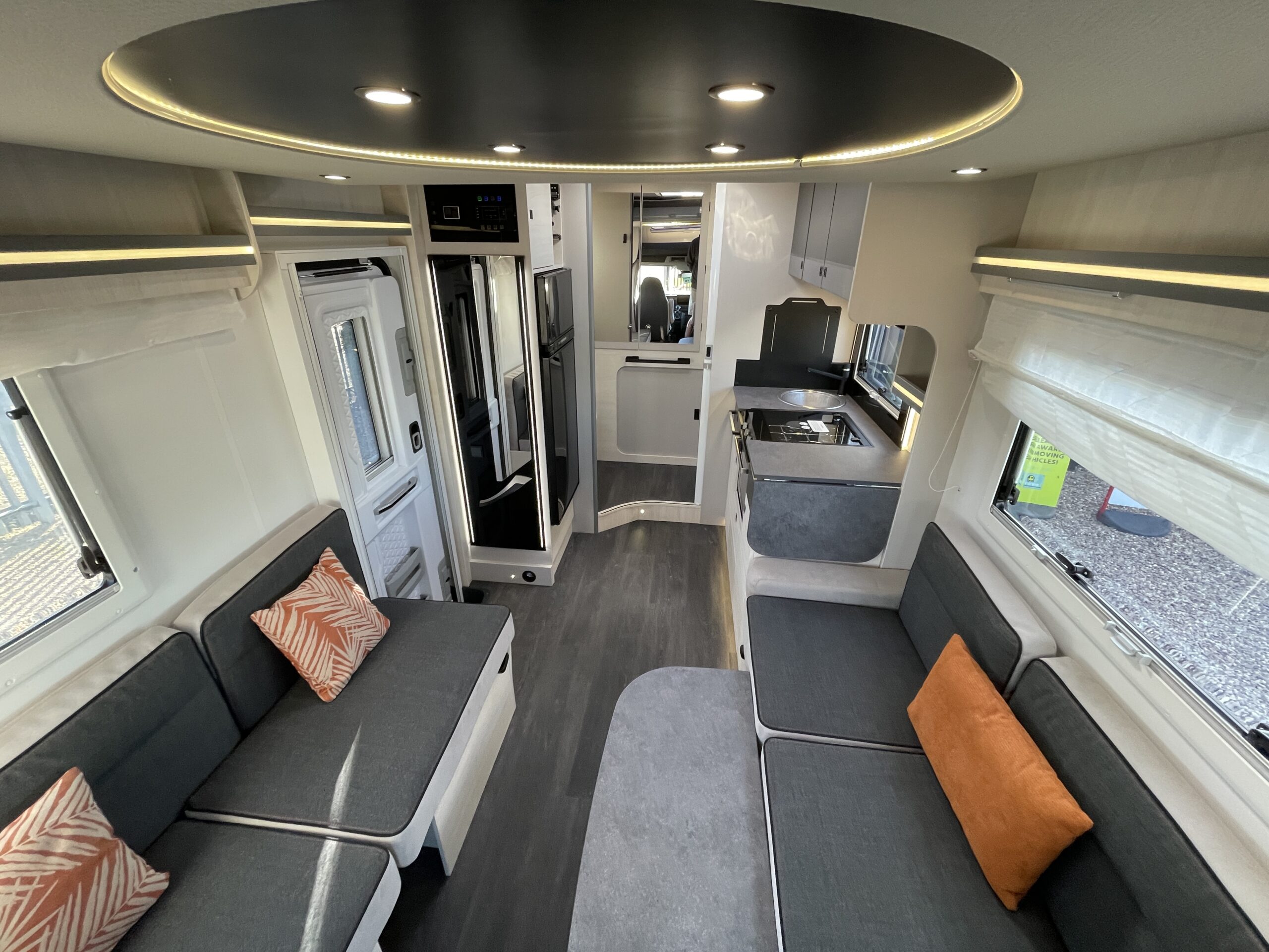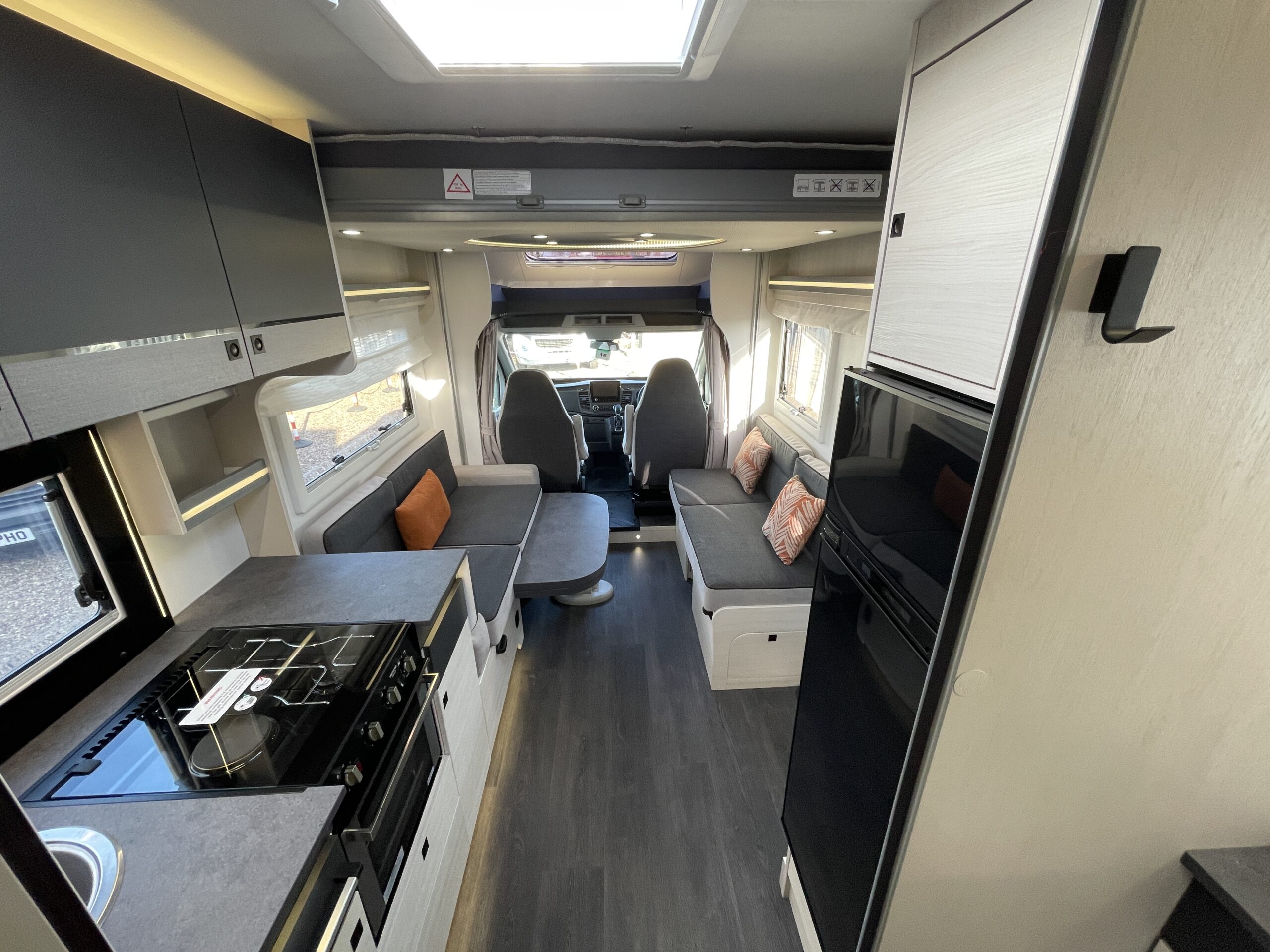 The lounge/dinette area is a superb space for entertaining or relaxing in; you have two opposing benches which can be used to create a 2 berth. You also benefit from pop up seats under the benches! Above there is a large 2 berth drop down bed. Moving to the rear you have the kitchen where there is a 2 gas hob with electric plate, oven/grill combi, XL large fridge with separate freezer, sink with mixer tap and storage. At the rear is a full width washroom with a toilet, sink with mixer tap, separate shower cubicle and a very large storage cupboard with plenty of shelves. The motorhome uses the Truma boiler for heating and hot water and Webasto altitude diesel heating.