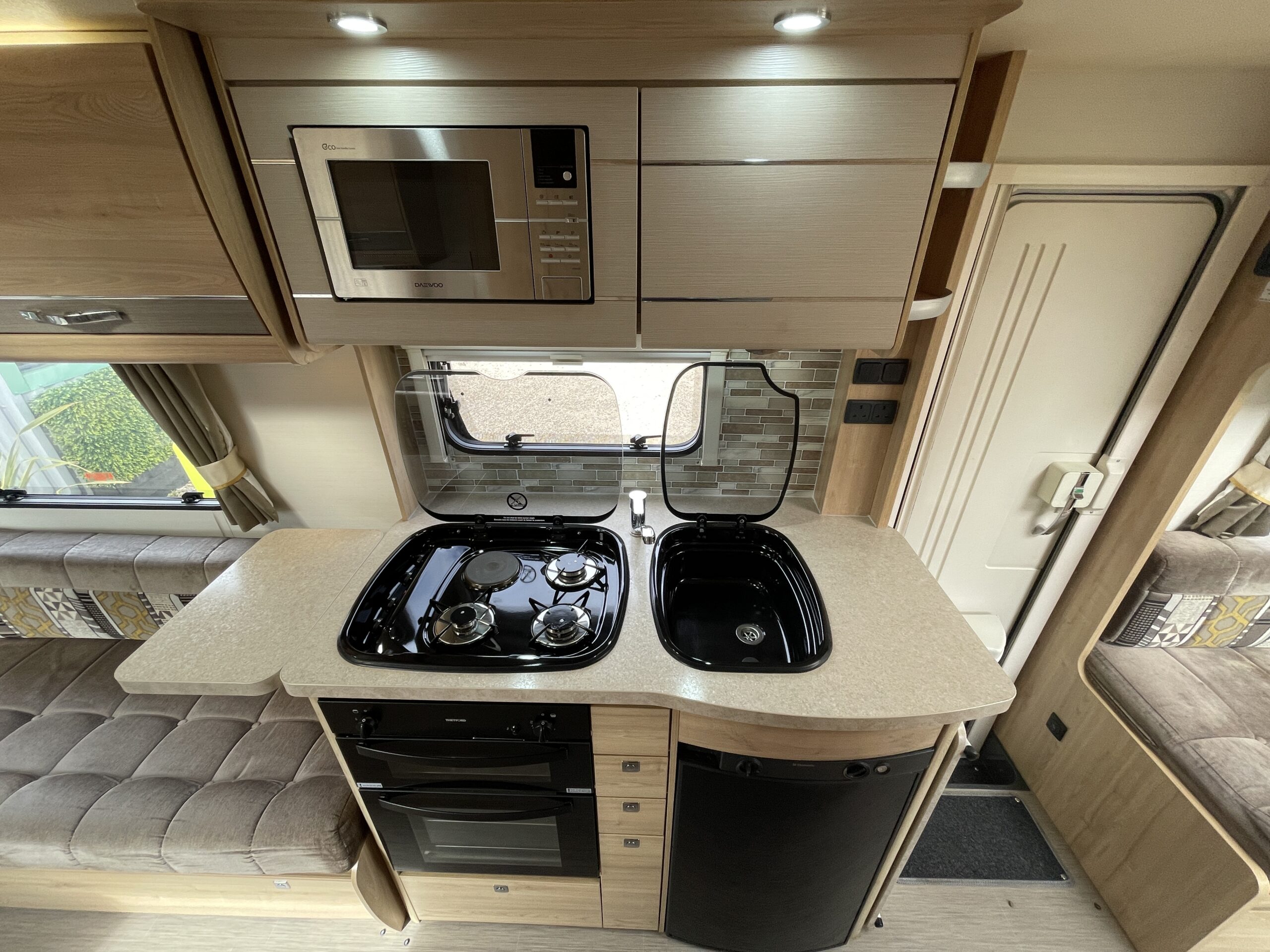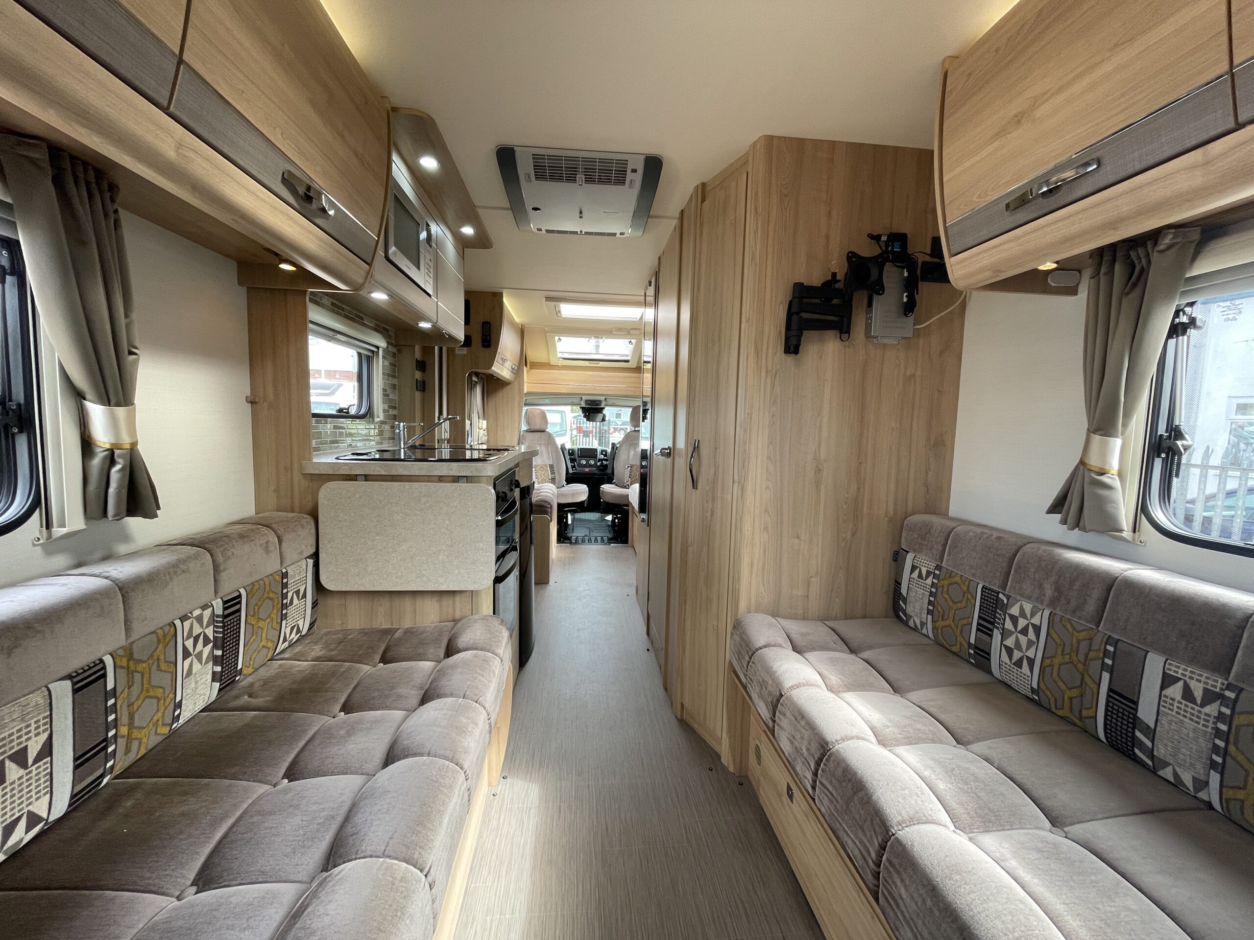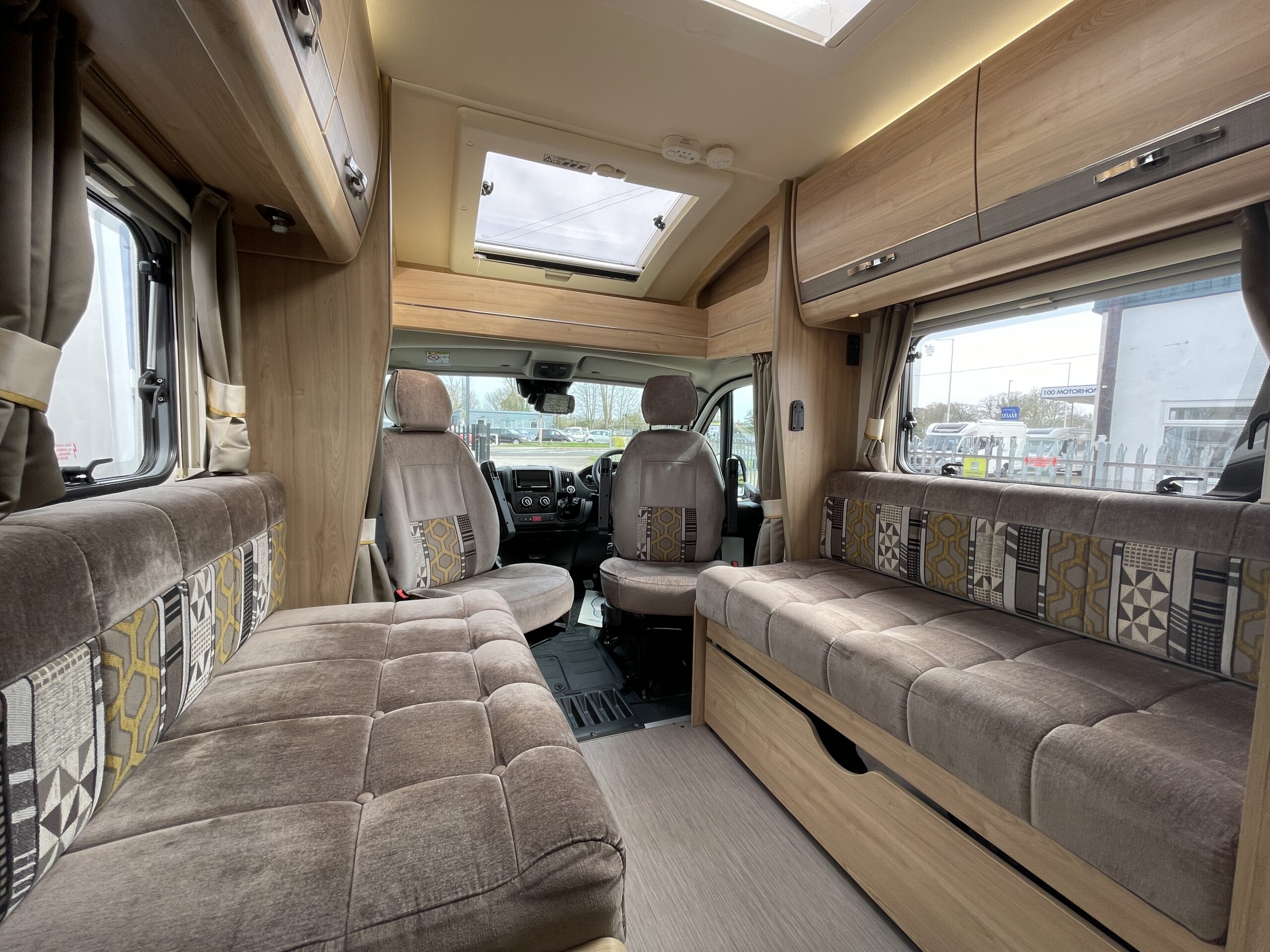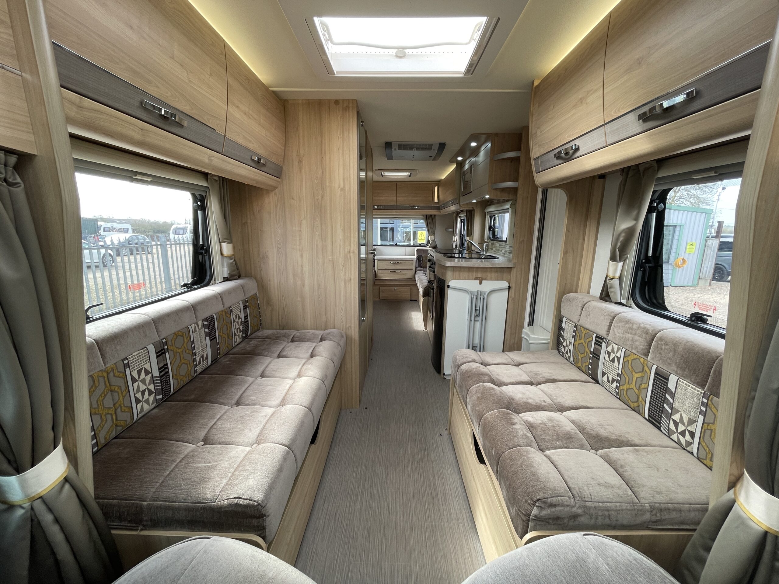 Entering the habitation door on the passenger side you are greeted by a spacious, well lit, neutral interior. The front lounge when utilising the captain seats can comfortably seat up to 6 people when relaxing or entertaining. The bench seats easily make’s up into a large 2 berth. Neatly stored under the bench seats are 2 of the travelling seats. Centrally you have a fully equipped kitchen with a full oven, hob, microwave, 3 way fridge with freezer, sink and extra hide away preparation space. Towards the rear you have two long benches which can also be used as single beds or converted to a large 2 berth bed. There is also ample storage above and below throughout this model.