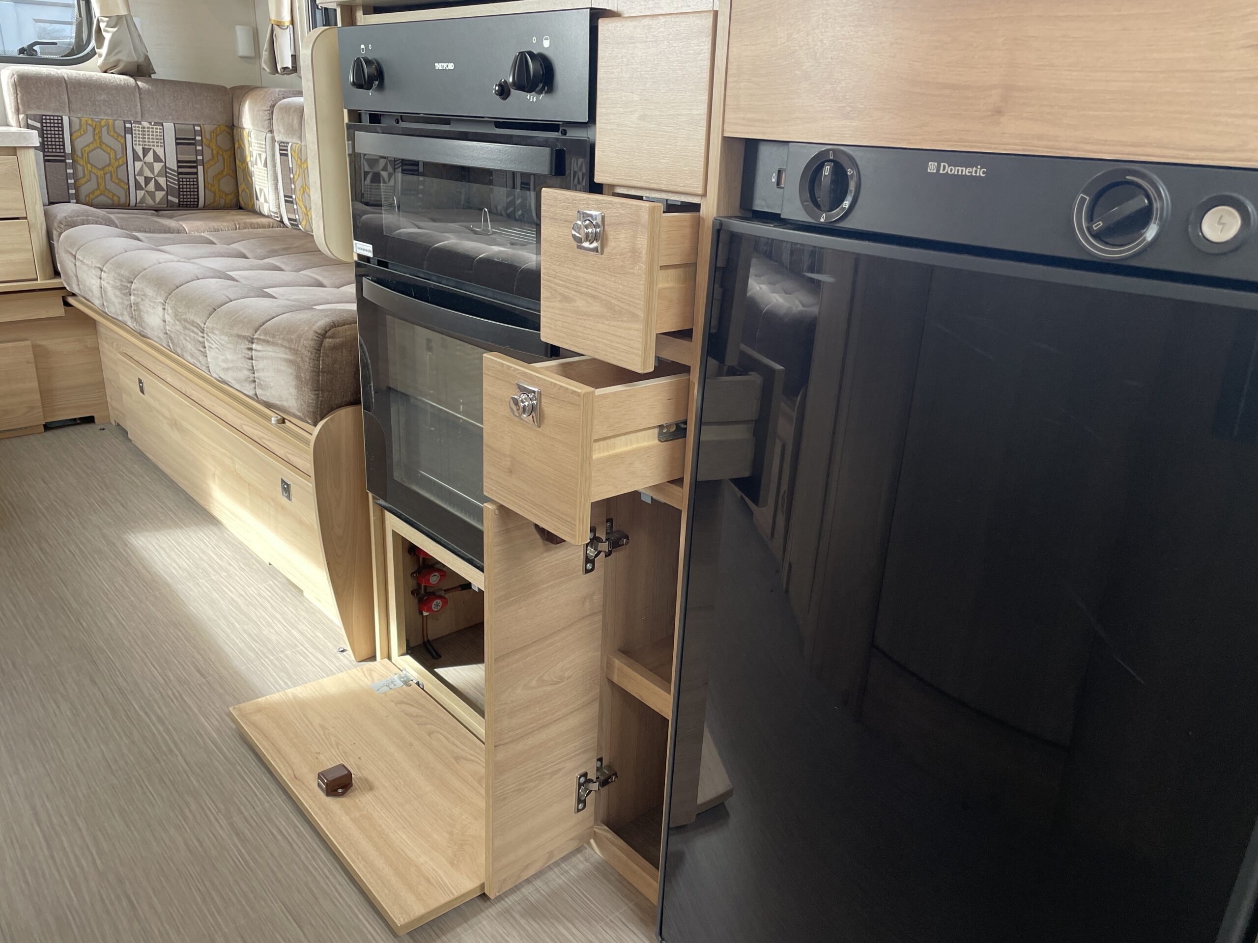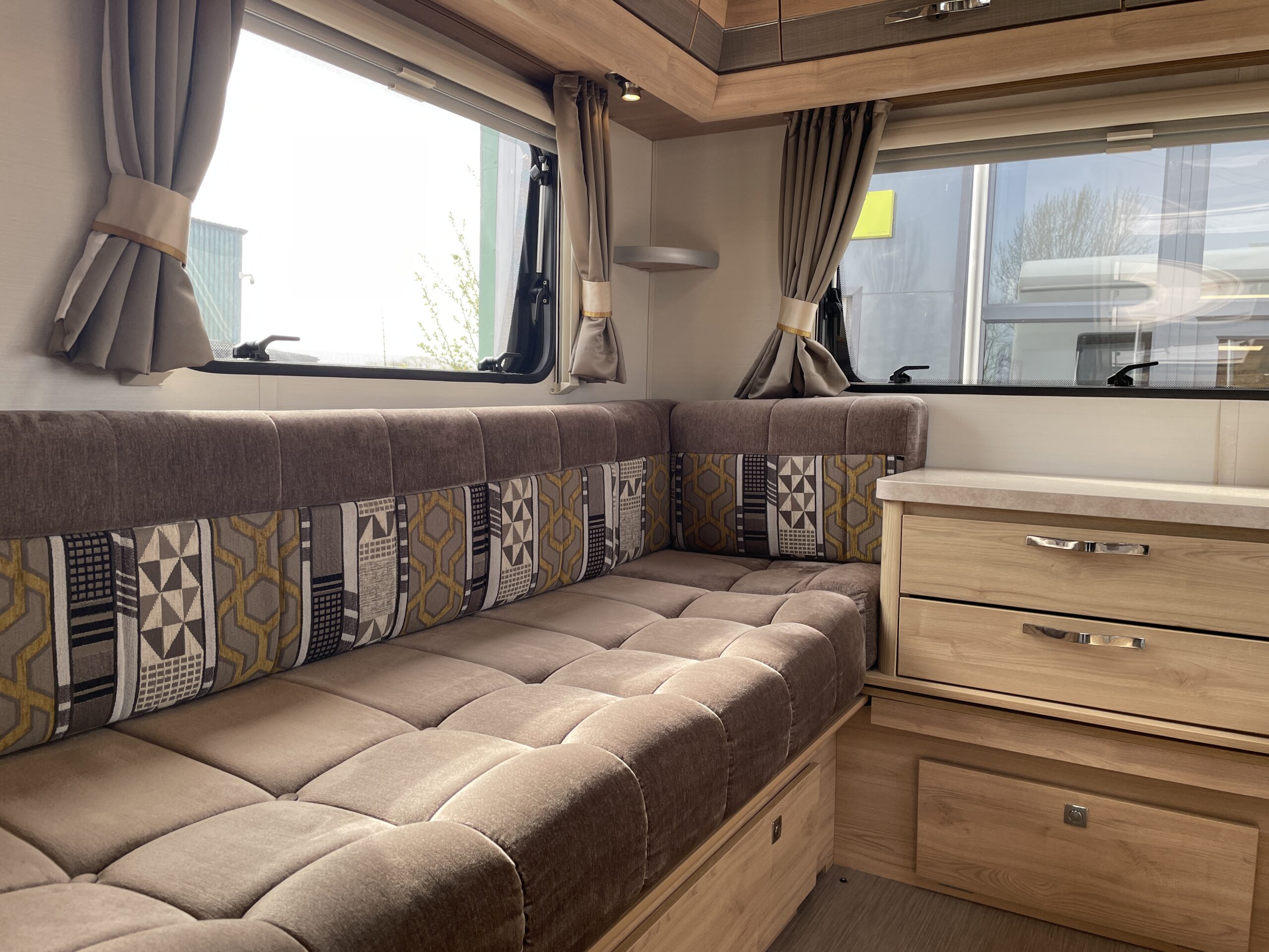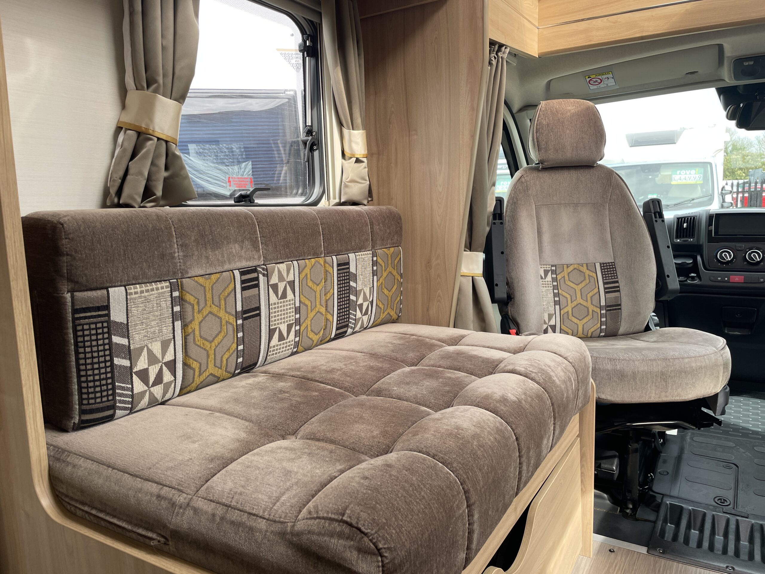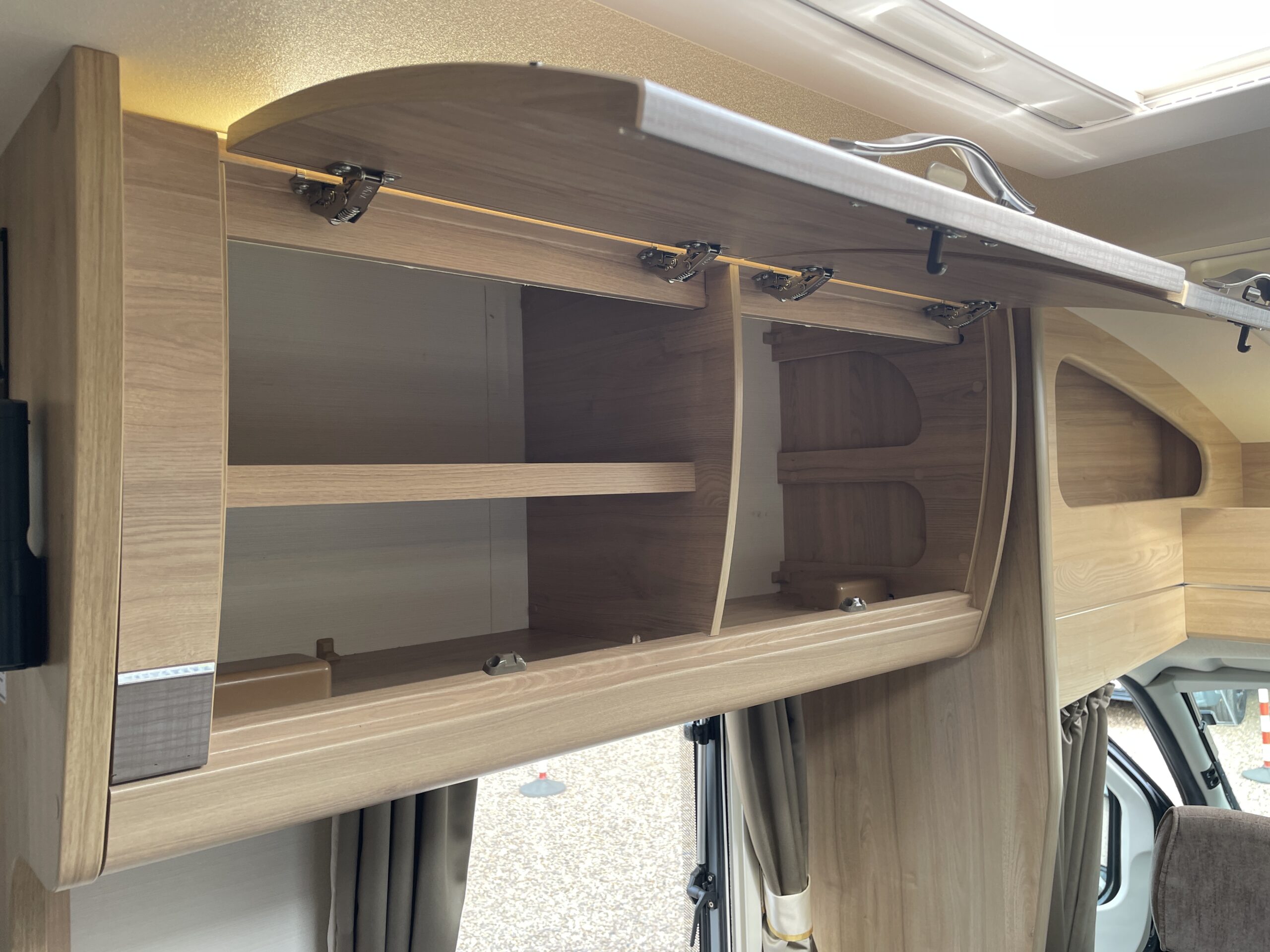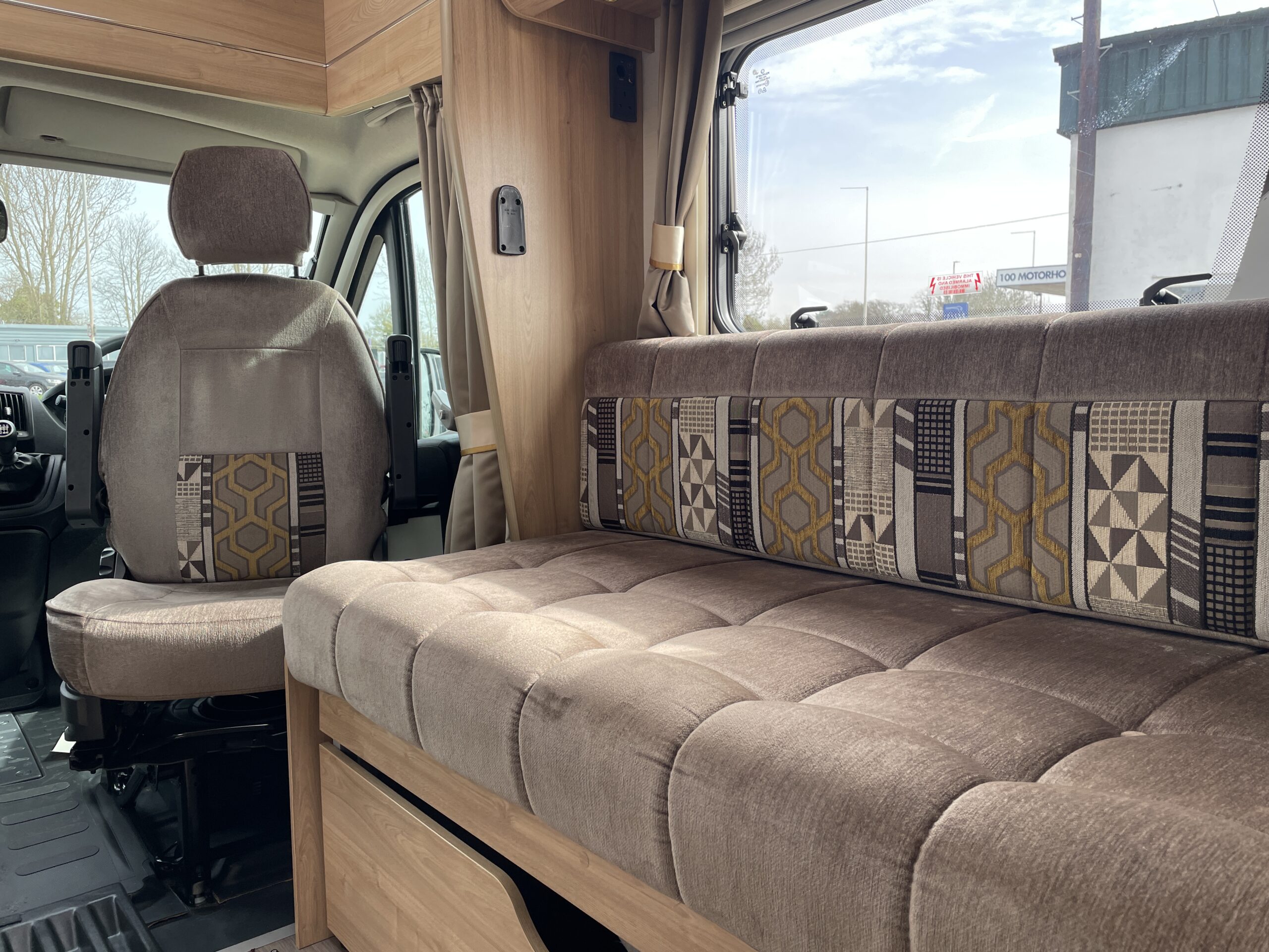 Entering the habitation door on the passenger side you are greeted by a spacious, well lit, neutral interior. The front lounge when utilising the captain seats can comfortably seat up to 6 people when relaxing or entertaining. The bench seats easily make’s up into a large 2 berth. Neatly stored under the bench seats are 2 of the travelling seats. Centrally you have a fully equipped kitchen with a full oven, hob, microwave, 3 way fridge with freezer, sink and extra hide away preparation space. Towards the rear you have two long benches which can also be used as single beds or converted to a large 2 berth bed. There is also ample storage above and below throughout this model.