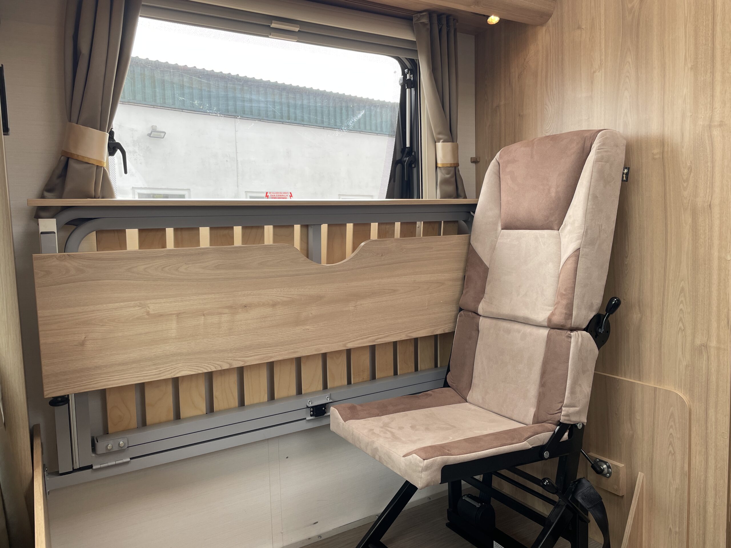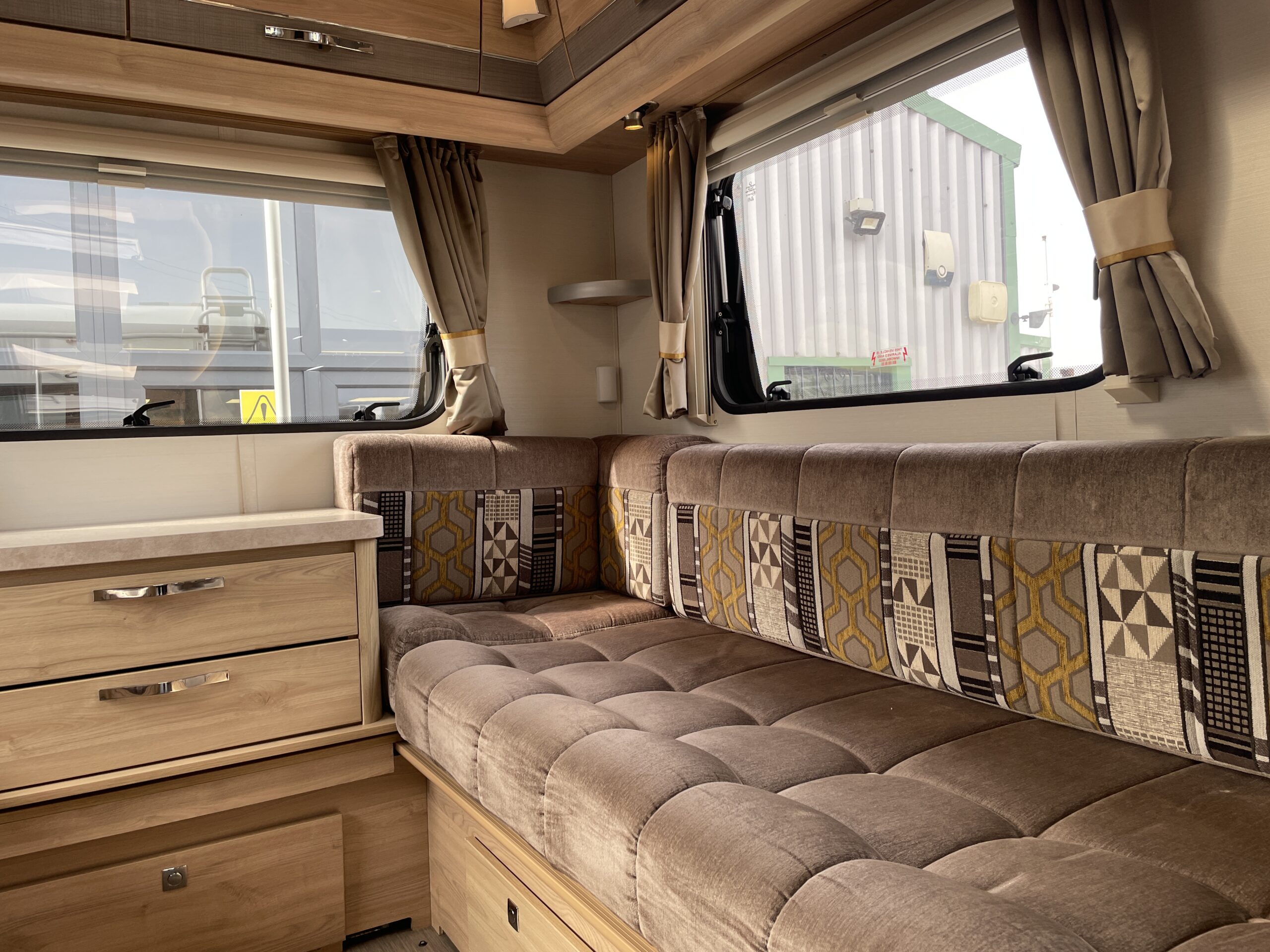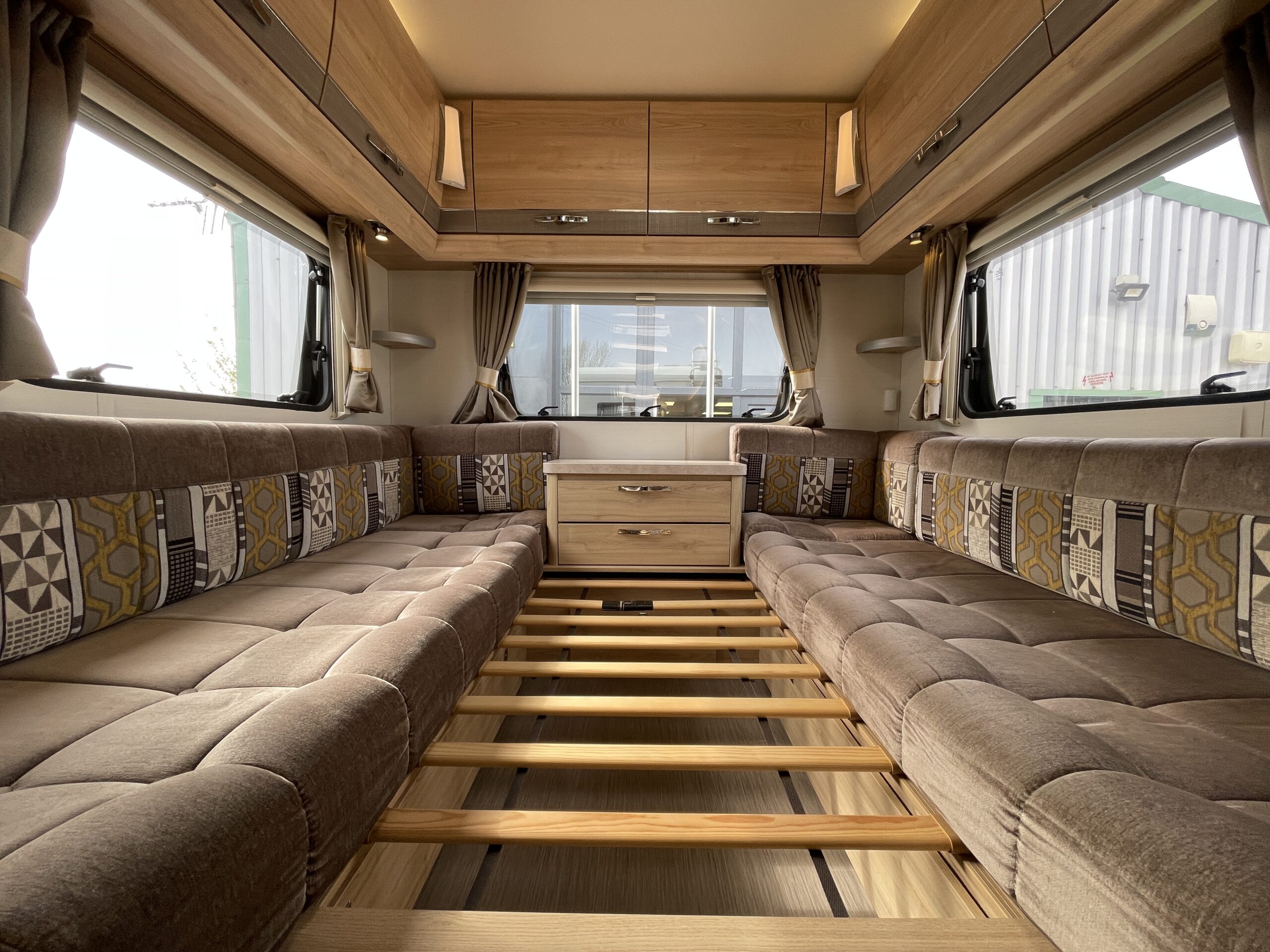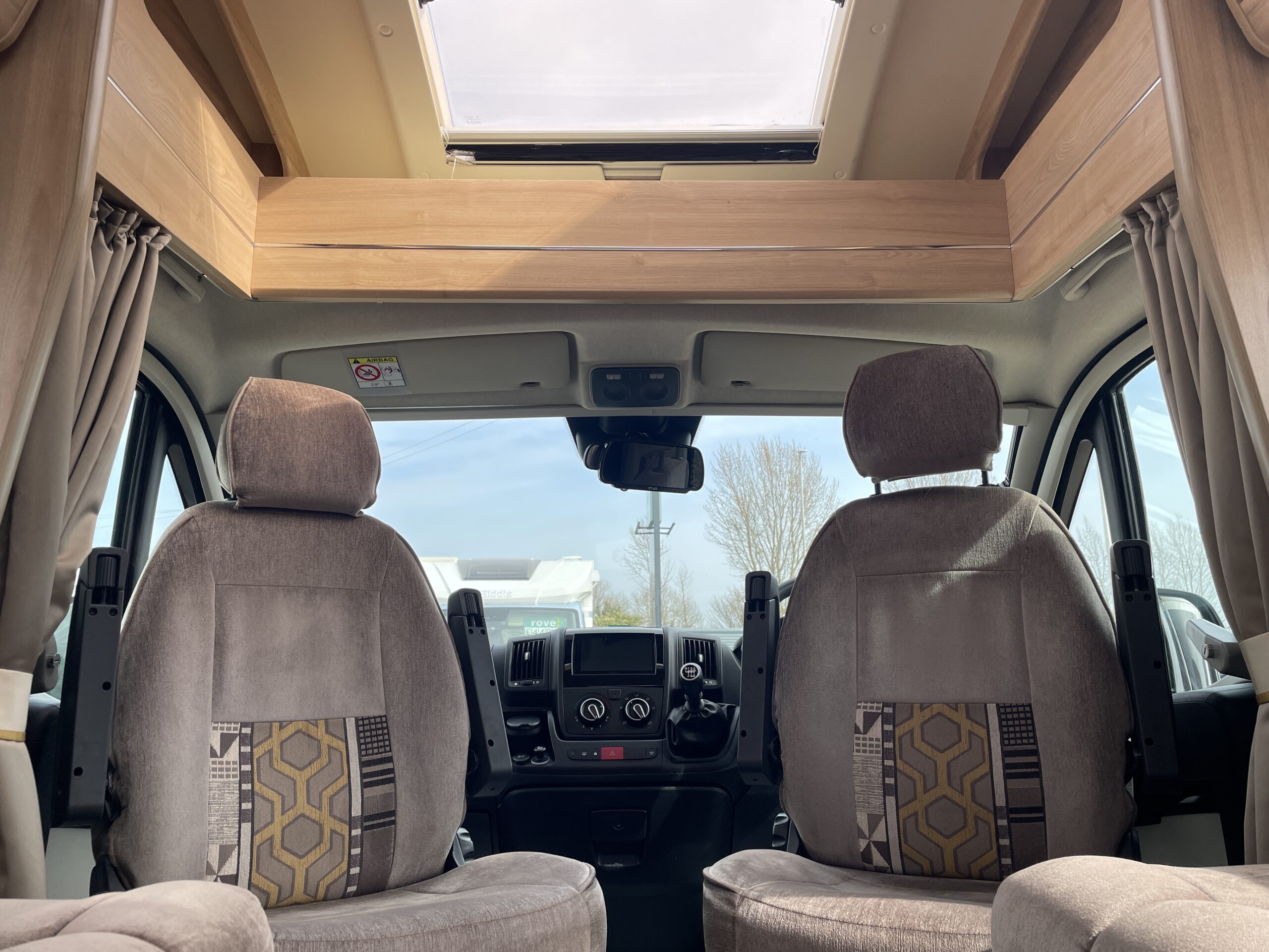 Entering the habitation door on the passenger side you are greeted by a spacious, well lit, neutral interior. The front lounge when utilising the captain seats can comfortably seat up to 6 people when relaxing or entertaining. The bench seats easily make’s up into a large 2 berth. Neatly stored under the bench seats are 2 of the travelling seats. Centrally you have a fully equipped kitchen with a full oven, hob, microwave, 3 way fridge with freezer, sink and extra hide away preparation space. Towards the rear you have two long benches which can also be used as single beds or converted to a large 2 berth bed. There is also ample storage above and below throughout this model.