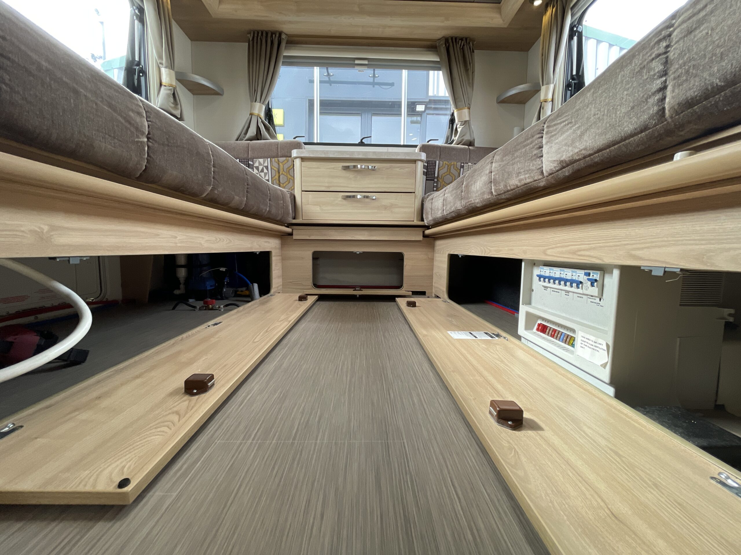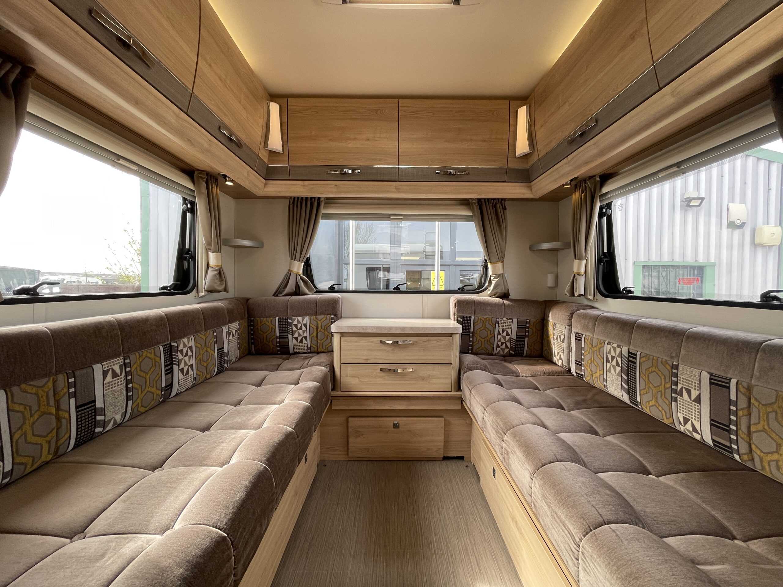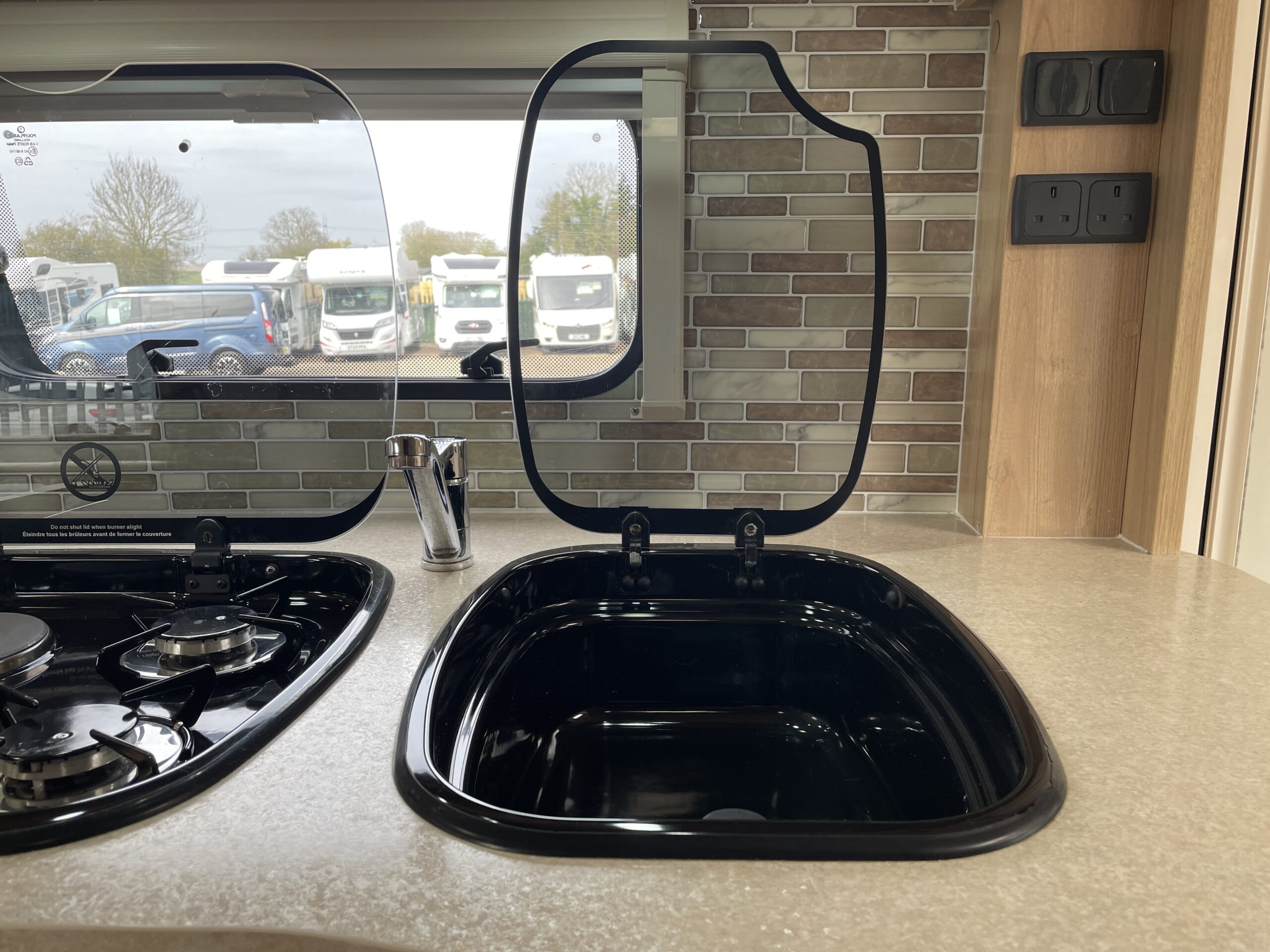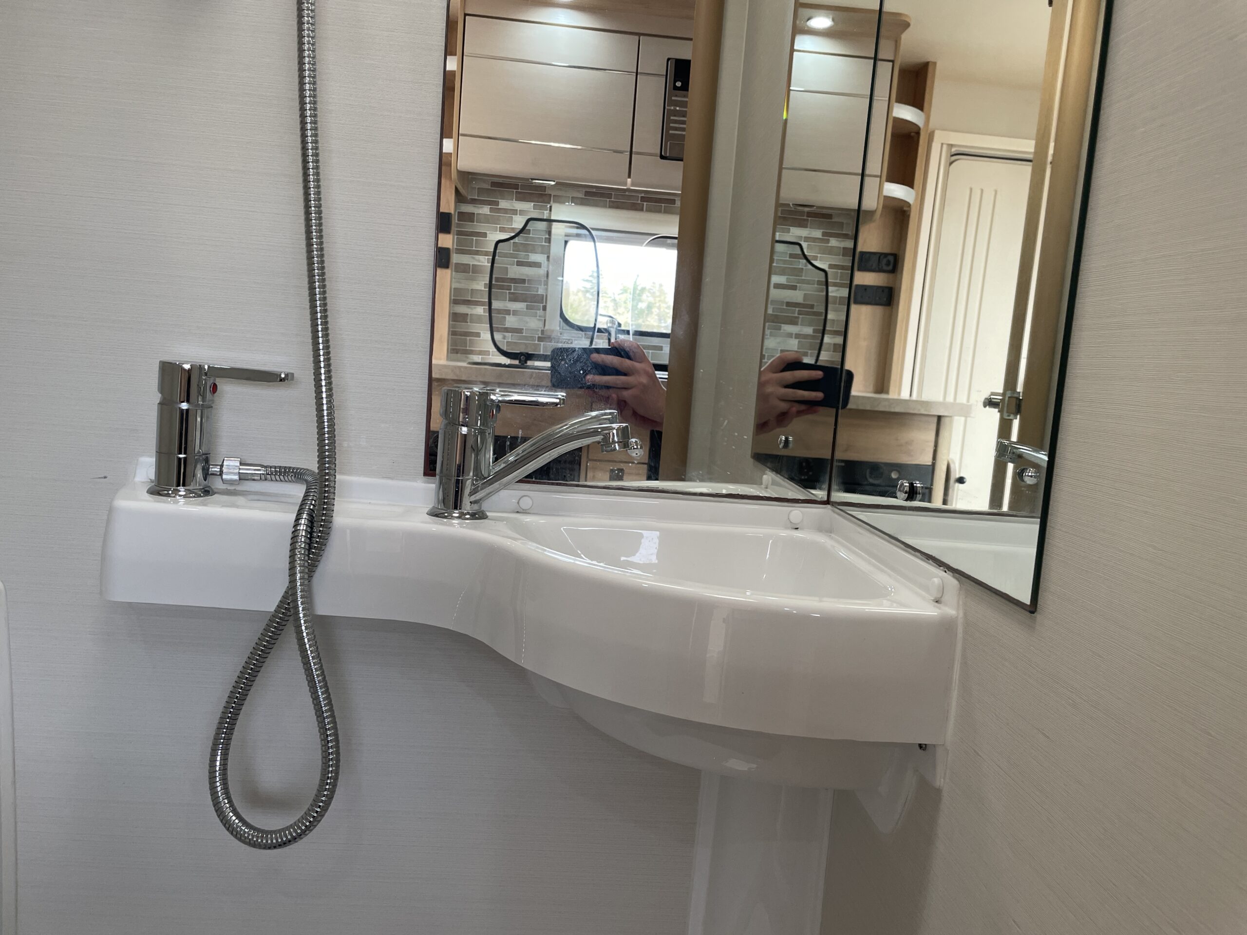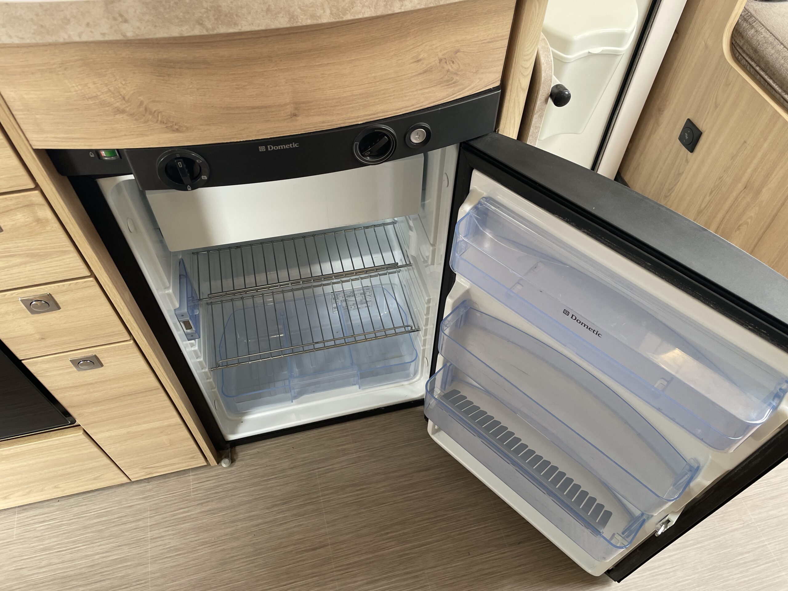 Entering the habitation door on the passenger side you are greeted by a spacious, well lit, neutral interior. The front lounge when utilising the captain seats can comfortably seat up to 6 people when relaxing or entertaining. The bench seats easily make’s up into a large 2 berth. Neatly stored under the bench seats are 2 of the travelling seats. Centrally you have a fully equipped kitchen with a full oven, hob, microwave, 3 way fridge with freezer, sink and extra hide away preparation space. Towards the rear you have two long benches which can also be used as single beds or converted to a large 2 berth bed. There is also ample storage above and below throughout this model.