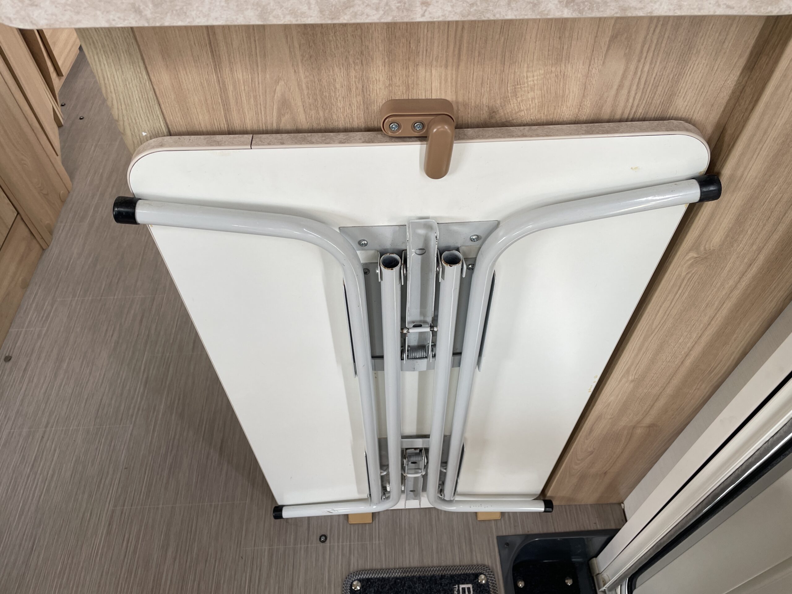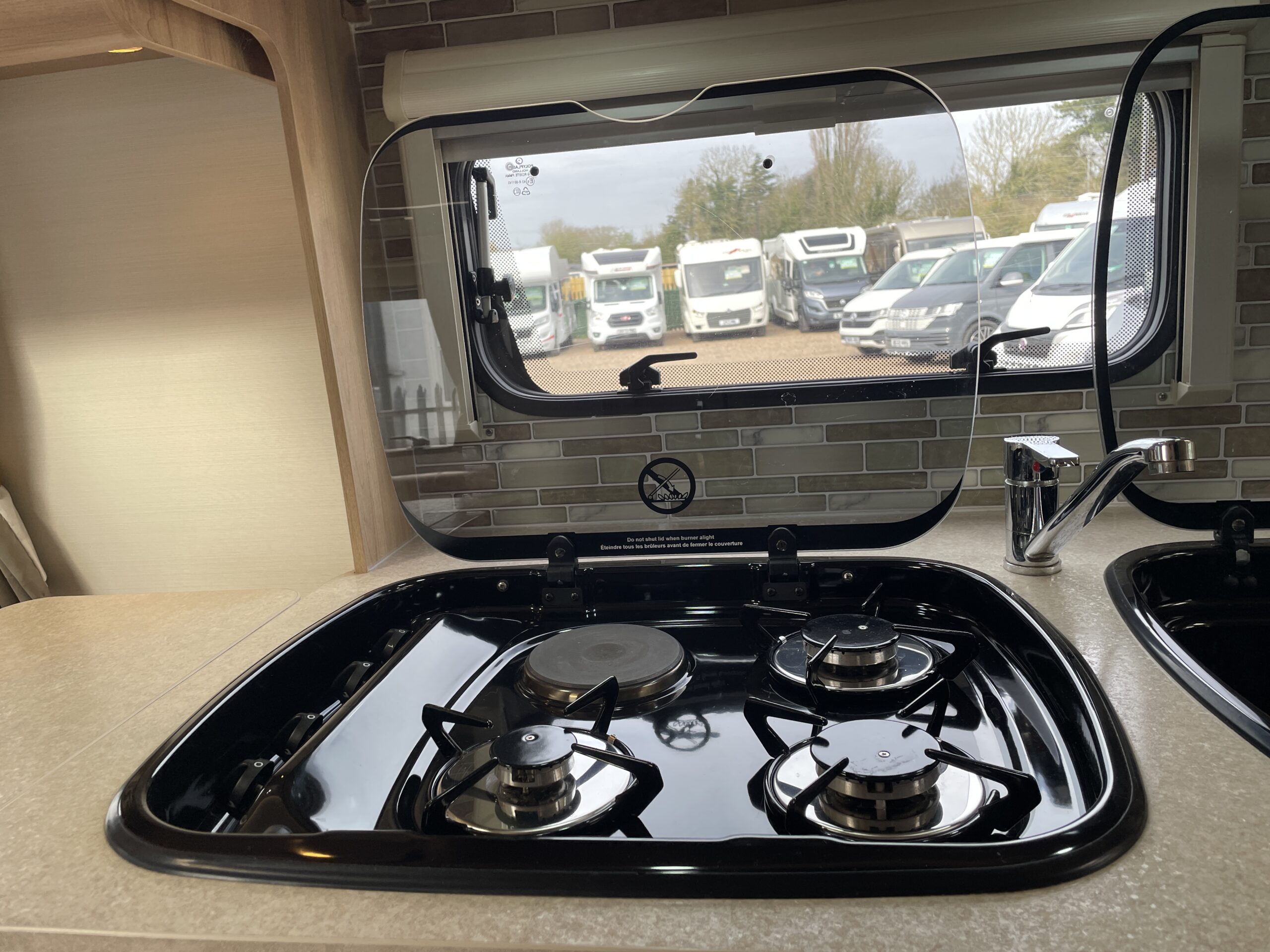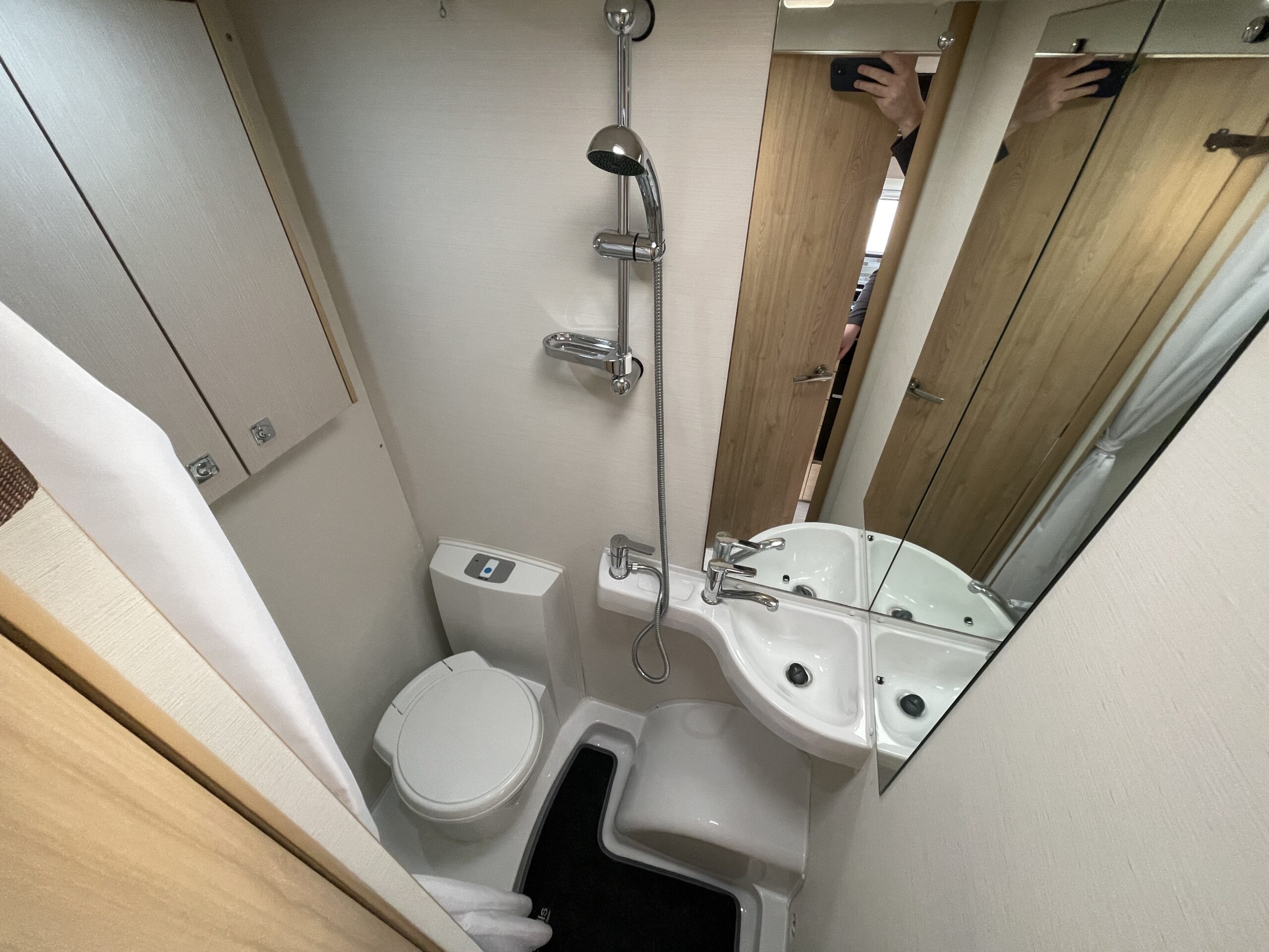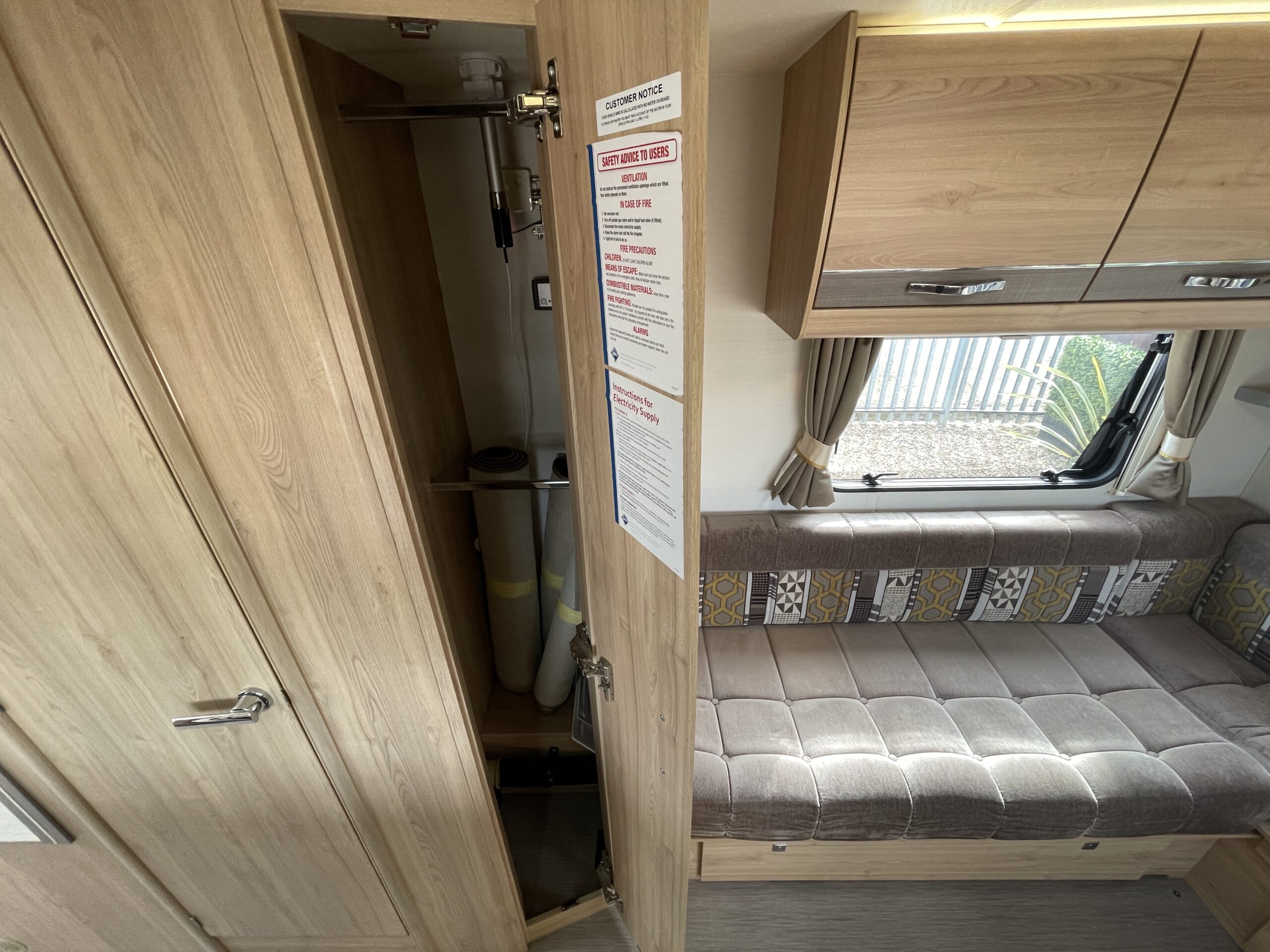 Entering the habitation door on the passenger side you are greeted by a spacious, well lit, neutral interior. The front lounge when utilising the captain seats can comfortably seat up to 6 people when relaxing or entertaining. The bench seats easily make’s up into a large 2 berth. Neatly stored under the bench seats are 2 of the travelling seats. Centrally you have a fully equipped kitchen with a full oven, hob, microwave, 3 way fridge with freezer, sink and extra hide away preparation space. Towards the rear you have two long benches which can also be used as single beds or converted to a large 2 berth bed. There is also ample storage above and below throughout this model.