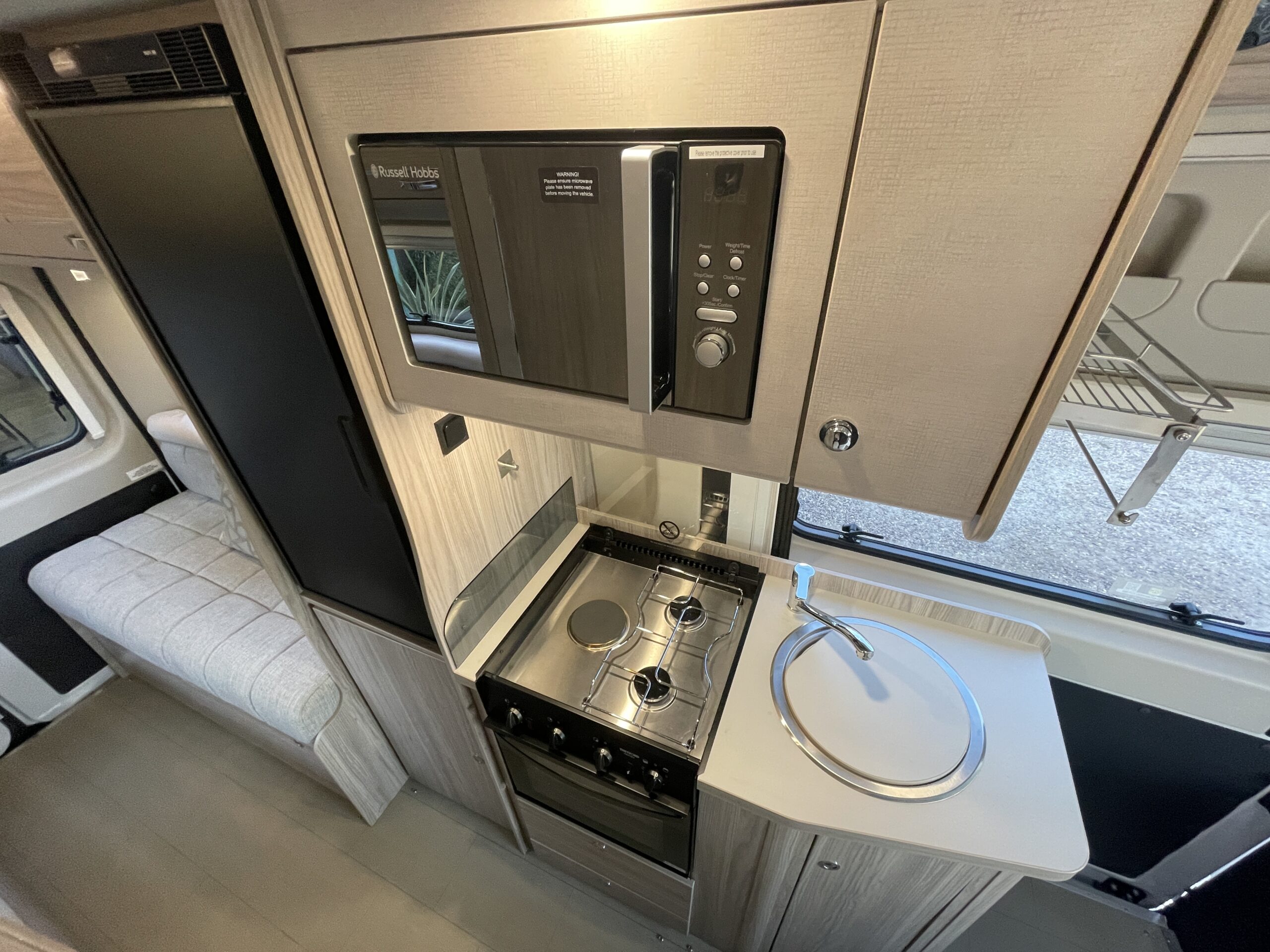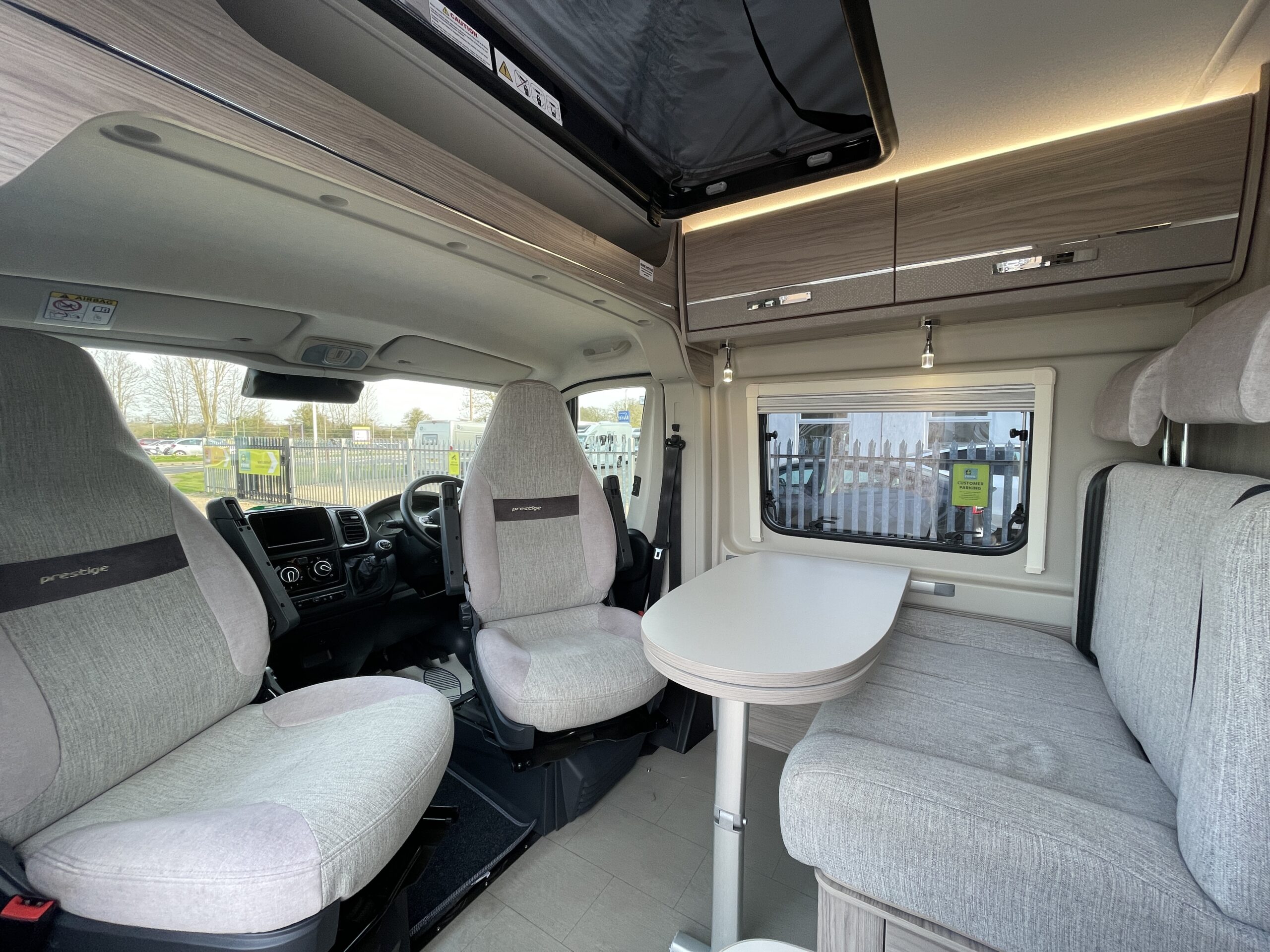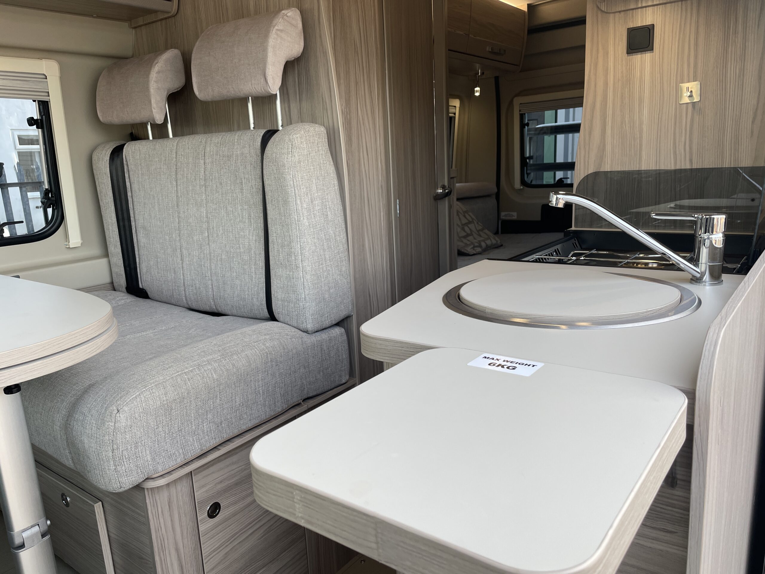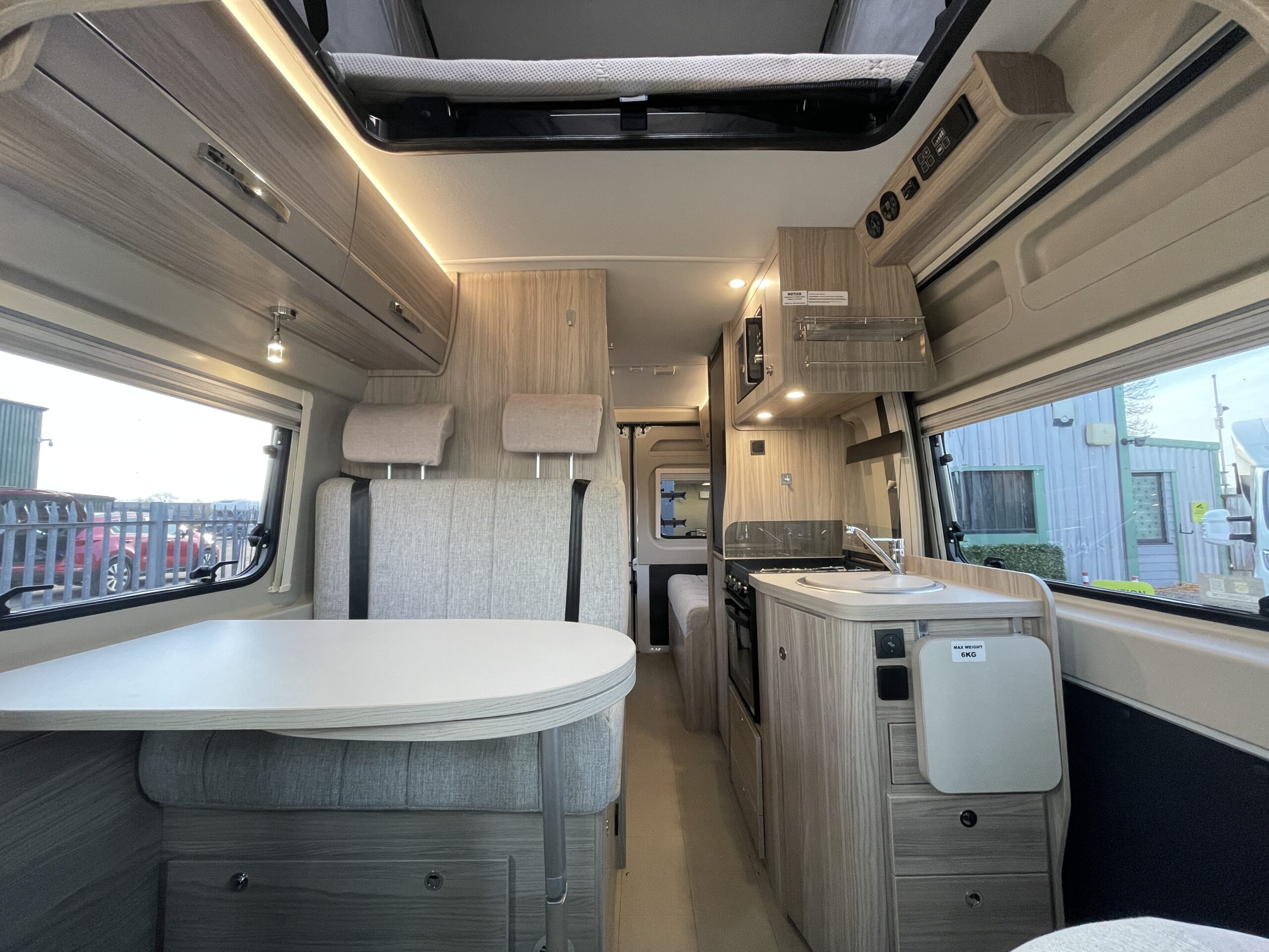 The layout comprises of an end lounge with two bench seats…Perfect for when you want to relax, dine or entertain; it easily make up into a large 2 berth in a matter of seconds. Moving forward you have a modern, light washroom with toilet, shower and modern sink unit. Opposite you have a well equipped kitchen which comprises of a 3 way fridge/freezer, 2 x gas hobs, oven/grill combi and sink. Towards the front of the van you have a dinette which can accommodate 4 people when the driver and passenger swivel chairs are turned; a perfect second area to relax in. Above you have an easy access pop top roof which when accessed by a ladder you have a huge 2 berth for a peaceful nights slumber.