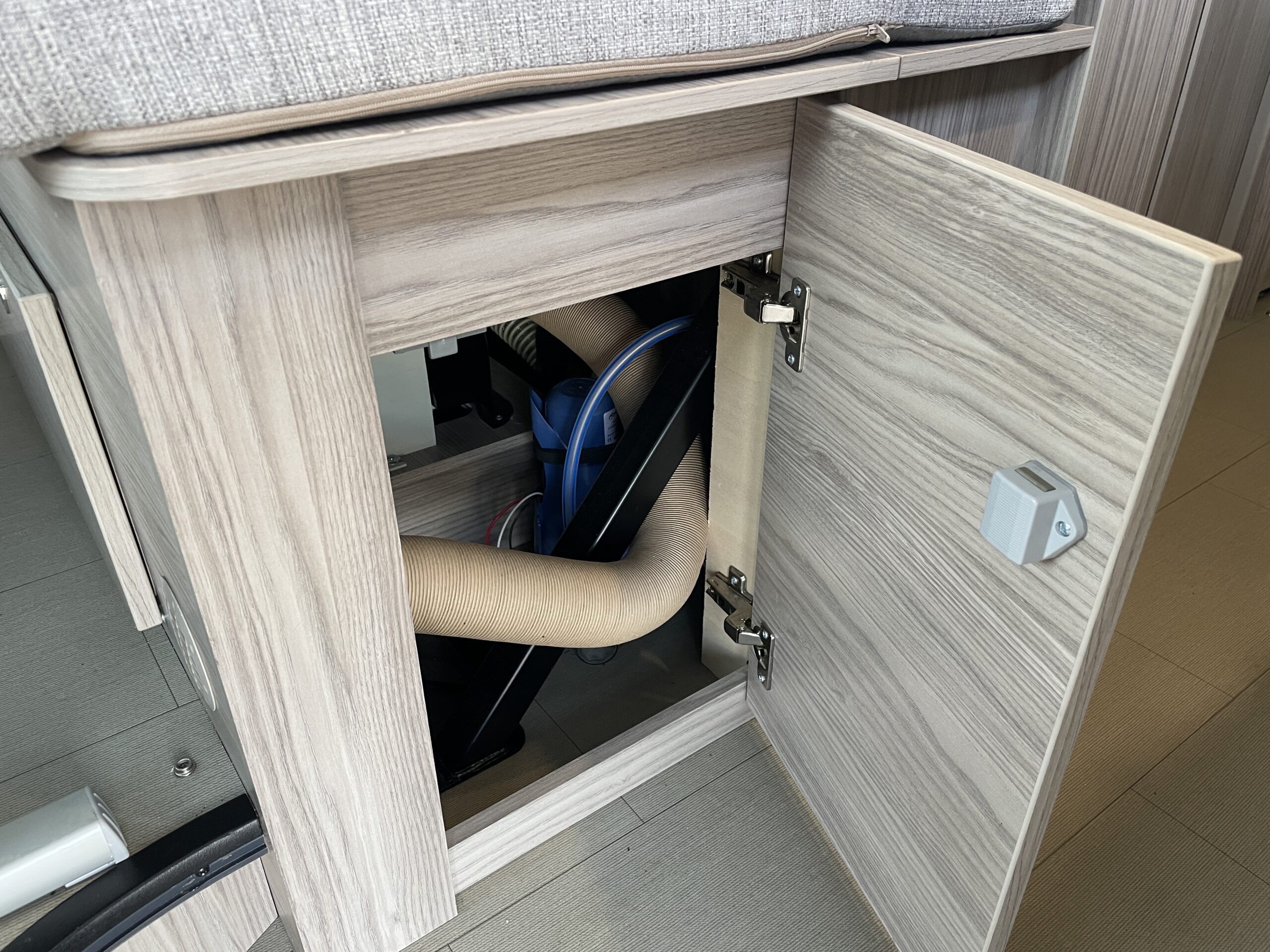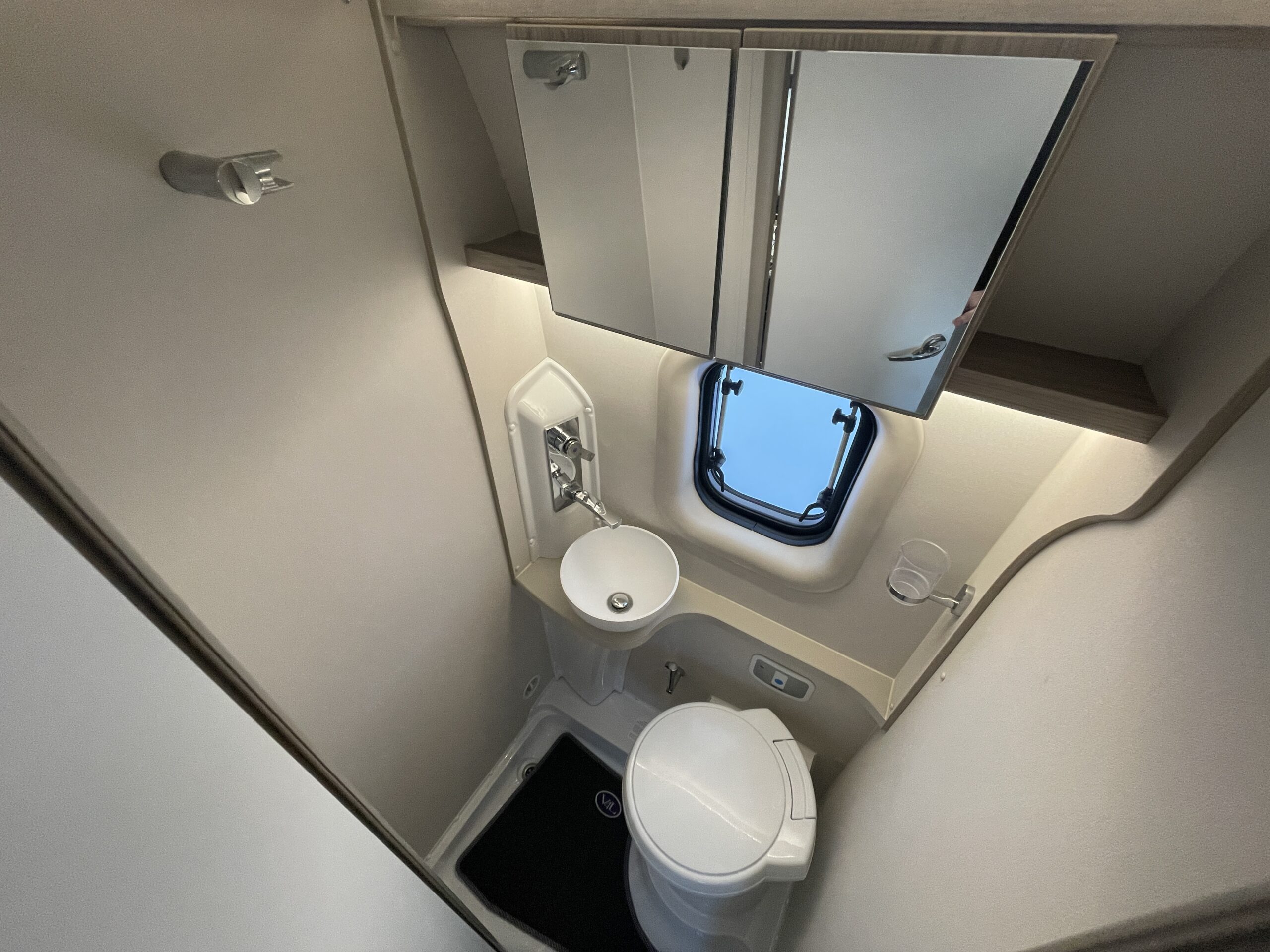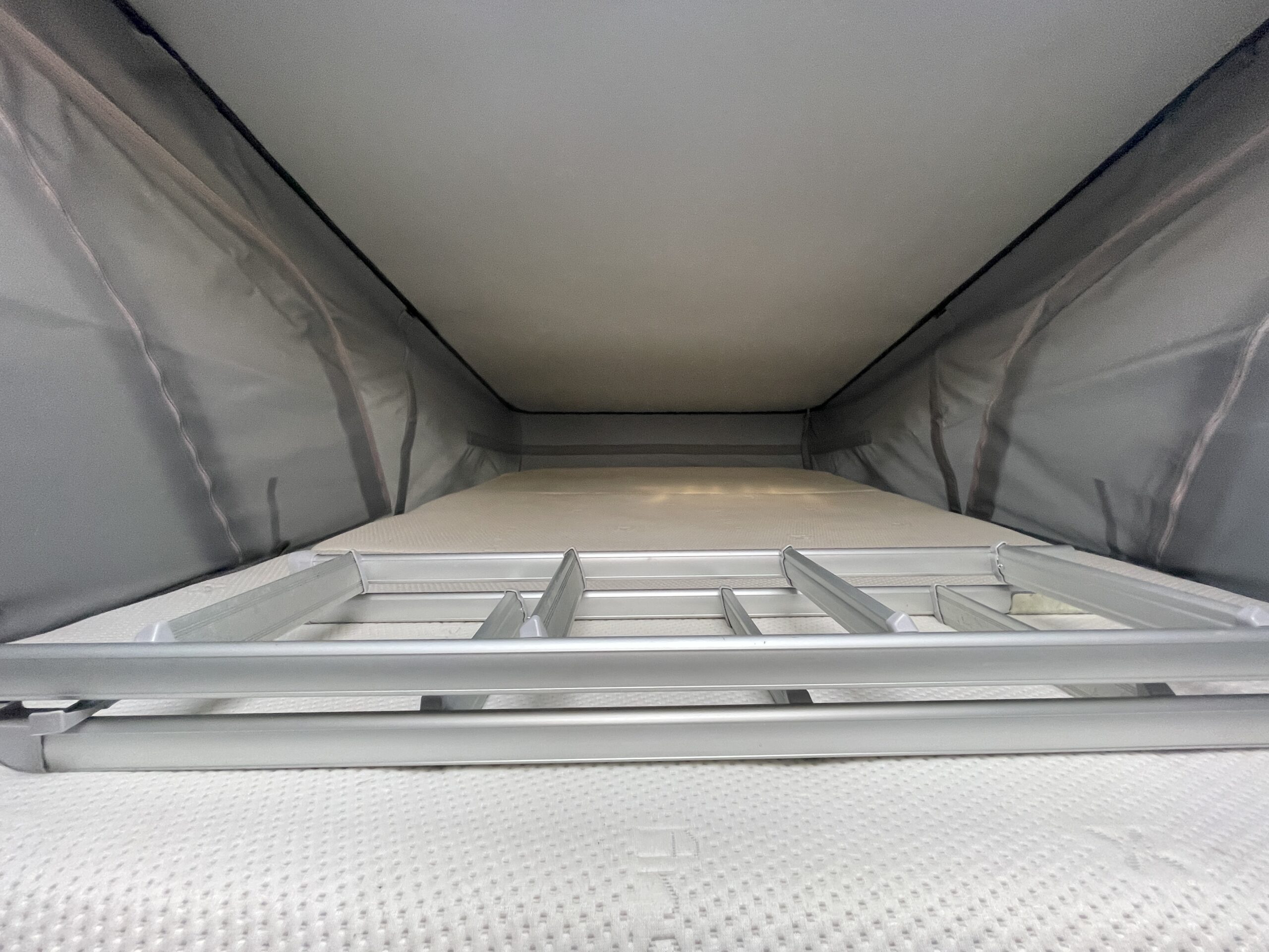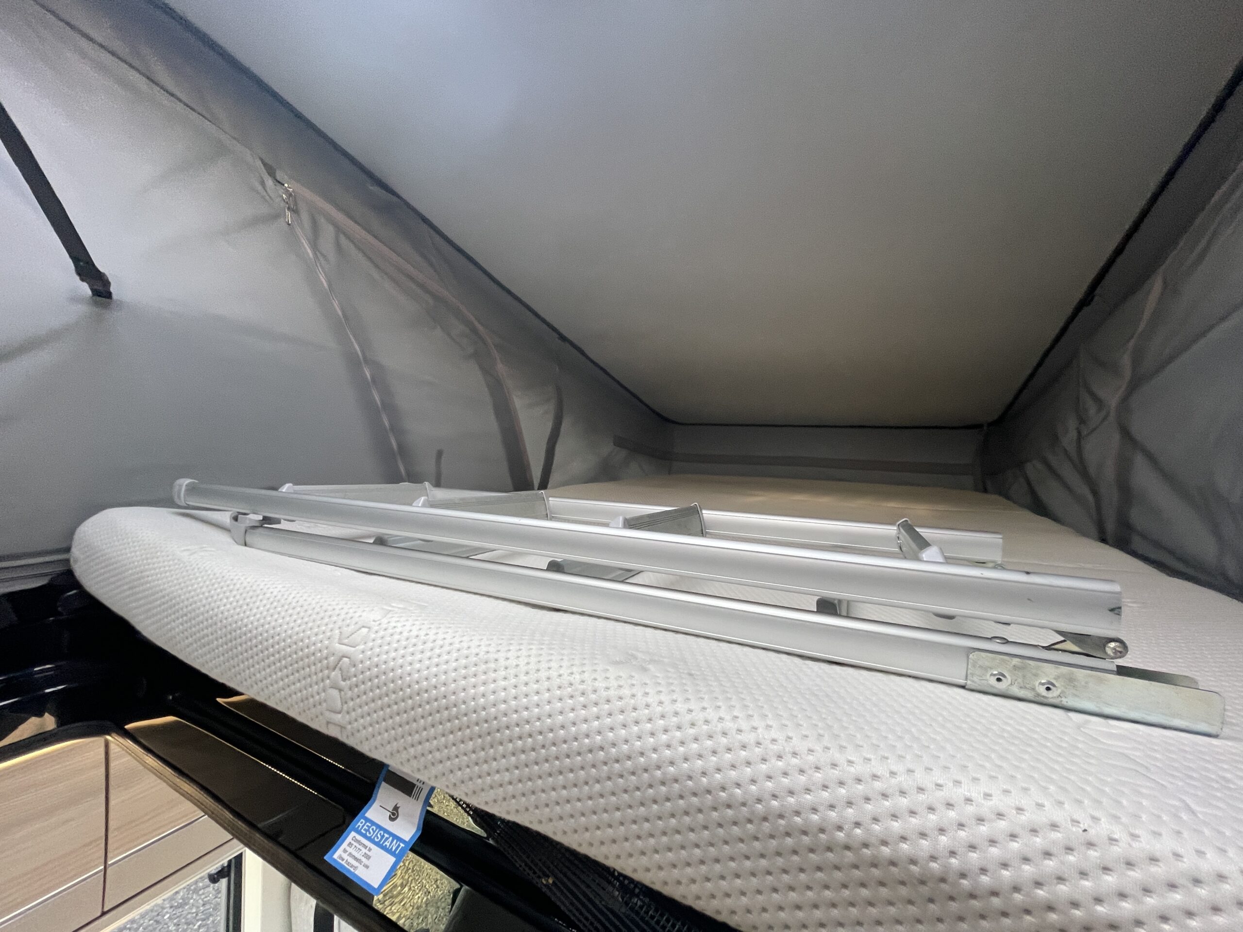 The layout comprises of an end lounge with two bench seats…Perfect for when you want to relax, dine or entertain; it easily make up into a large 2 berth in a matter of seconds. Moving forward you have a modern, light washroom with toilet, shower and modern sink unit. Opposite you have a well equipped kitchen which comprises of a 3 way fridge/freezer, 2 x gas hobs, oven/grill combi and sink. Towards the front of the van you have a dinette which can accommodate 4 people when the driver and passenger swivel chairs are turned; a perfect second area to relax in. Above you have an easy access pop top roof which when accessed by a ladder you have a huge 2 berth for a peaceful nights slumber.