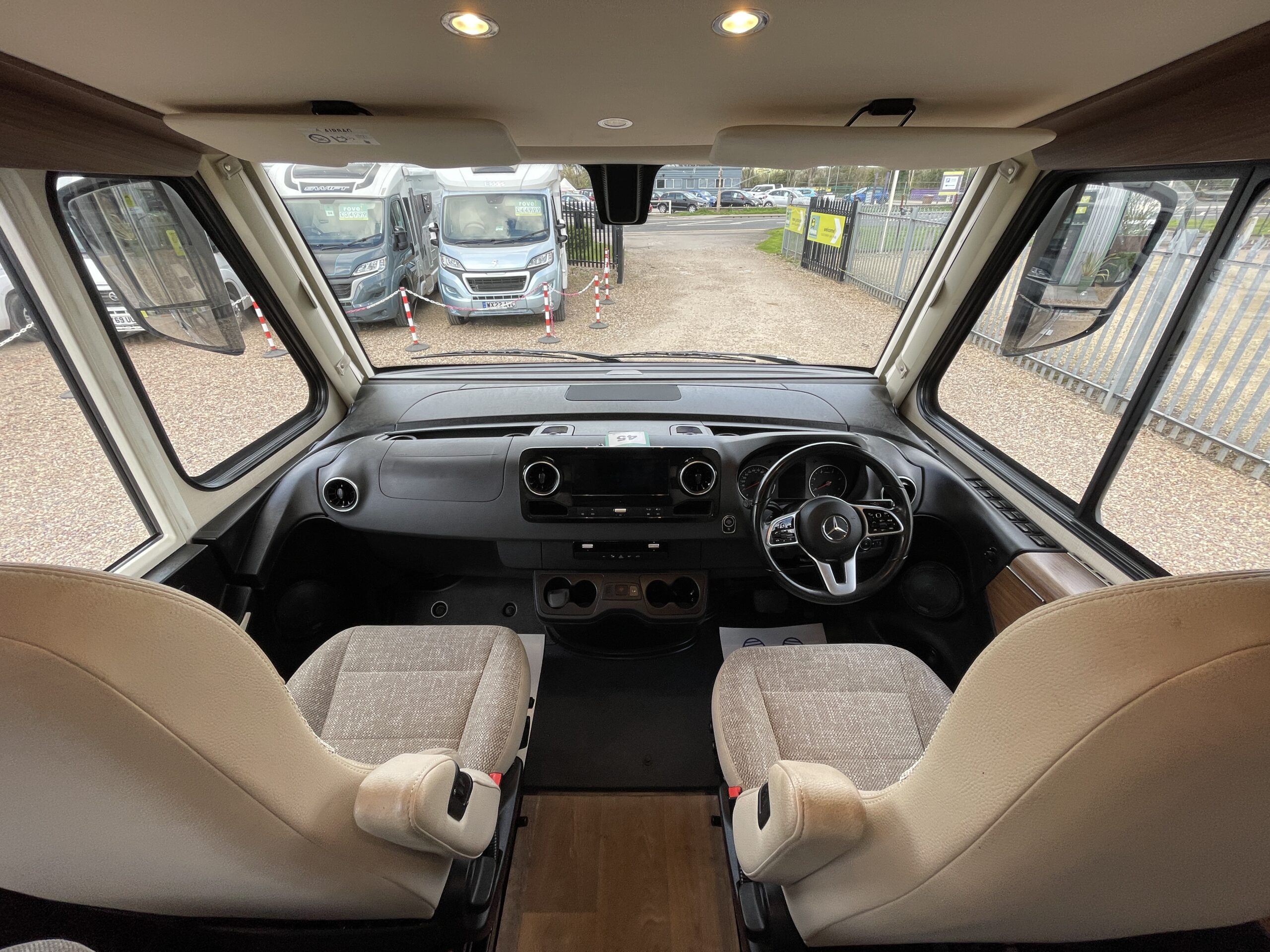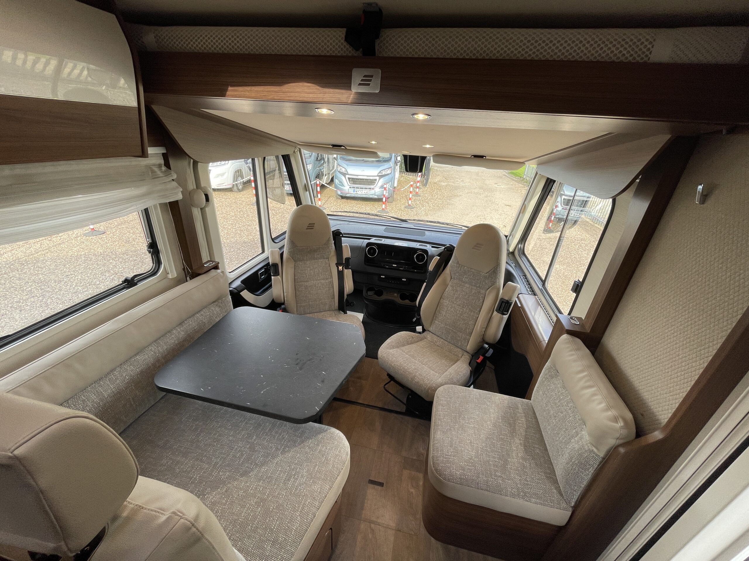 The front lounge offers a comfortable, sociable space with panoramic views, perfect for dining or relaxing after a day on the road.