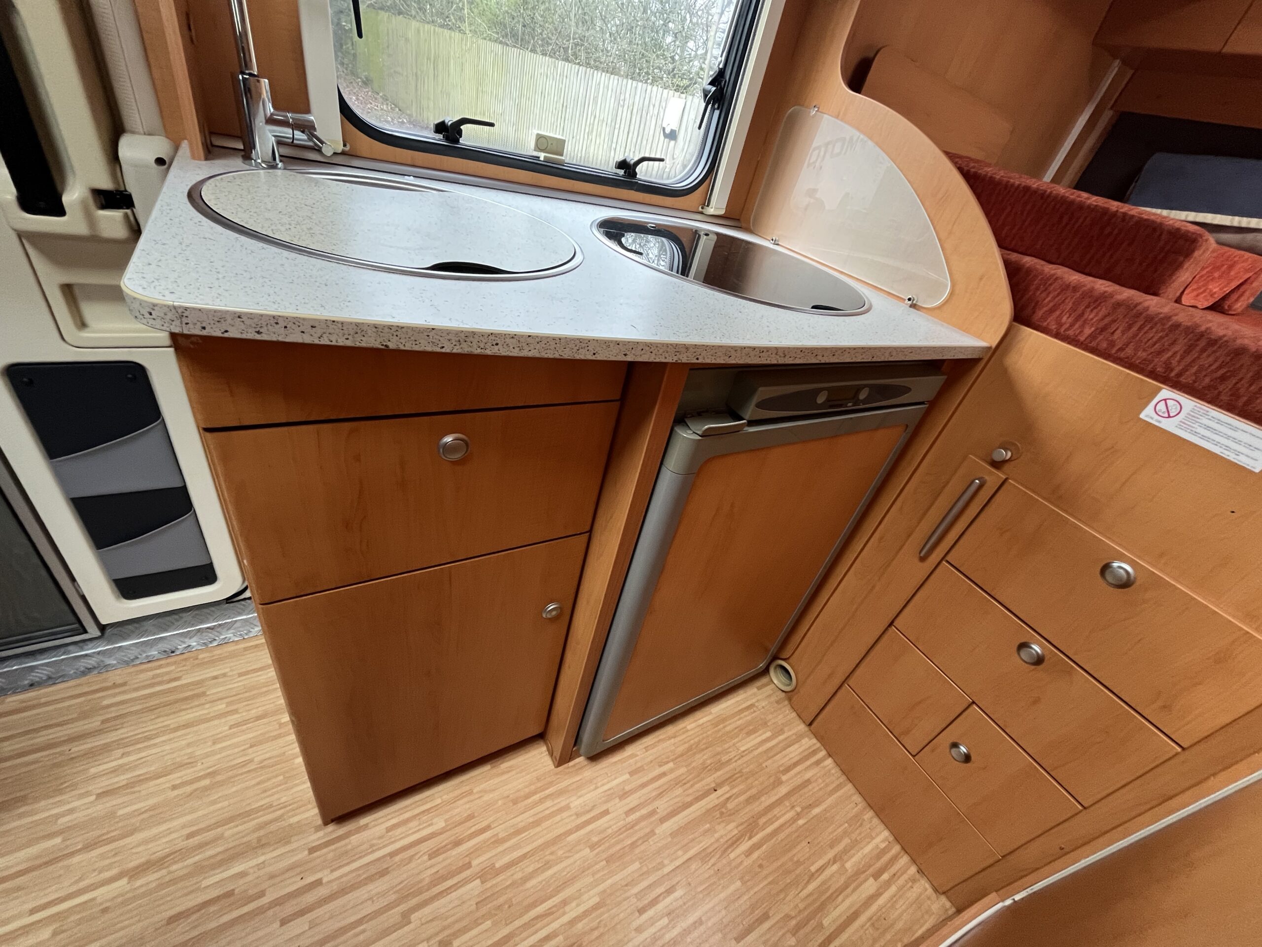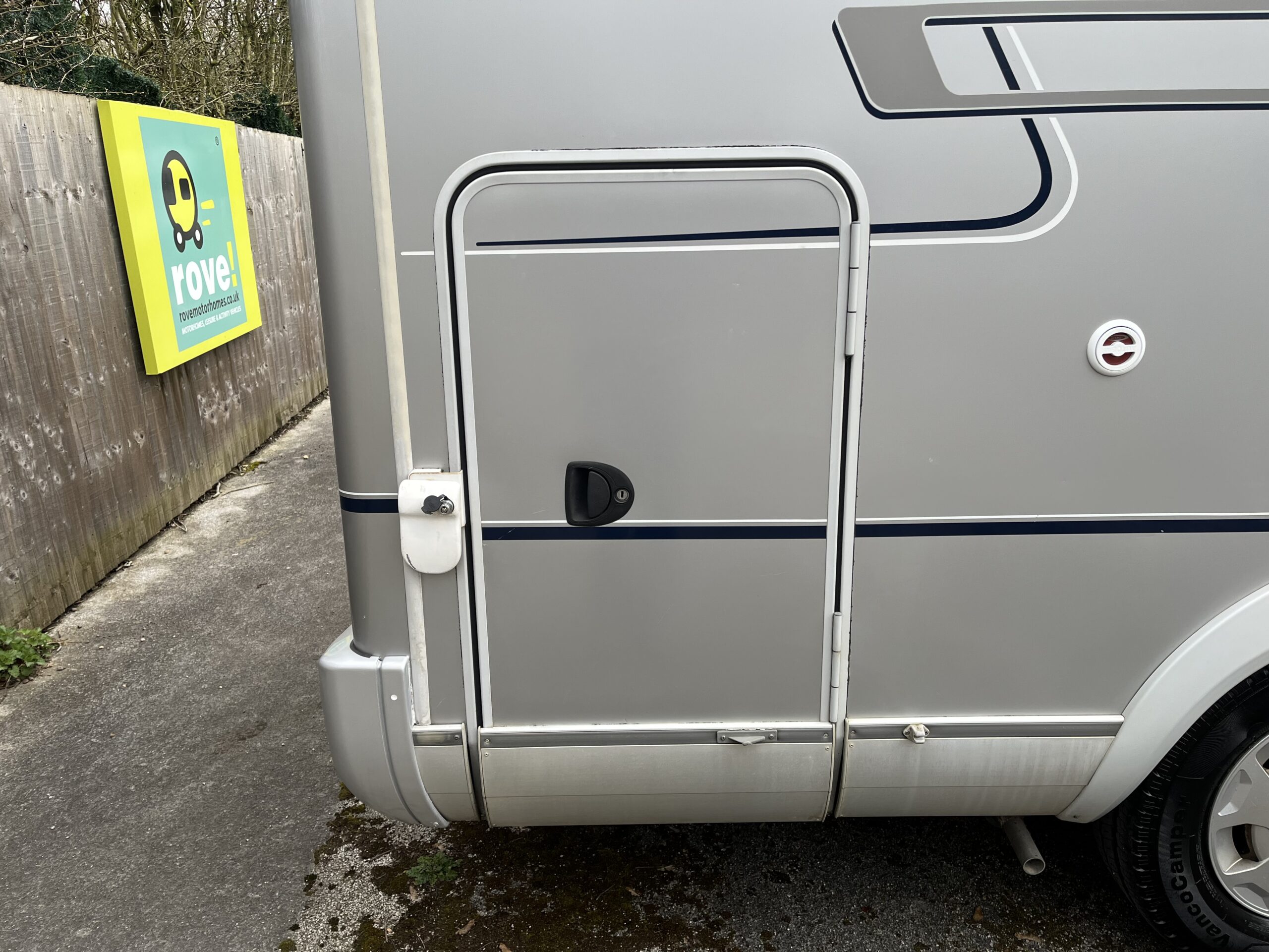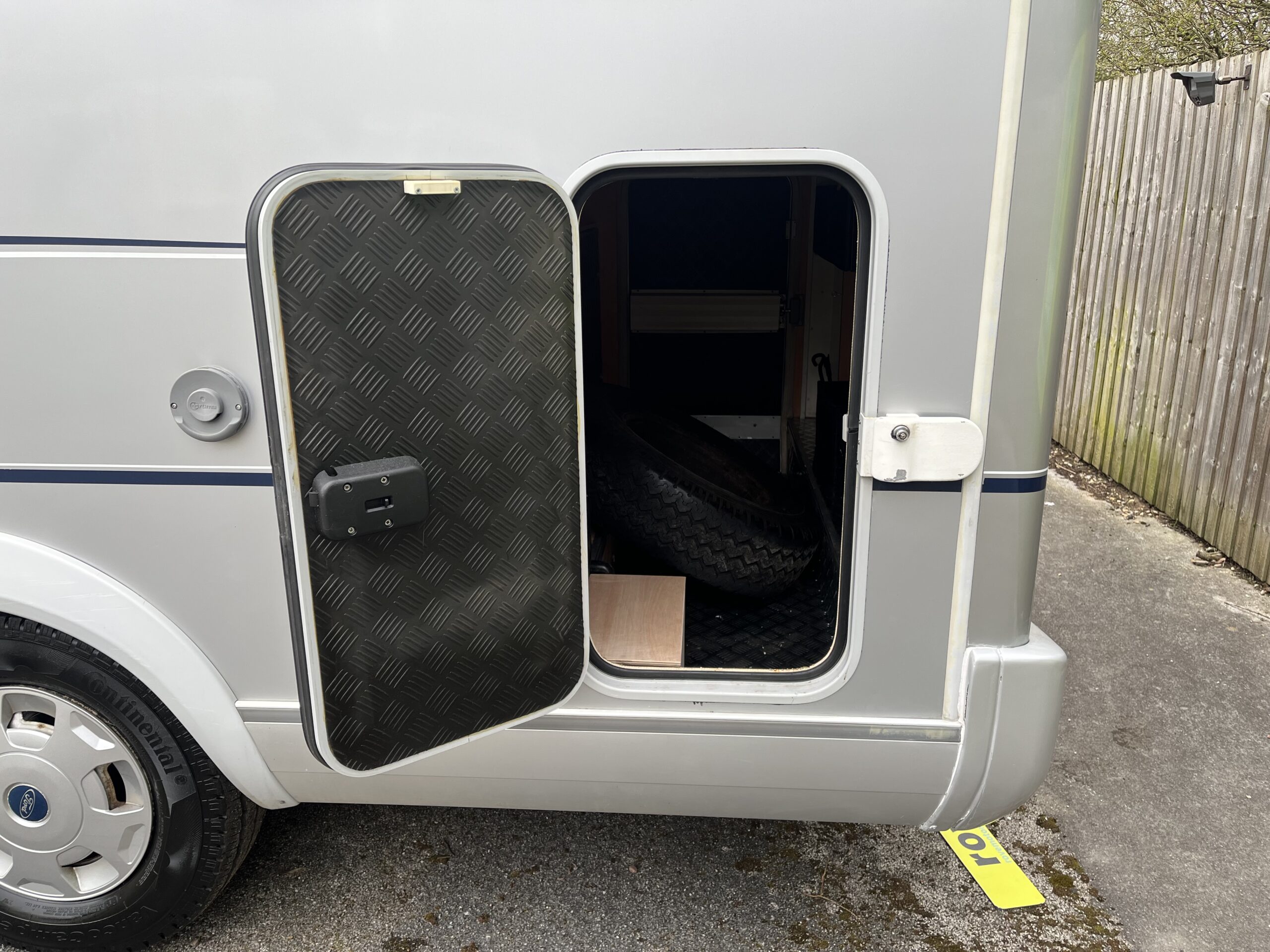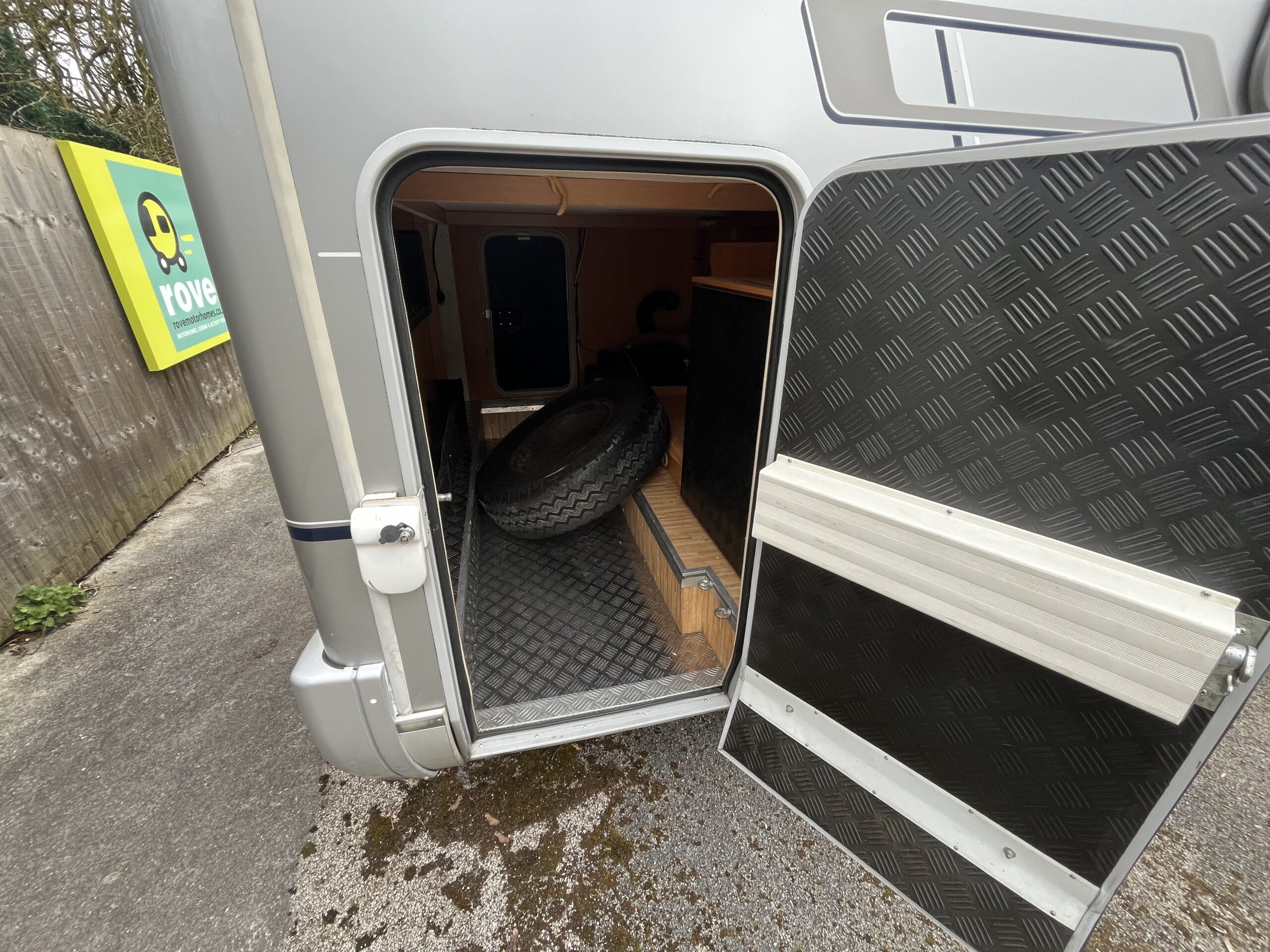 The interior consists of a transverse fixed double bed at the rear, kitchen area with 3 burner hob, sink with mixer tap and fridge with freezer compartment. The front lounge / dining area has two front facing seats complete with seat belts. The two cab seats swivel to allow four to sit at the dining table with an additional swing out section. The washroom consists of a Thetford cassette toilet, shower, sink, mirror and storage cupboard. The sink is swivelled above the cassette toilet area to allow the use of the shower. There is a Truma Blown air system fitted and a Truma water heater. Fly screens and blinds are fitted to all windows. The large rear garage has plenty of storage space and is where the spare wheel and gas bottles are located. There is an awning light fitted above the entrance door and the electric entrance step is fully retractable.