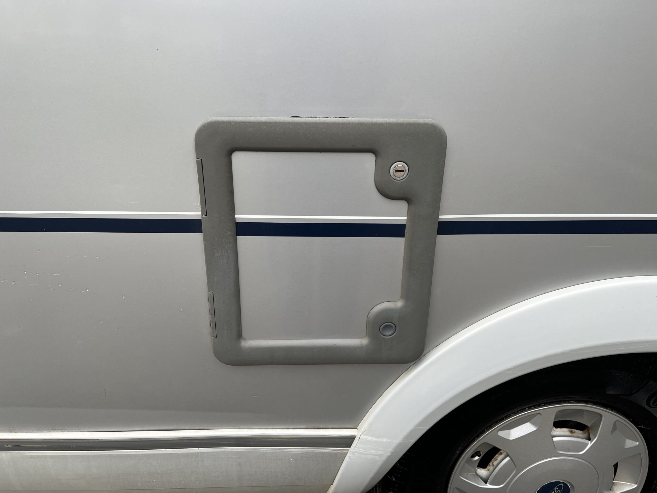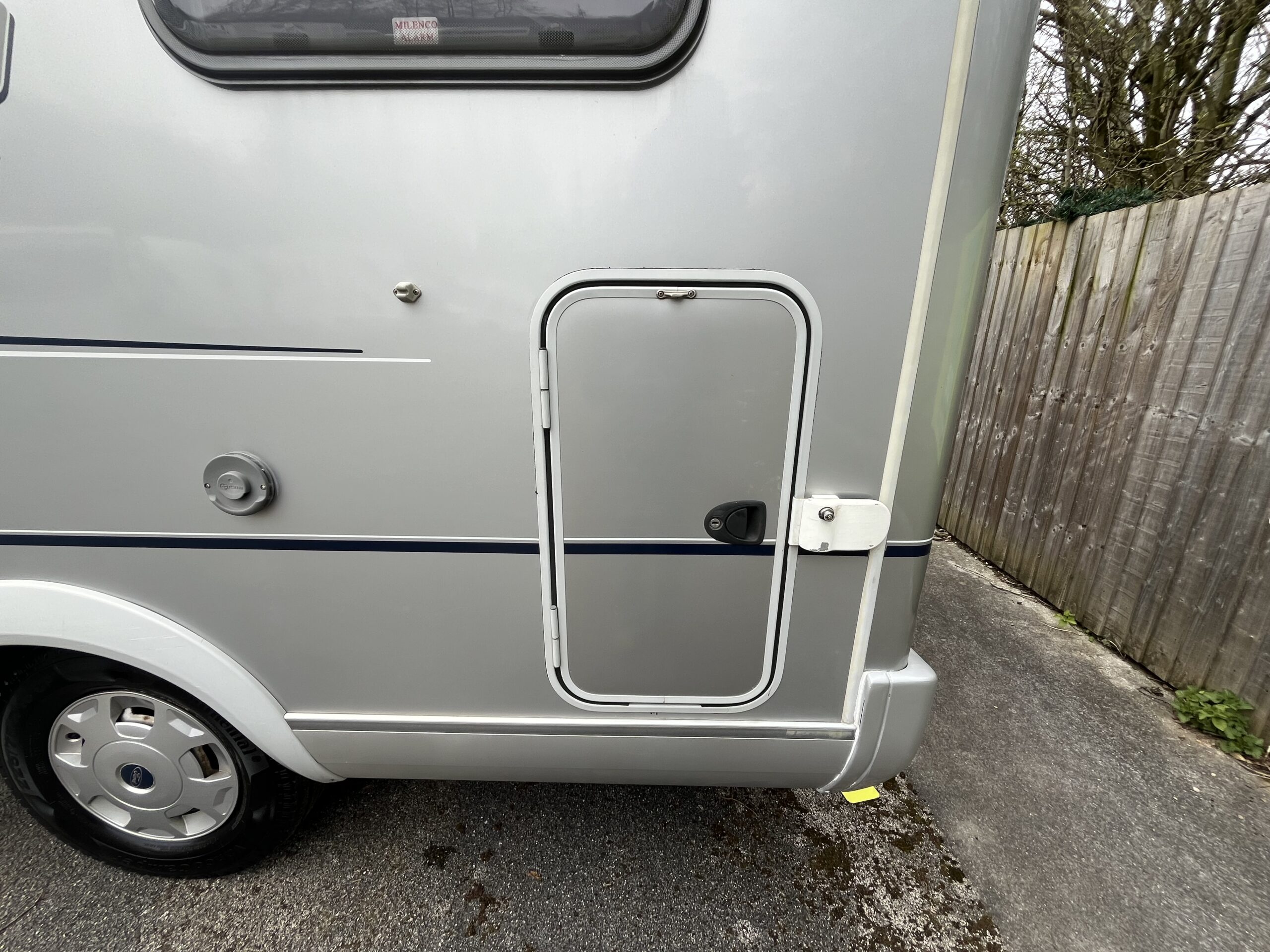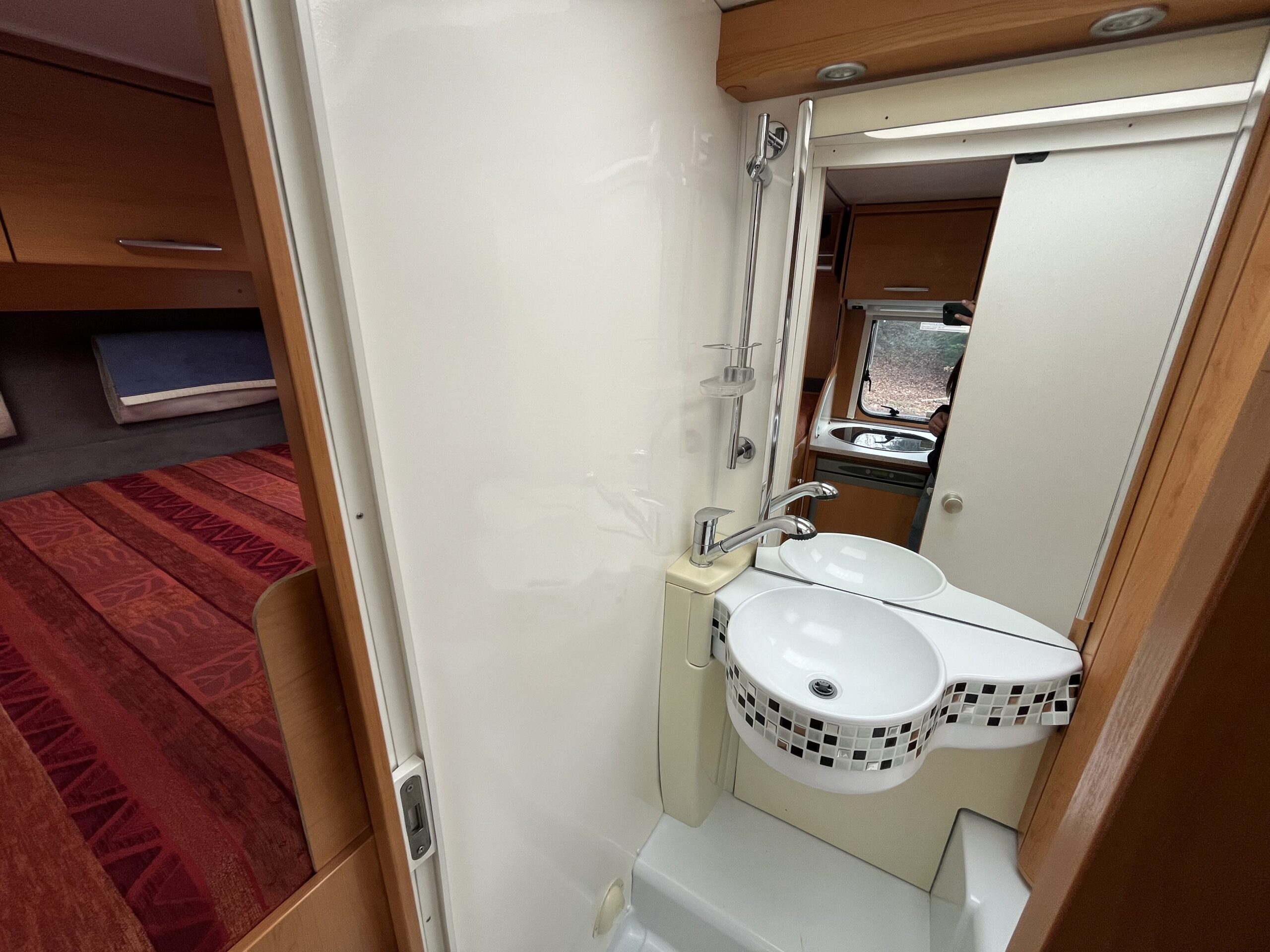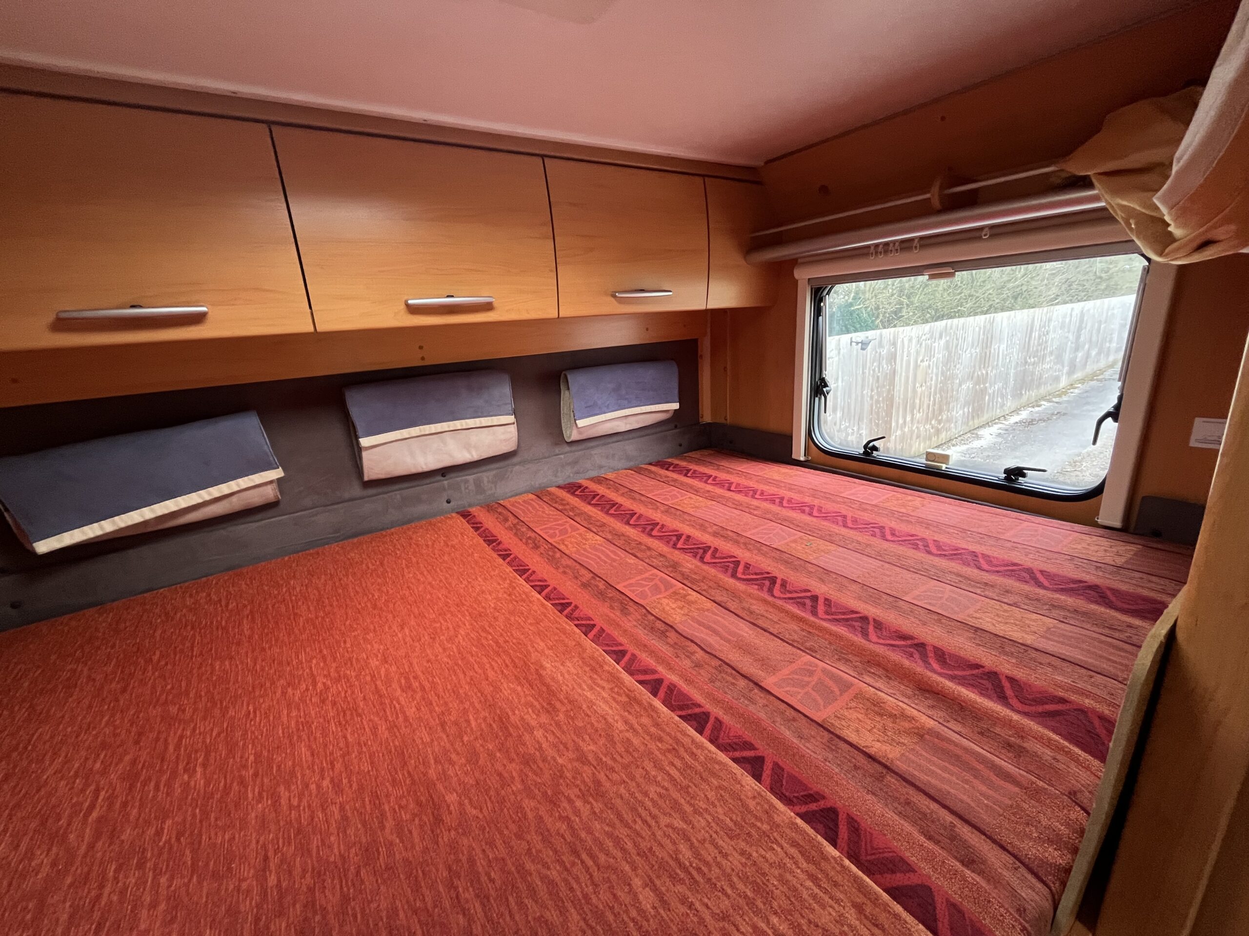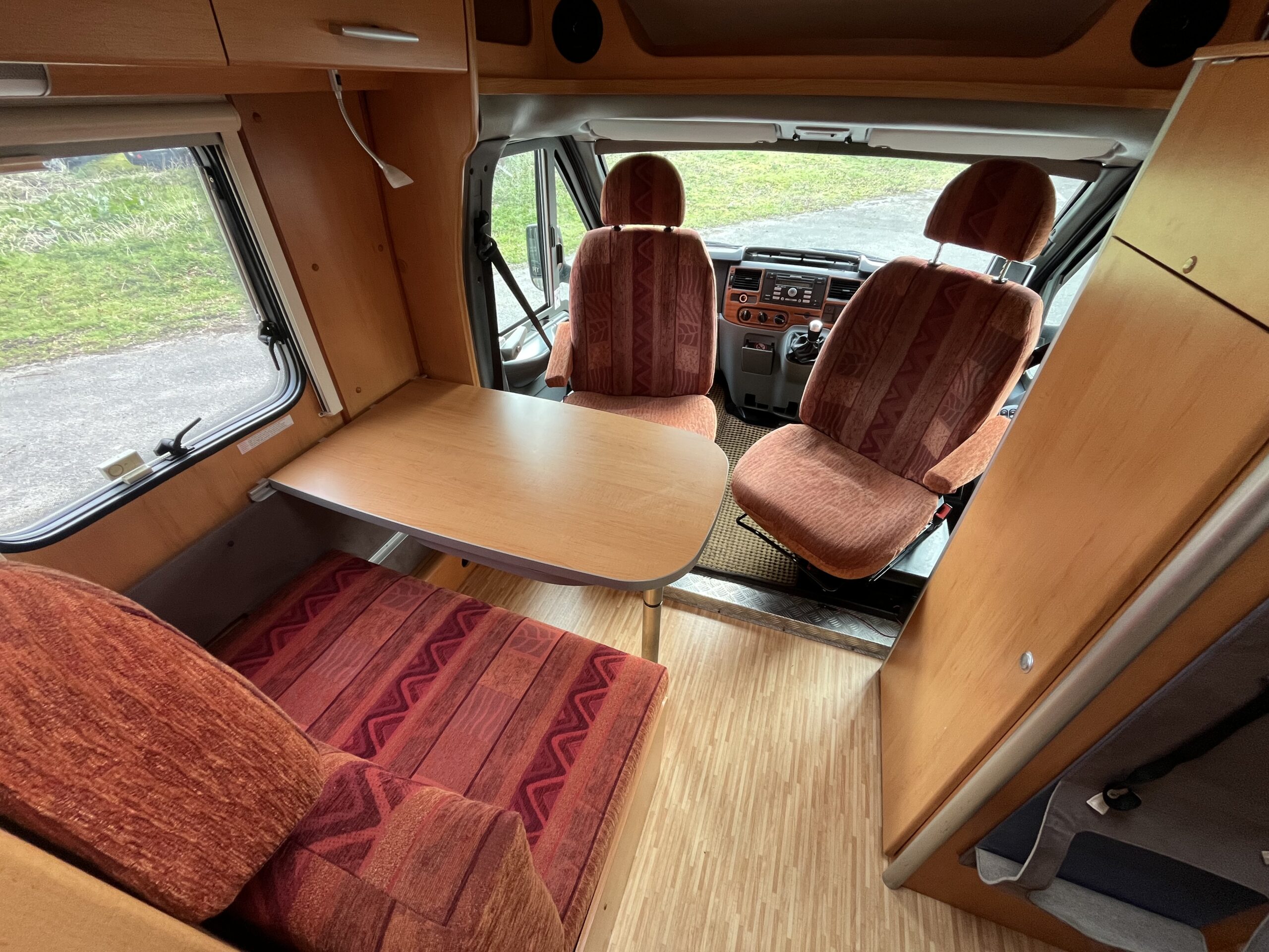 The interior consists of a transverse fixed double bed at the rear, kitchen area with 3 burner hob, sink with mixer tap and fridge with freezer compartment. The front lounge / dining area has two front facing seats complete with seat belts. The two cab seats swivel to allow four to sit at the dining table with an additional swing out section. The washroom consists of a Thetford cassette toilet, shower, sink, mirror and storage cupboard. The sink is swivelled above the cassette toilet area to allow the use of the shower. There is a Truma Blown air system fitted and a Truma water heater. Fly screens and blinds are fitted to all windows. The large rear garage has plenty of storage space and is where the spare wheel and gas bottles are located. There is an awning light fitted above the entrance door and the electric entrance step is fully retractable.