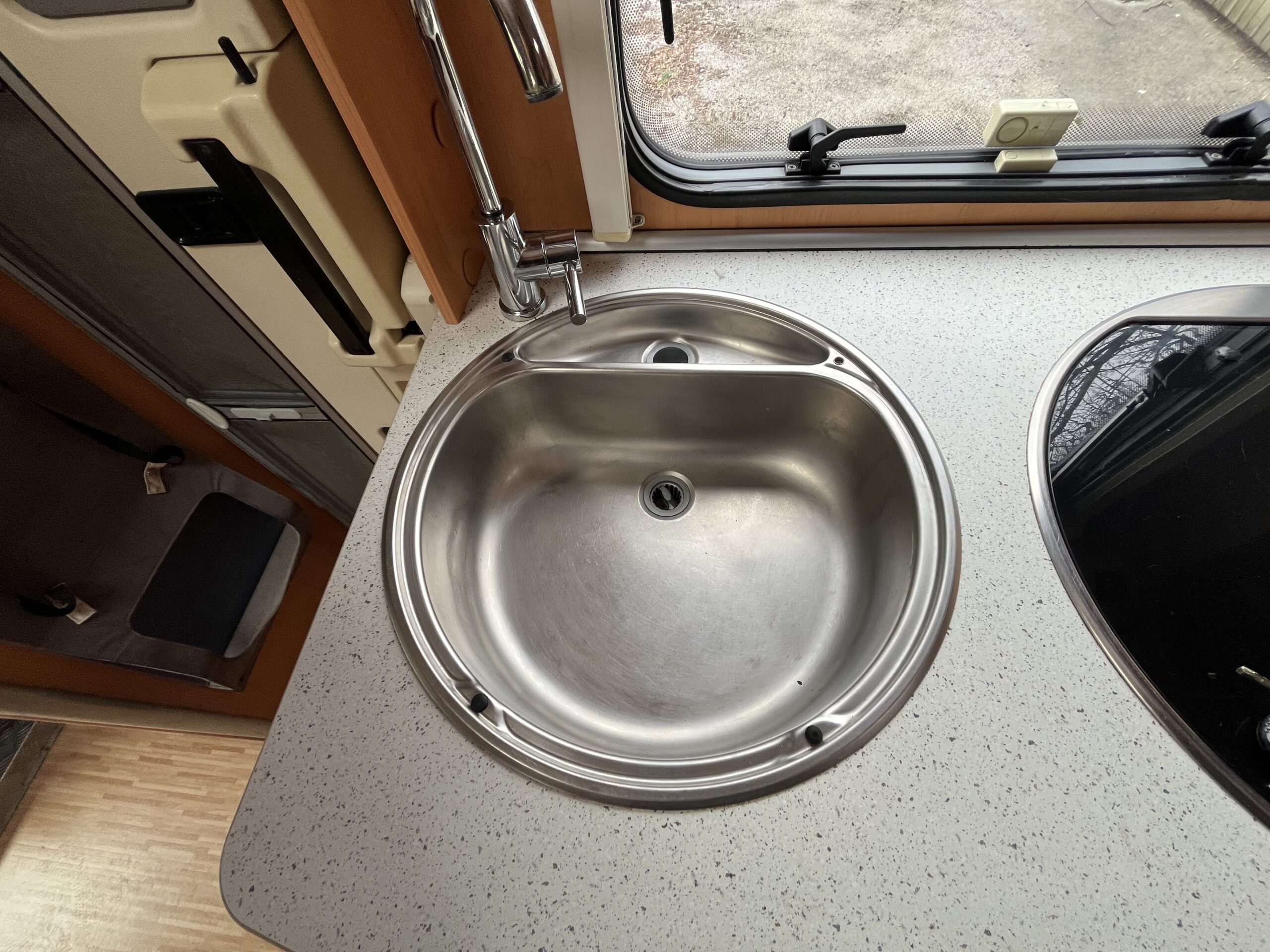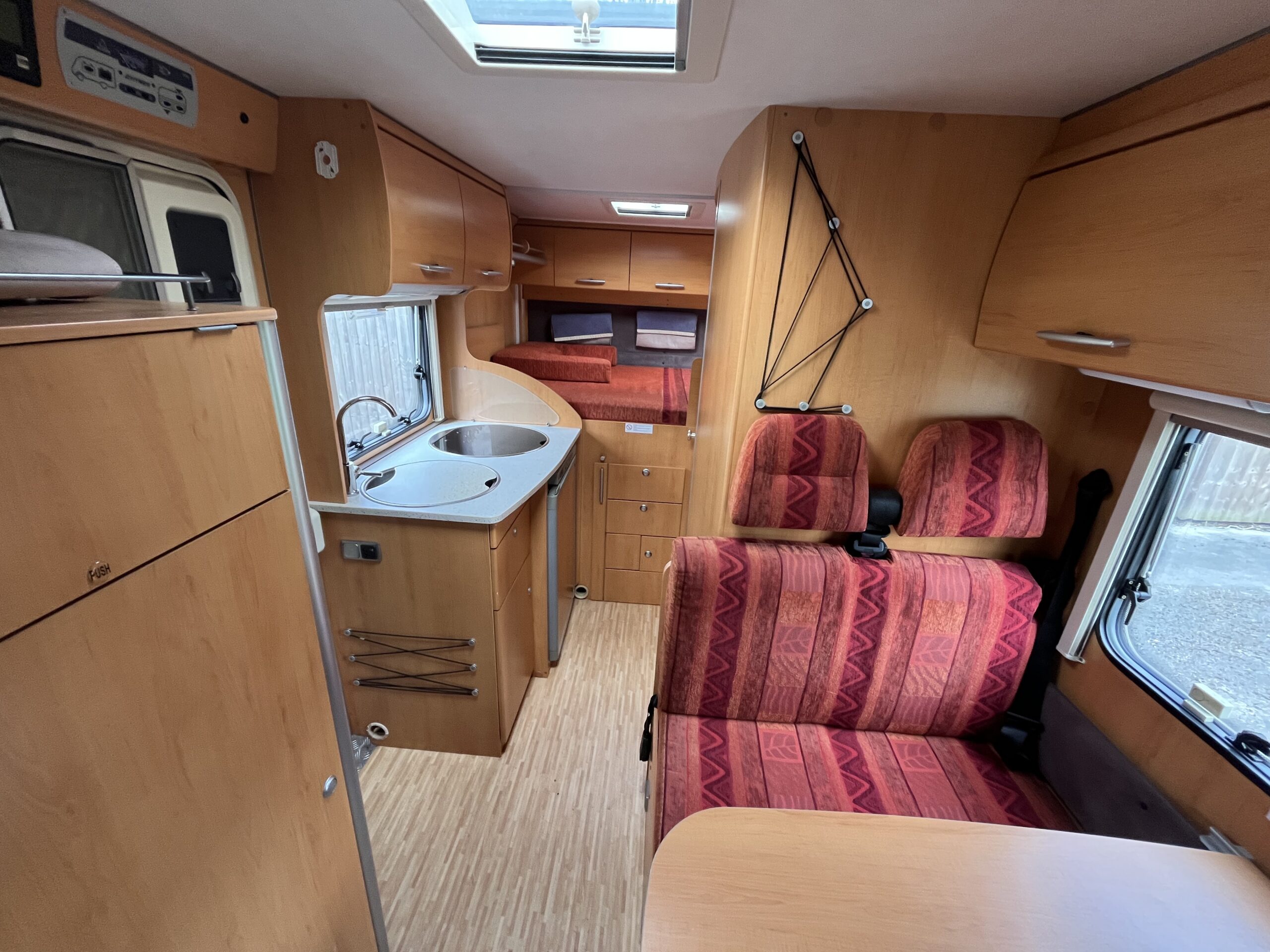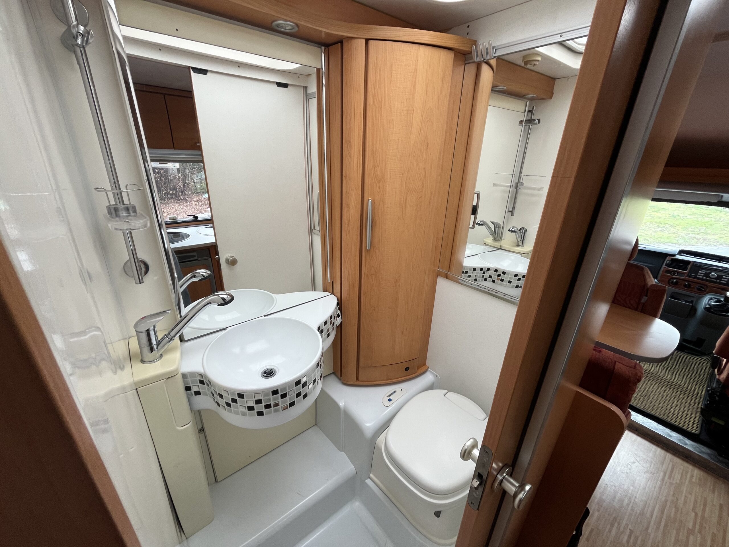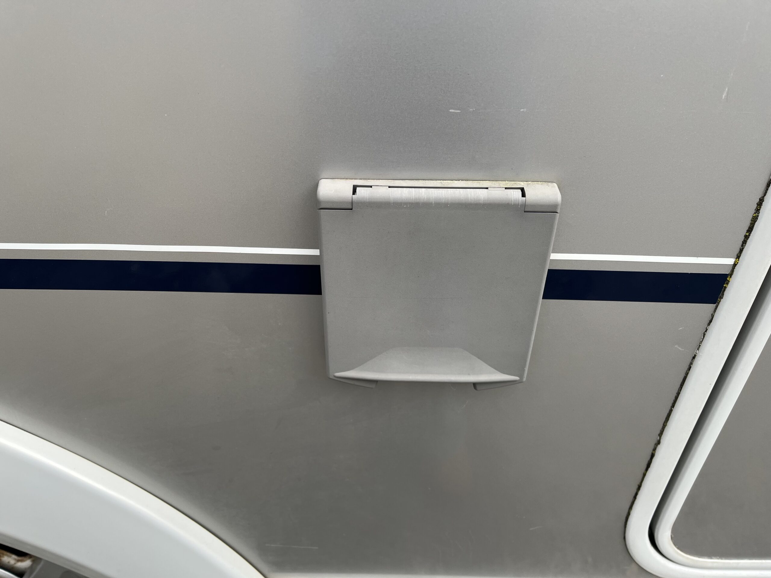 The interior consists of a transverse fixed double bed at the rear, kitchen area with 3 burner hob, sink with mixer tap and fridge with freezer compartment. The front lounge / dining area has two front facing seats complete with seat belts. The two cab seats swivel to allow four to sit at the dining table with an additional swing out section. The washroom consists of a Thetford cassette toilet, shower, sink, mirror and storage cupboard. The sink is swivelled above the cassette toilet area to allow the use of the shower. There is a Truma Blown air system fitted and a Truma water heater. Fly screens and blinds are fitted to all windows. The large rear garage has plenty of storage space and is where the spare wheel and gas bottles are located. There is an awning light fitted above the entrance door and the electric entrance step is fully retractable.