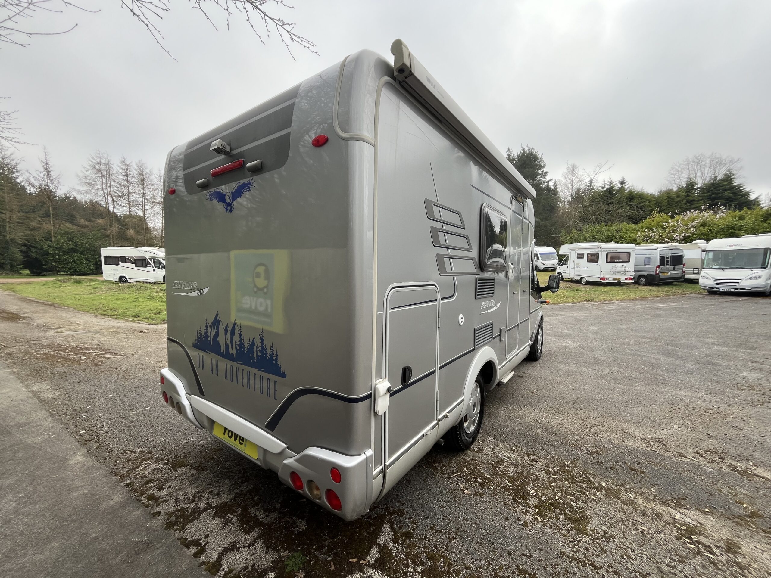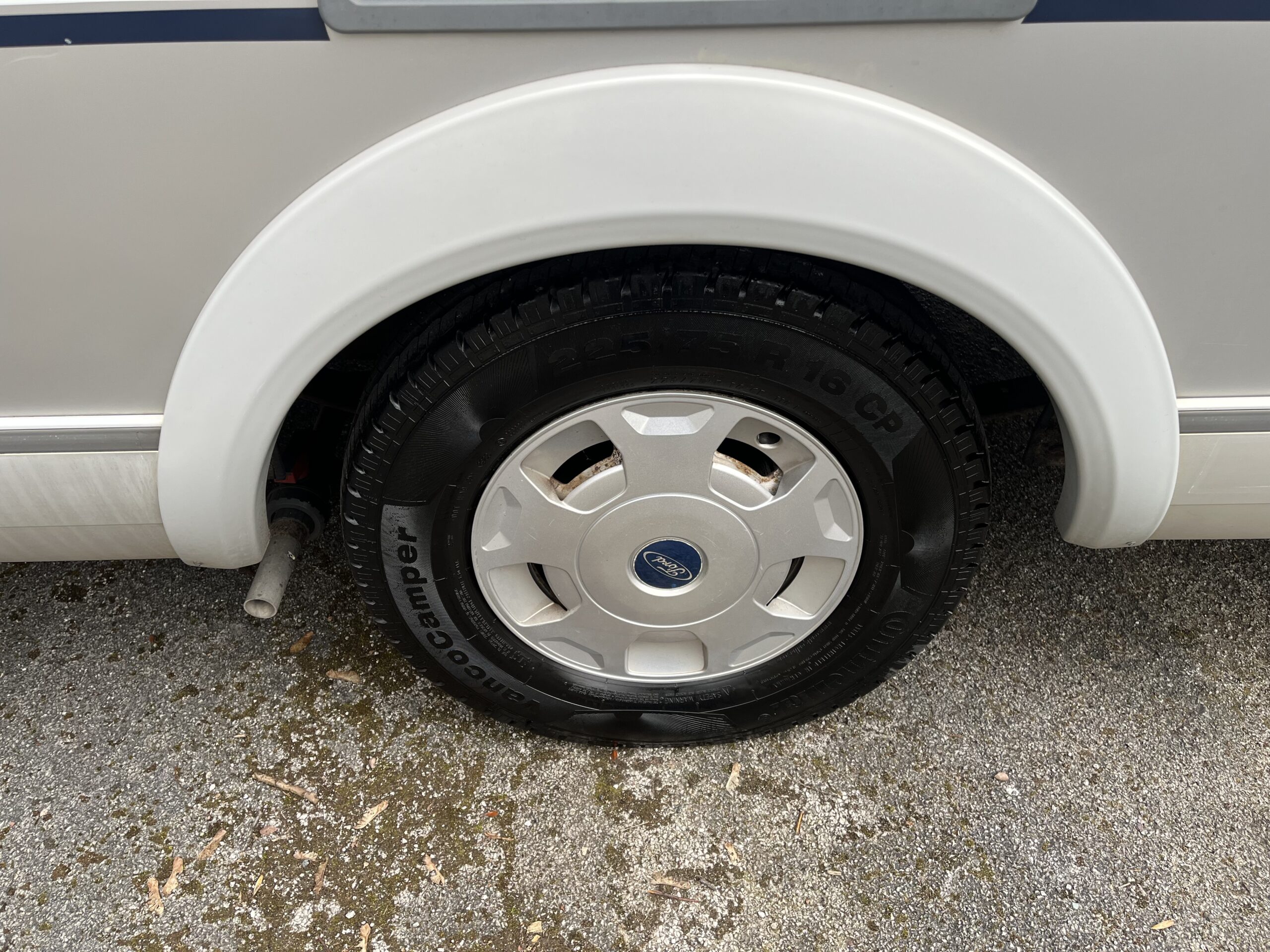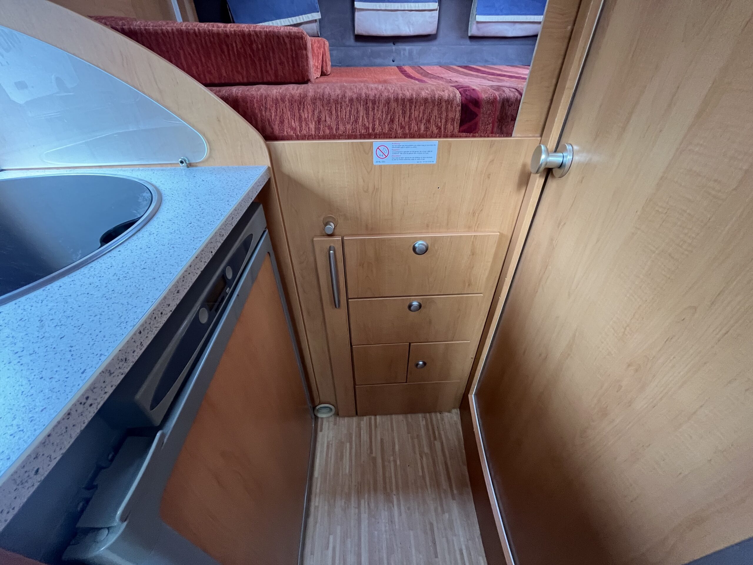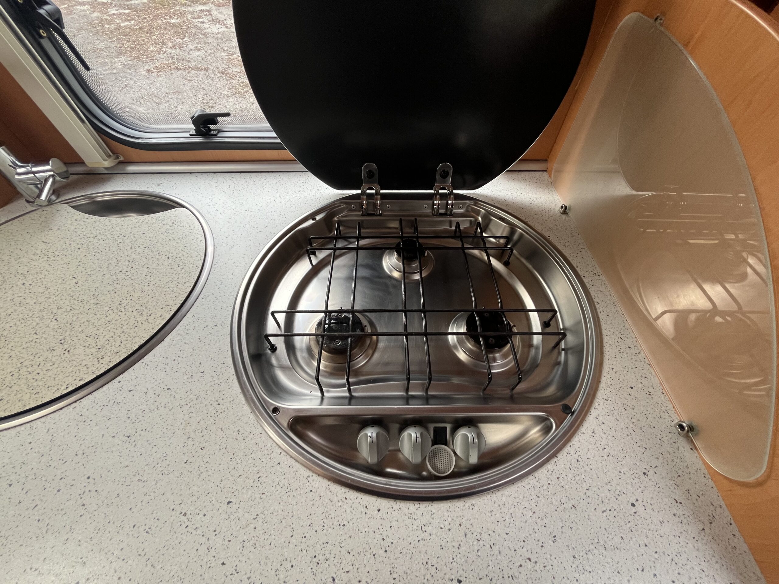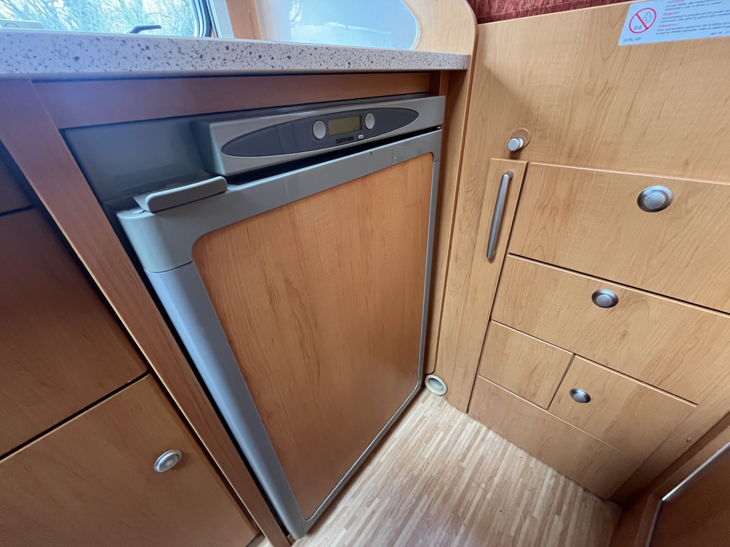 The interior consists of a transverse fixed double bed at the rear, kitchen area with 3 burner hob, sink with mixer tap and fridge with freezer compartment. The front lounge / dining area has two front facing seats complete with seat belts. The two cab seats swivel to allow four to sit at the dining table with an additional swing out section. The washroom consists of a Thetford cassette toilet, shower, sink, mirror and storage cupboard. The sink is swivelled above the cassette toilet area to allow the use of the shower. There is a Truma Blown air system fitted and a Truma water heater. Fly screens and blinds are fitted to all windows. The large rear garage has plenty of storage space and is where the spare wheel and gas bottles are located. There is an awning light fitted above the entrance door and the electric entrance step is fully retractable.