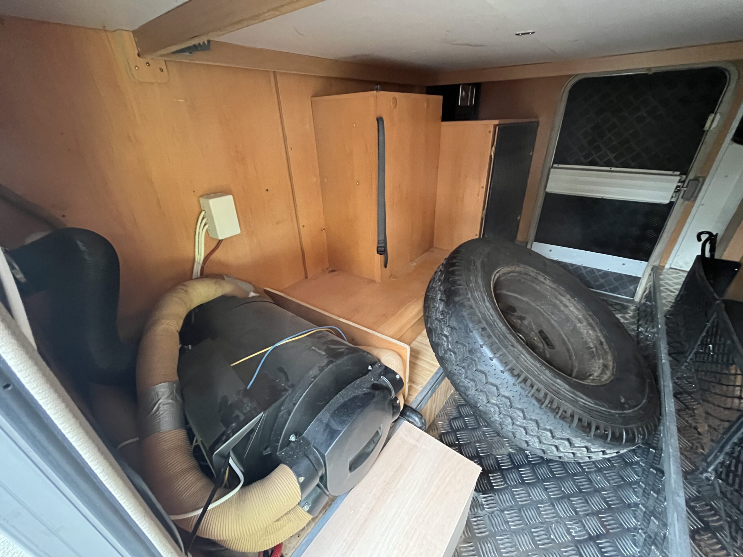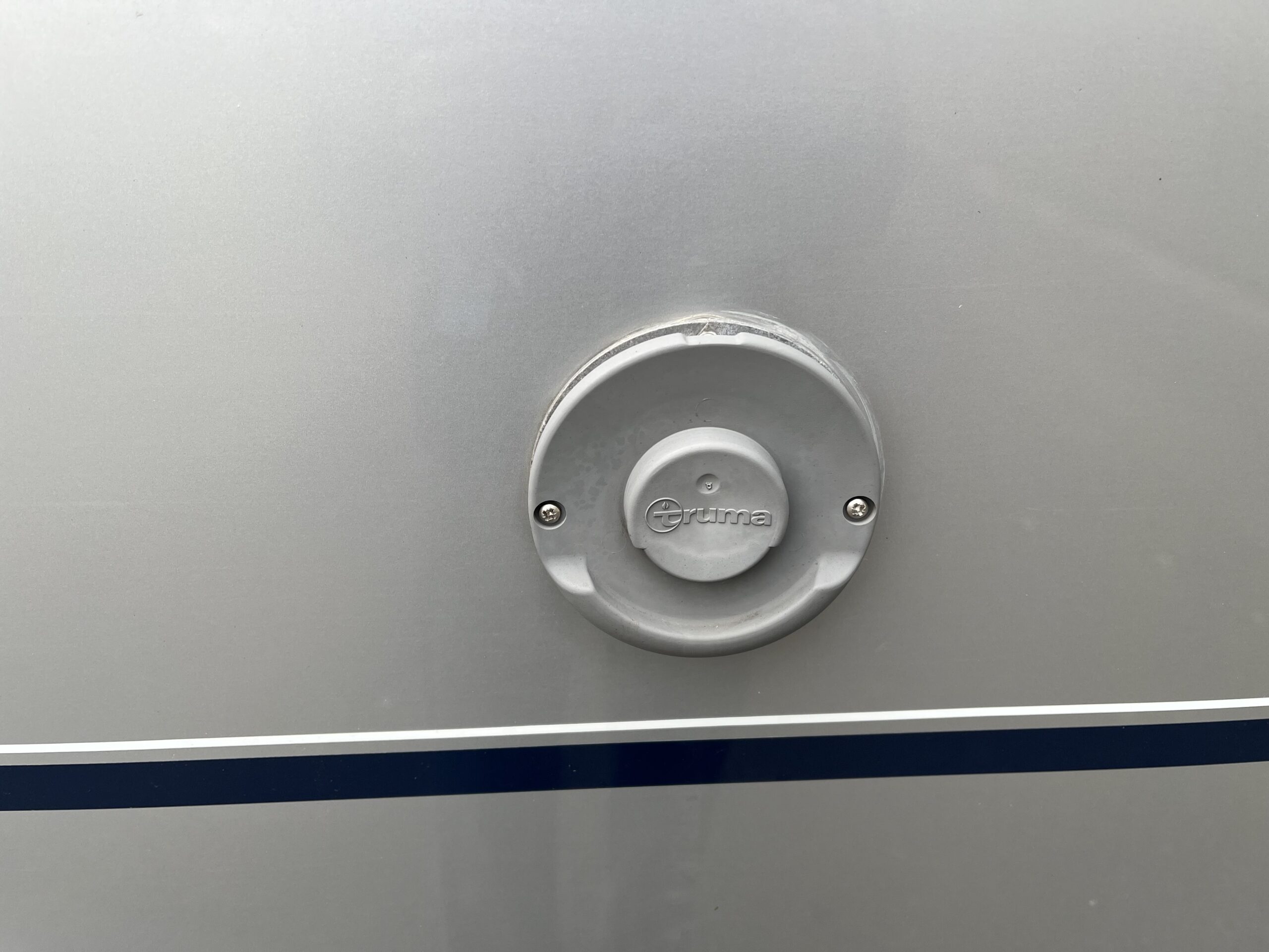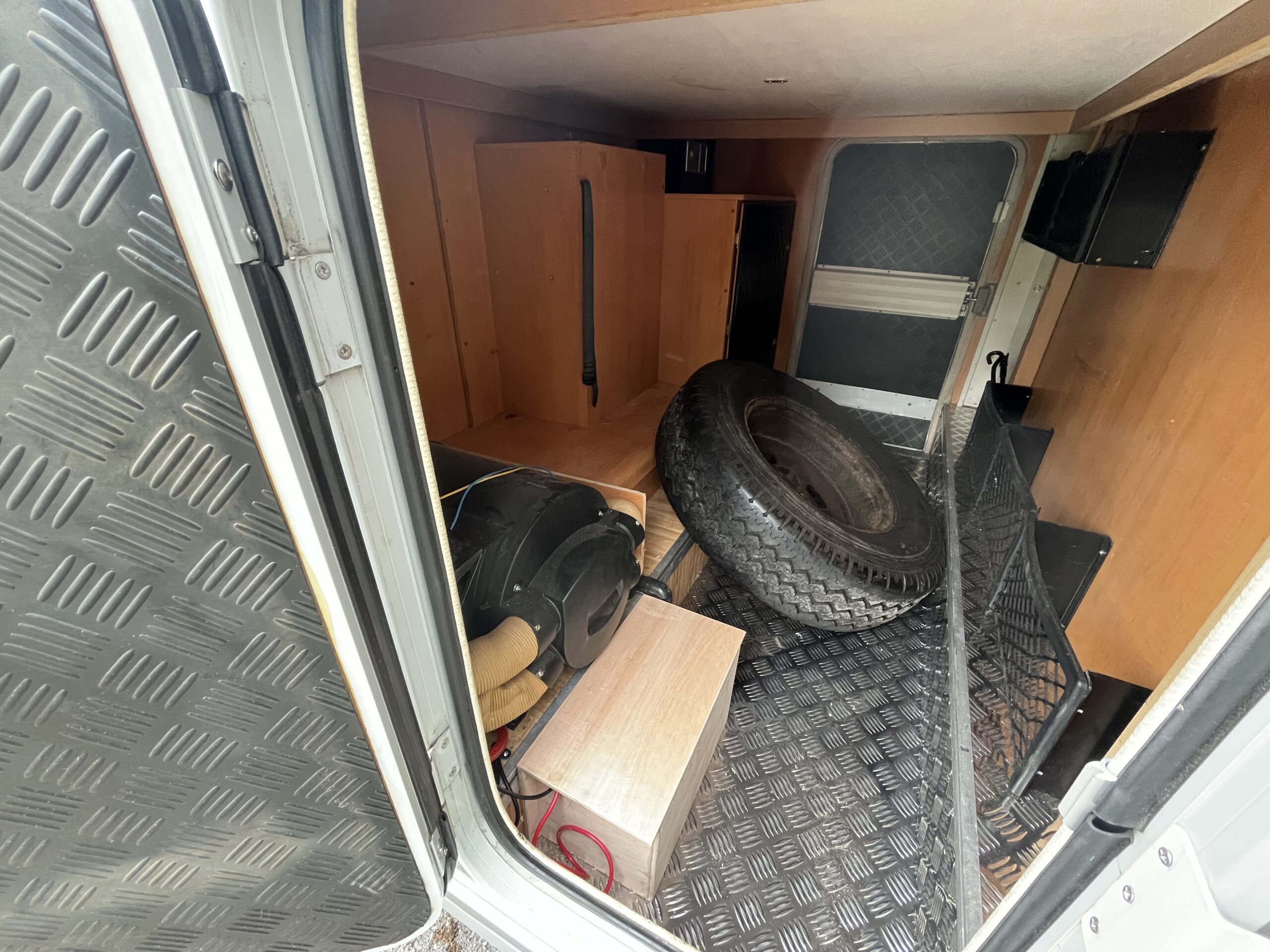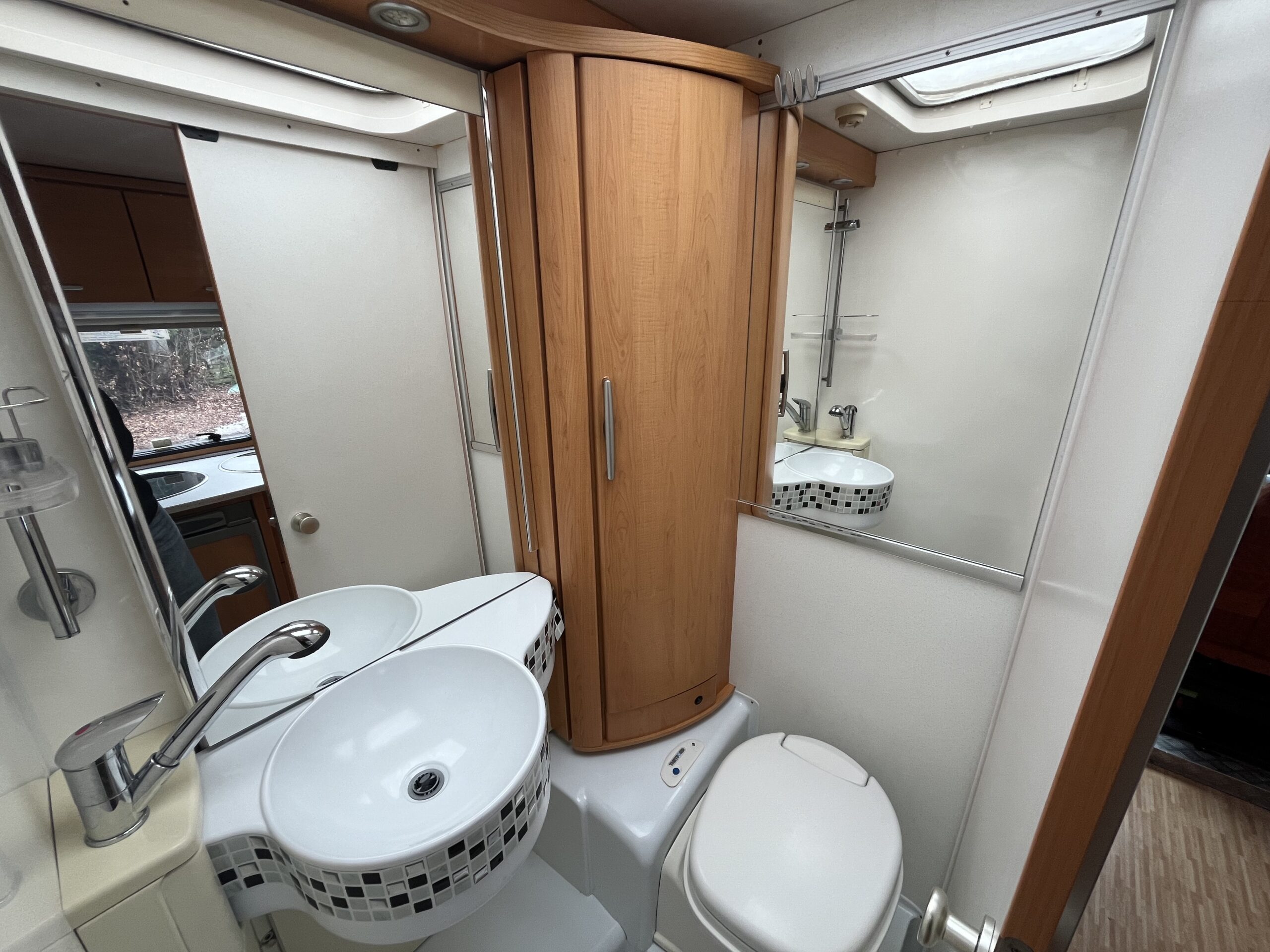 The interior consists of a transverse fixed double bed at the rear, kitchen area with 3 burner hob, sink with mixer tap and fridge with freezer compartment. The front lounge / dining area has two front facing seats complete with seat belts. The two cab seats swivel to allow four to sit at the dining table with an additional swing out section. The washroom consists of a Thetford cassette toilet, shower, sink, mirror and storage cupboard. The sink is swivelled above the cassette toilet area to allow the use of the shower. There is a Truma Blown air system fitted and a Truma water heater. Fly screens and blinds are fitted to all windows. The large rear garage has plenty of storage space and is where the spare wheel and gas bottles are located. There is an awning light fitted above the entrance door and the electric entrance step is fully retractable.
