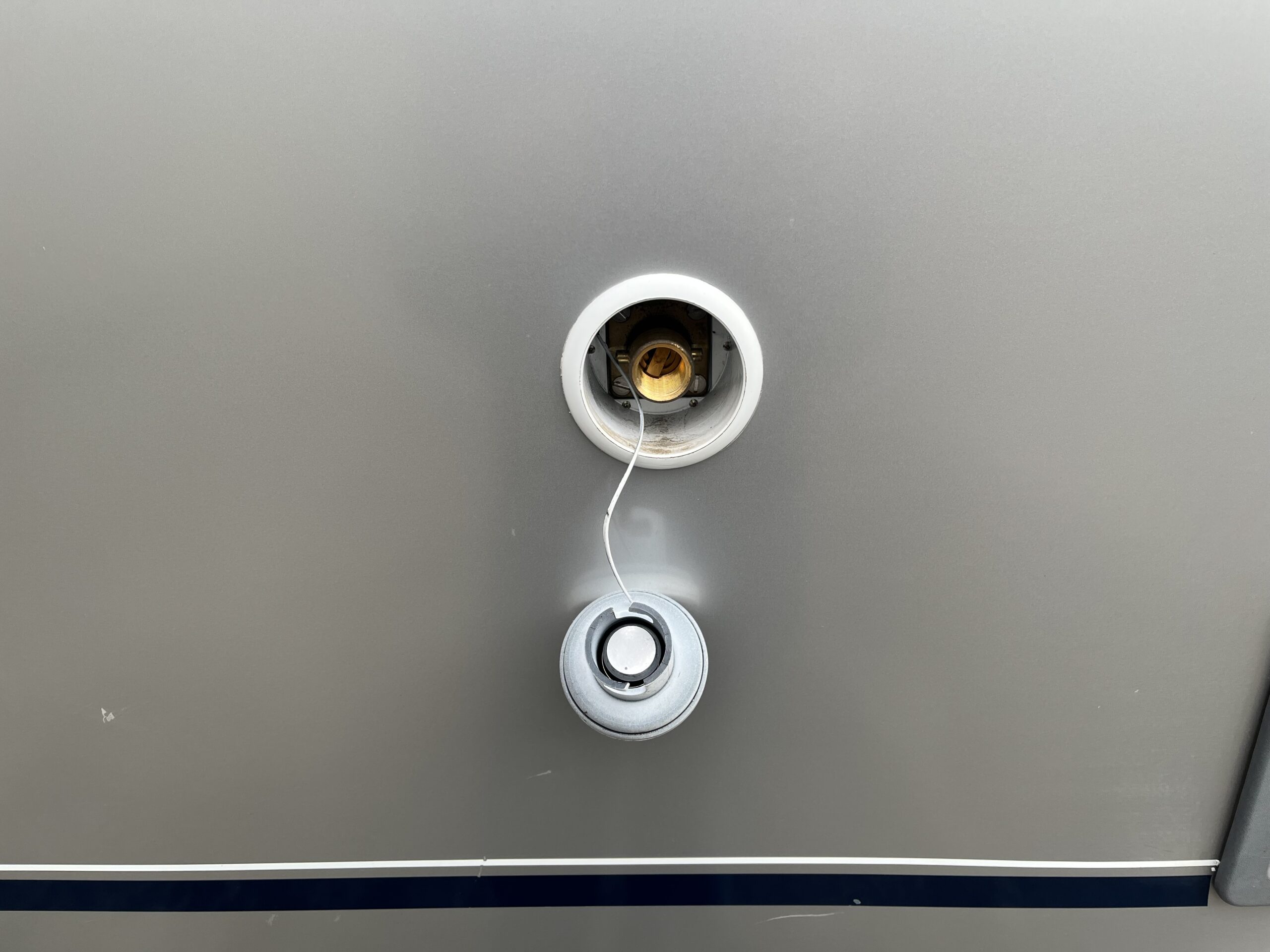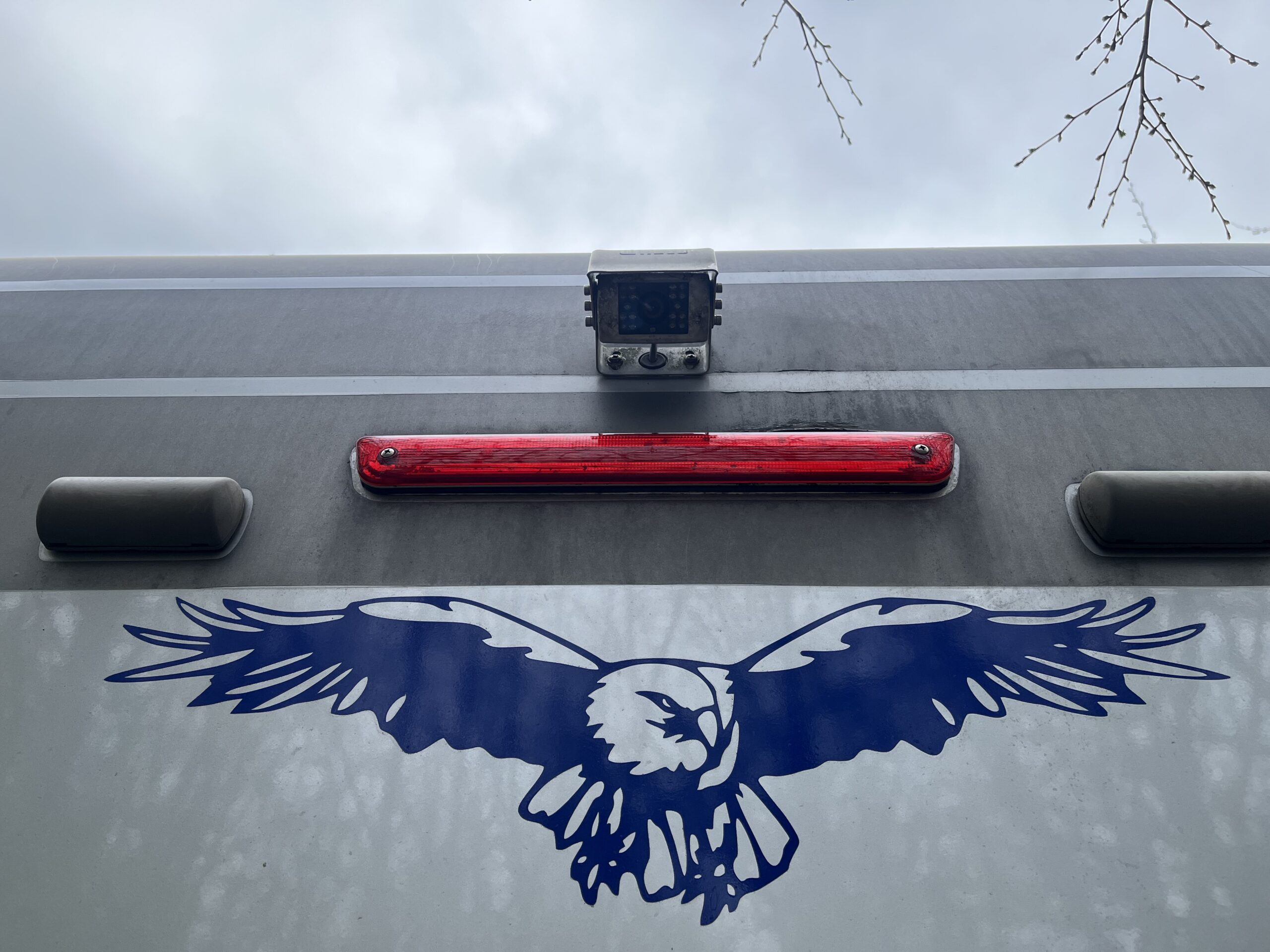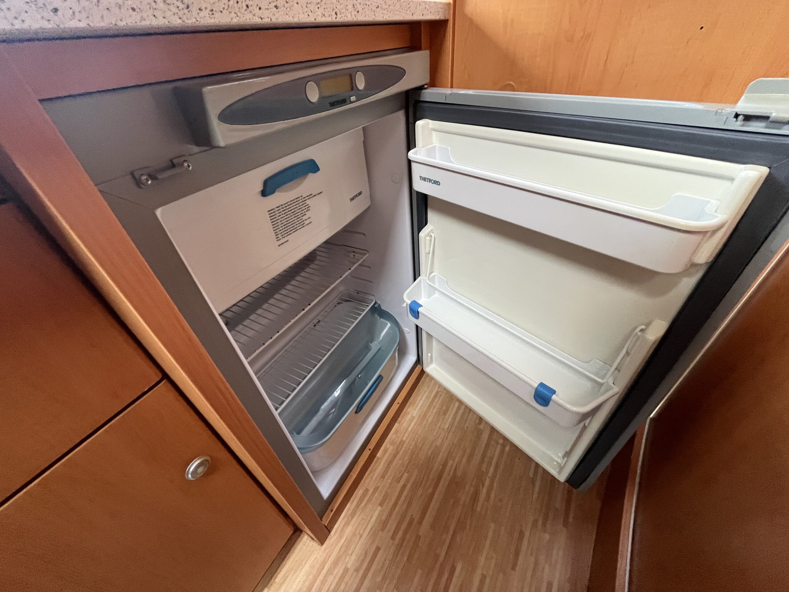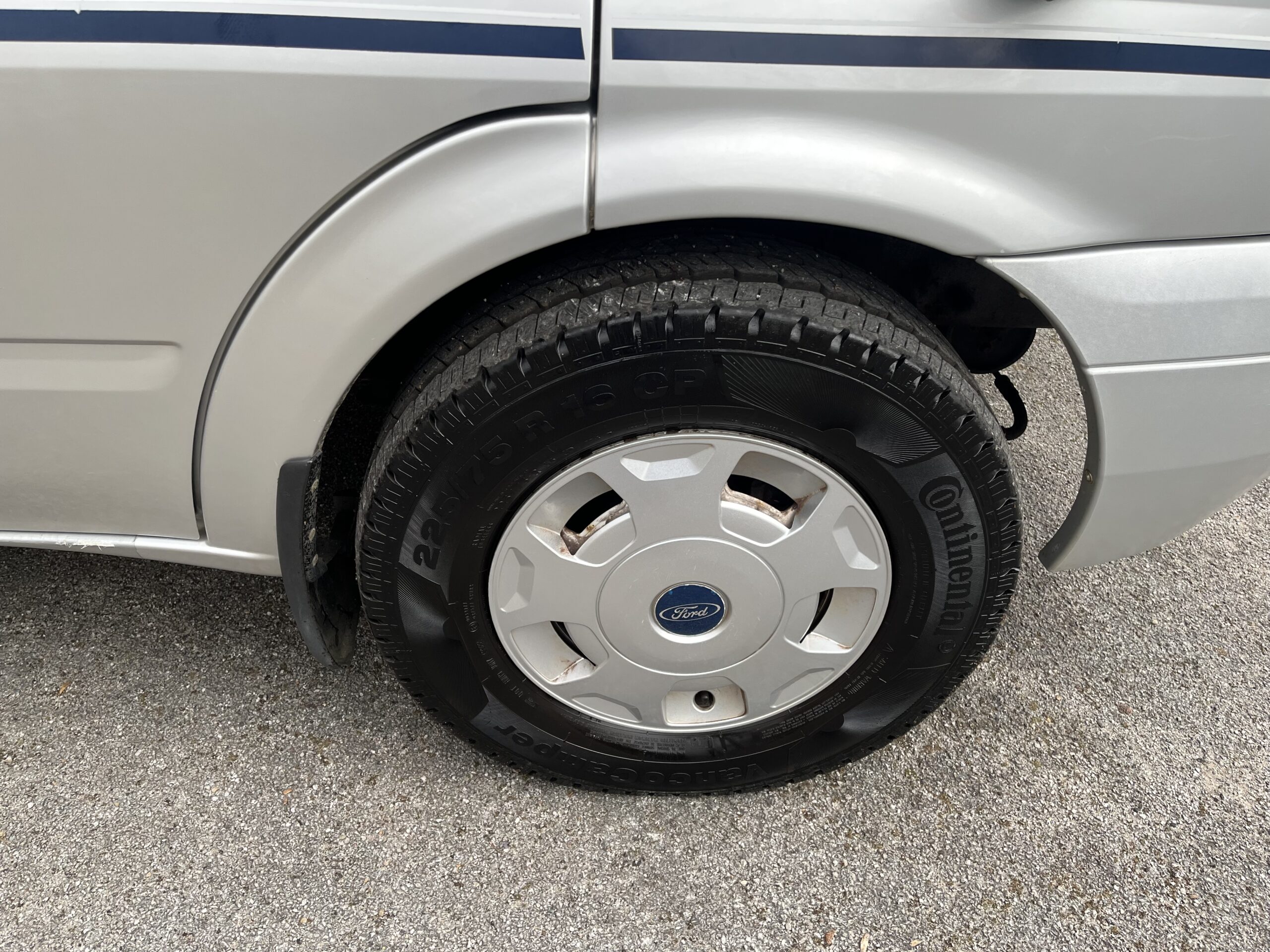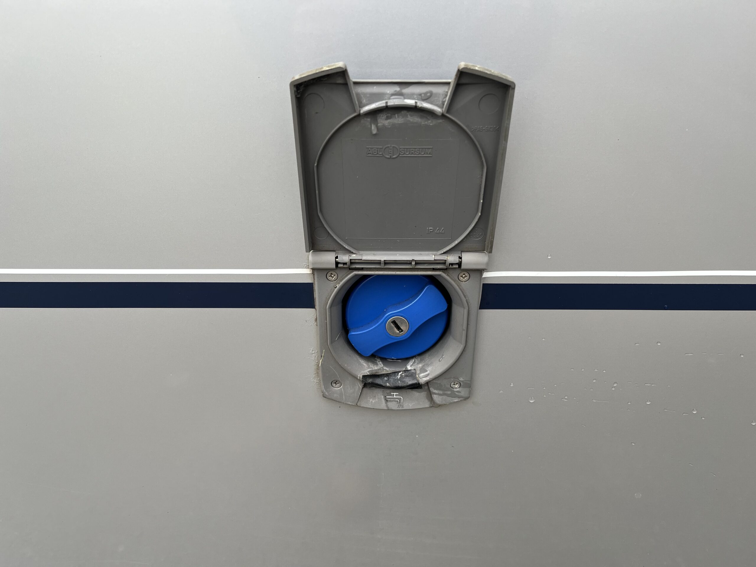 The interior consists of a transverse fixed double bed at the rear, kitchen area with 3 burner hob, sink with mixer tap and fridge with freezer compartment. The front lounge / dining area has two front facing seats complete with seat belts. The two cab seats swivel to allow four to sit at the dining table with an additional swing out section. The washroom consists of a Thetford cassette toilet, shower, sink, mirror and storage cupboard. The sink is swivelled above the cassette toilet area to allow the use of the shower. There is a Truma Blown air system fitted and a Truma water heater. Fly screens and blinds are fitted to all windows. The large rear garage has plenty of storage space and is where the spare wheel and gas bottles are located. There is an awning light fitted above the entrance door and the electric entrance step is fully retractable.
