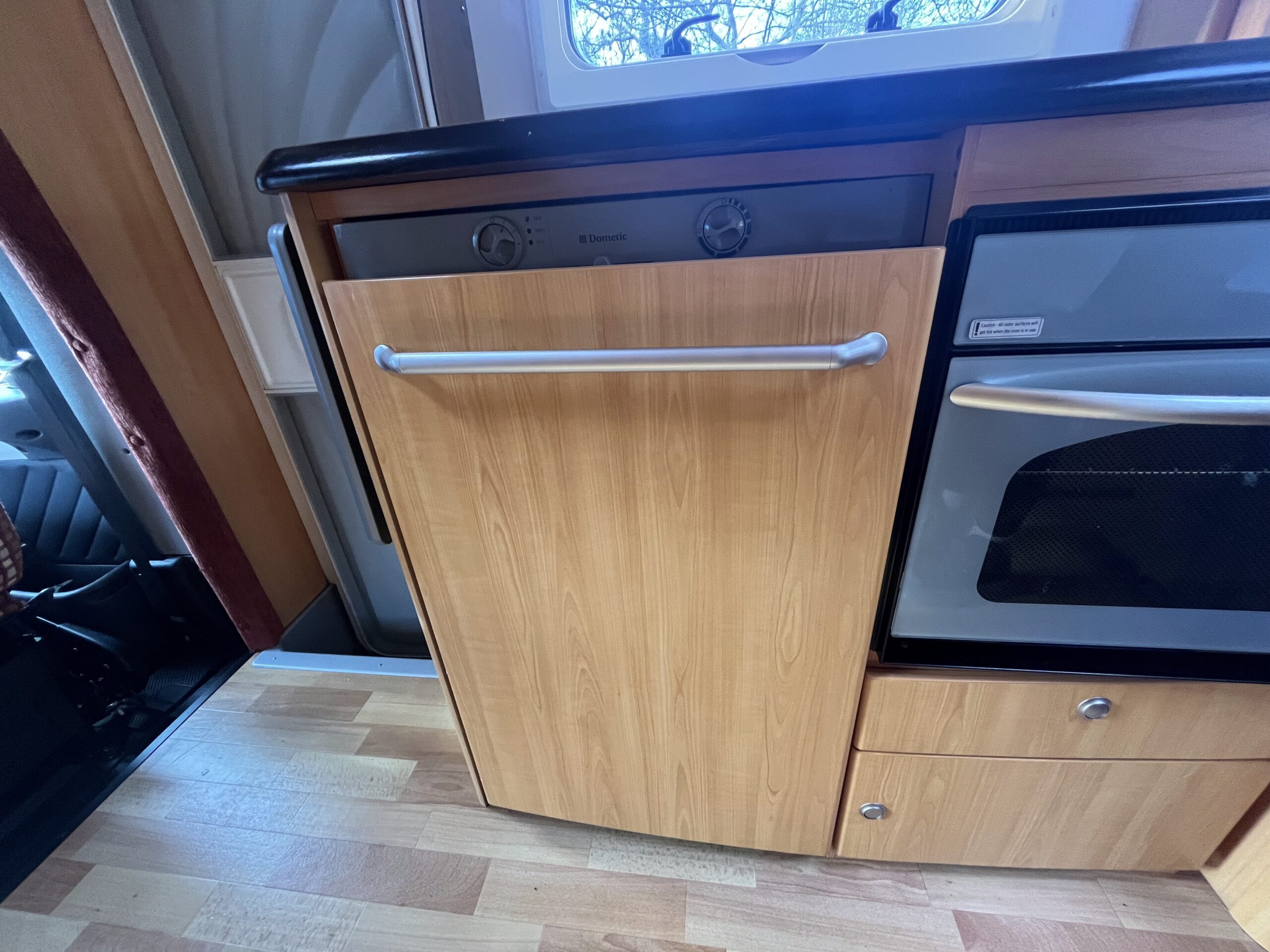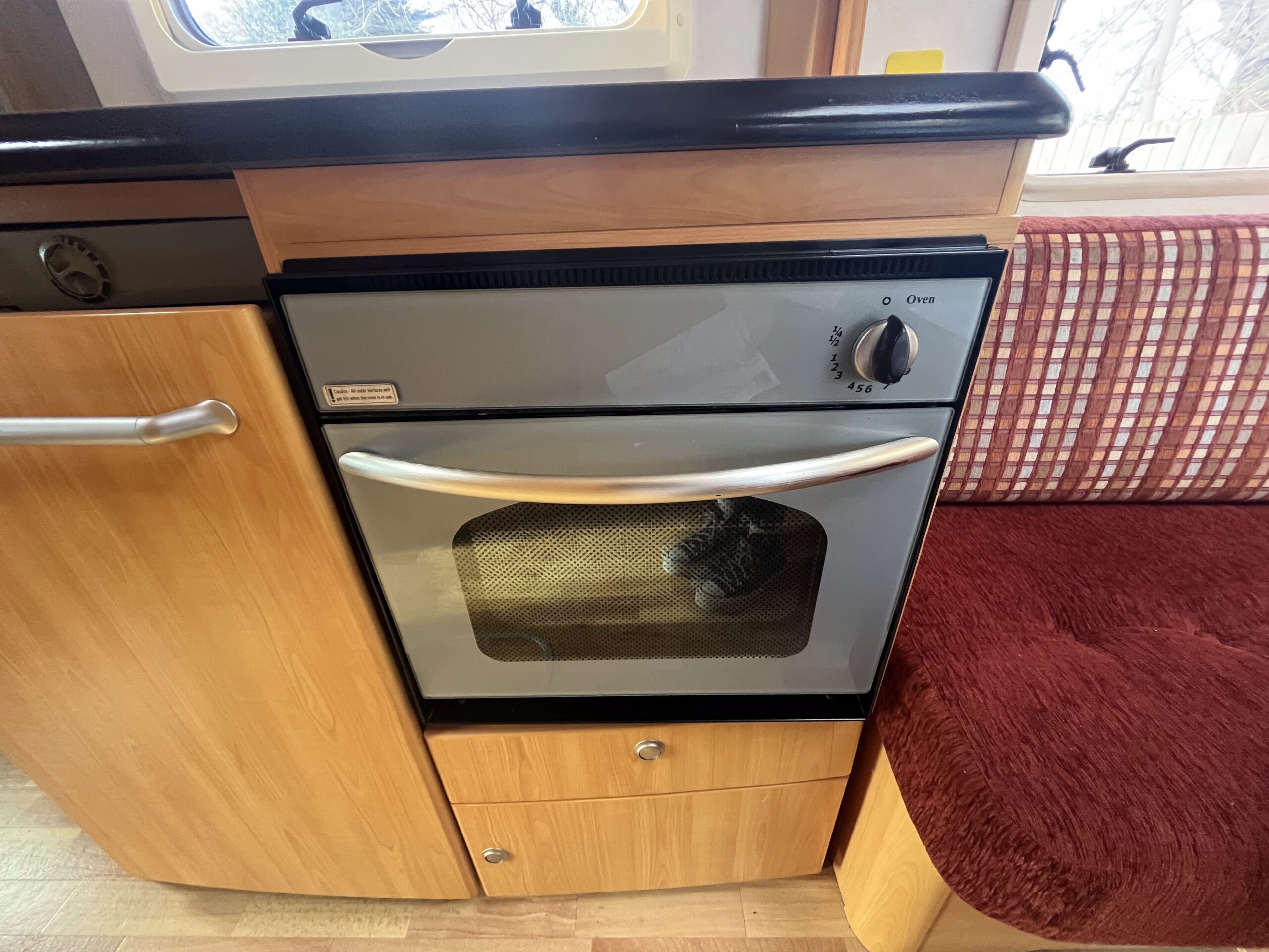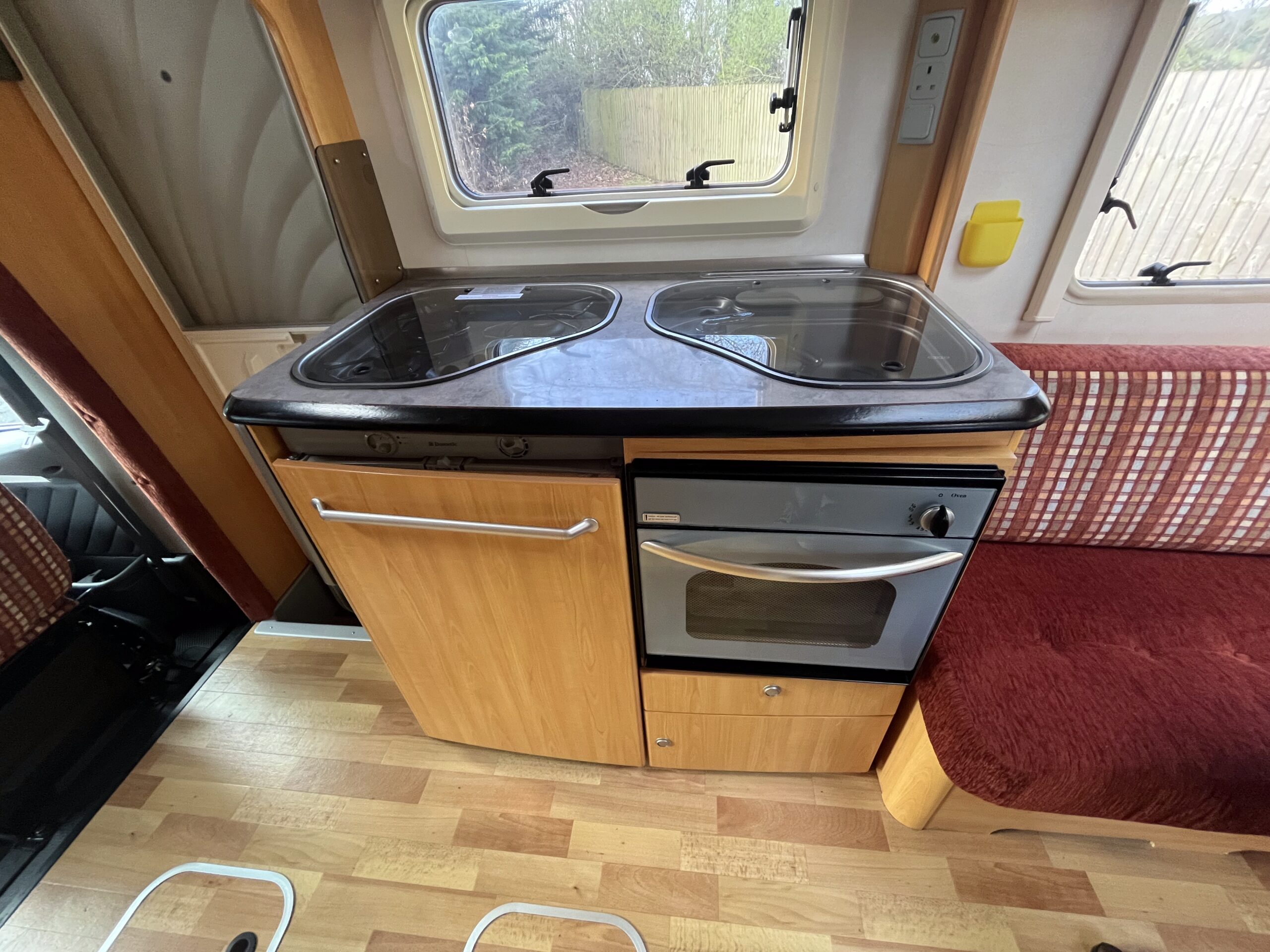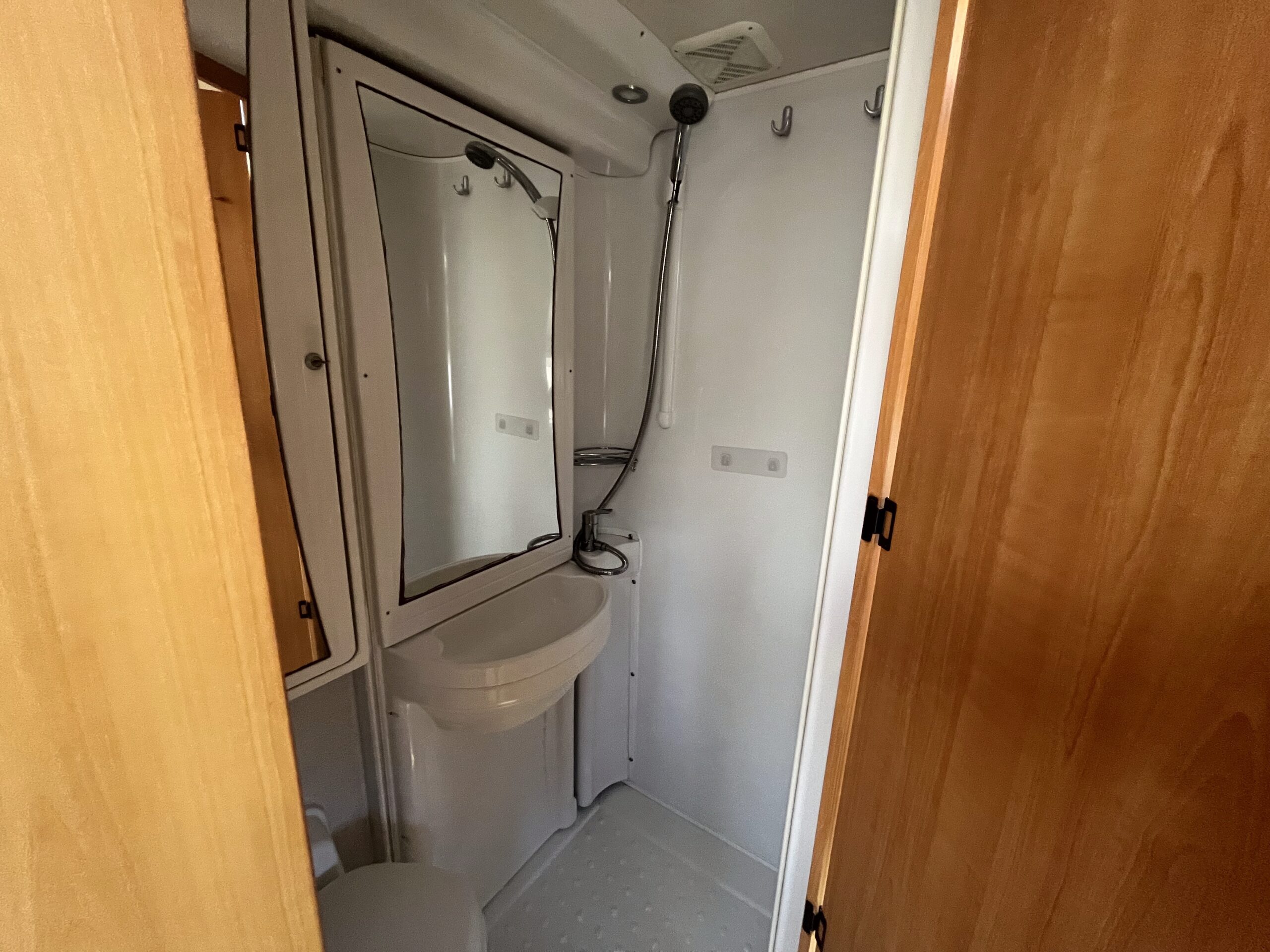 Entering the habitation door via the low level step and turning right, on the left is the kitchen area with stainless steel sink and mixer tap with drainer and a fridge with freezer box under. Next to this is a grill and oven combi. Adjacent is the well appointed washroom which is modern looking, bright and airy. In here we have a WC, Sink, Shower and Vanity Unit.