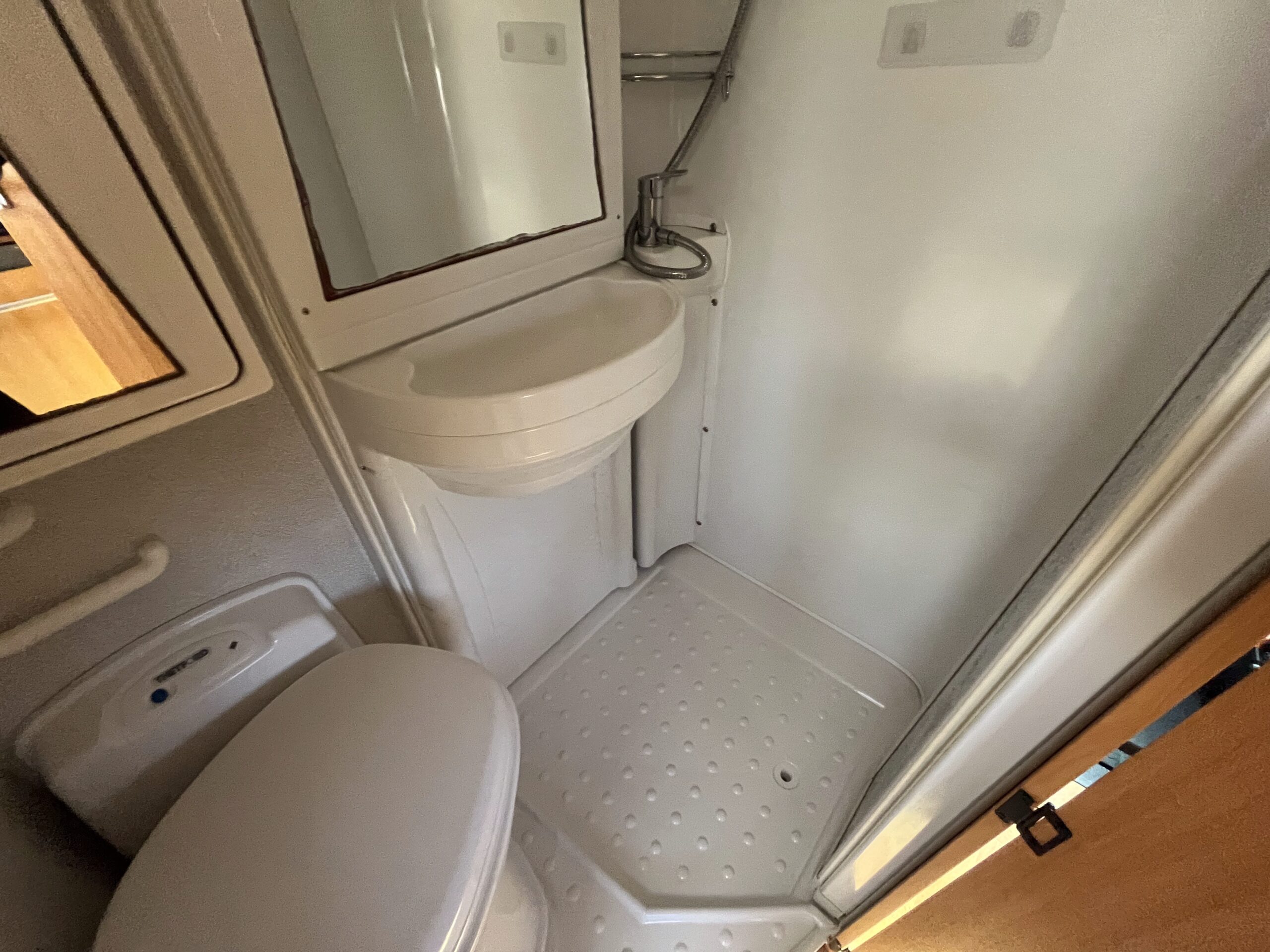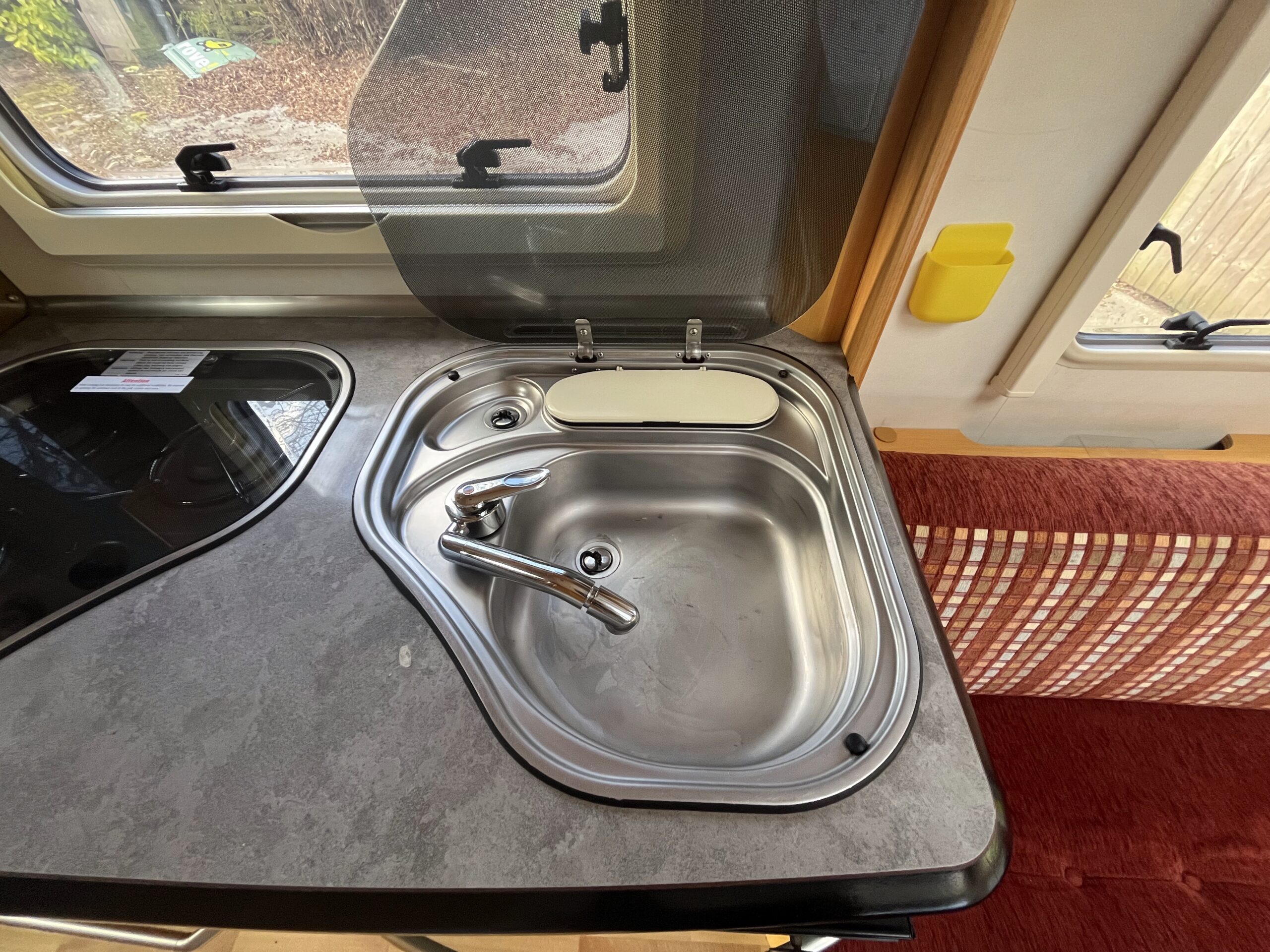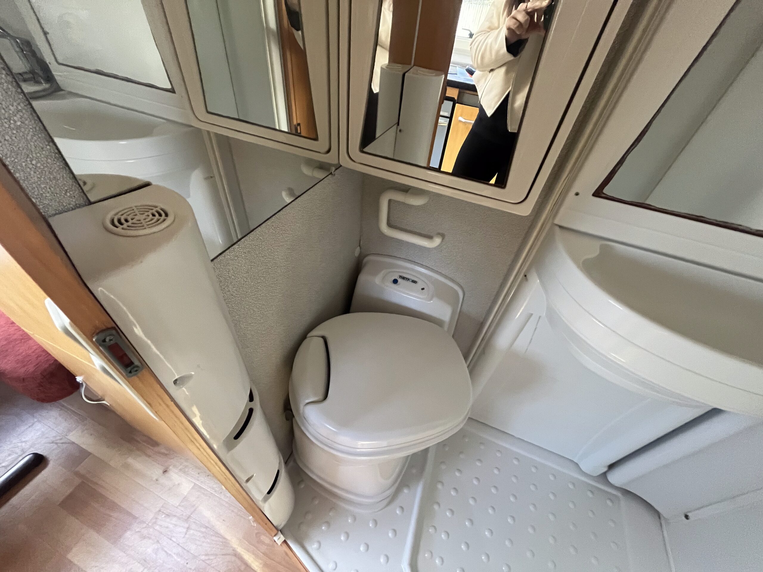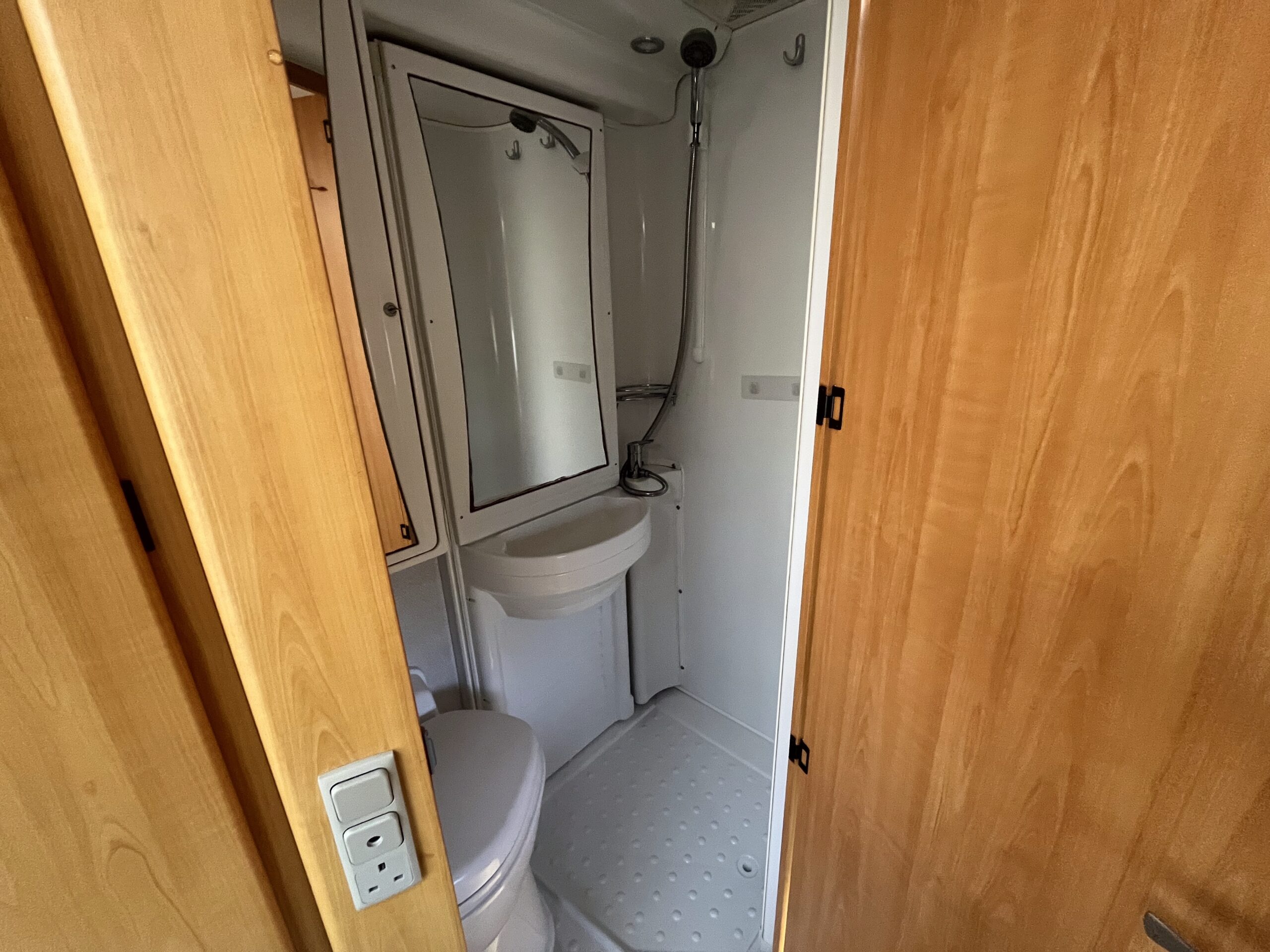 Entering the habitation door via the low level step and turning right, on the left is the kitchen area with stainless steel sink and mixer tap with drainer and a fridge with freezer box under. Next to this is a grill and oven combi. Adjacent is the well appointed washroom which is modern looking, bright and airy. In here we have a WC, Sink, Shower and Vanity Unit.