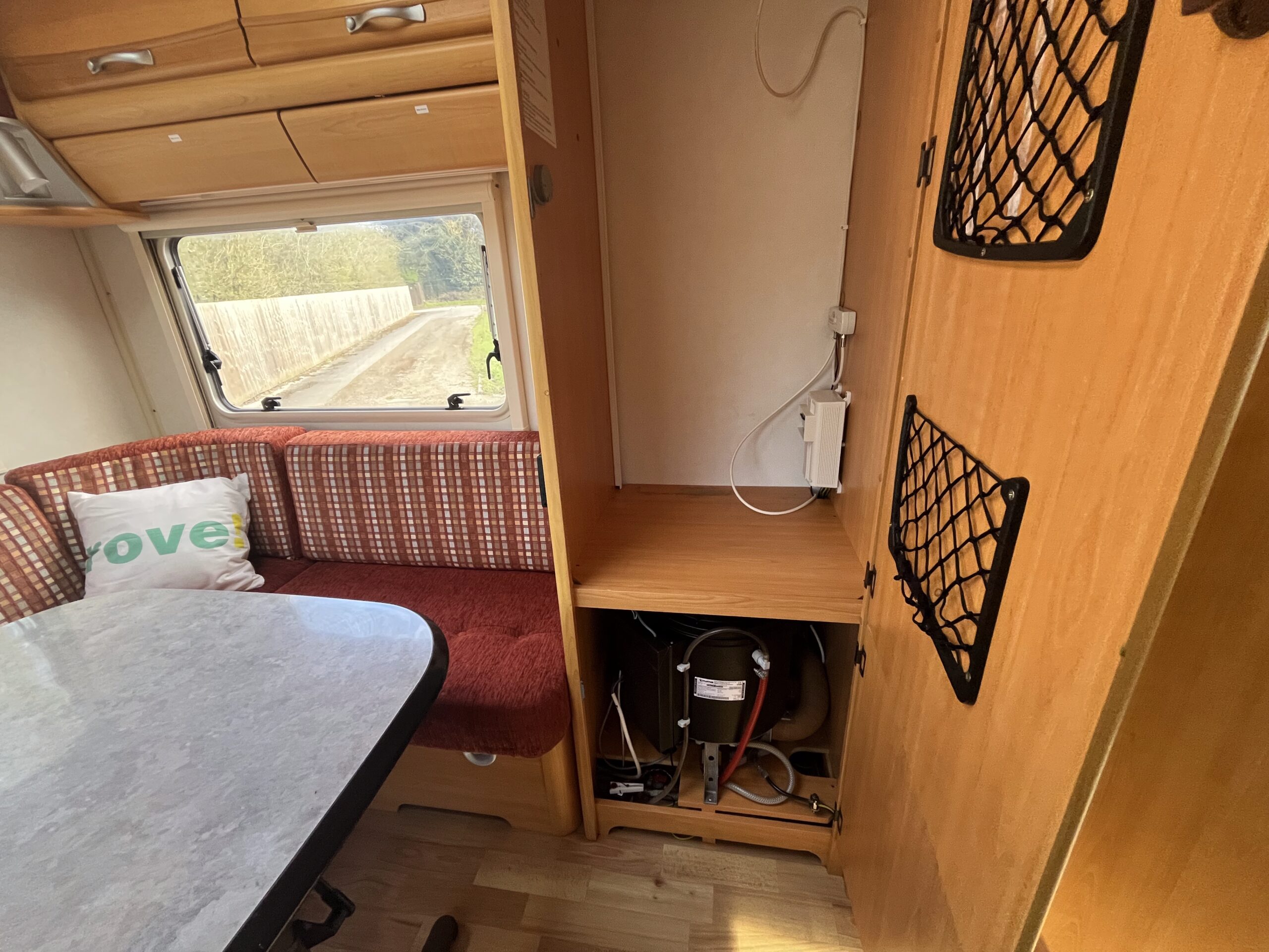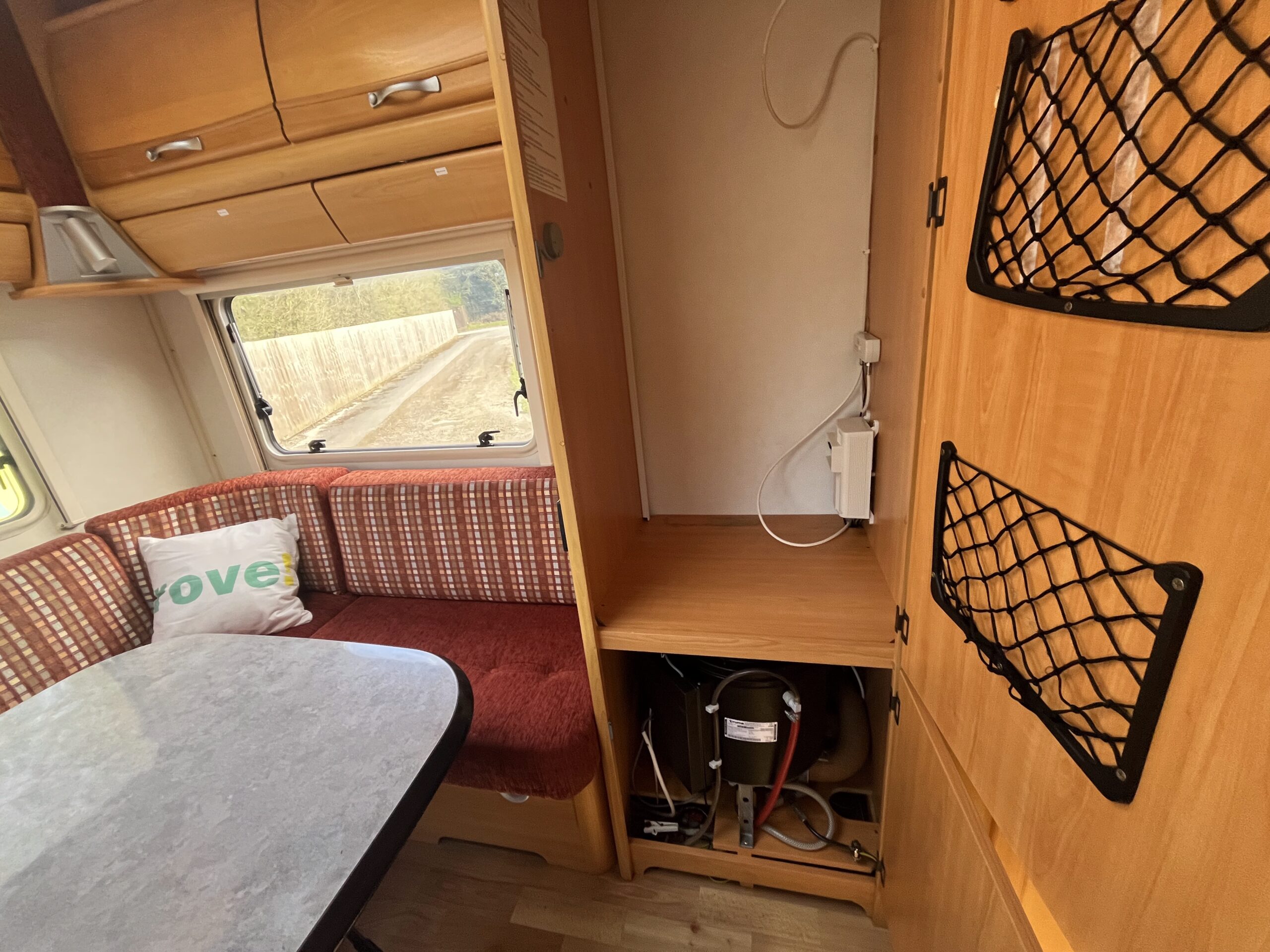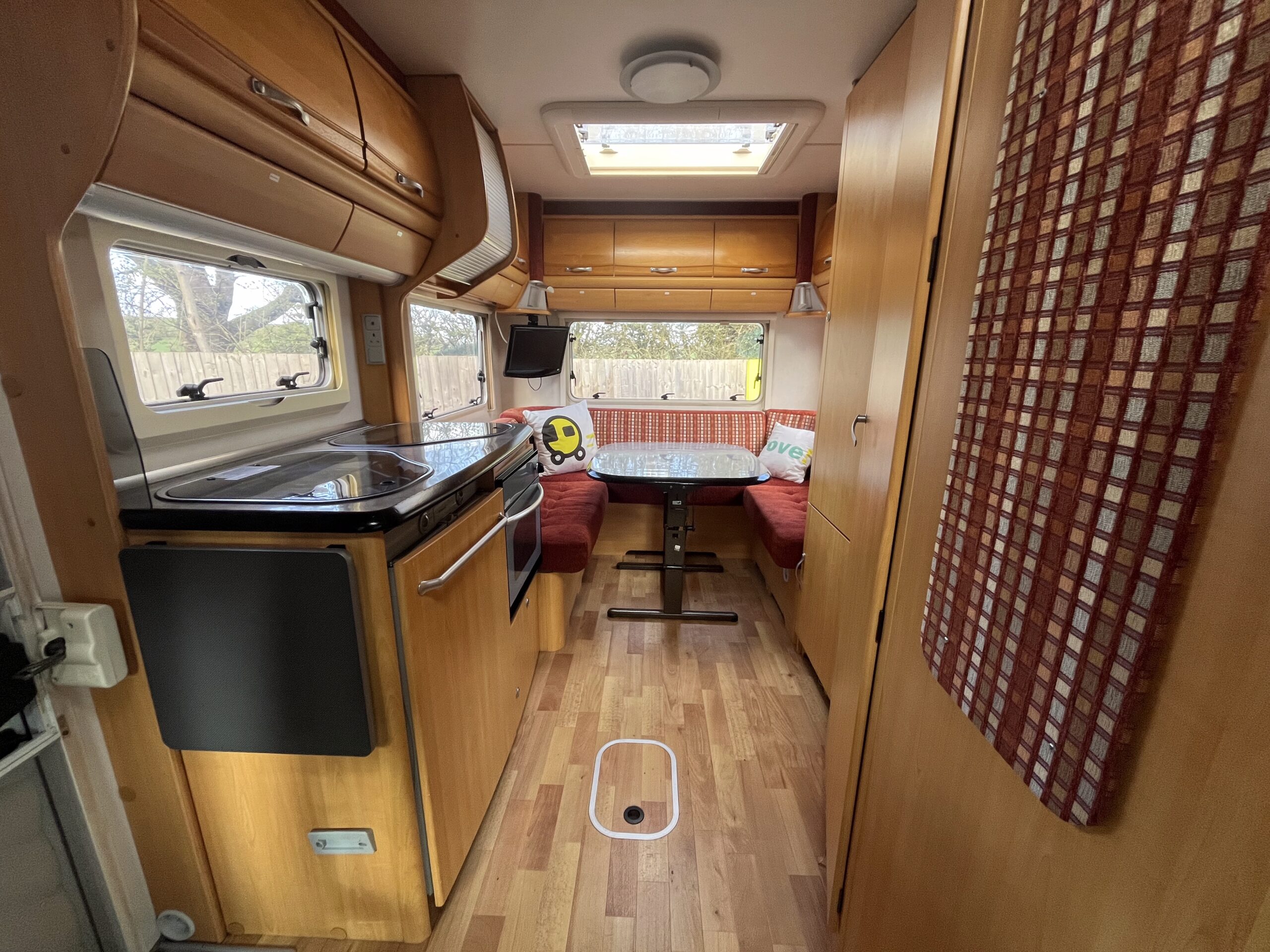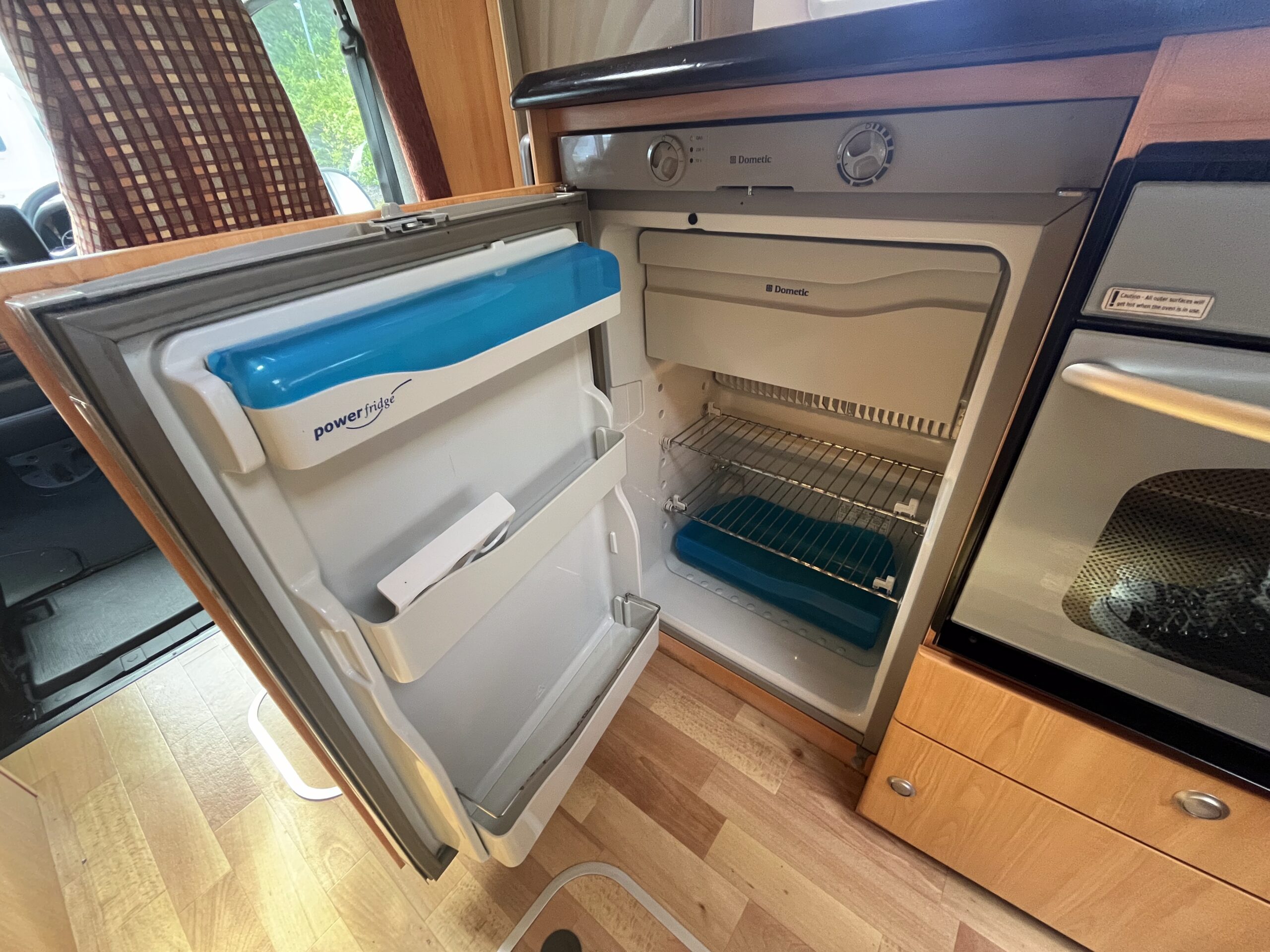 Entering the habitation door via the low level step and turning right, on the left is the kitchen area with stainless steel sink and mixer tap with drainer and a fridge with freezer box under. Next to this is a grill and oven combi. Adjacent is the well appointed washroom which is modern looking, bright and airy. In here we have a WC, Sink, Shower and Vanity Unit.