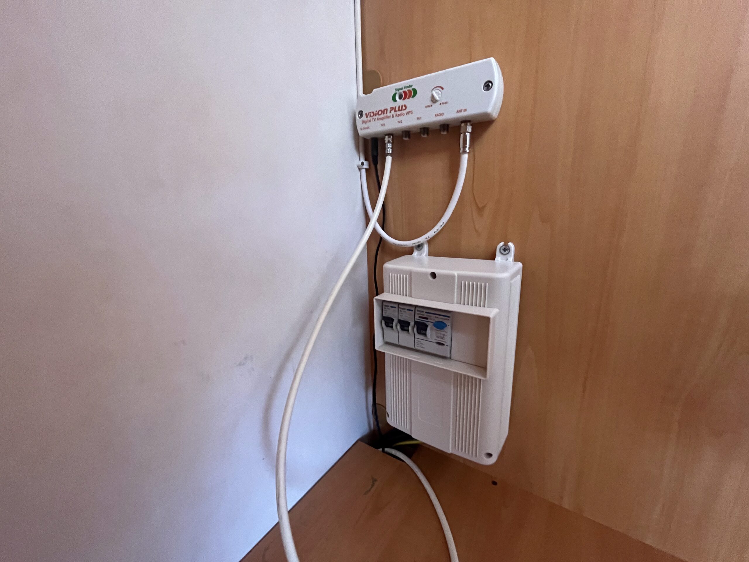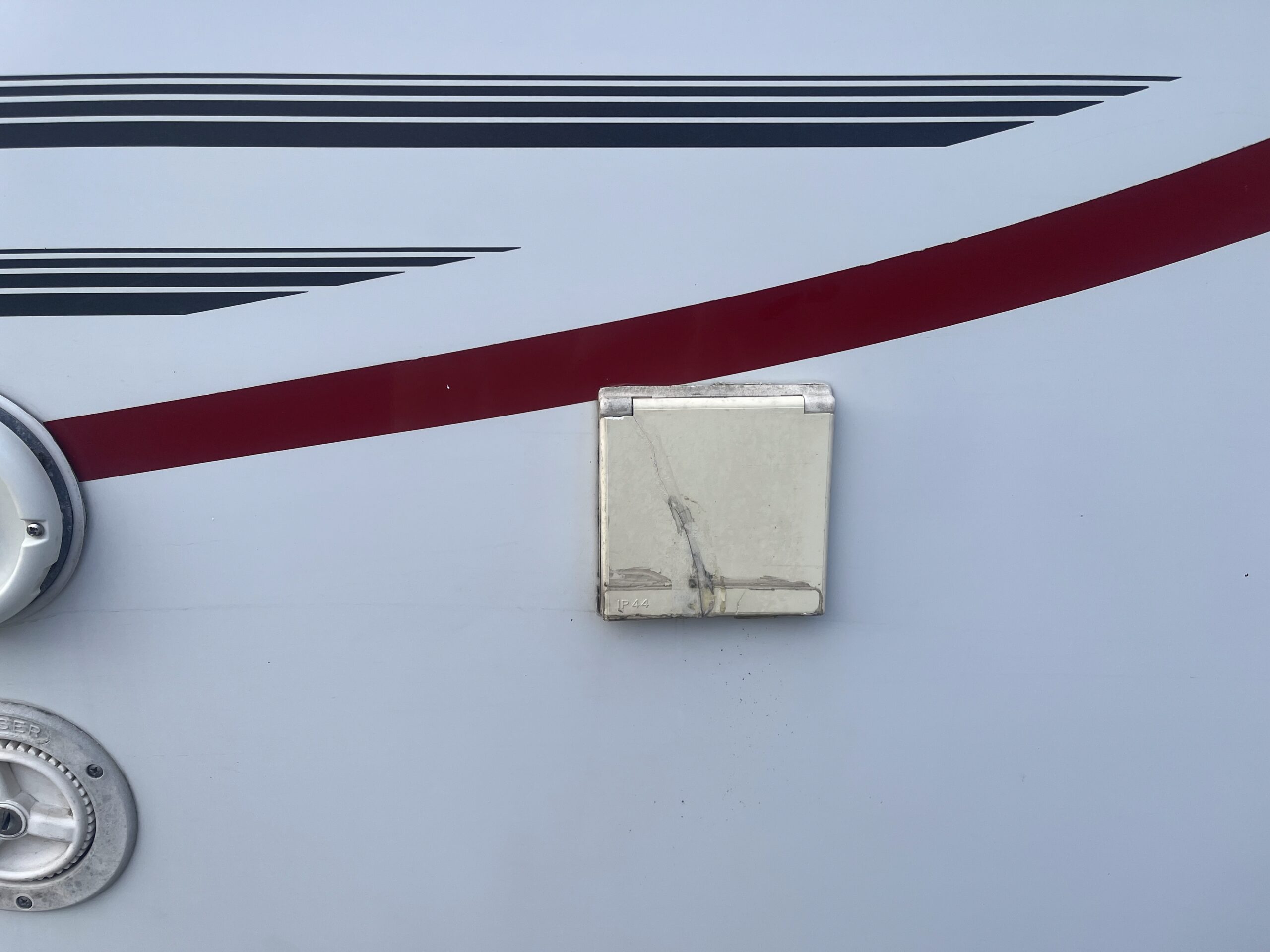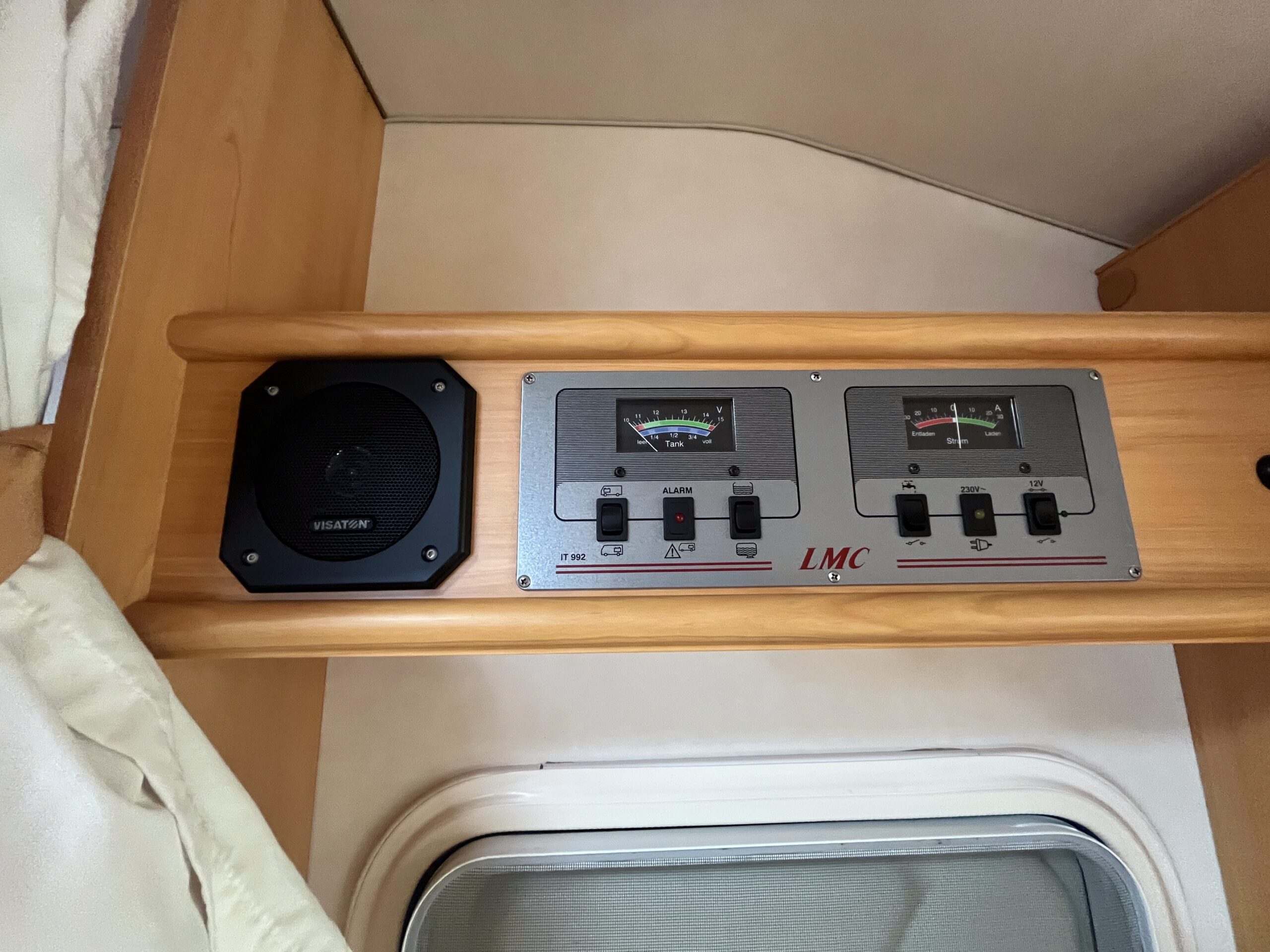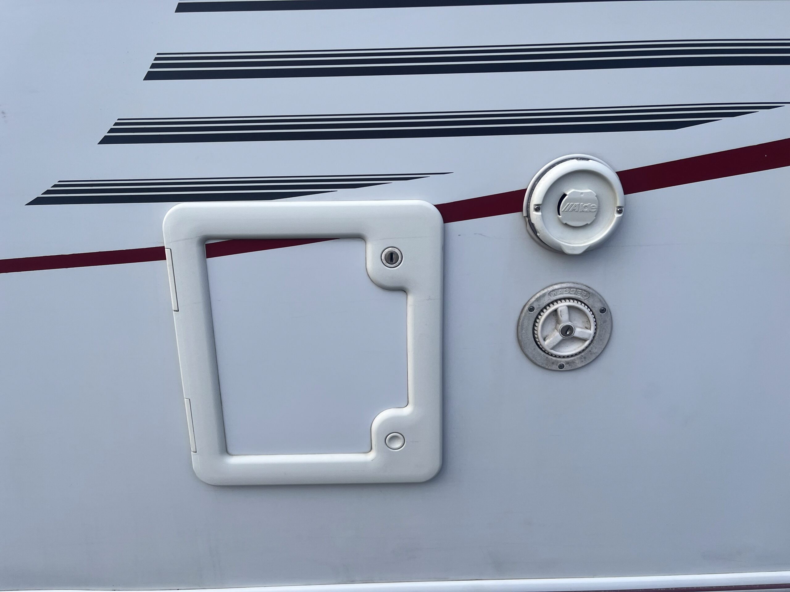 Entering the habitation door via the low level step and turning right, on the left is the kitchen area with stainless steel sink and mixer tap with drainer and a fridge with freezer box under. Next to this is a grill and oven combi. Adjacent is the well appointed washroom which is modern looking, bright and airy. In here we have a WC, Sink, Shower and Vanity Unit.