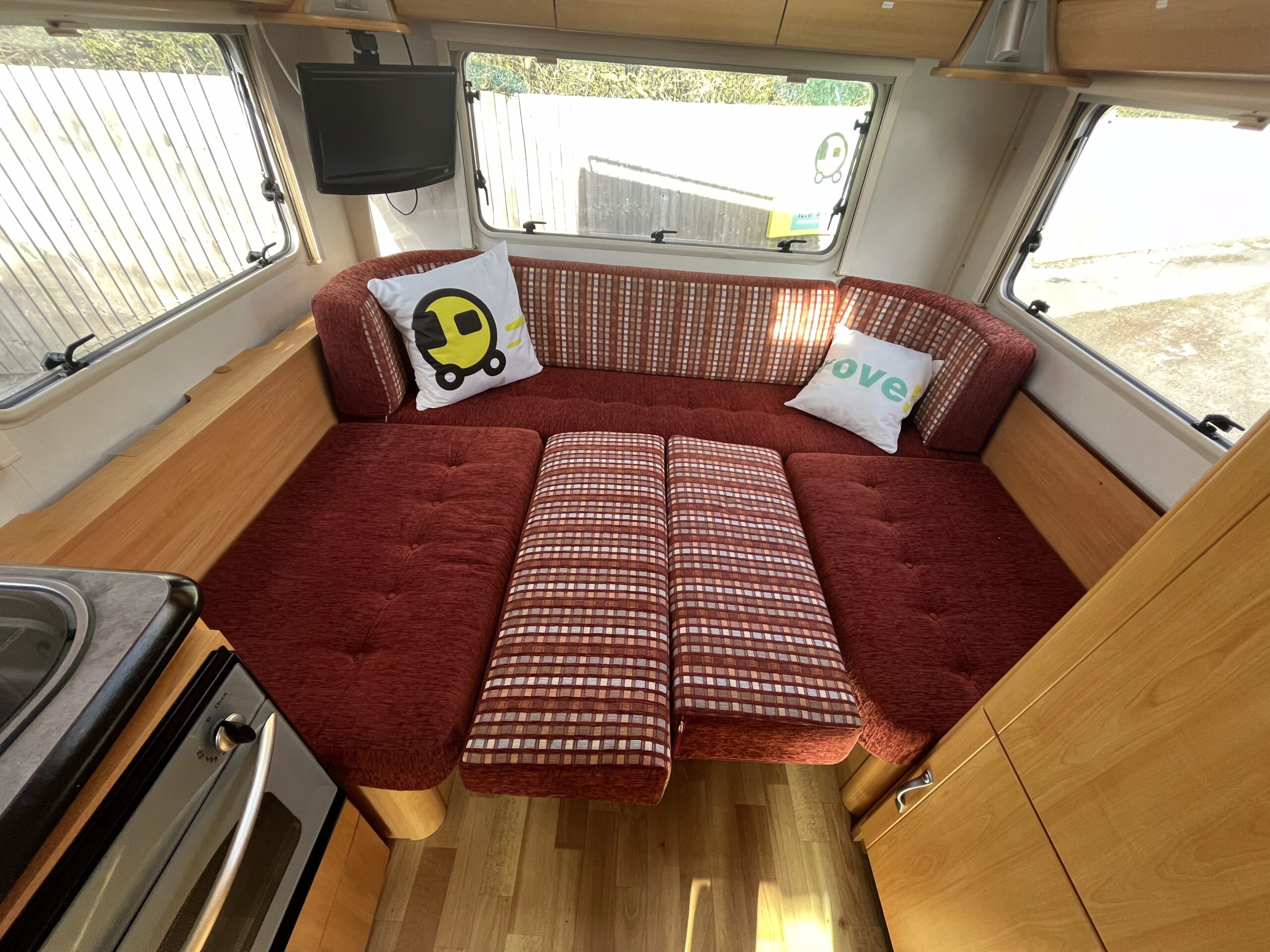 At the rear is the lounge-dining area, this area is bathed in light courtesy of the large Heiki Rooflight, this is a great place to sit and watch TV with large windows on 3 sides. This area converts quickly and easily into a double bed when required and there is ample storage under the lounge seats and locker storage around the top-up front in the Cab Area there is a double, over-cab fold away bed with access ladder, this space can be utilised as a large storage area for couples who prefer to use the double bed in the Lounge.