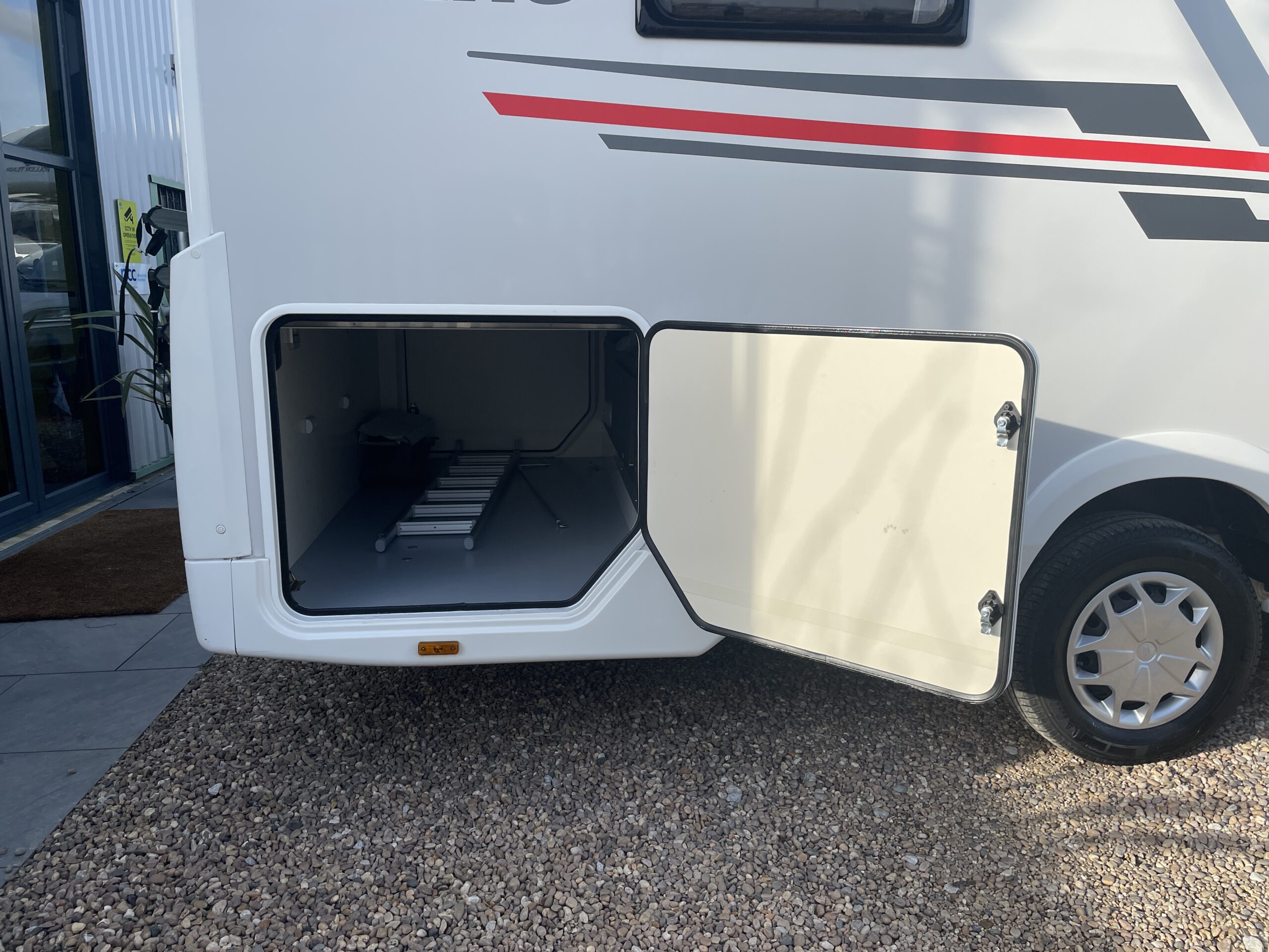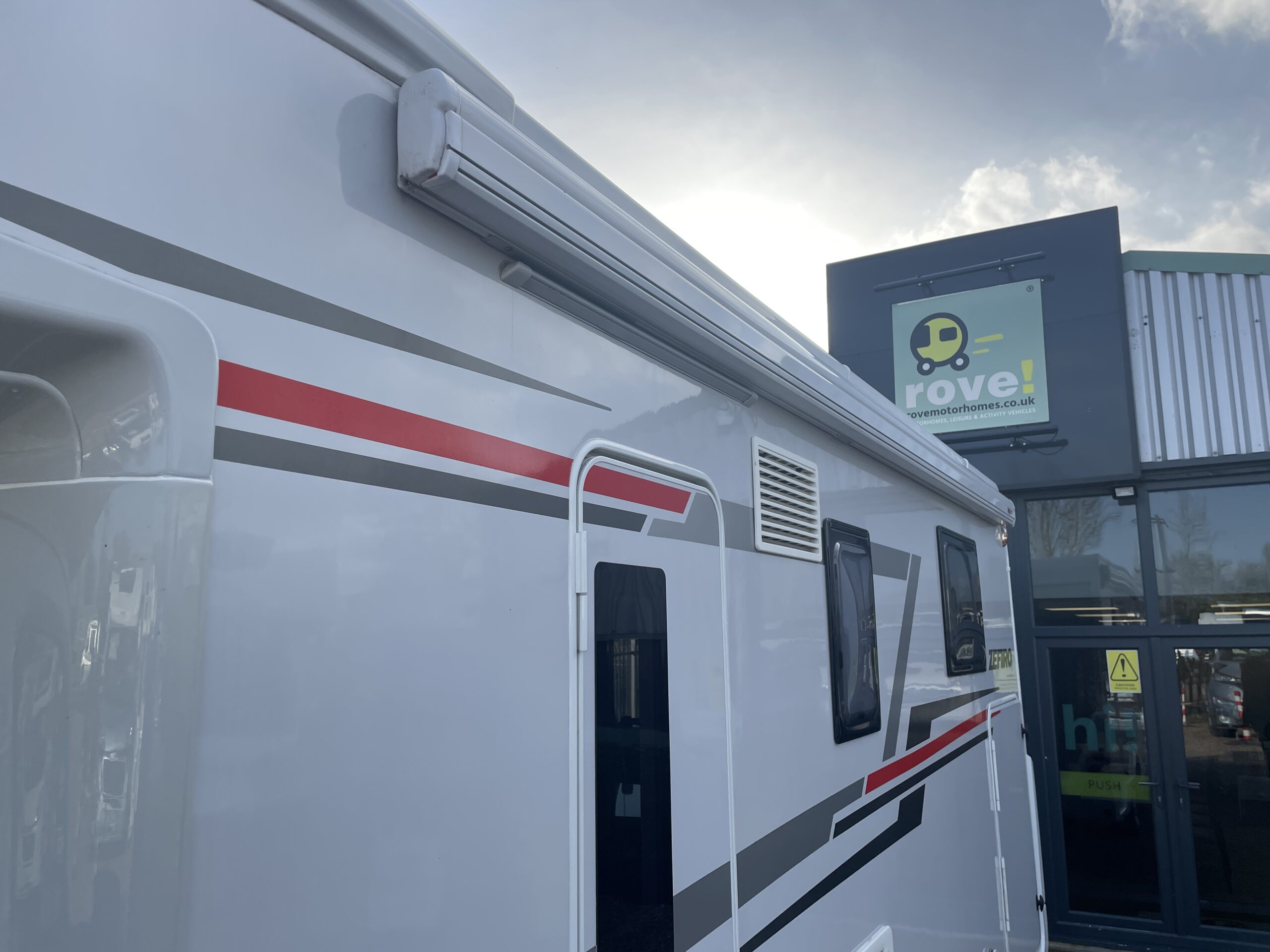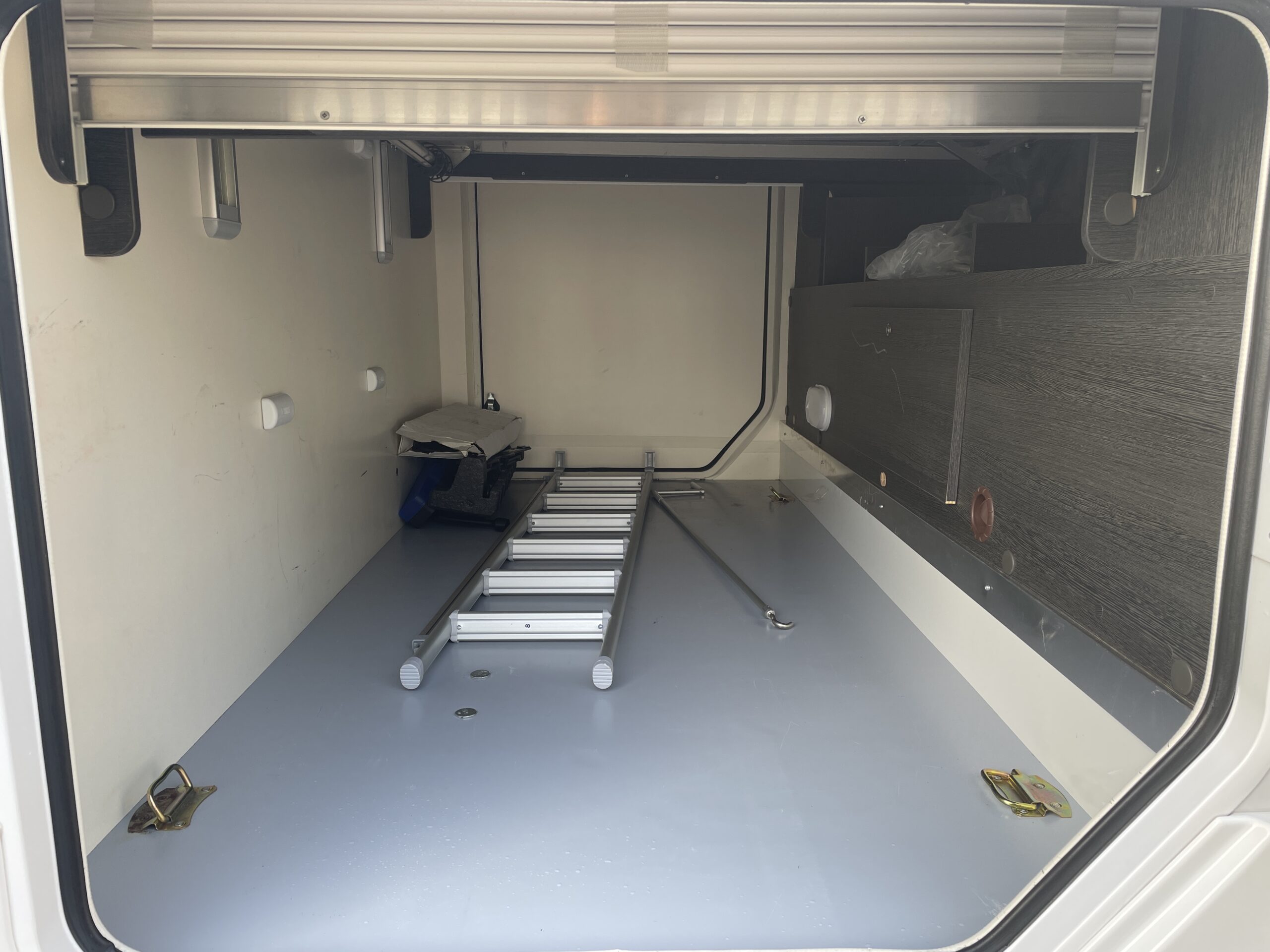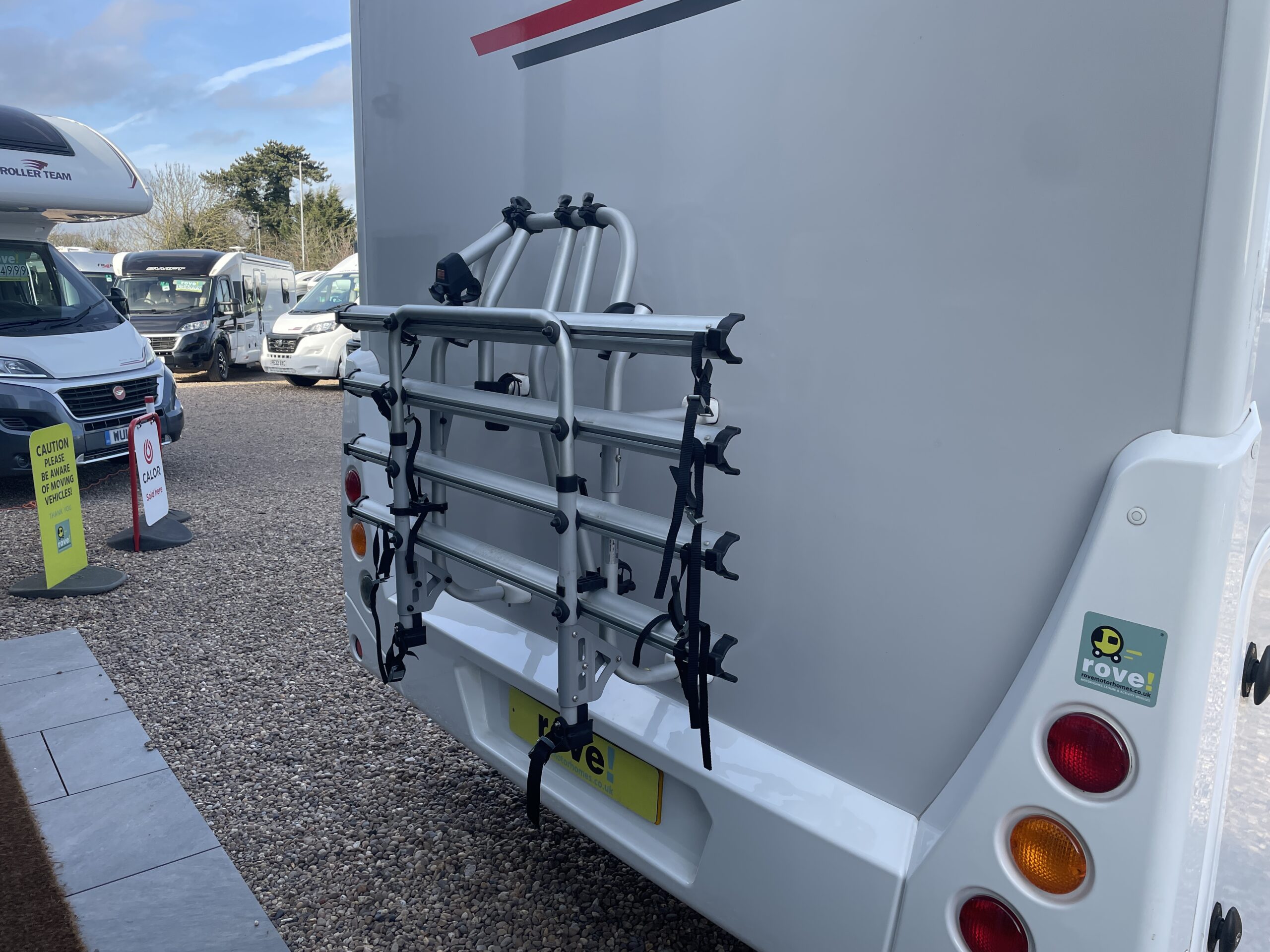 The bathroom conveniently separates the front and rear of the motorhome; you have a full separate shower, toilet, and centrally you have a sink basin with large vanity mirror. This area can be used as an en-suite to both sections of the motorhome with a partition door from the front and a his and hers separate door to the rear. In the rear of the motorhome you have the island bed which is height adjustable; this offers ease of access when getting into bed as well as raising the garage to store larger items when travelling. Finally you benefit from a large garage space, perfect for all your storage needs! Moving outside you benefit from a bike rack, external shower point, a wind out awning to create a large outdoor space and a solar panel to keep the power levels topped up!