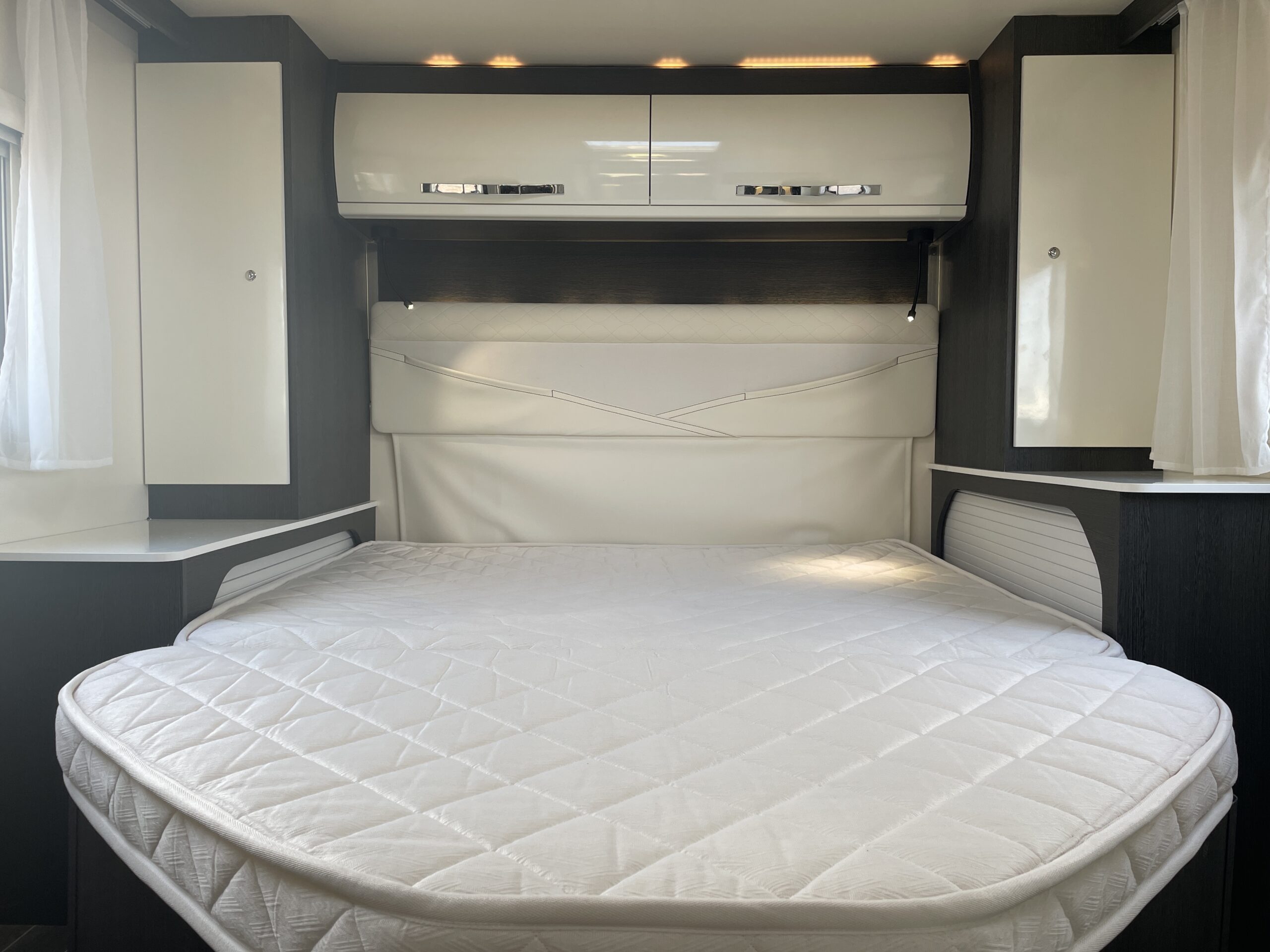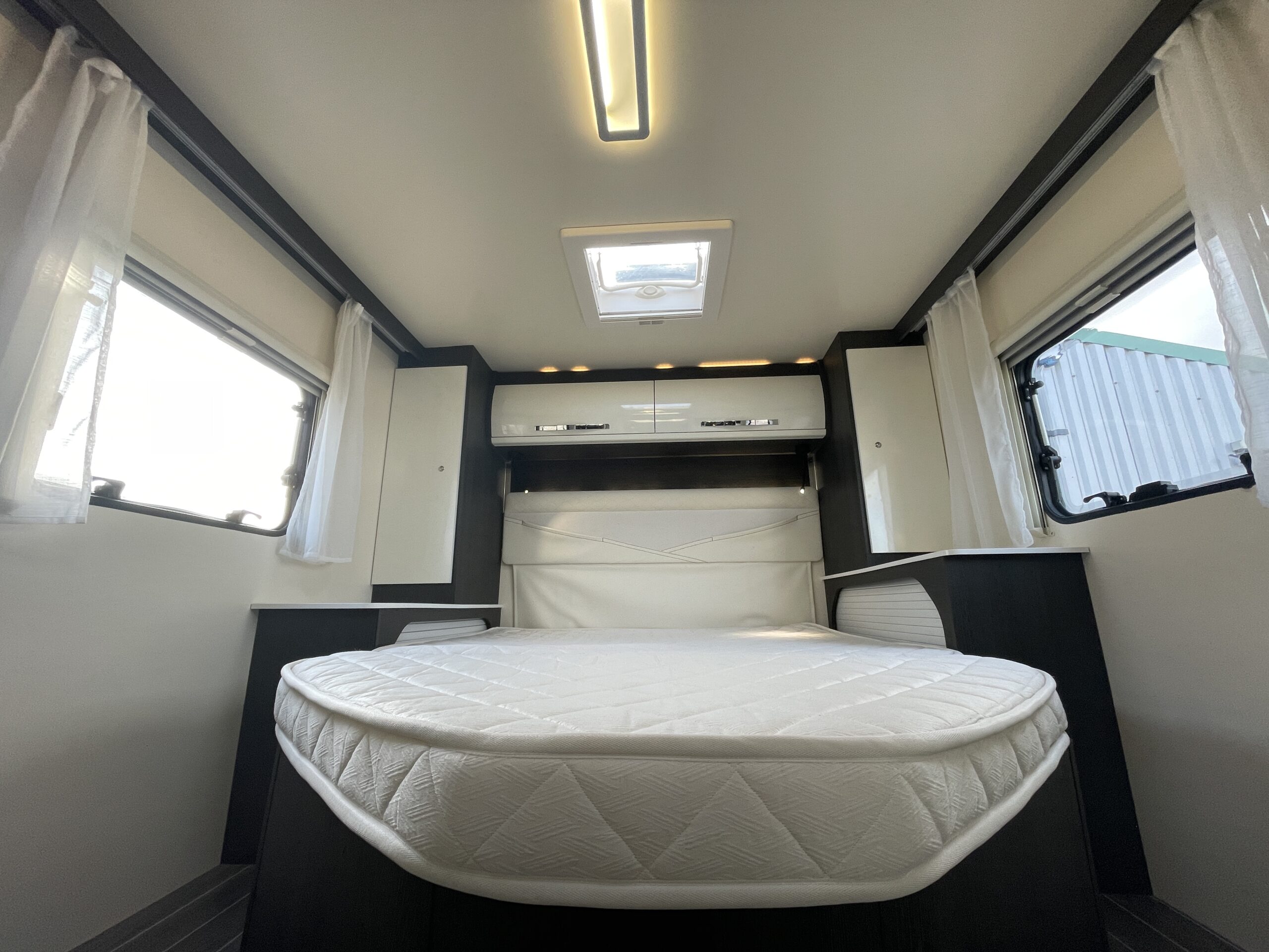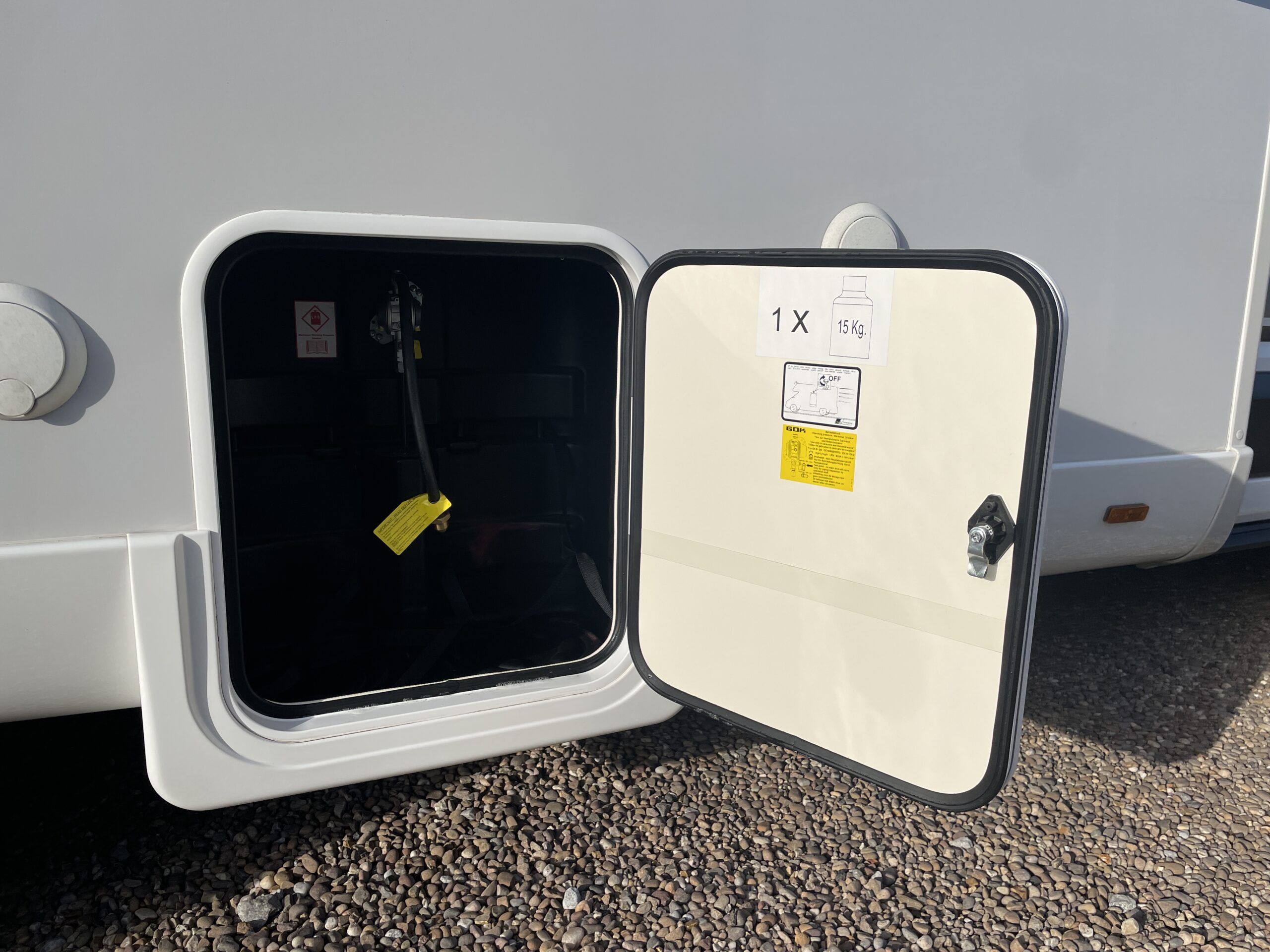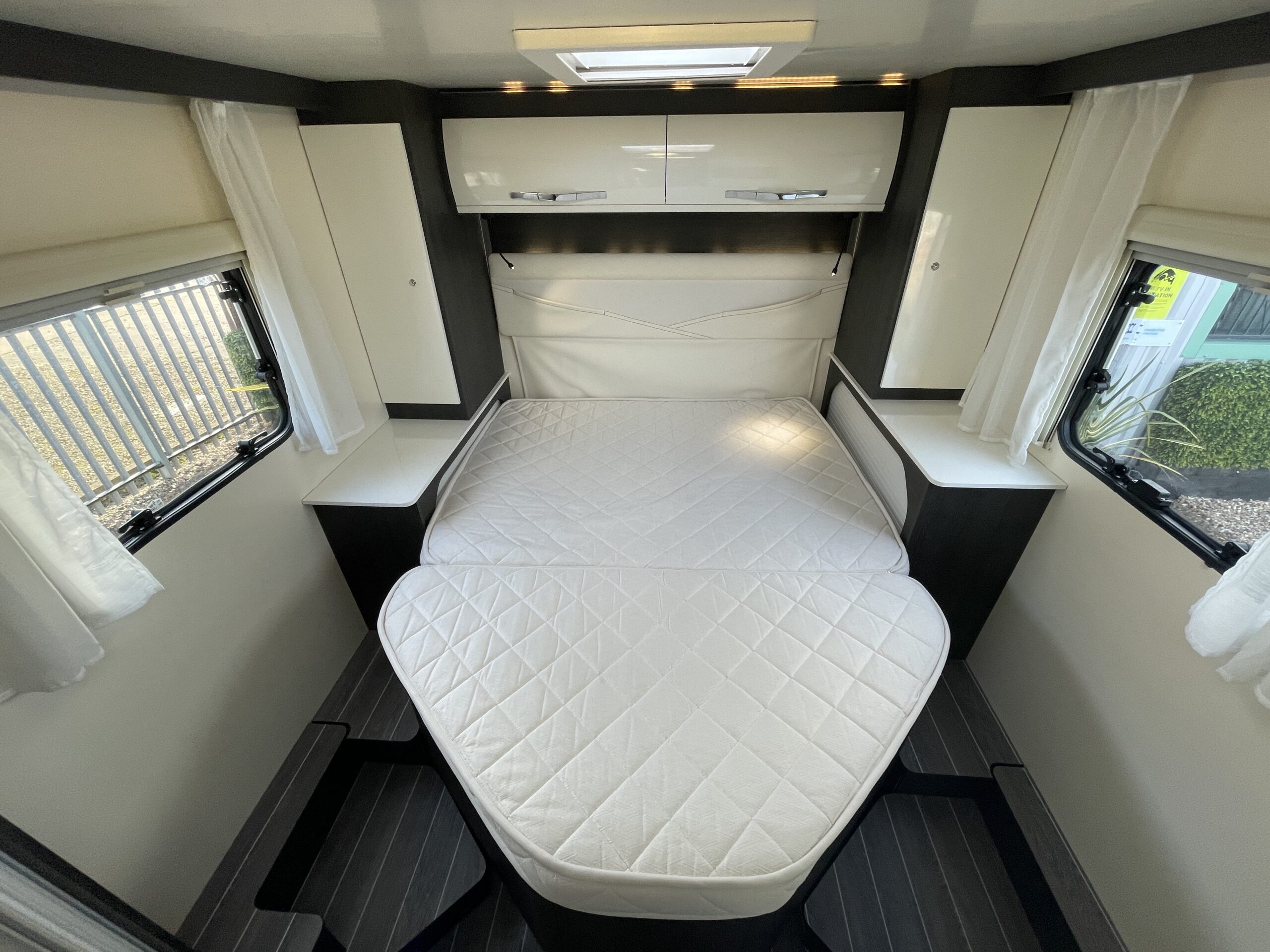 The bathroom conveniently separates the front and rear of the motorhome; you have a full separate shower, toilet, and centrally you have a sink basin with large vanity mirror. This area can be used as an en-suite to both sections of the motorhome with a partition door from the front and a his and hers separate door to the rear. In the rear of the motorhome you have the island bed which is height adjustable; this offers ease of access when getting into bed as well as raising the garage to store larger items when travelling. Finally you benefit from a large garage space, perfect for all your storage needs! Moving outside you benefit from a bike rack, external shower point, a wind out awning to create a large outdoor space and a solar panel to keep the power levels topped up!