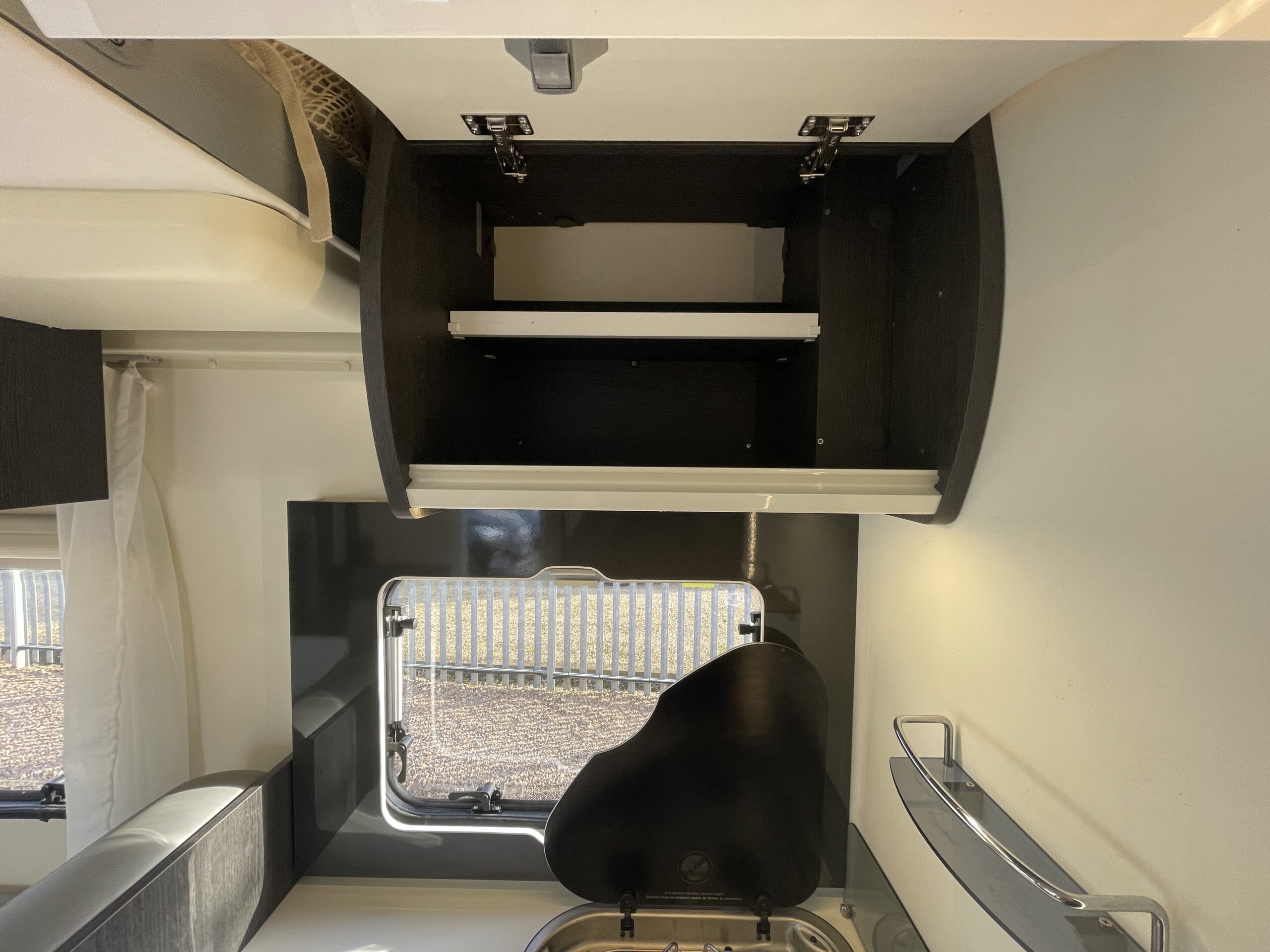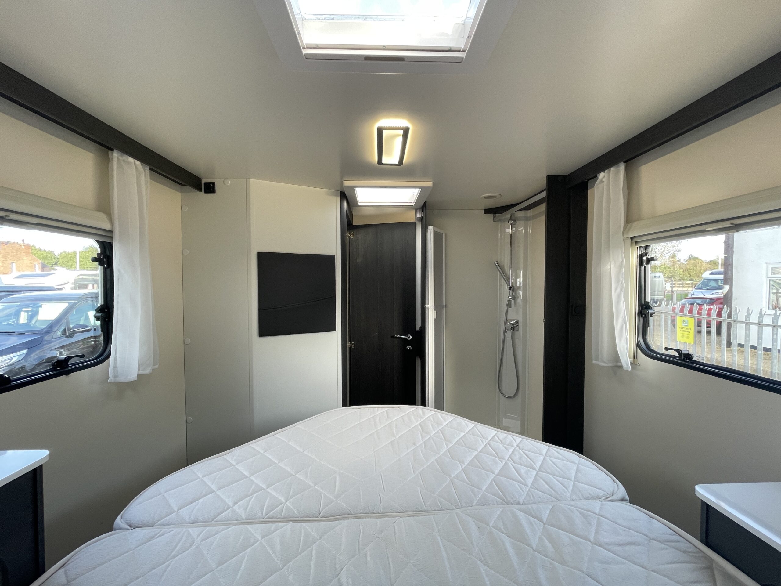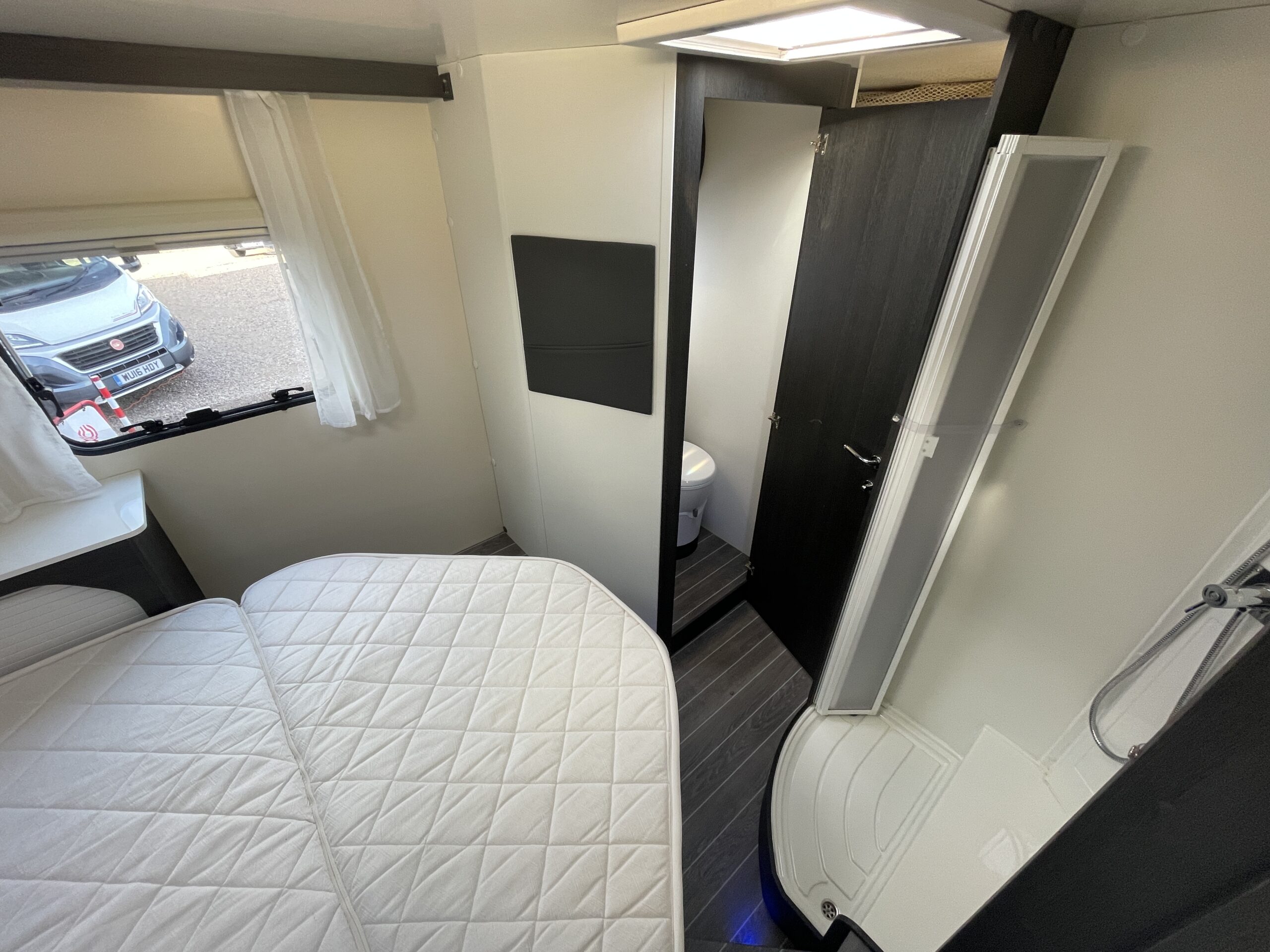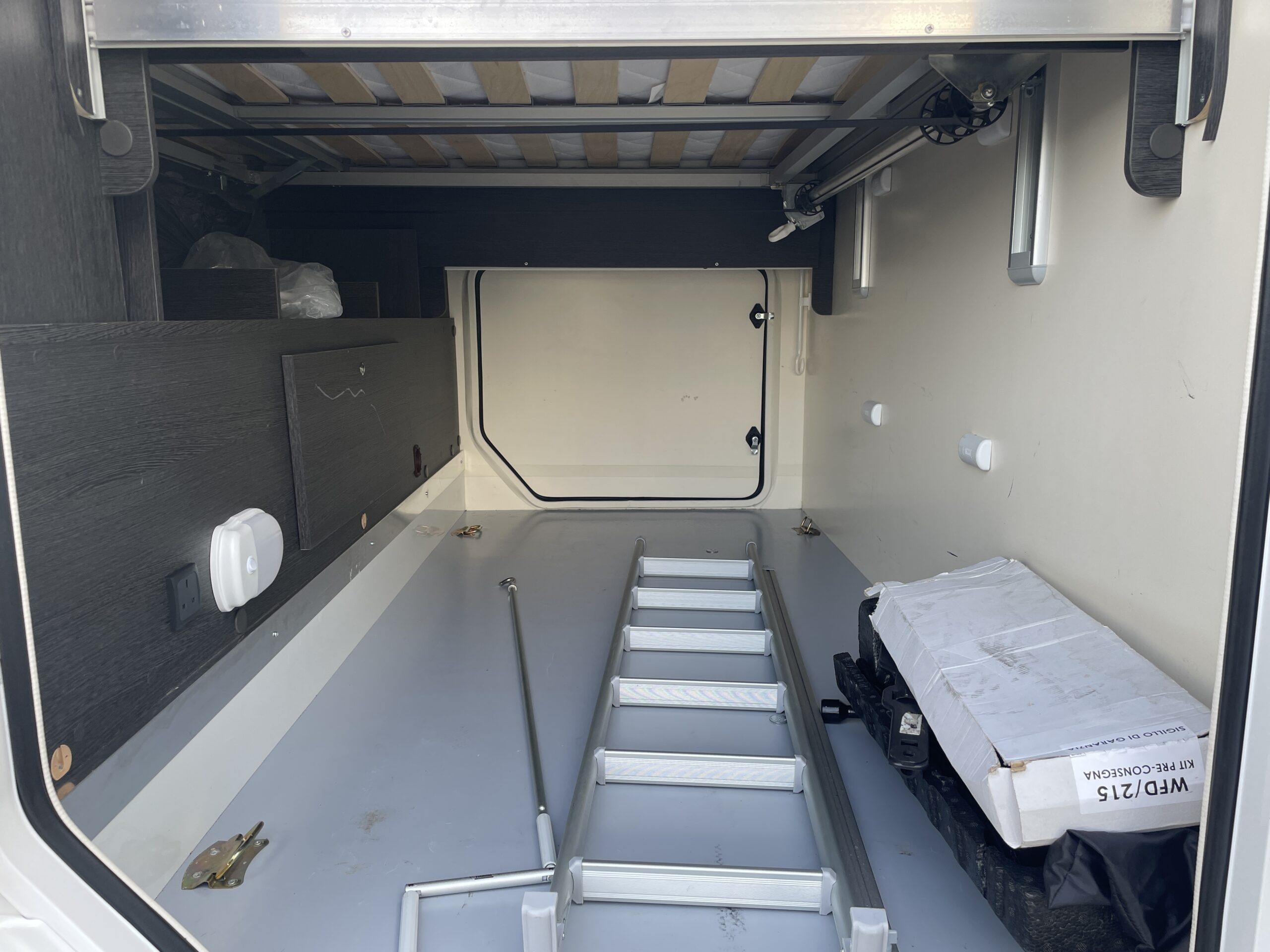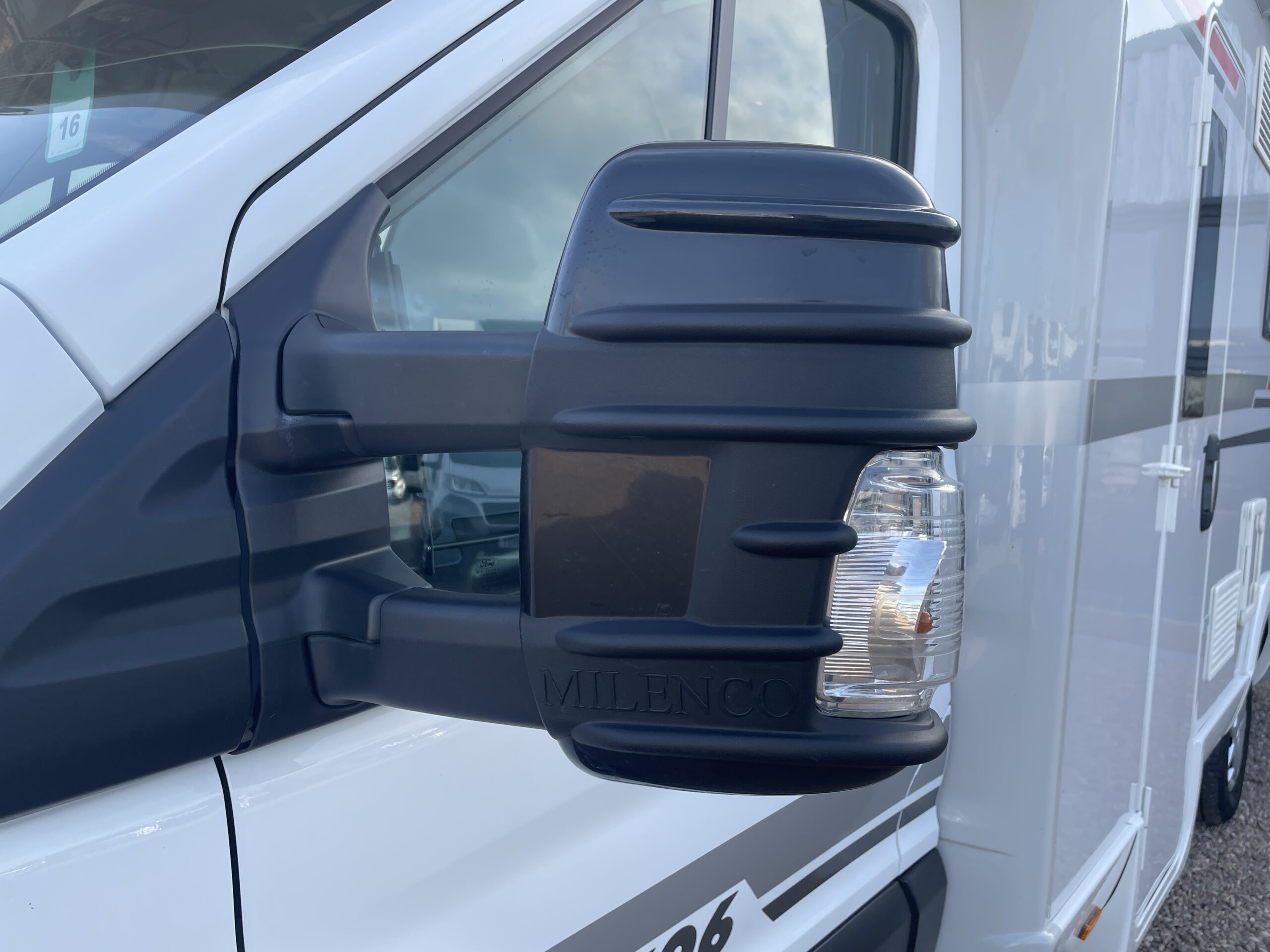 The bathroom conveniently separates the front and rear of the motorhome; you have a full separate shower, toilet, and centrally you have a sink basin with large vanity mirror. This area can be used as an en-suite to both sections of the motorhome with a partition door from the front and a his and hers separate door to the rear. In the rear of the motorhome you have the island bed which is height adjustable; this offers ease of access when getting into bed as well as raising the garage to store larger items when travelling. Finally you benefit from a large garage space, perfect for all your storage needs! Moving outside you benefit from a bike rack, external shower point, a wind out awning to create a large outdoor space and a solar panel to keep the power levels topped up!