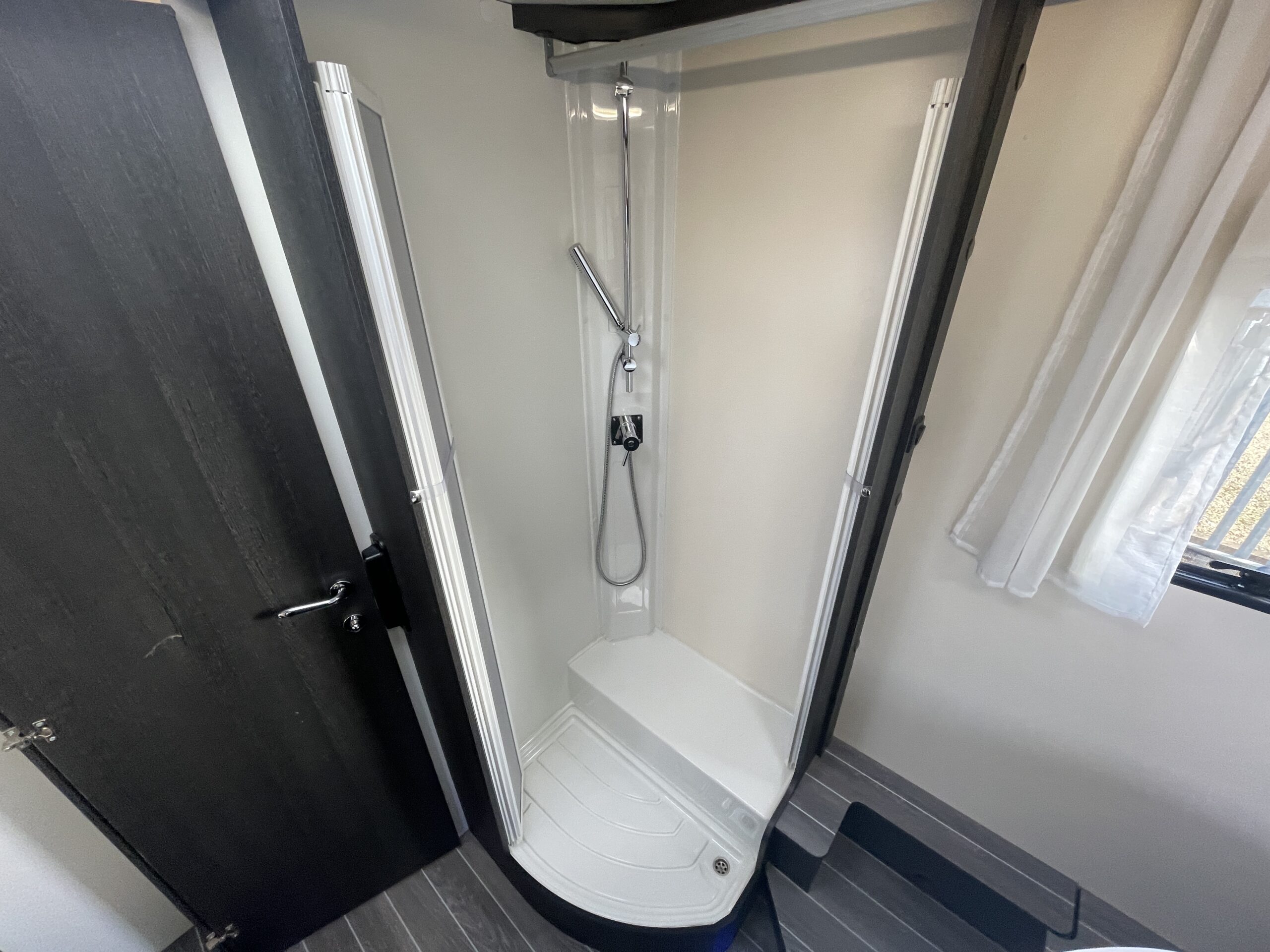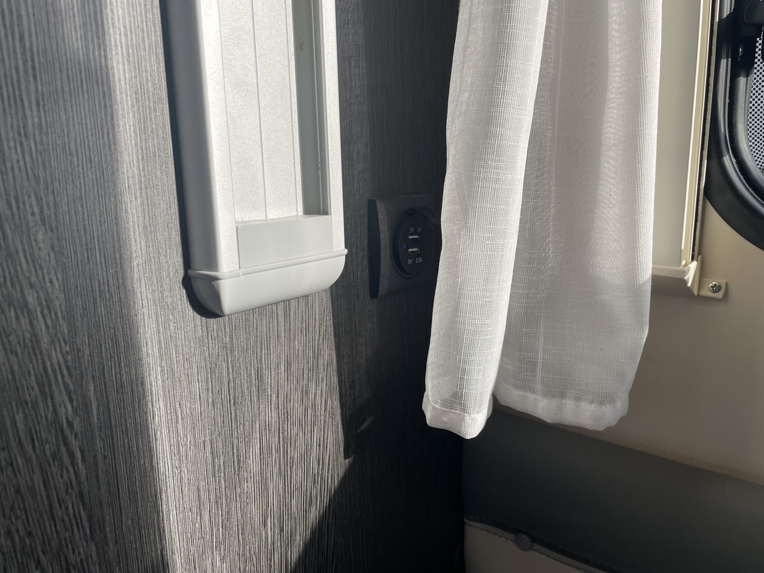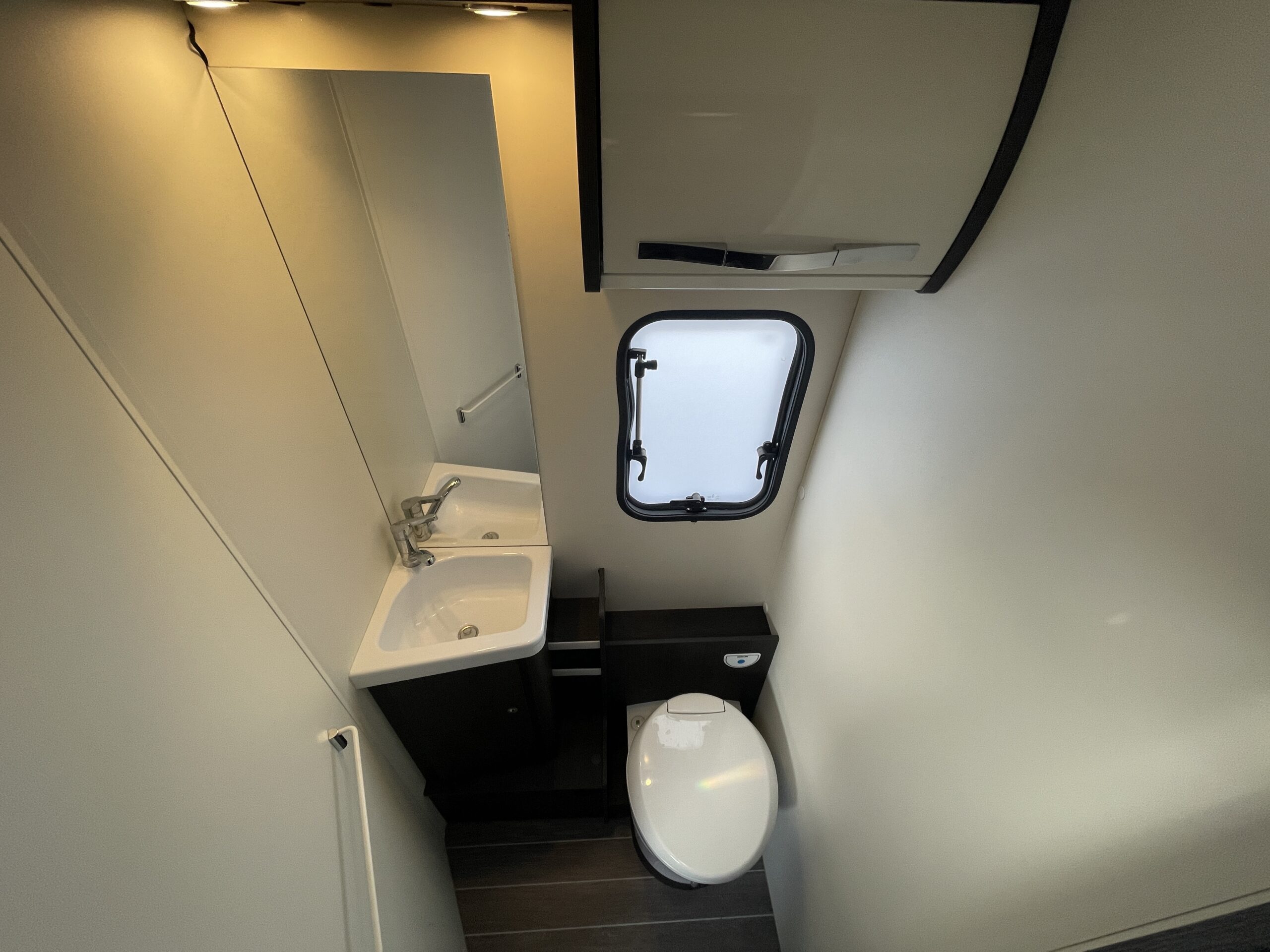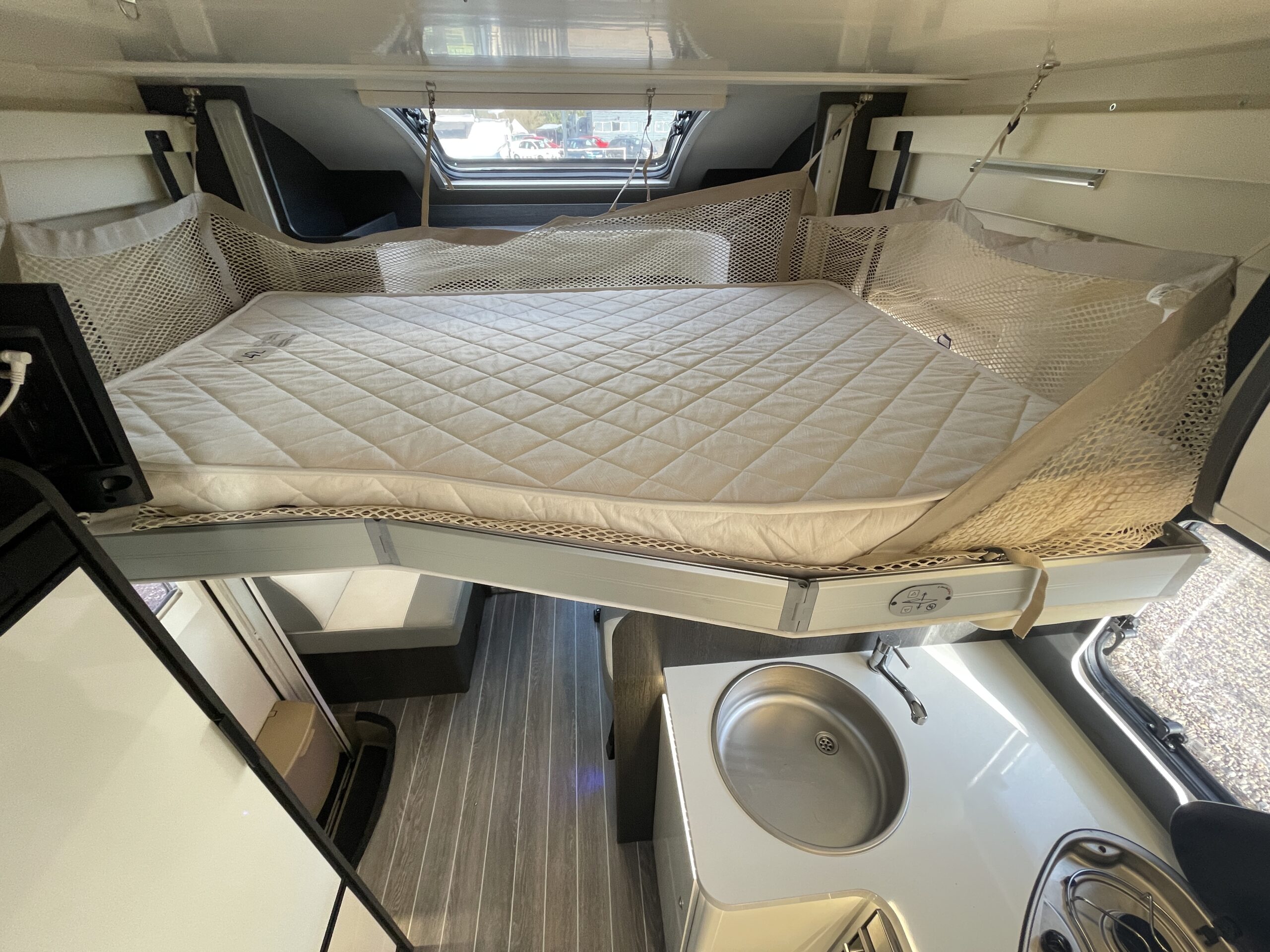 The bathroom conveniently separates the front and rear of the motorhome; you have a full separate shower, toilet, and centrally you have a sink basin with large vanity mirror. This area can be used as an en-suite to both sections of the motorhome with a partition door from the front and a his and hers separate door to the rear. In the rear of the motorhome you have the island bed which is height adjustable; this offers ease of access when getting into bed as well as raising the garage to store larger items when travelling. Finally you benefit from a large garage space, perfect for all your storage needs! Moving outside you benefit from a bike rack, external shower point, a wind out awning to create a large outdoor space and a solar panel to keep the power levels topped up!