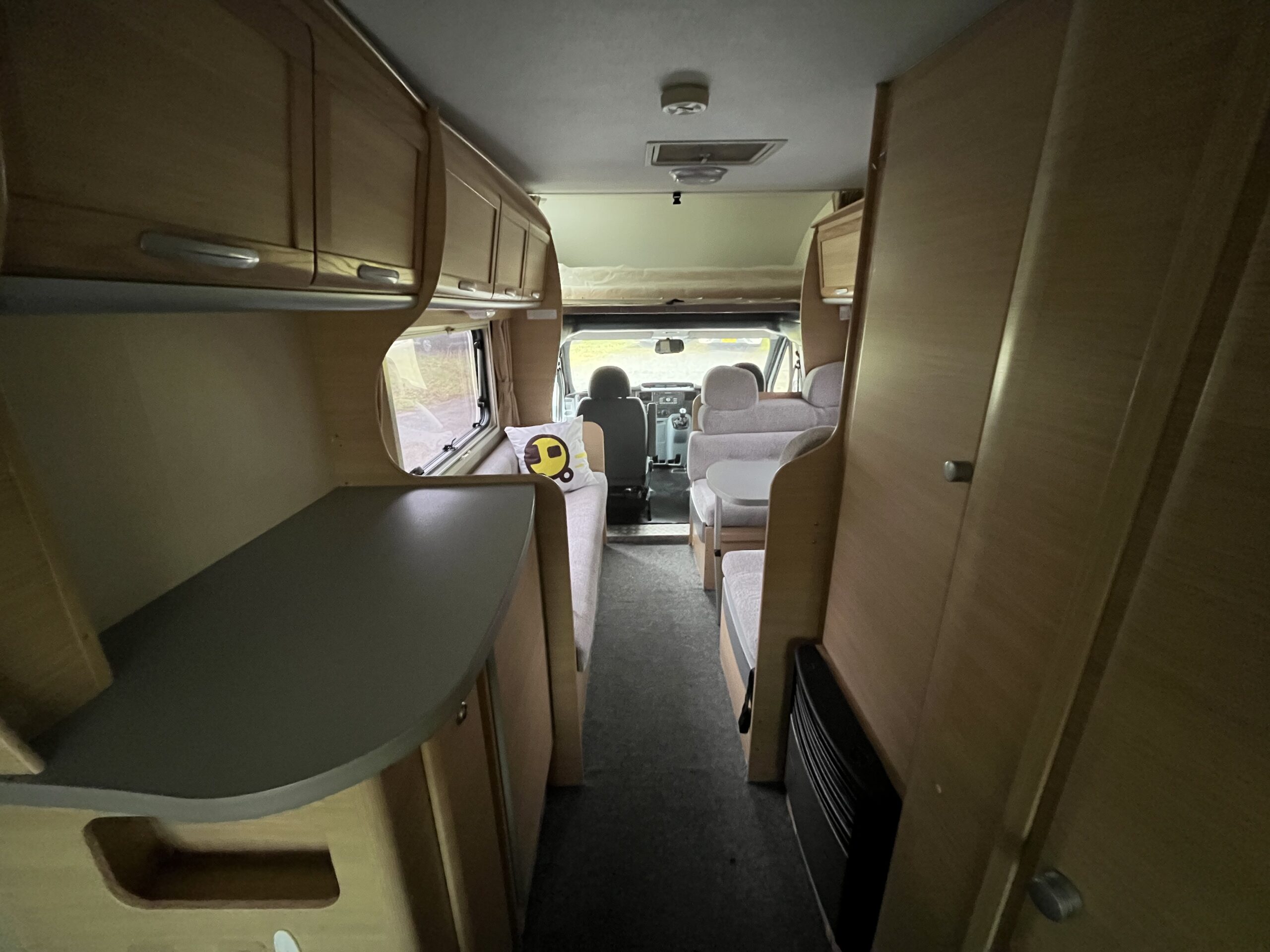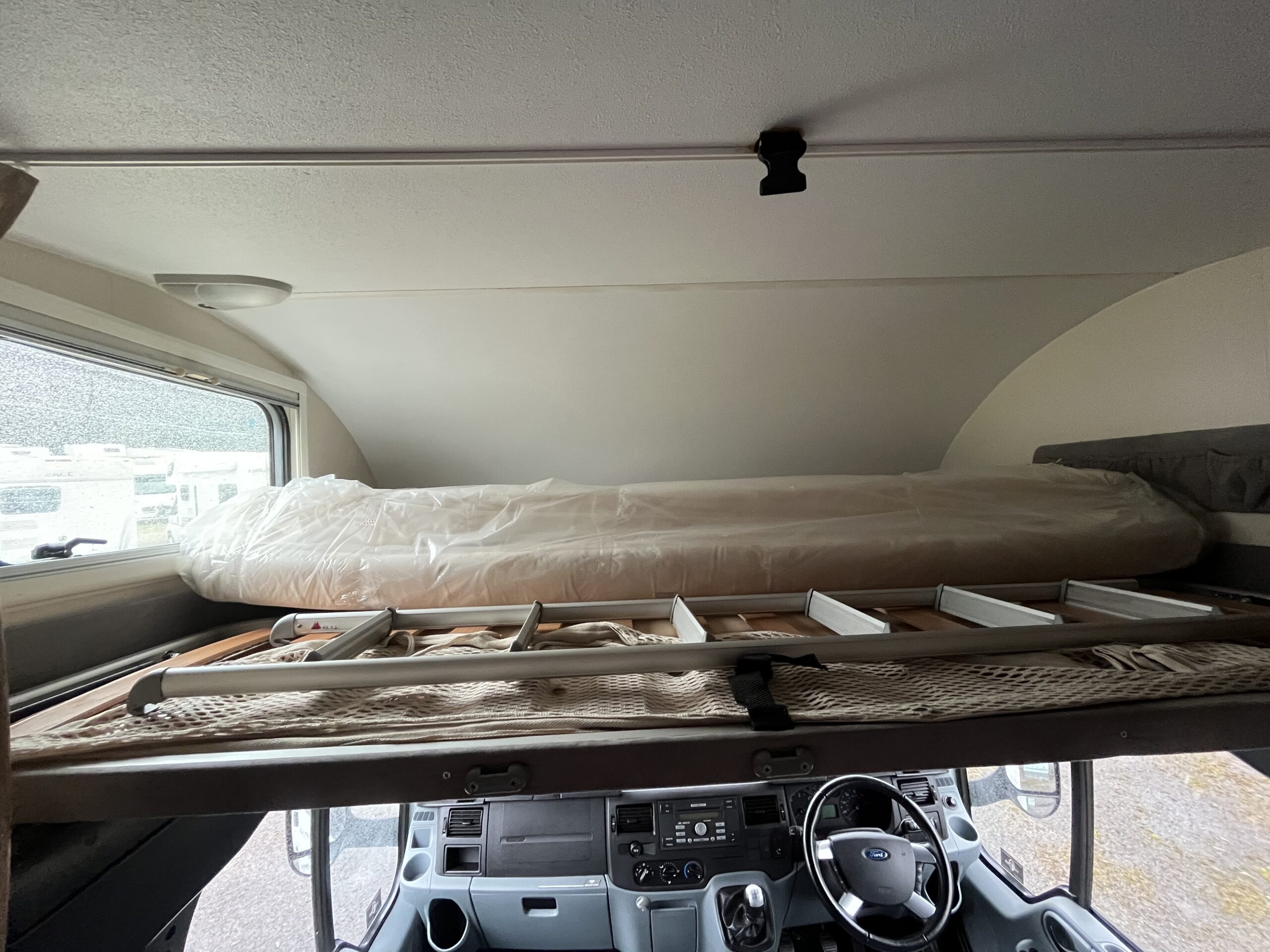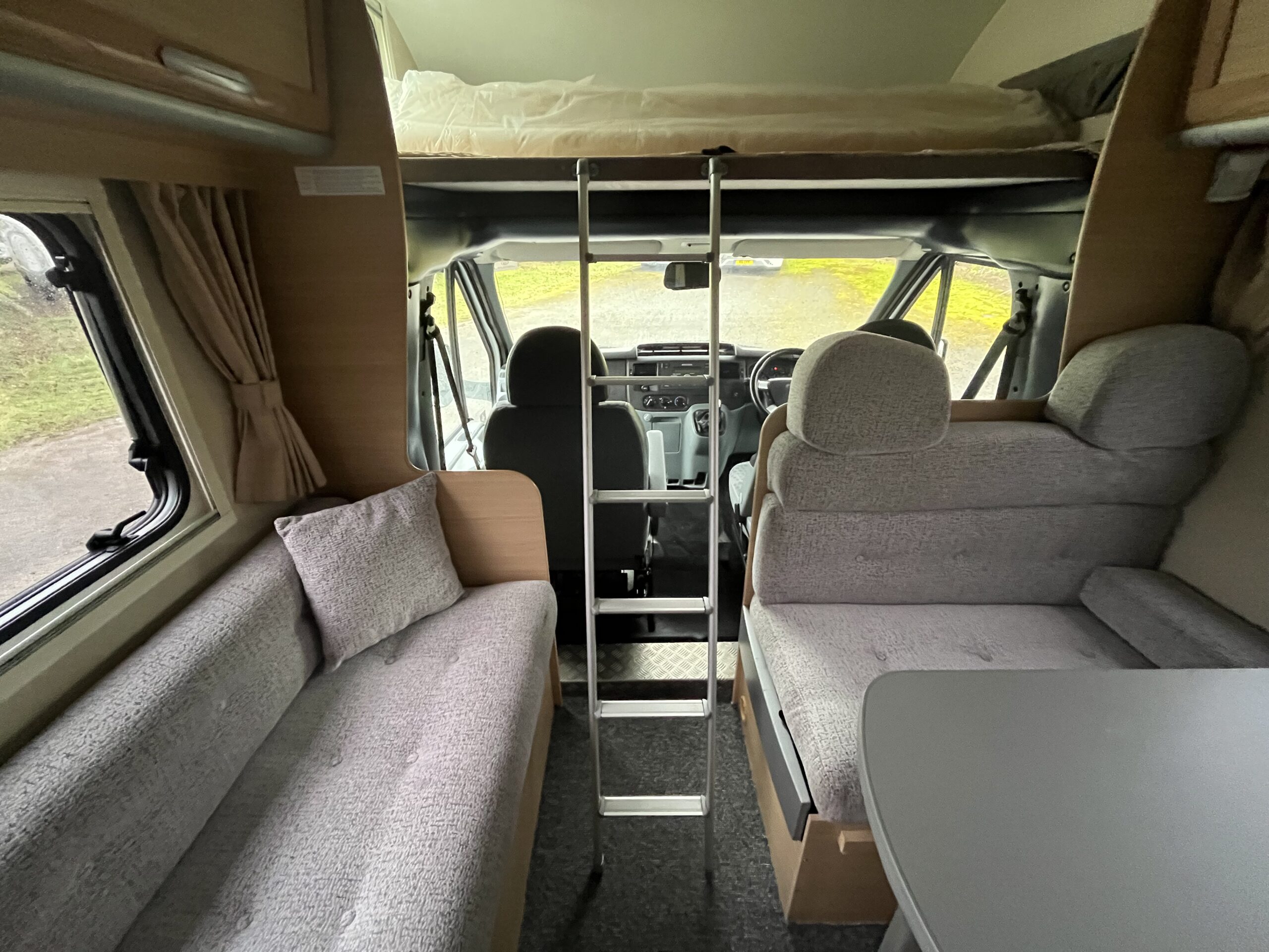 Moving towards the front of the motorhome, you have the centre dinette area where you have the side facing long bench and then you have the front facing and rear facing double seats which both come with travelling belts, making 6 belts in total, this area will make a great place to socialize with family or friends. The final sleeping area is the over-cab bed that provides a large double bed and is accessed via the ladder provided.