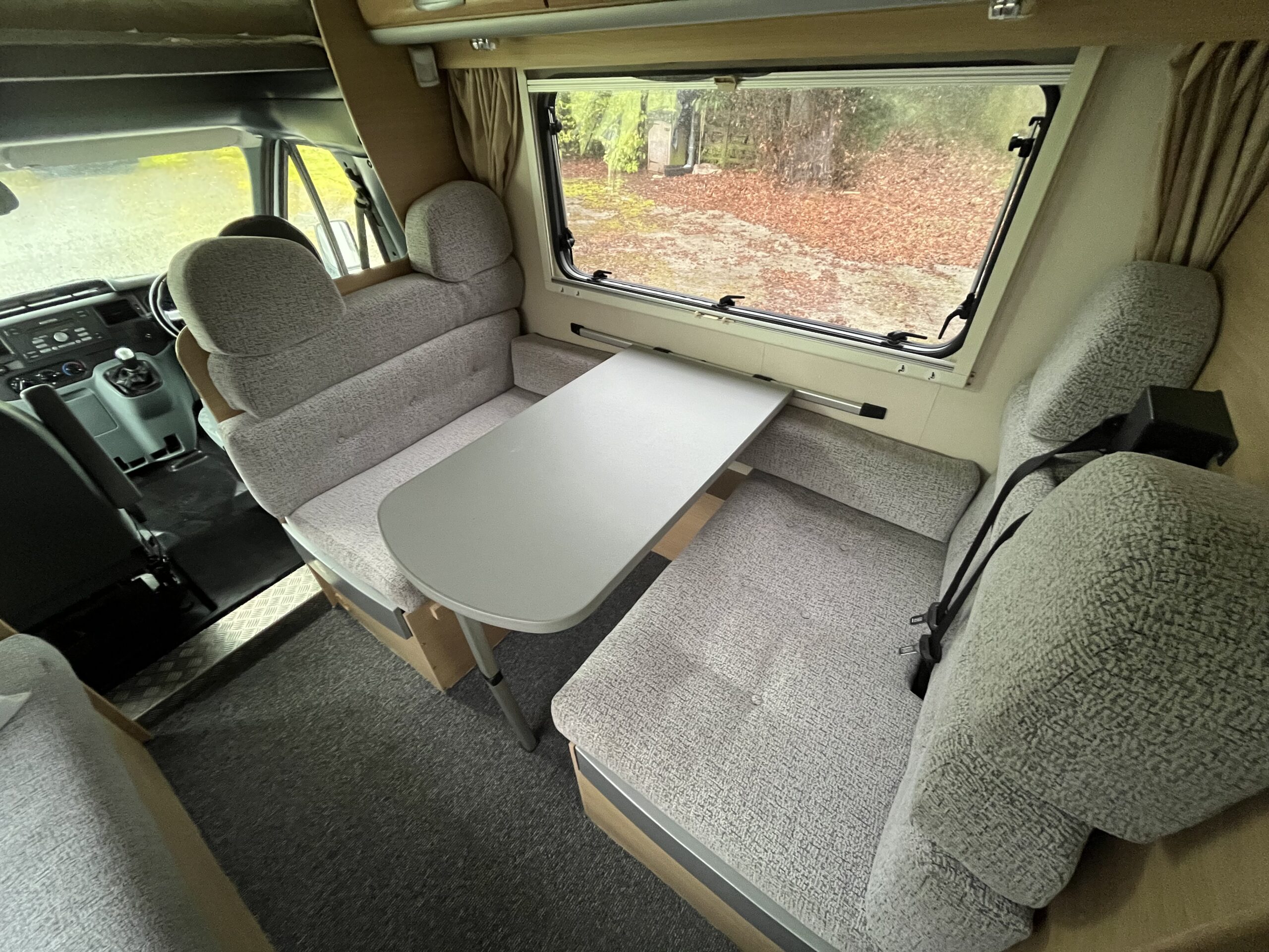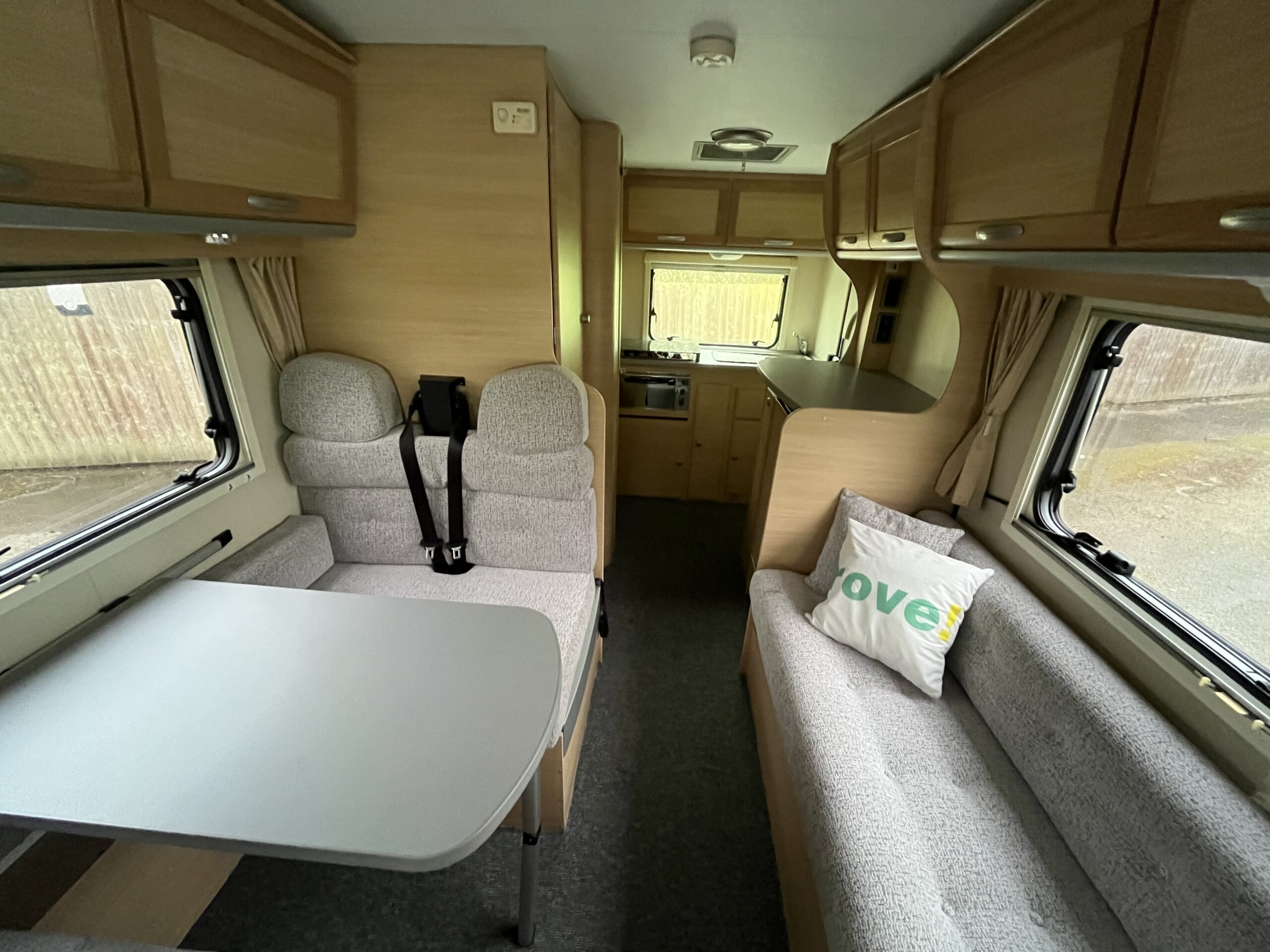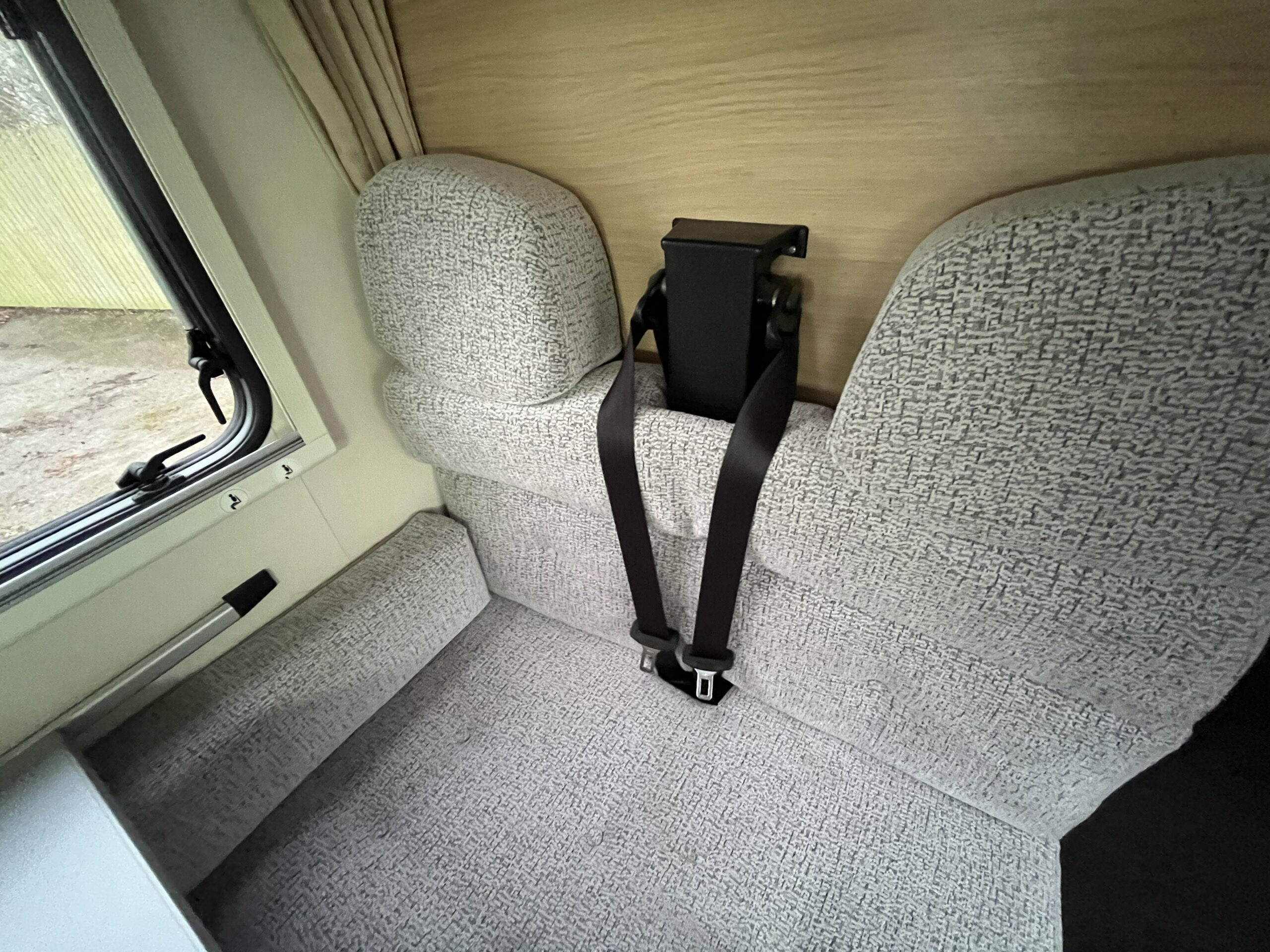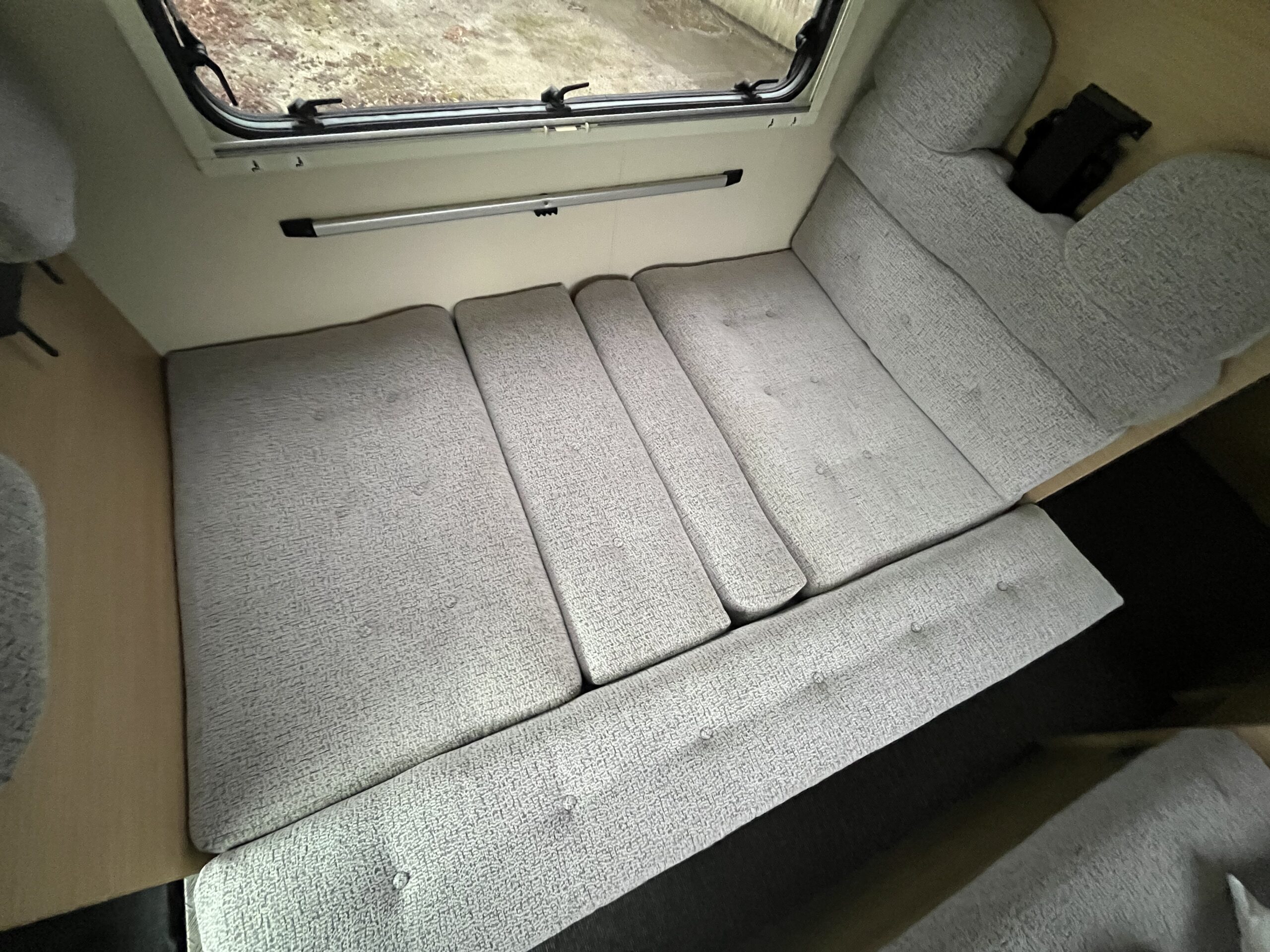 The Roller Team 500 can be used as a 5 berth when you take advantage of the 6 foot side bench and comes with 6 travelling belts making it perfect for an adventurous family in their travelling adventures with this particular model having its upholstery professional redone in lovely bright greys and matching carpets making it look modern, warm and inviting inside.