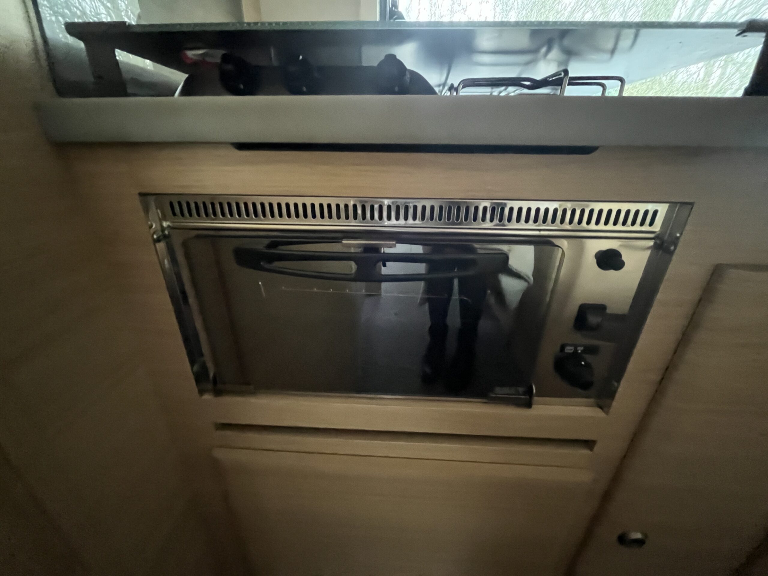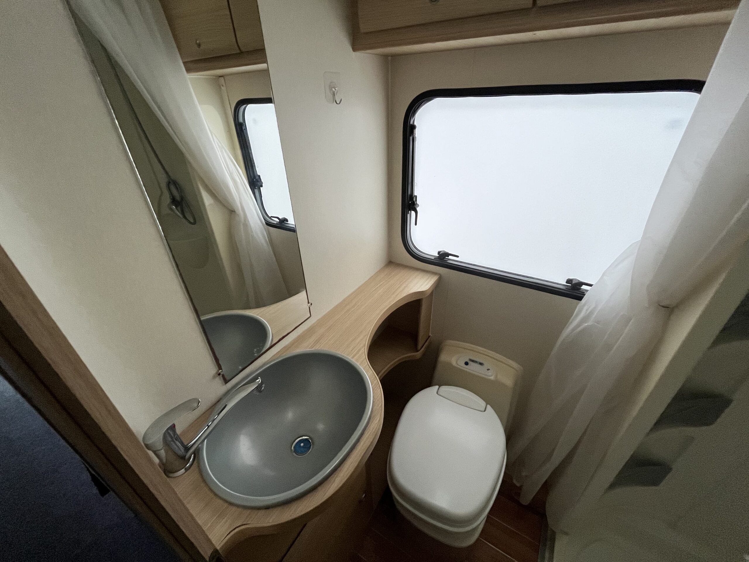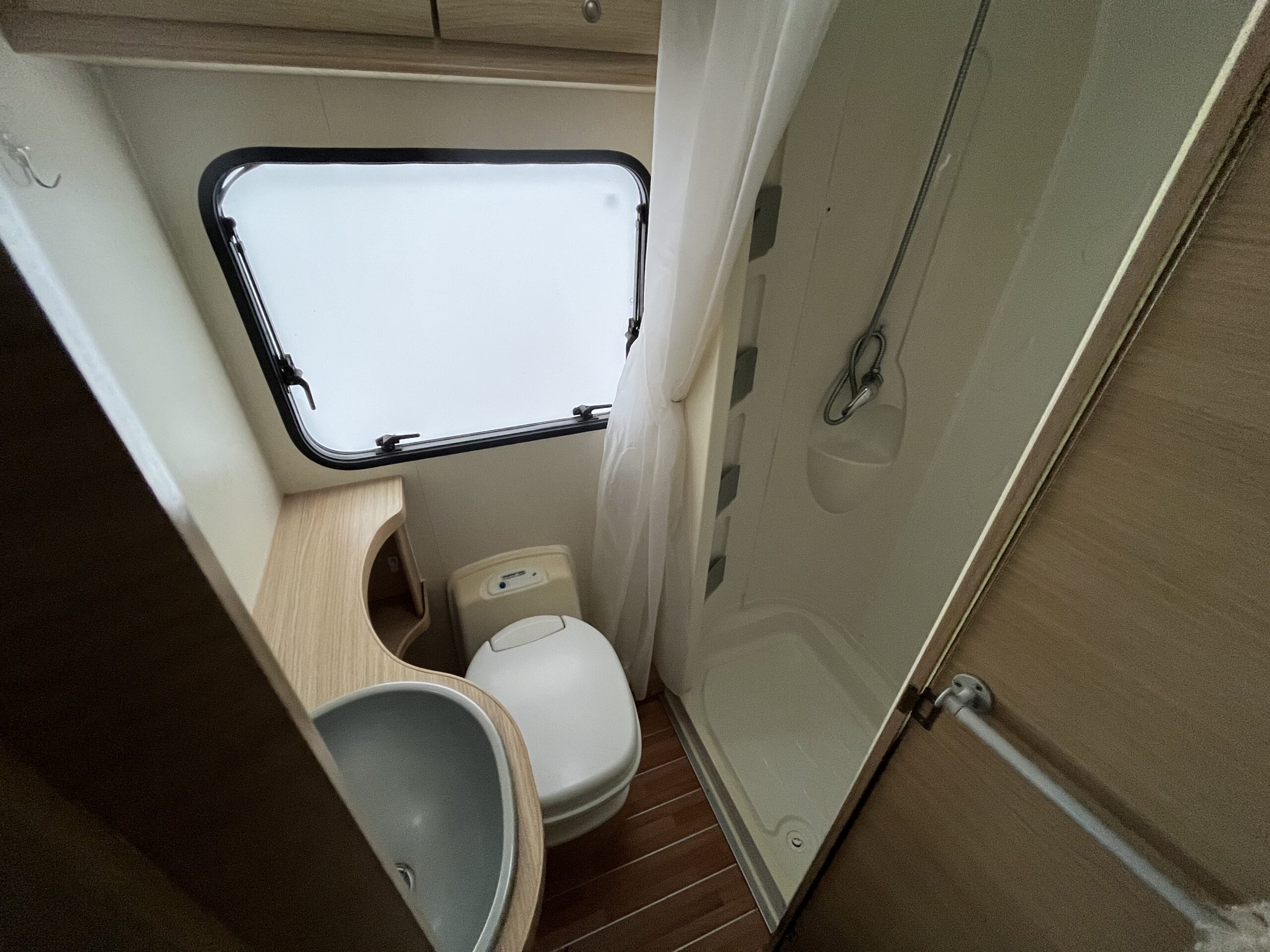 For the layout we start at the rear of the motorhome and here you will find the end kitchen and the washroom. The kitchen area comes with everything you need including grill; 3 gas burner hob; good size fridge with small freezer space and sink. Next you have the washroom area which comes with the desired separate shower cubicle, electric flush toilet, wash basin and large vanity mirror.