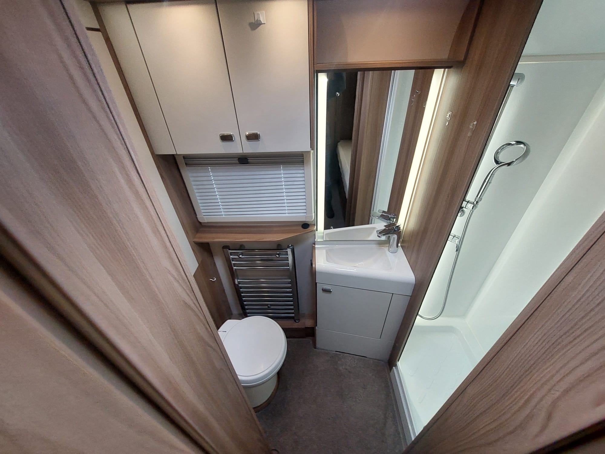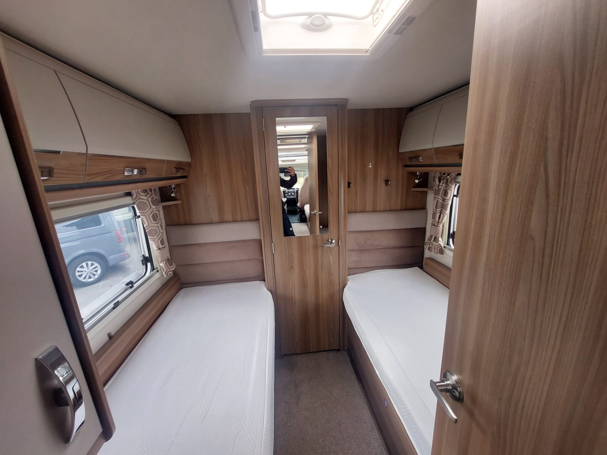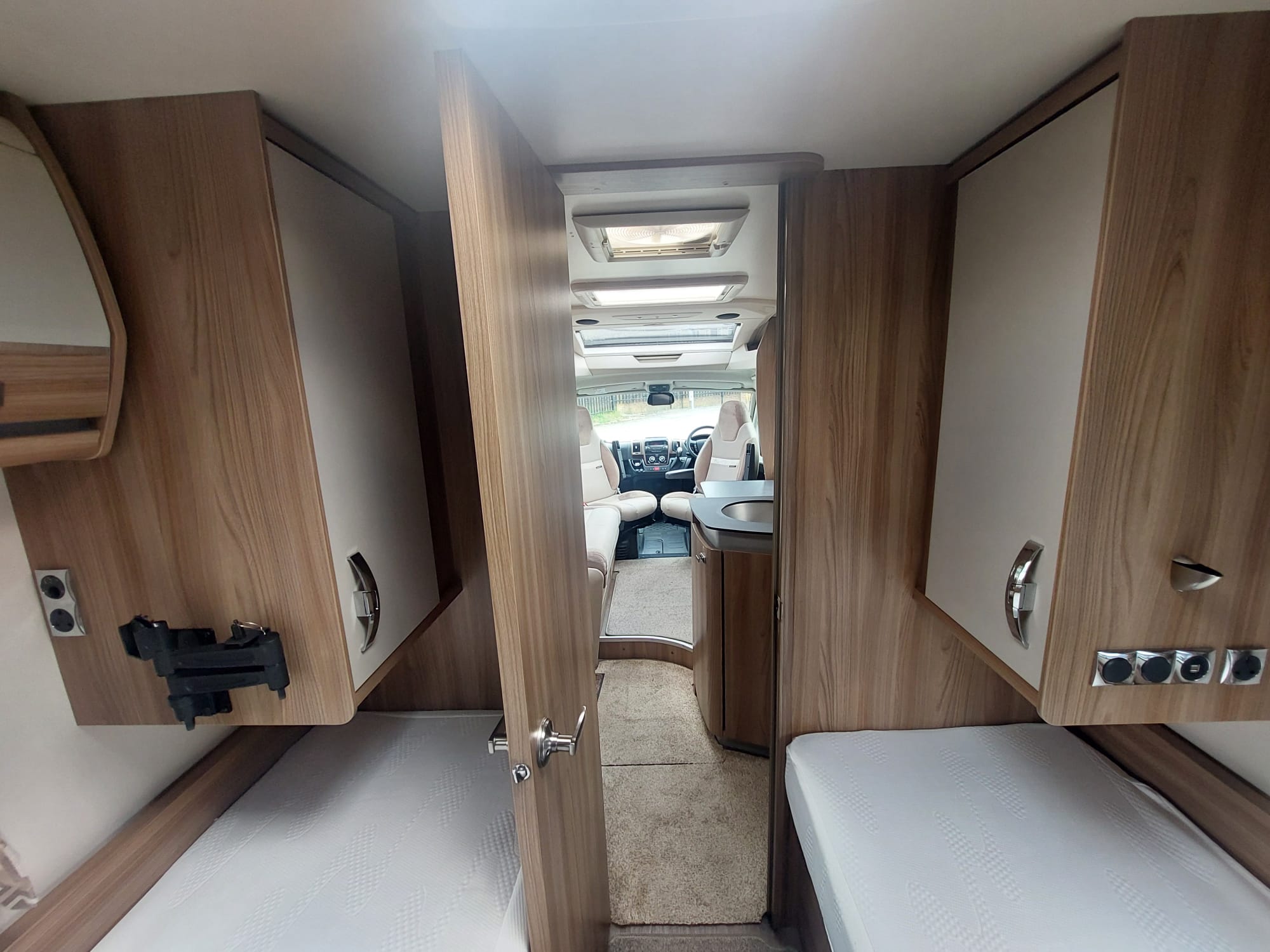 In the centre is a generously sized kitchen with great storage space, fridge with freezer compartment, oven, grill, microwave and sink with draining board, at the rear of the van is two single beds that can be partitioned off from the front of the motorhome, featuring plenty of overhead storage and wardrobe space, then at the rear, a sizeable washroom provides a large amount of room, keeping the toilet and the shower section separate from one another and washbasin with large vanity unit.