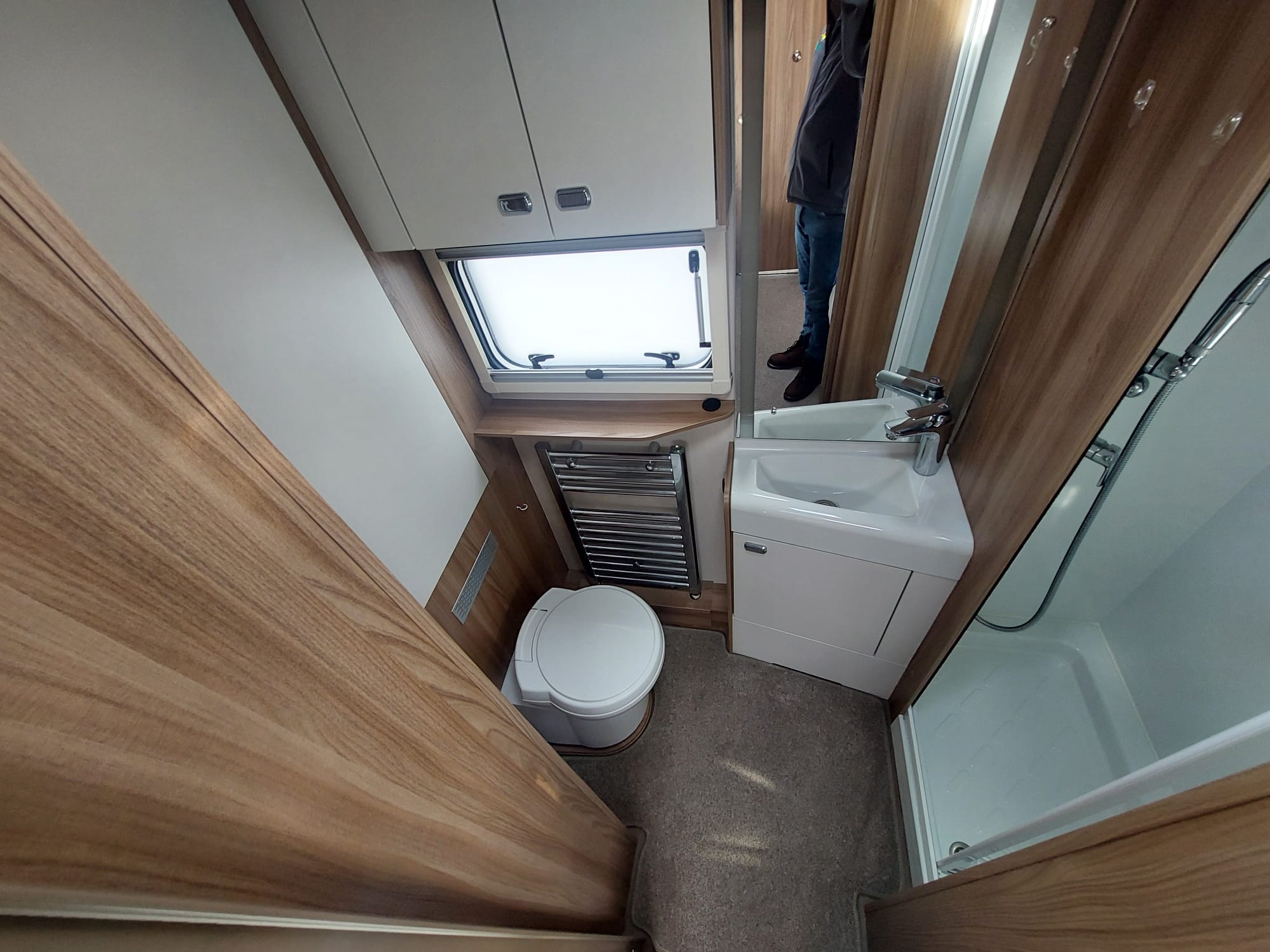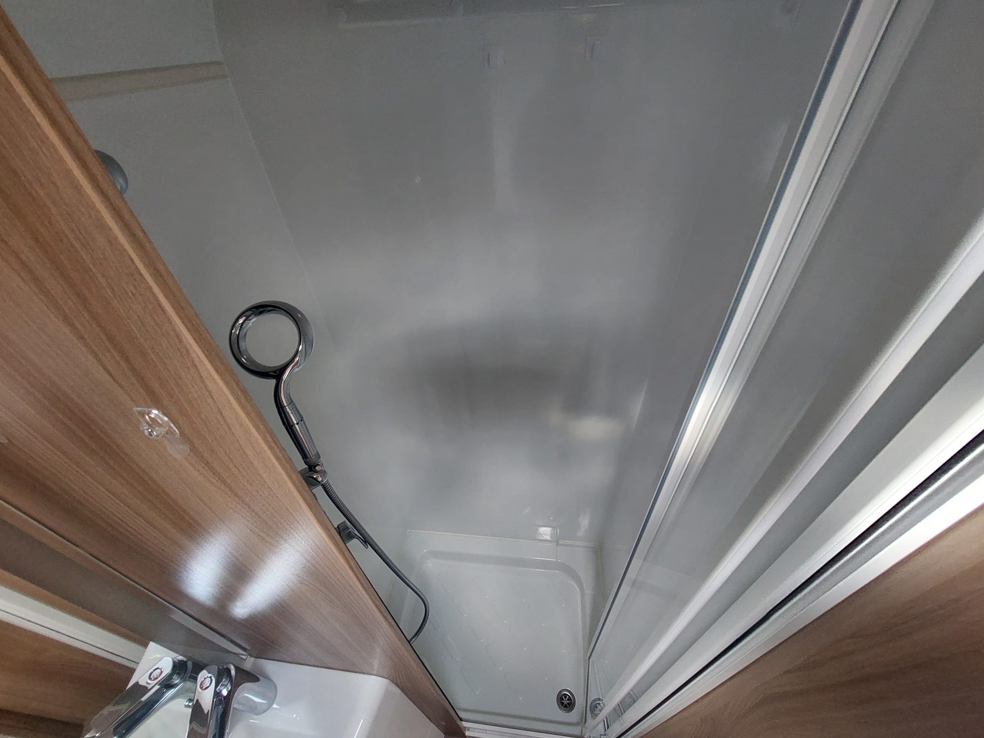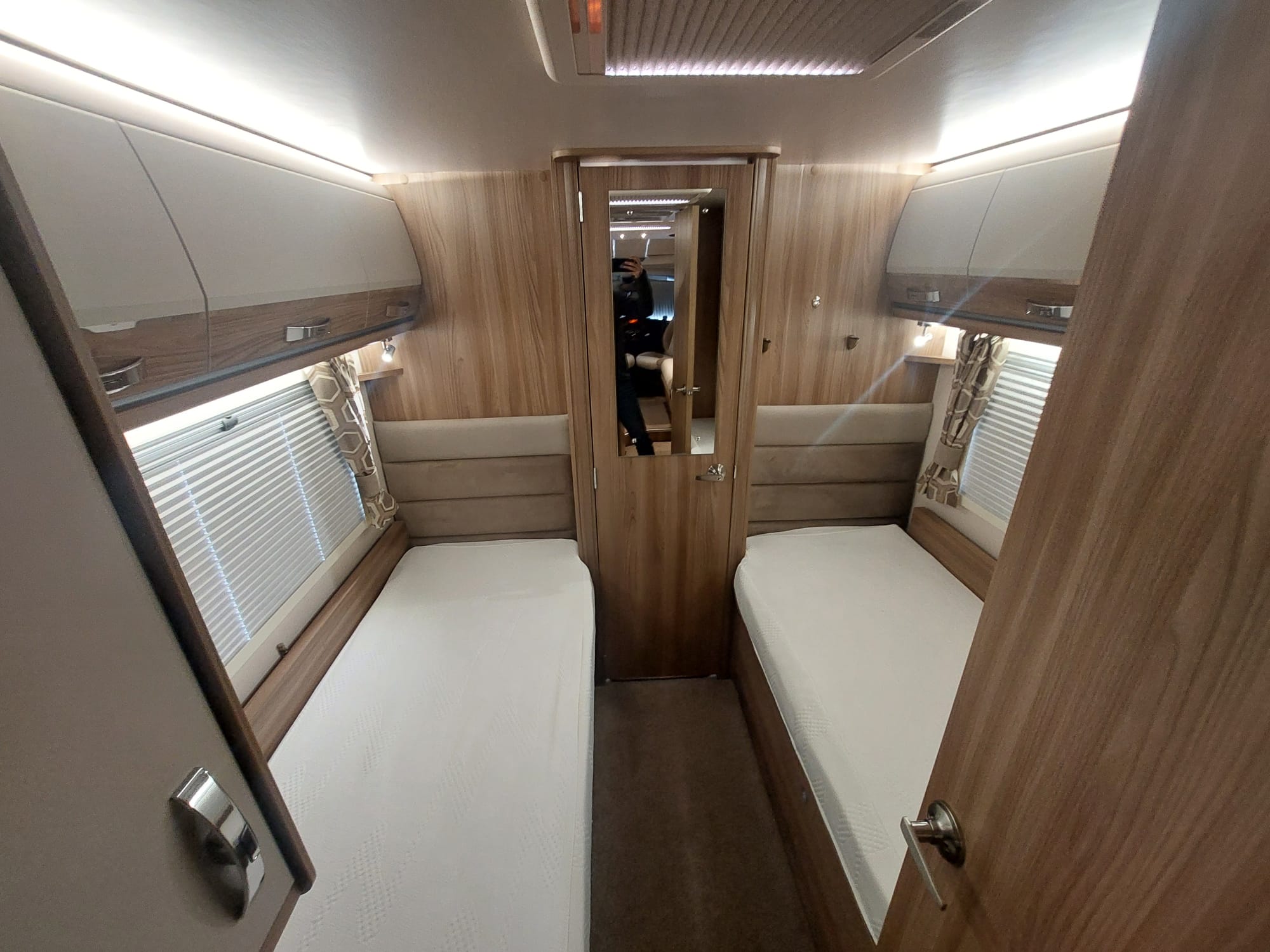In the centre is a generously sized kitchen with great storage space, fridge with freezer compartment, oven, grill, microwave and sink with draining board, at the rear of the van is two single beds that can be partitioned off from the front of the motorhome, featuring plenty of overhead storage and wardrobe space, then at the rear, a sizeable washroom provides a large amount of room, keeping the toilet and the shower section separate from one another and washbasin with large vanity unit.